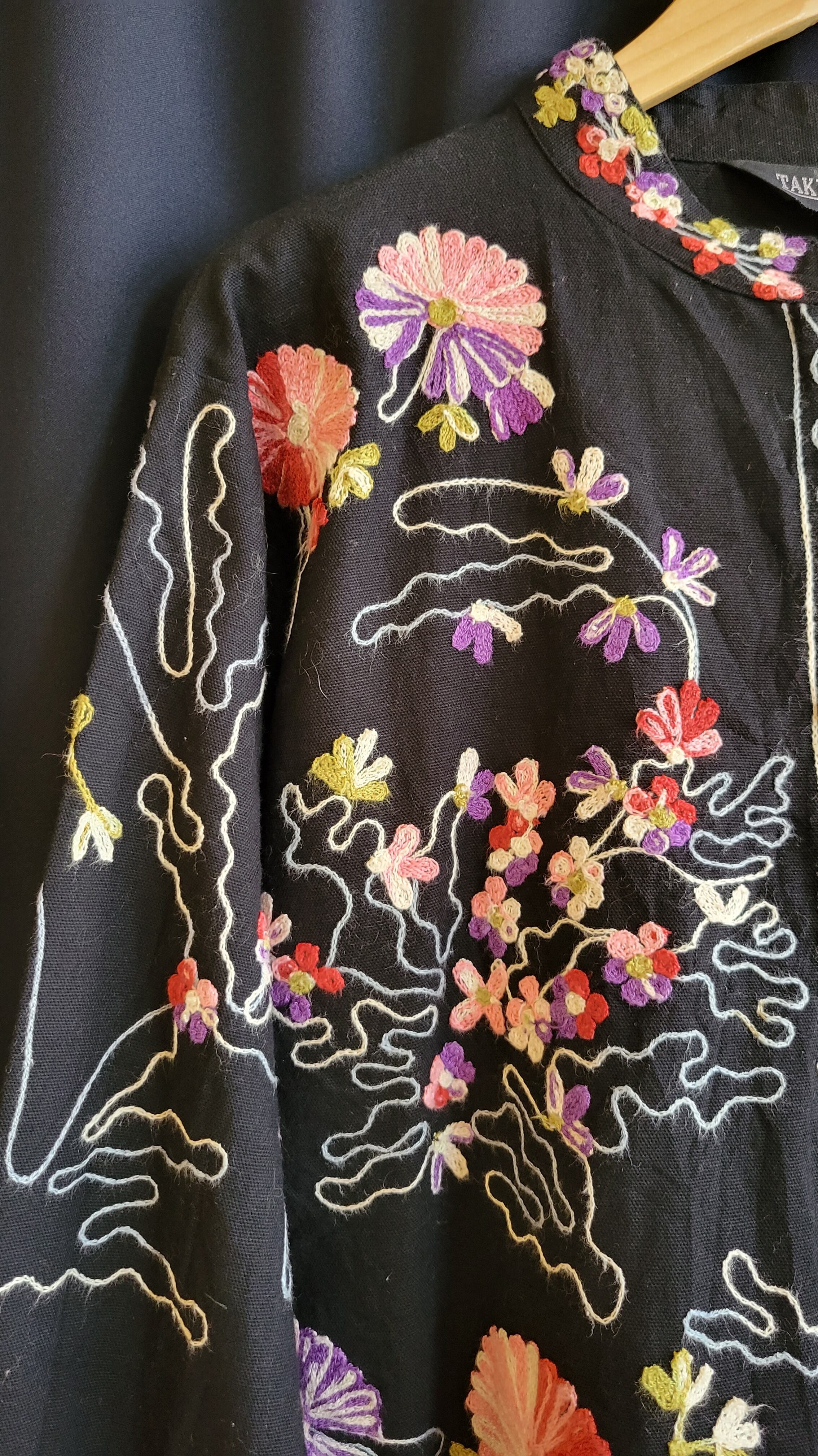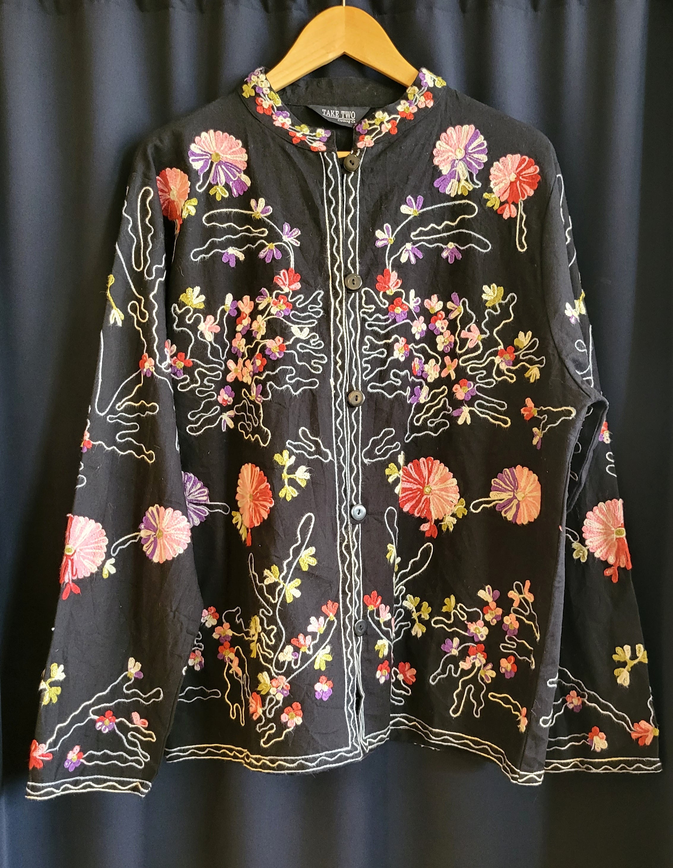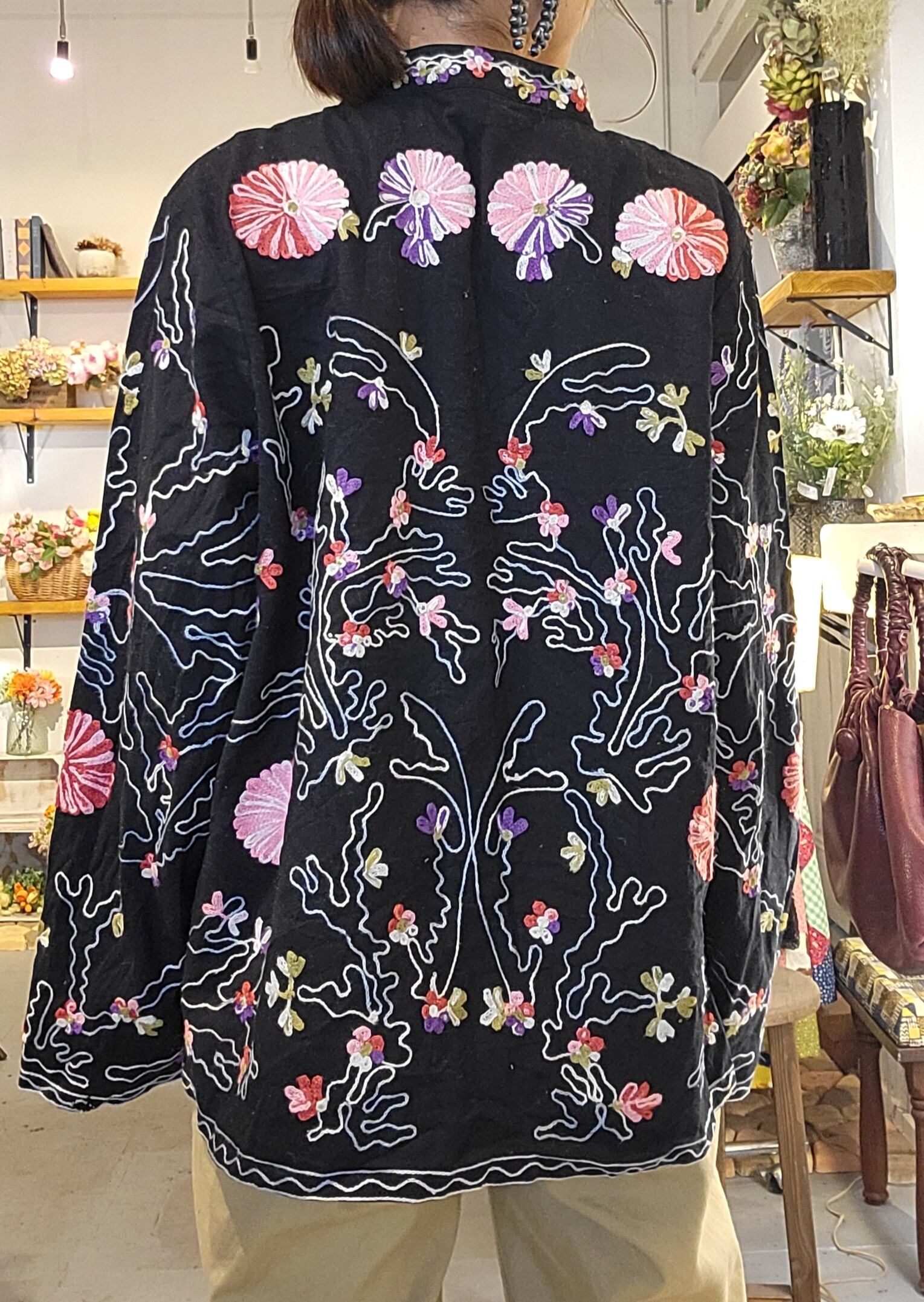 Made in India のヴィンテージジャケット。素材はコットンです。厚すぎないコットンなのでシャツ感覚でアウターの下にも着られます。女性がオーバーサイズで、また男性にもおすすめなサイズ感です。全体に施されたチェーンステッチ刺繍が美しく、カジュアルに着られるシャツジャケットです。