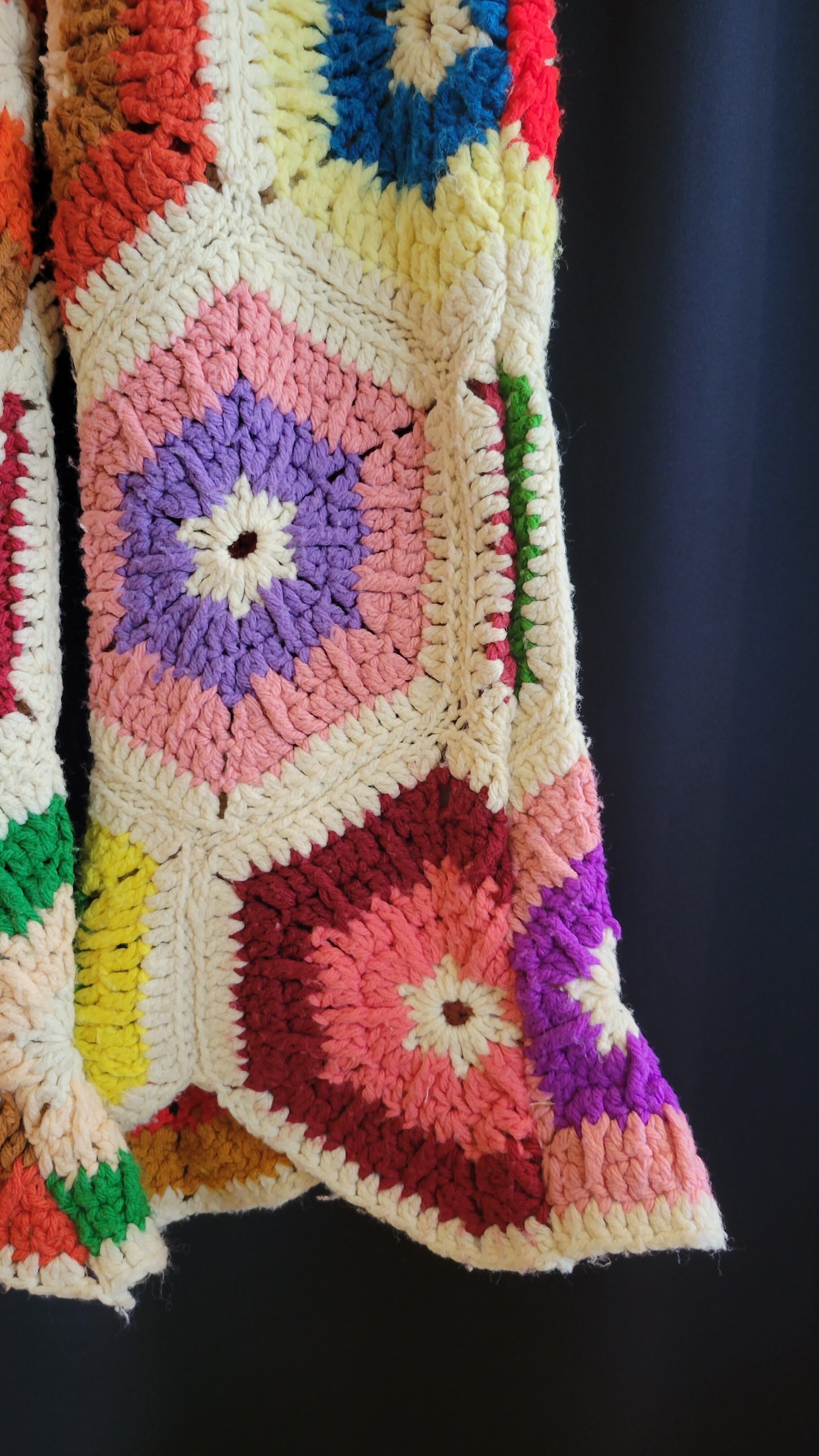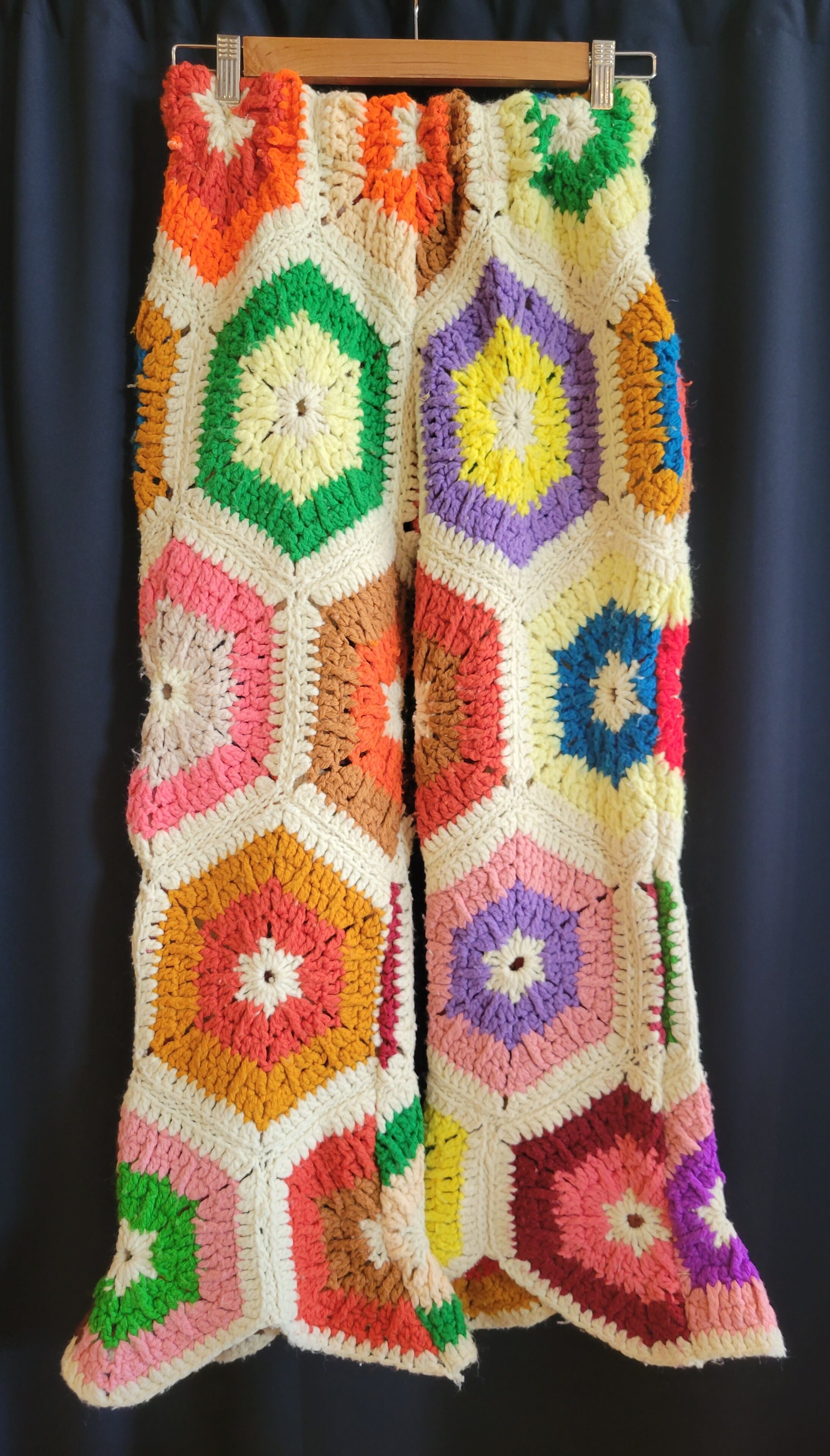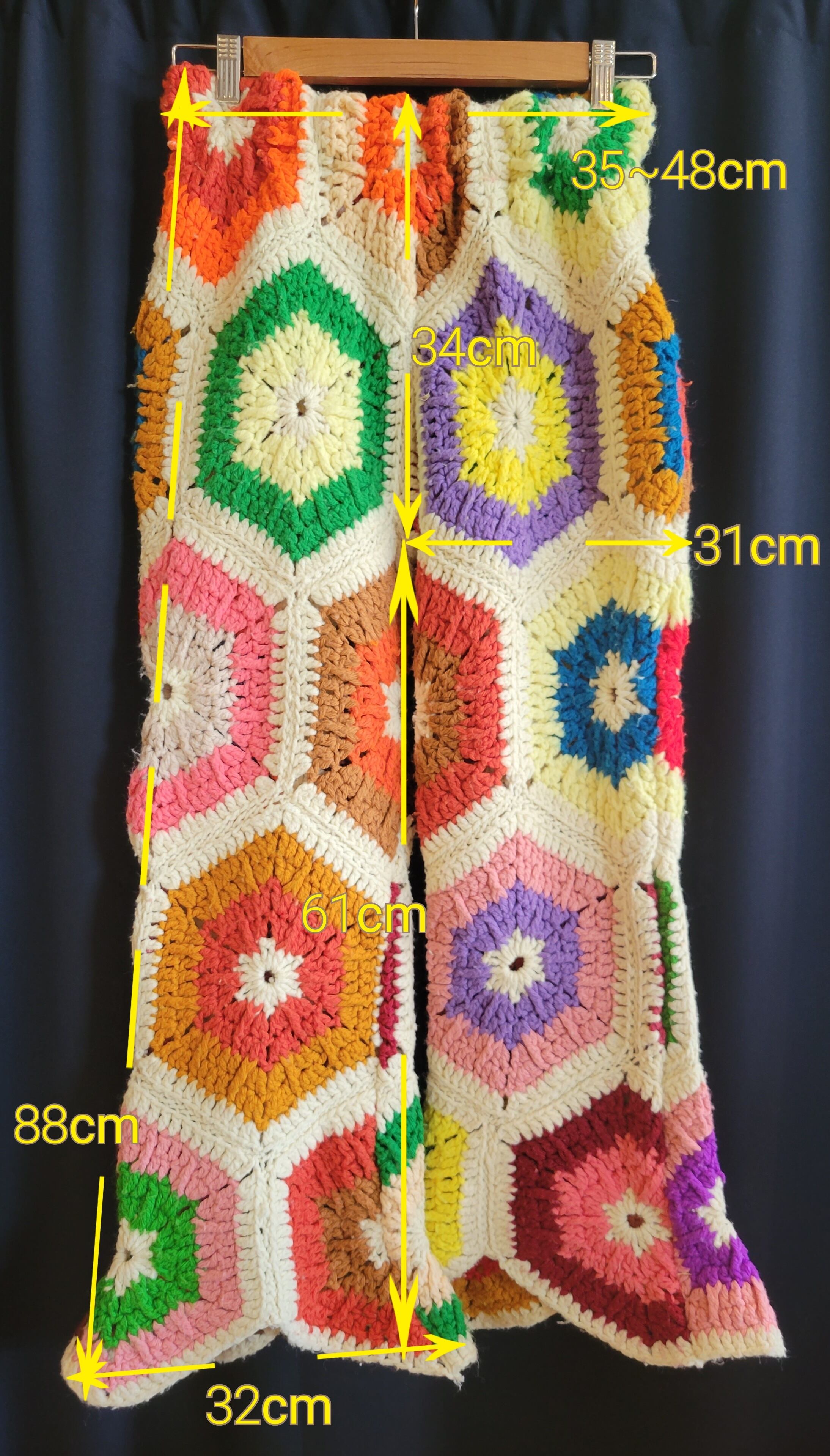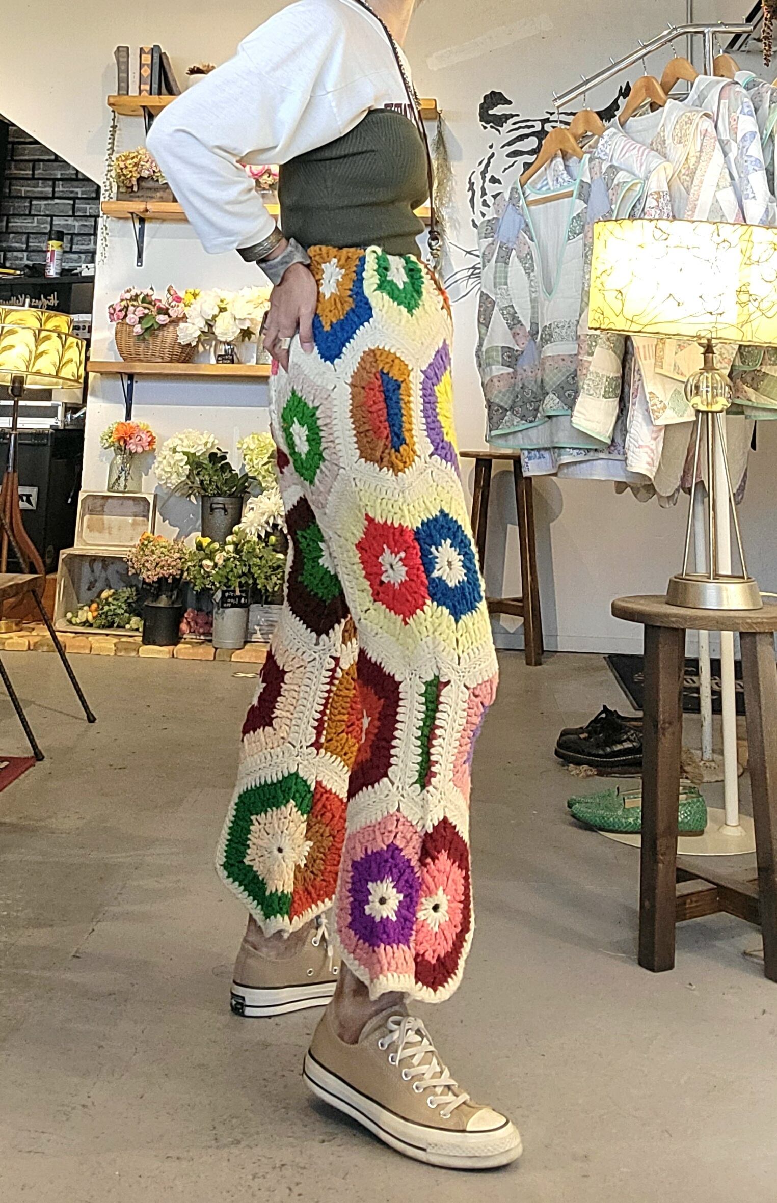 ヴィンテージのグラニーニットを使用したリメイクイージーパンツ。ウェストゴム、ニットの伸縮性も相まってストレスフリーな履き心地です。カラフルで大きなモチーフが魅力の一本。インナーにレギンスを合わせてとても暖かく過ごせます。