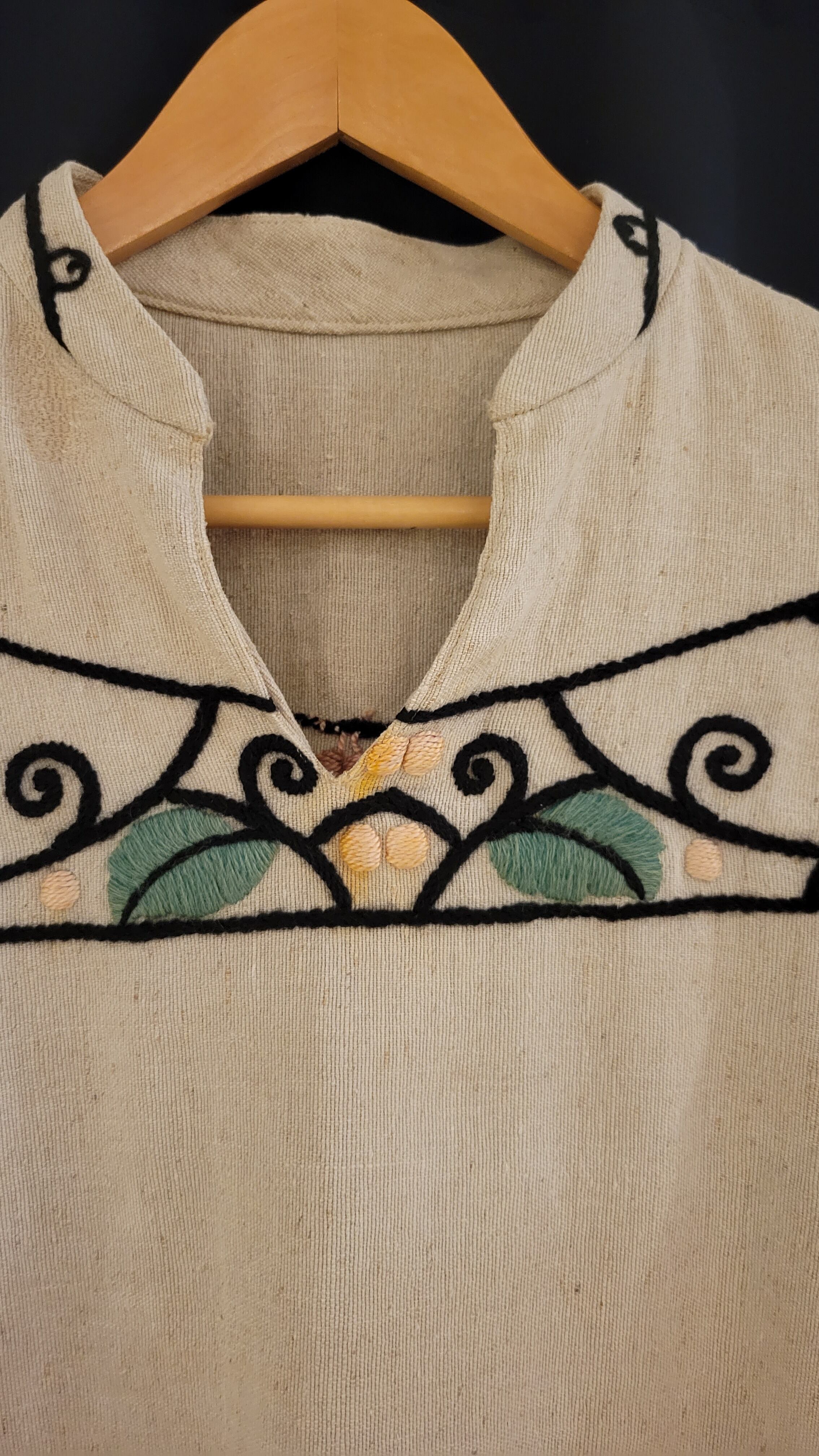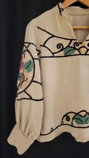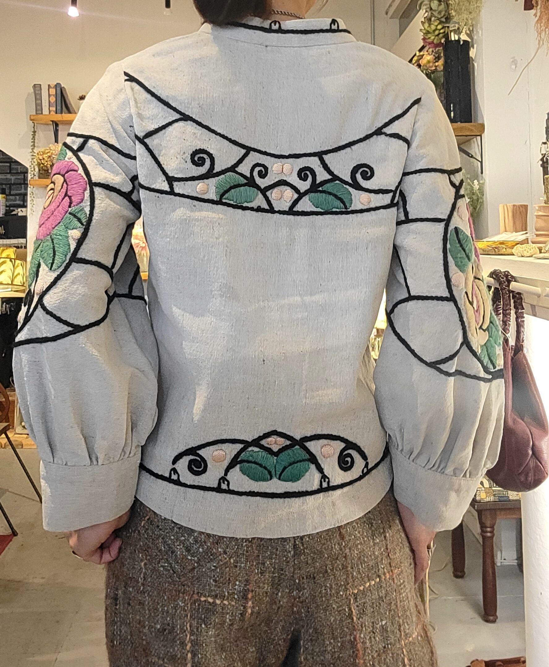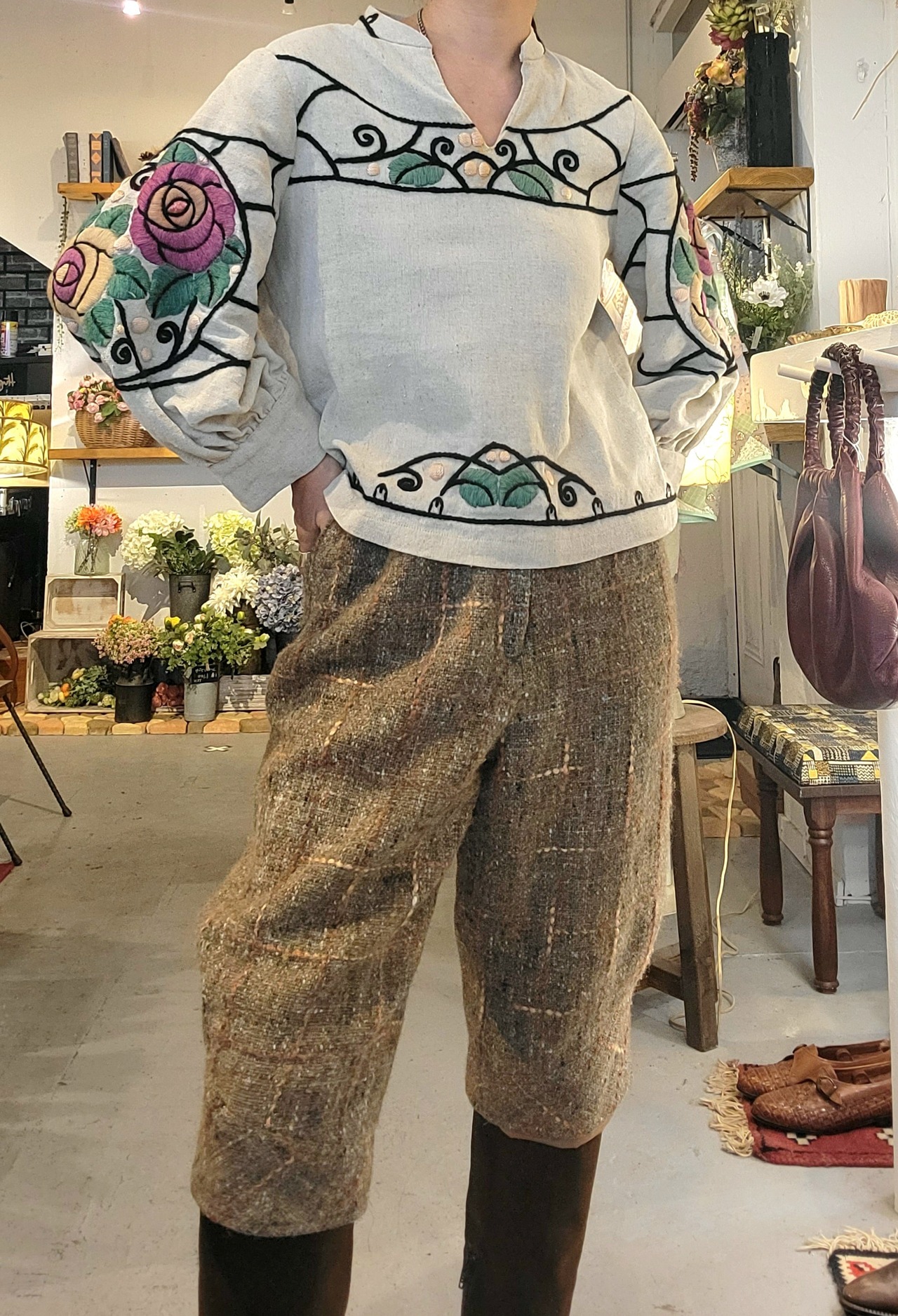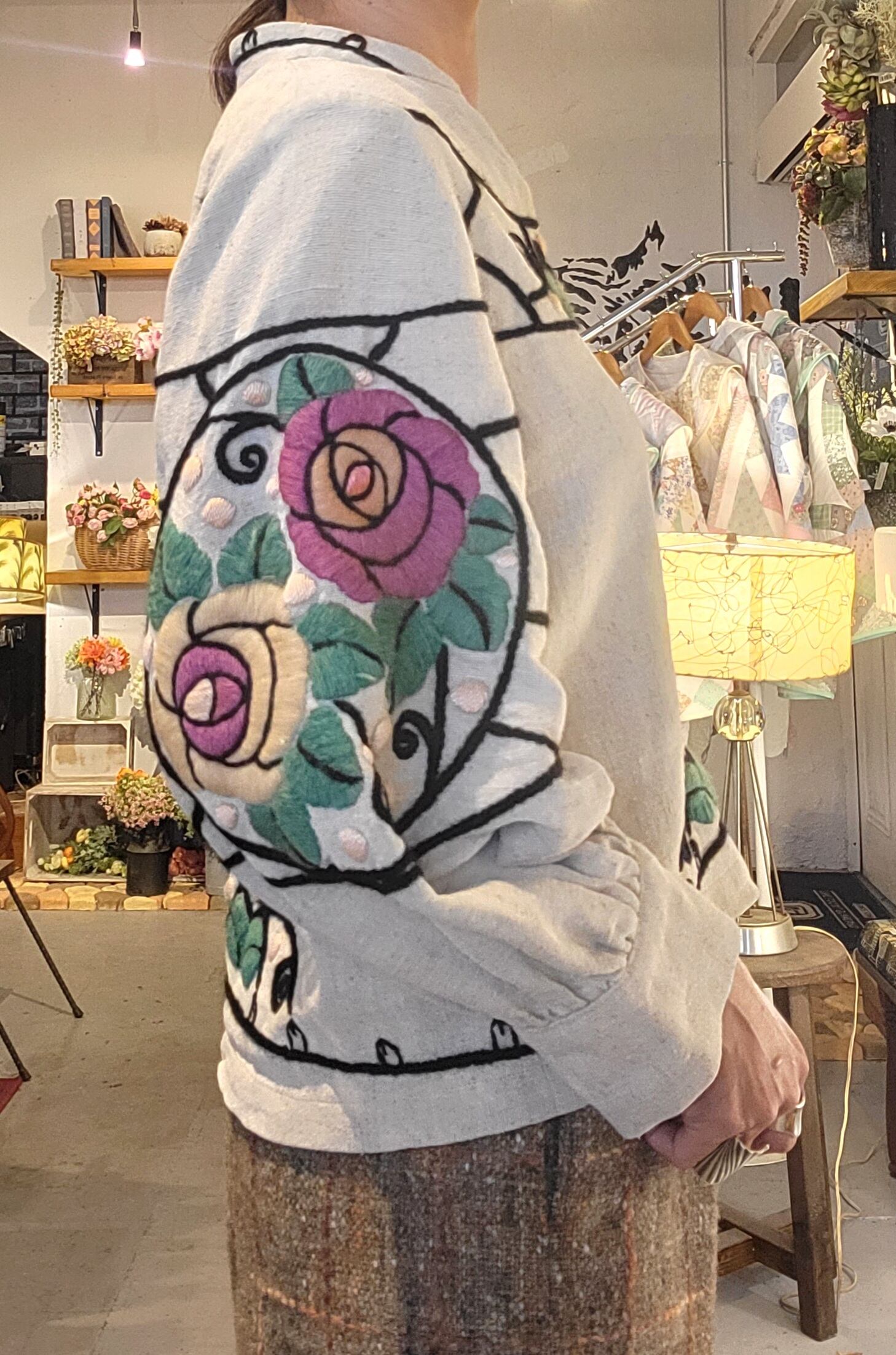 ヴィンテージの刺繍入りリネンクロスを使用したリメイクトップス。プルオーバータイプです。素材表記はありませんがしっかりしたリネンです。全体にネップが入って雰囲気たっぷりの風合いです。袖に施された肉厚で立体感のある刺繍がスペシャルな1枚。