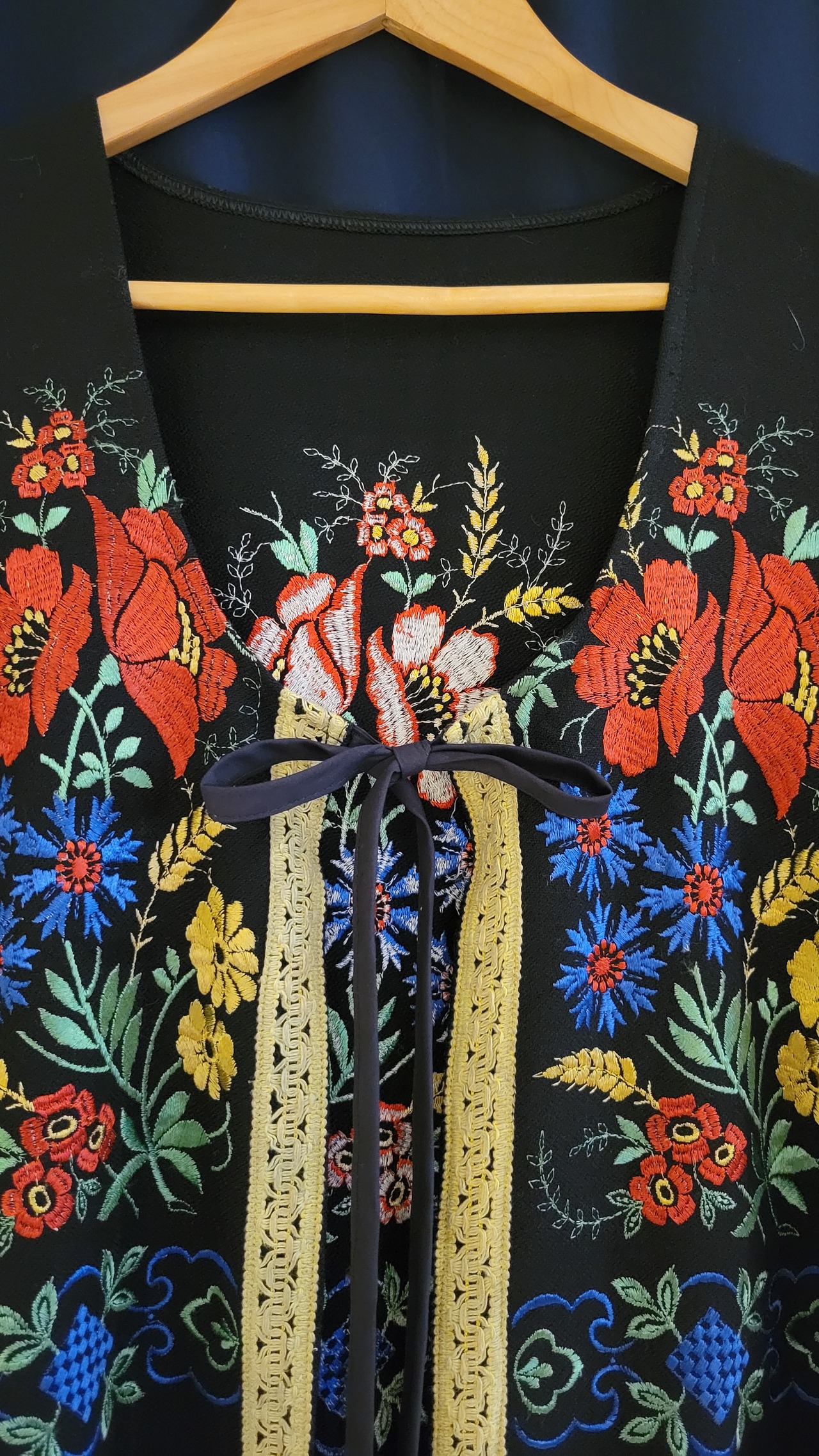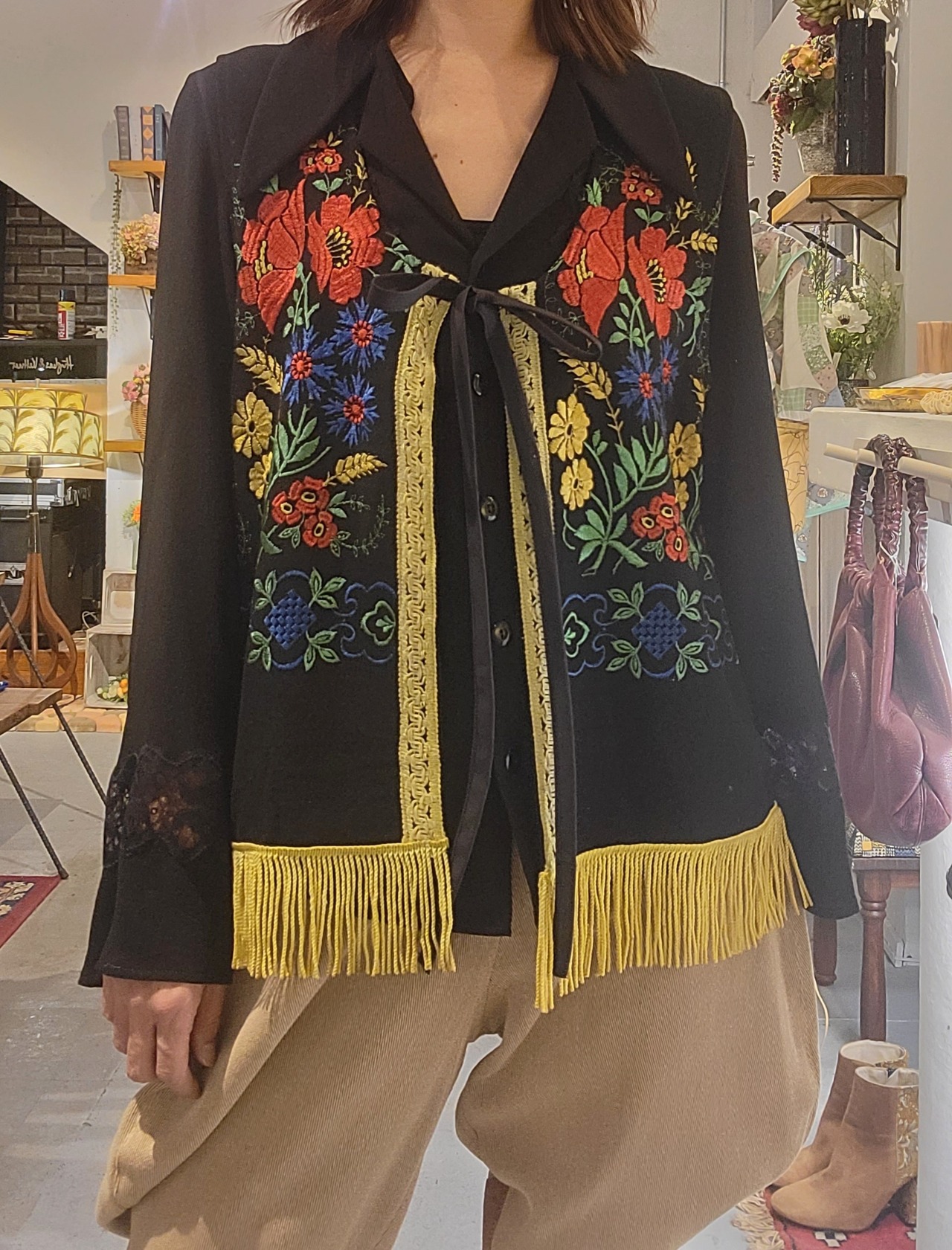 ヴィンテージの刺繍ショールを使用したリメイクベスト。素材表記はありませんが薄手のウールのようです。フリンジの重みですとんと落ち感がありきれいなシルエットをキープできます。胸元にリボン付き。黒地に鮮やかな刺繍が魅力的です。