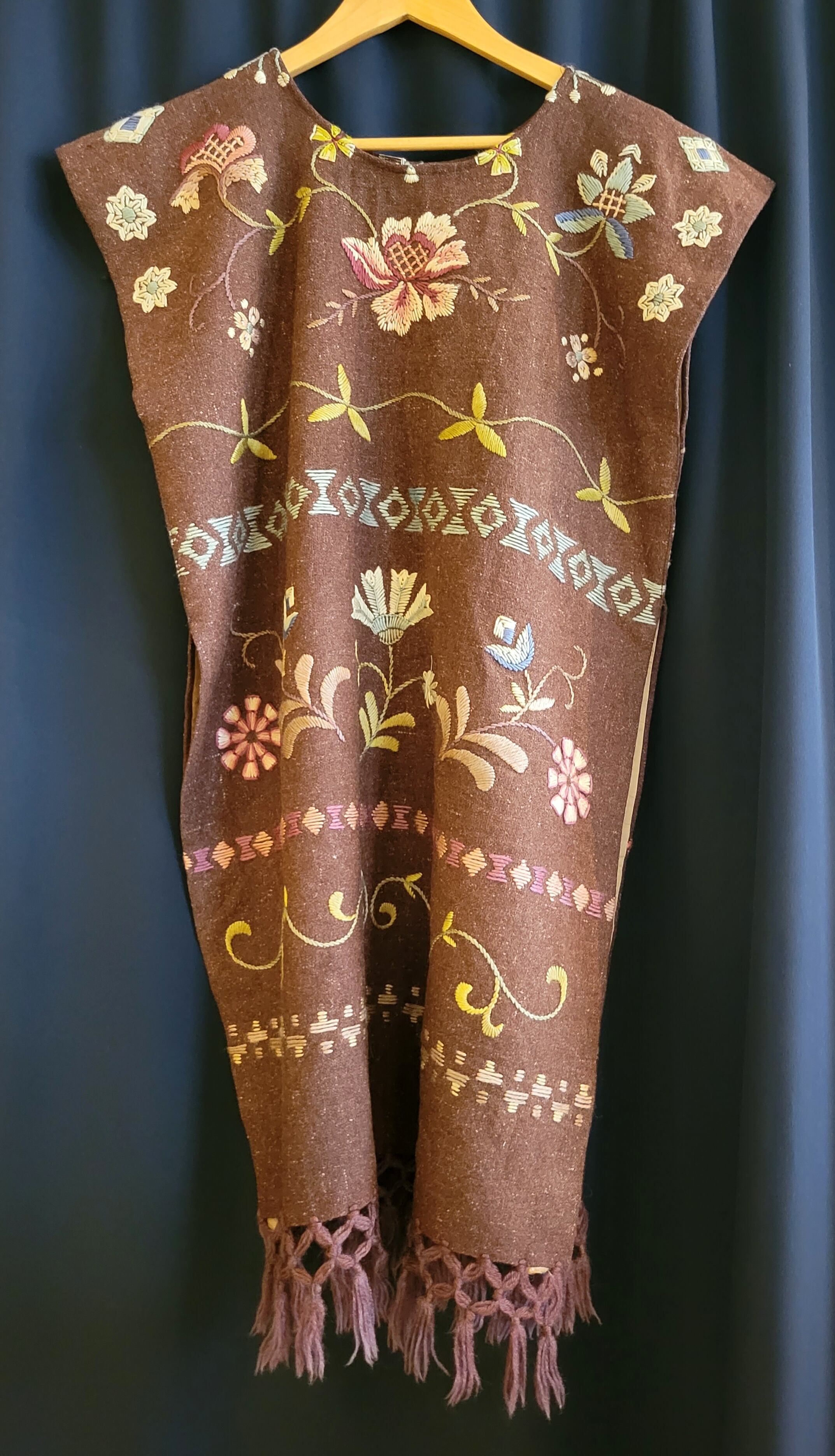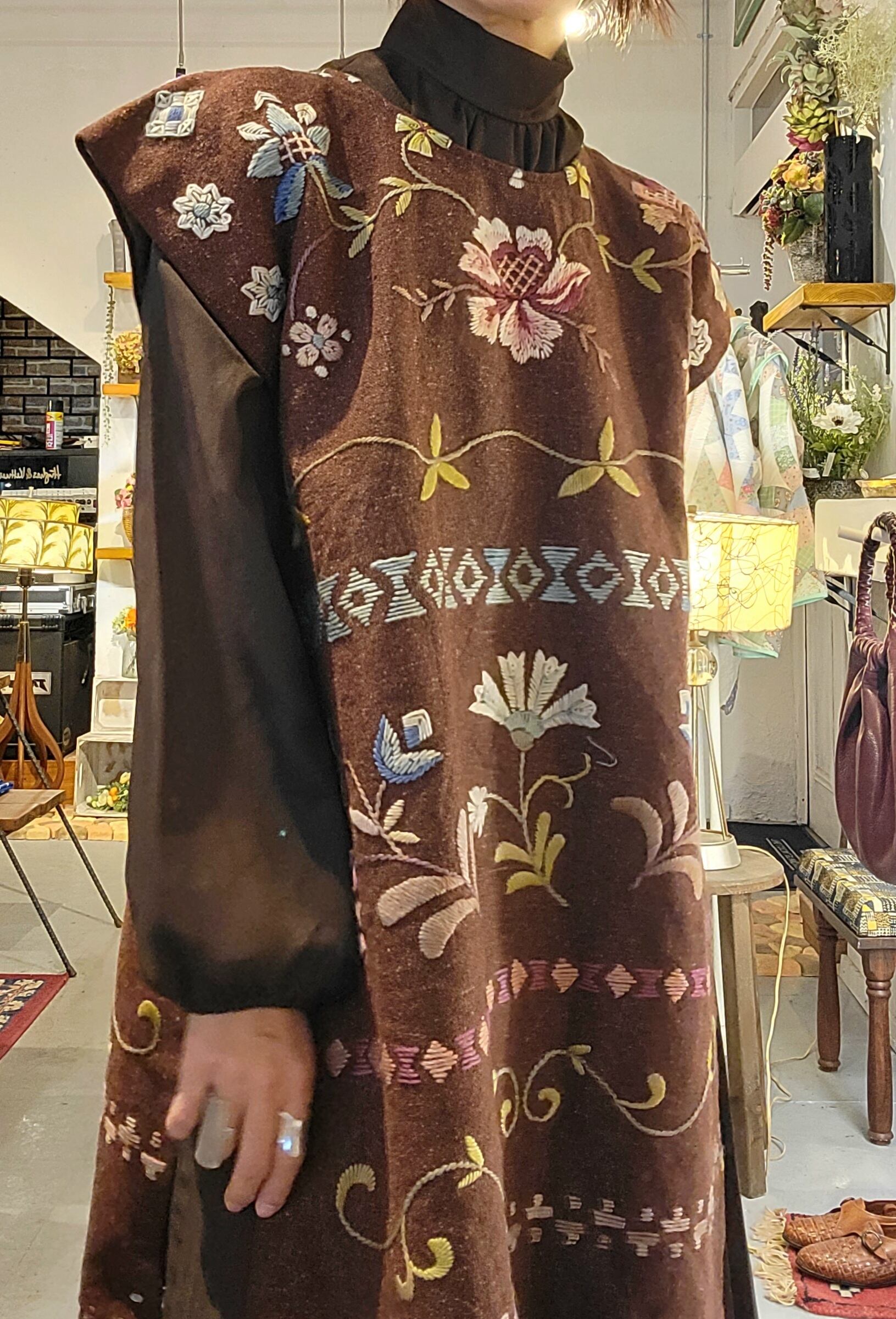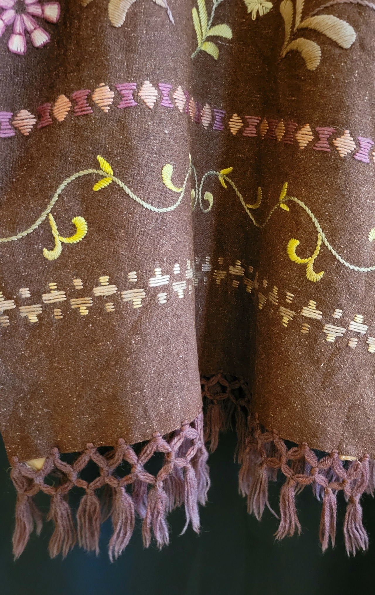 ヴィンテージの刺繍ポンチョ。素材表記はありませんがウールのようです。サイドはフルオープンではなく脇下で縫われており、腕が通せるため着用時にずれにくく安定感があります。落ち着きのあるブラウンベースに優しい色合いの刺繍。大人っぽく着られるシックな雰囲気のポンチョです。