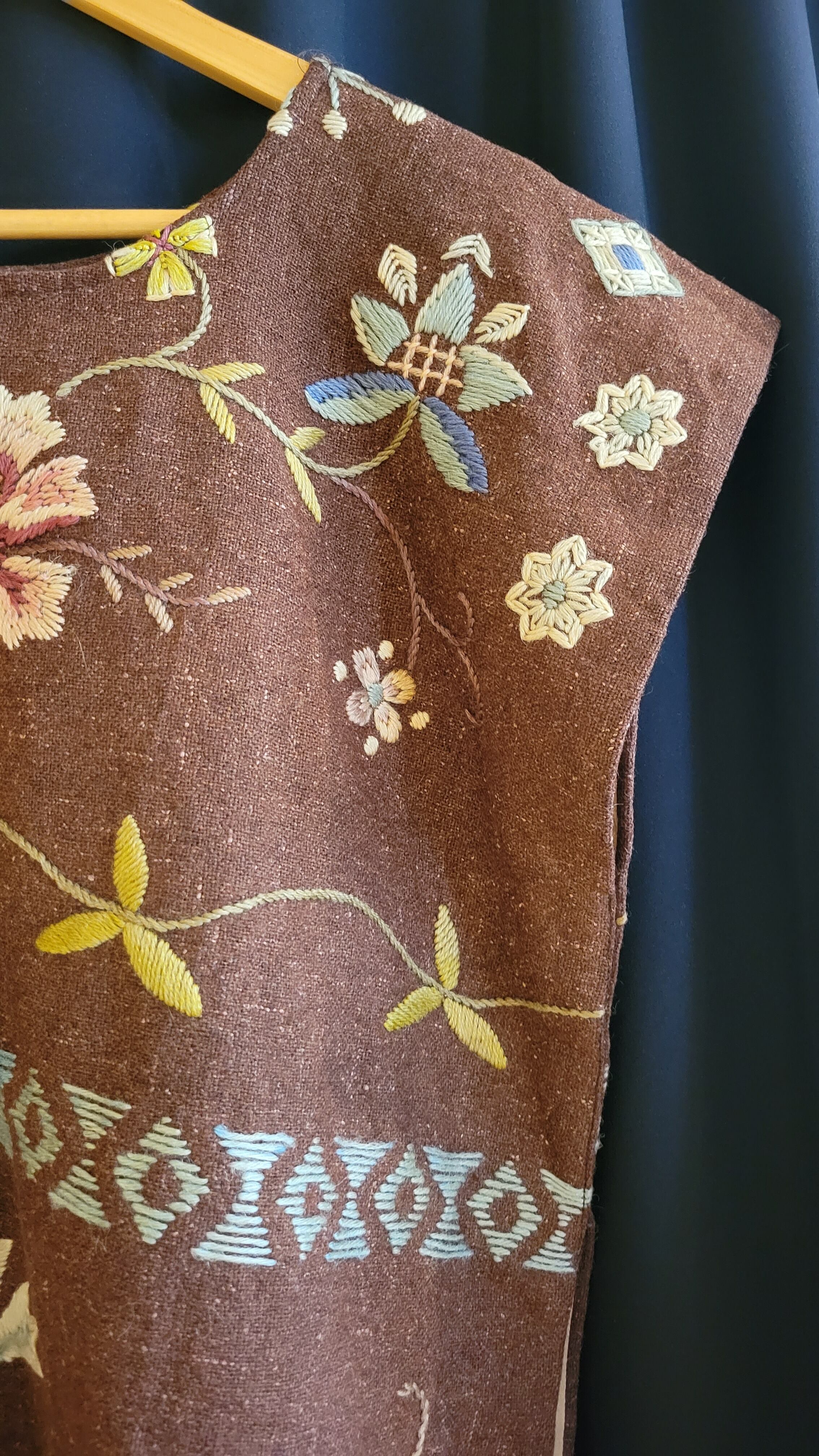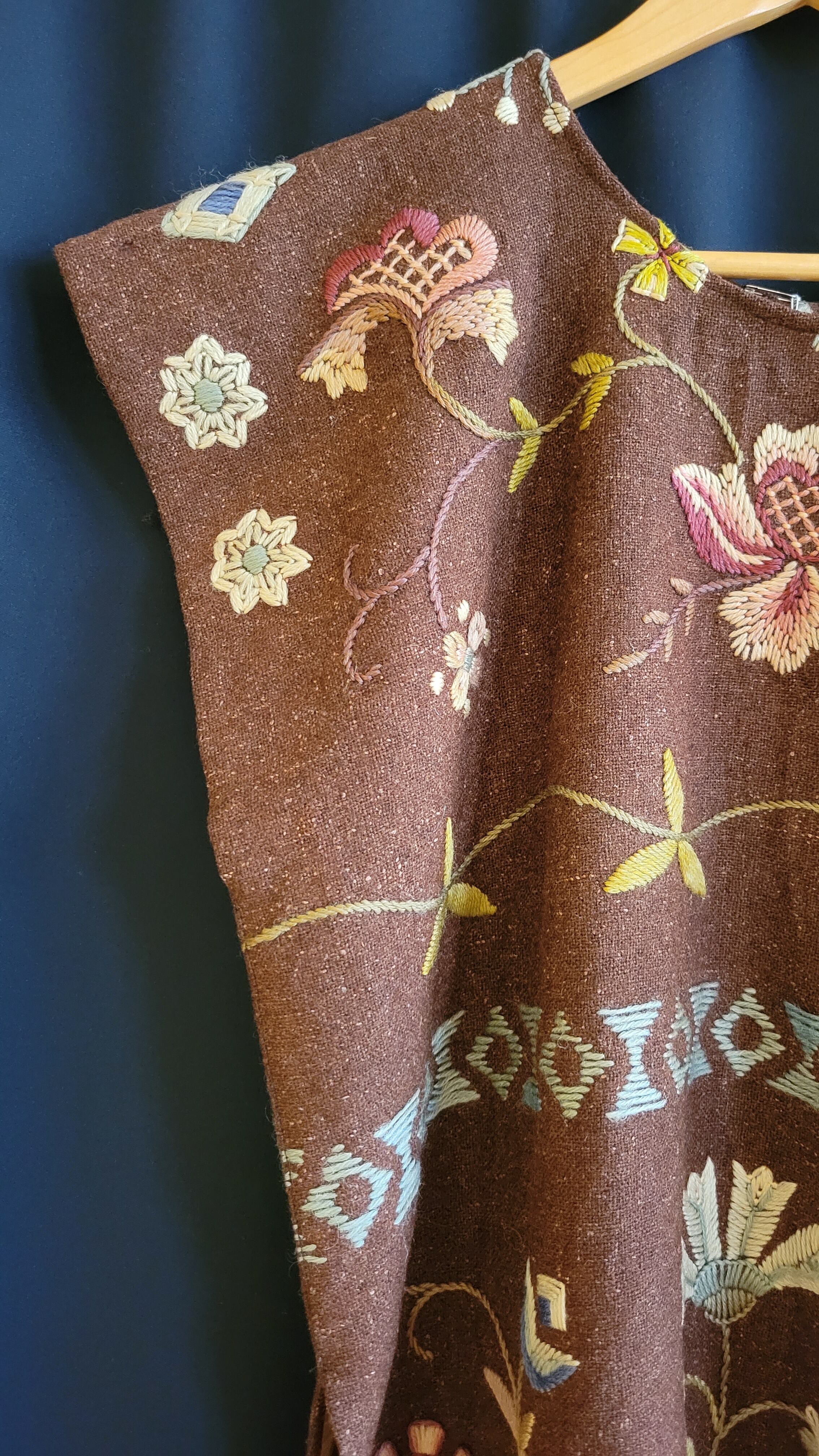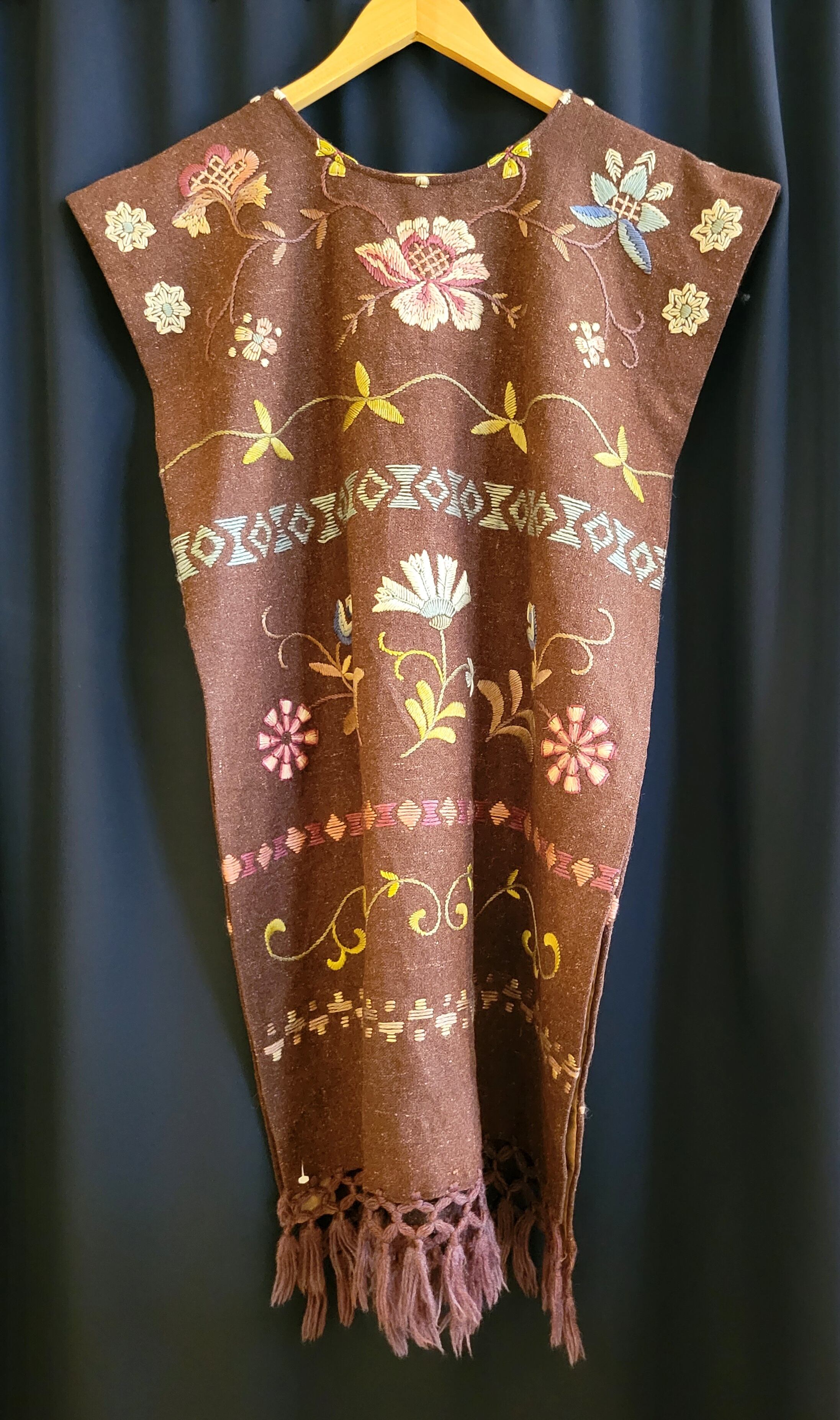 ヴィンテージの刺繍ポンチョ。素材表記はありませんがウールのようです。サイドはフルオープンではなく脇下で縫われており、腕が通せるため着用時にずれにくく安定感があります。落ち着きのあるブラウンベースに優しい色合いの刺繍。大人っぽく着られるシックな雰囲気のポンチョです。