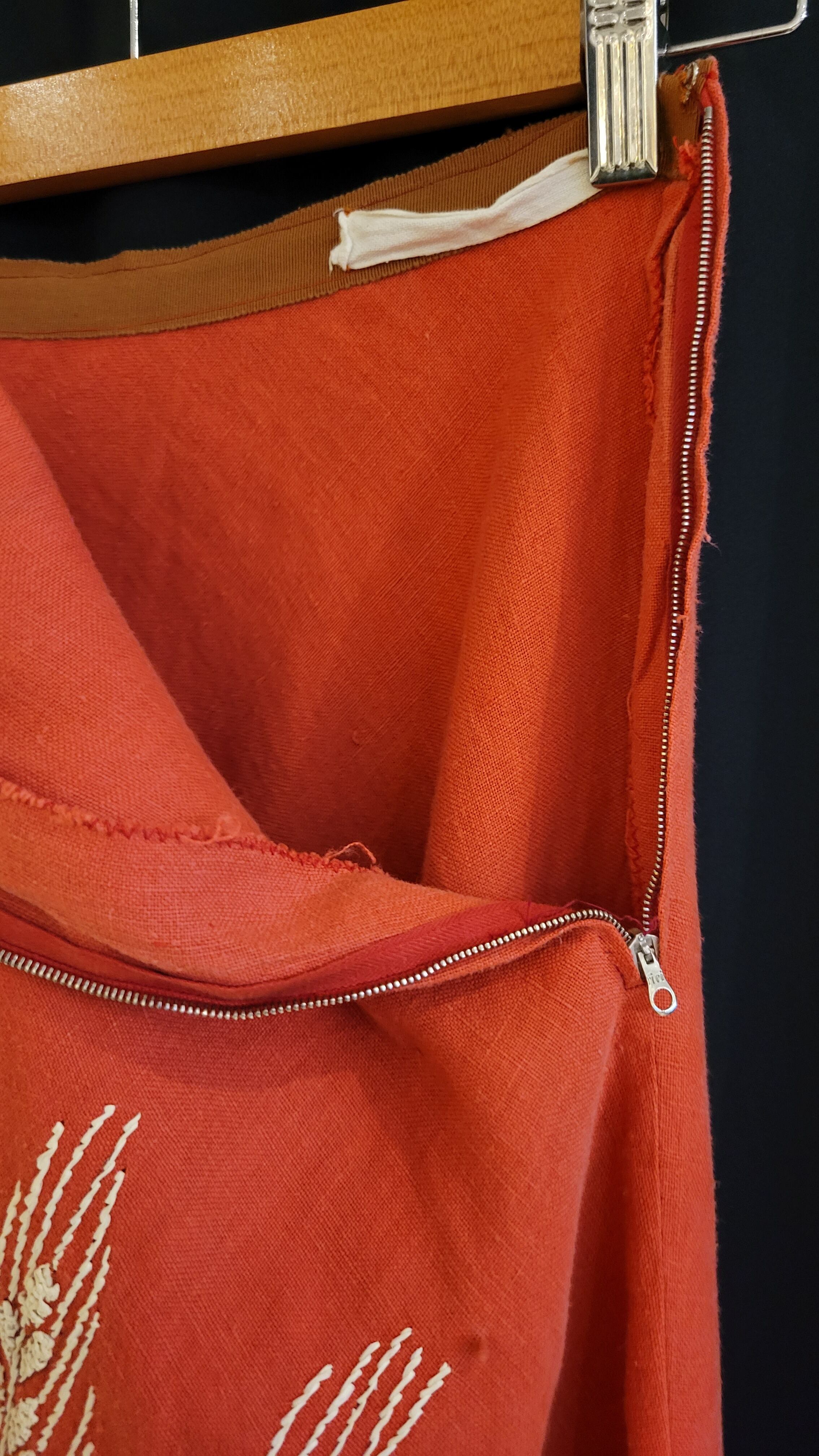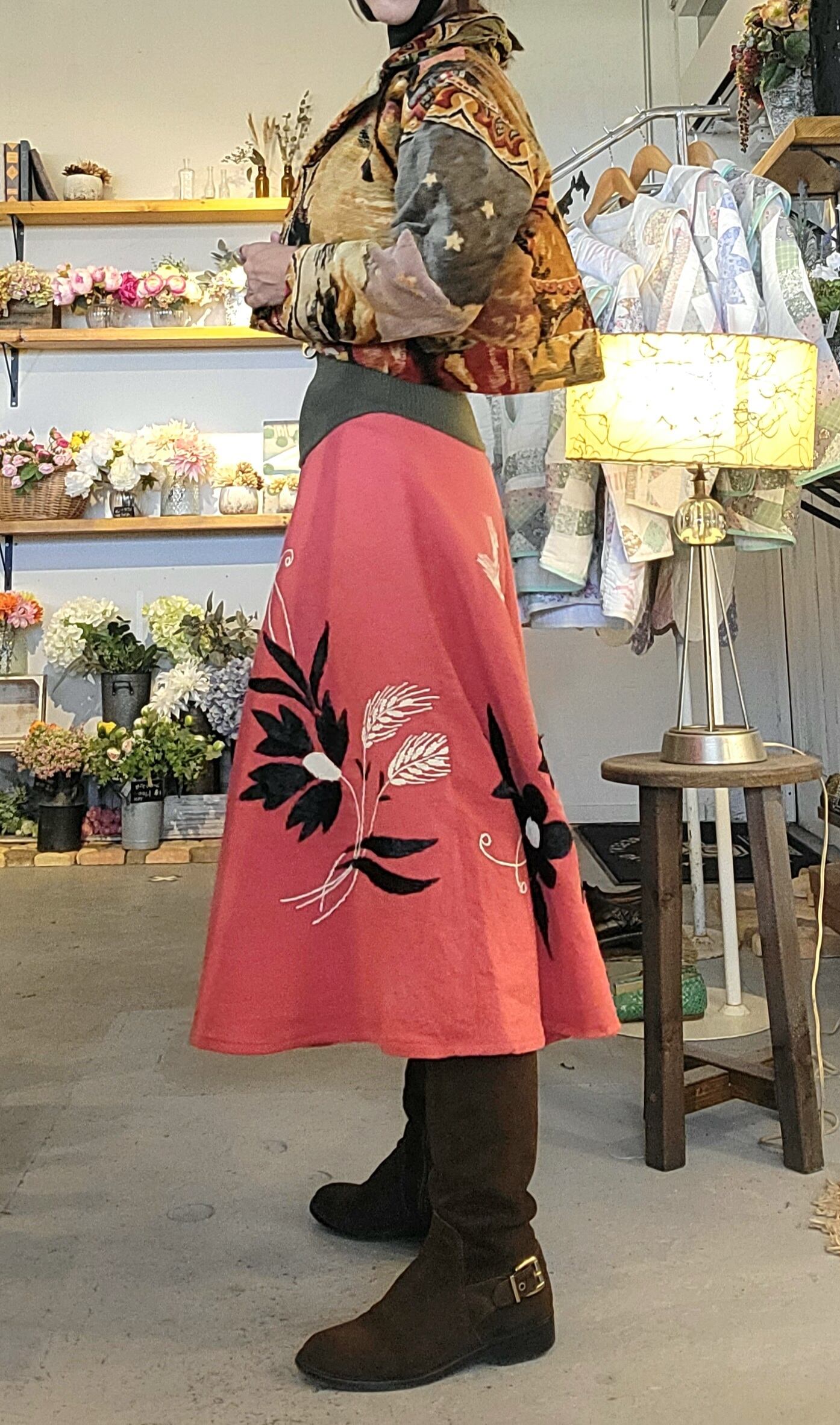 ヴィンテージの刺繍入りフレアスカート。素材表記はありませんがコットンです。サイドジッパー付き。刺繍部分の素材はラフィアのようです。少し色褪せた赤がこなれた雰囲気。立体感のある大柄の刺繍が存在感のある1枚です。