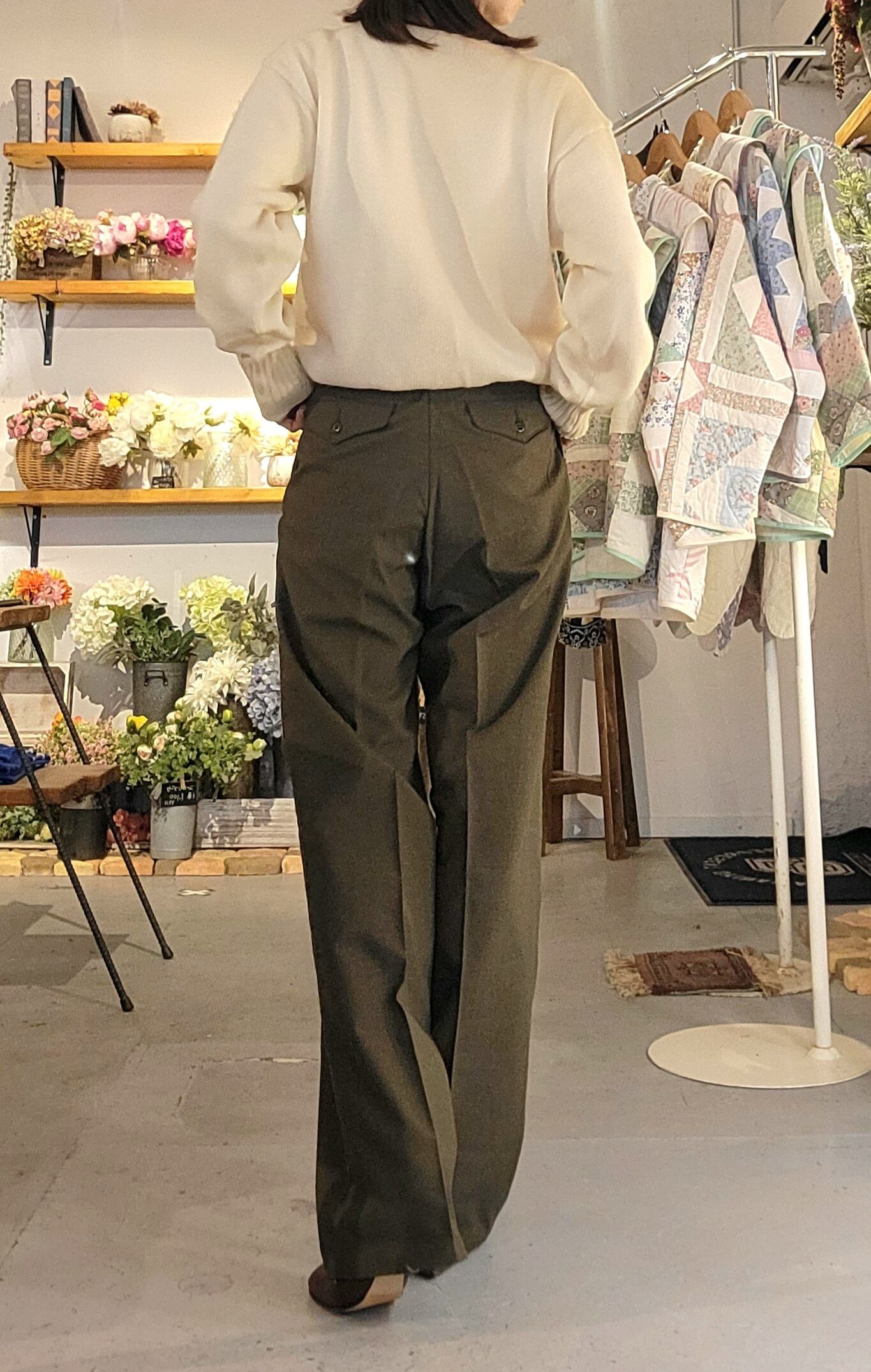 デッドストックの USヴィンテージのミリタリースラックスにヴィンテージのティータオルをパッチワークであしらったリメイクパンツです。