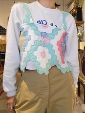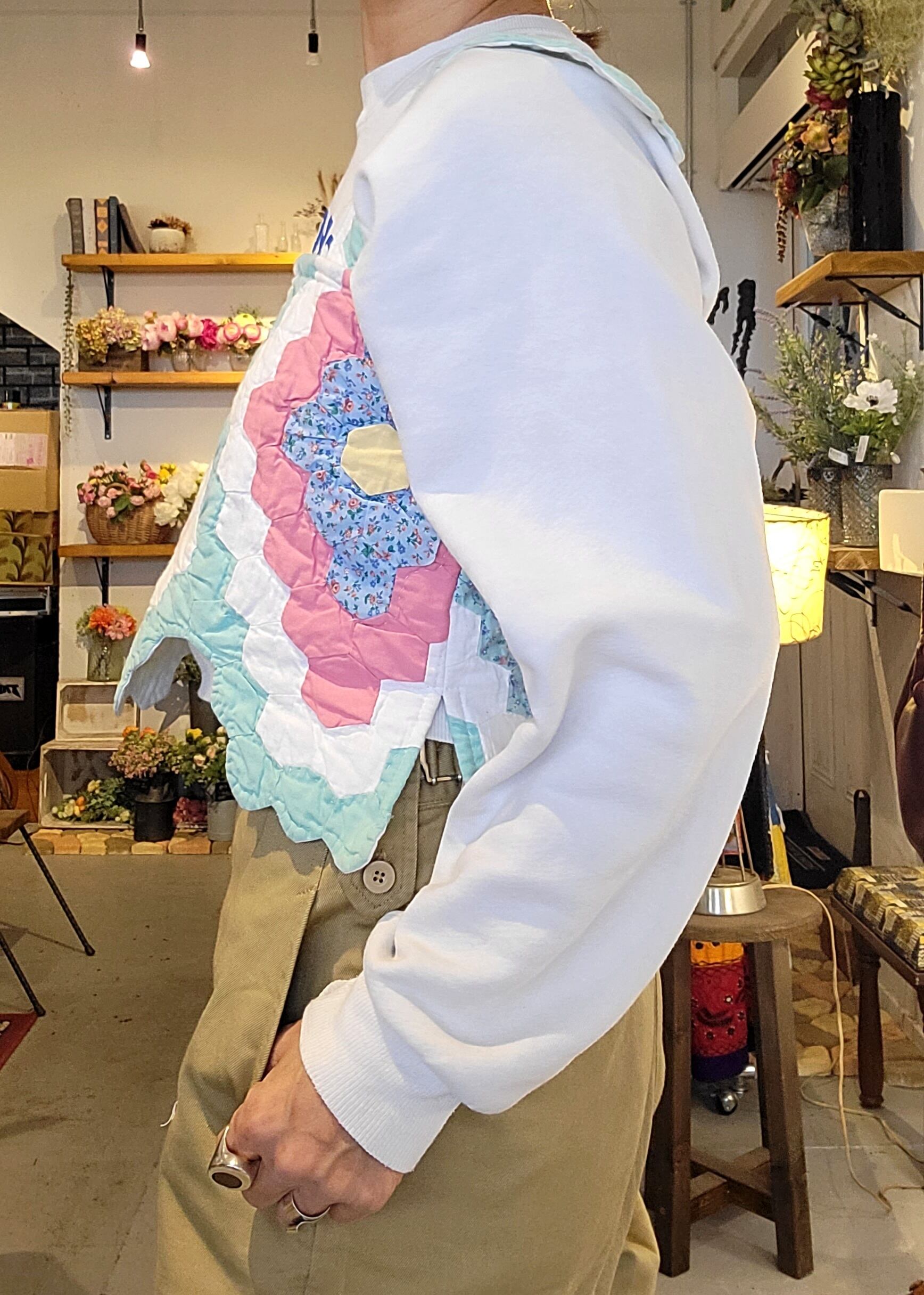 ヴィンテージのキルト生地を使用したリメイクビスチェ。素材はコットンです。可愛らしいパステルカラーと中綿キルトの立体感が魅力の一枚。左右裾から10cmほどのスリット入り。裾やショルダーのデザインも素敵です。