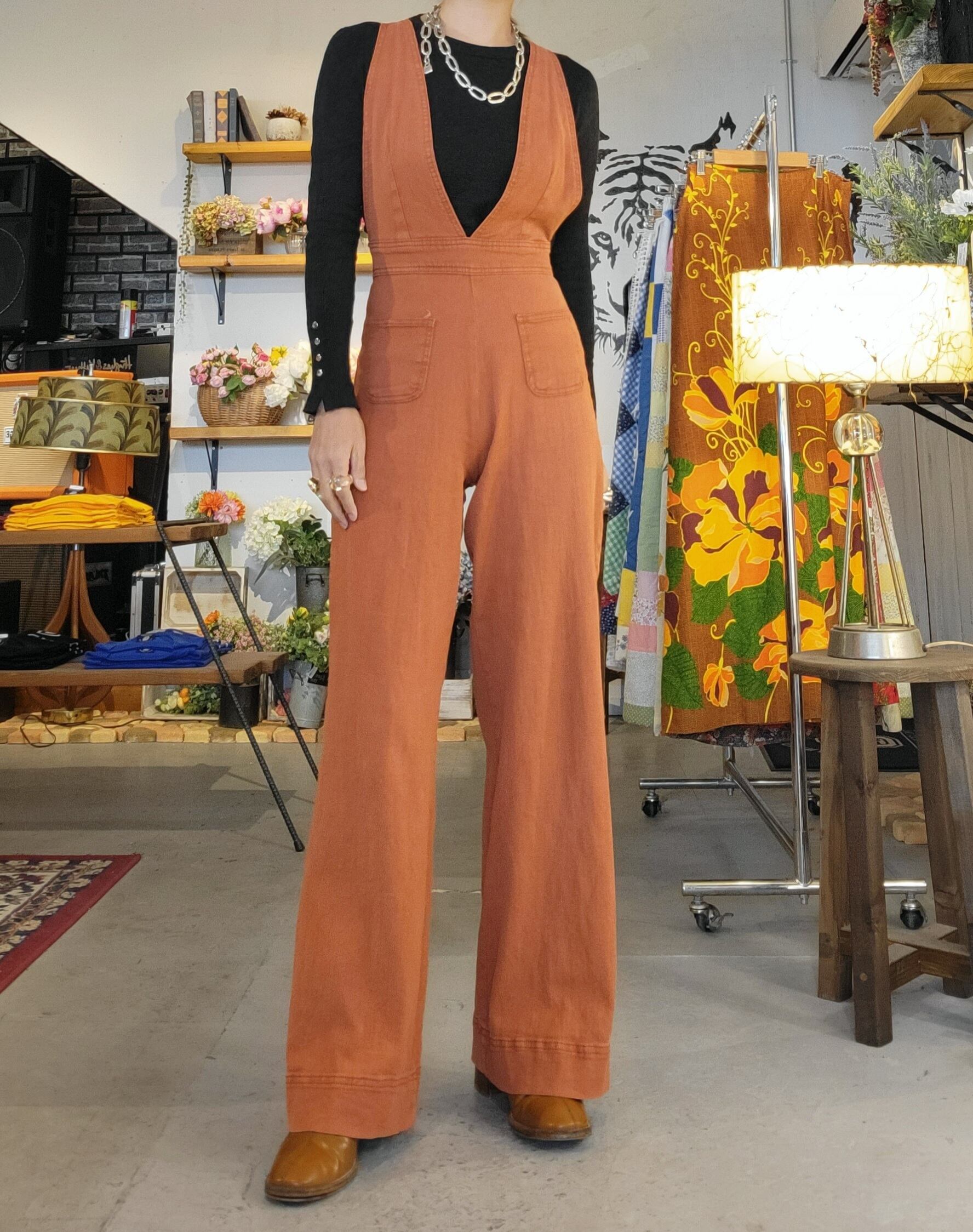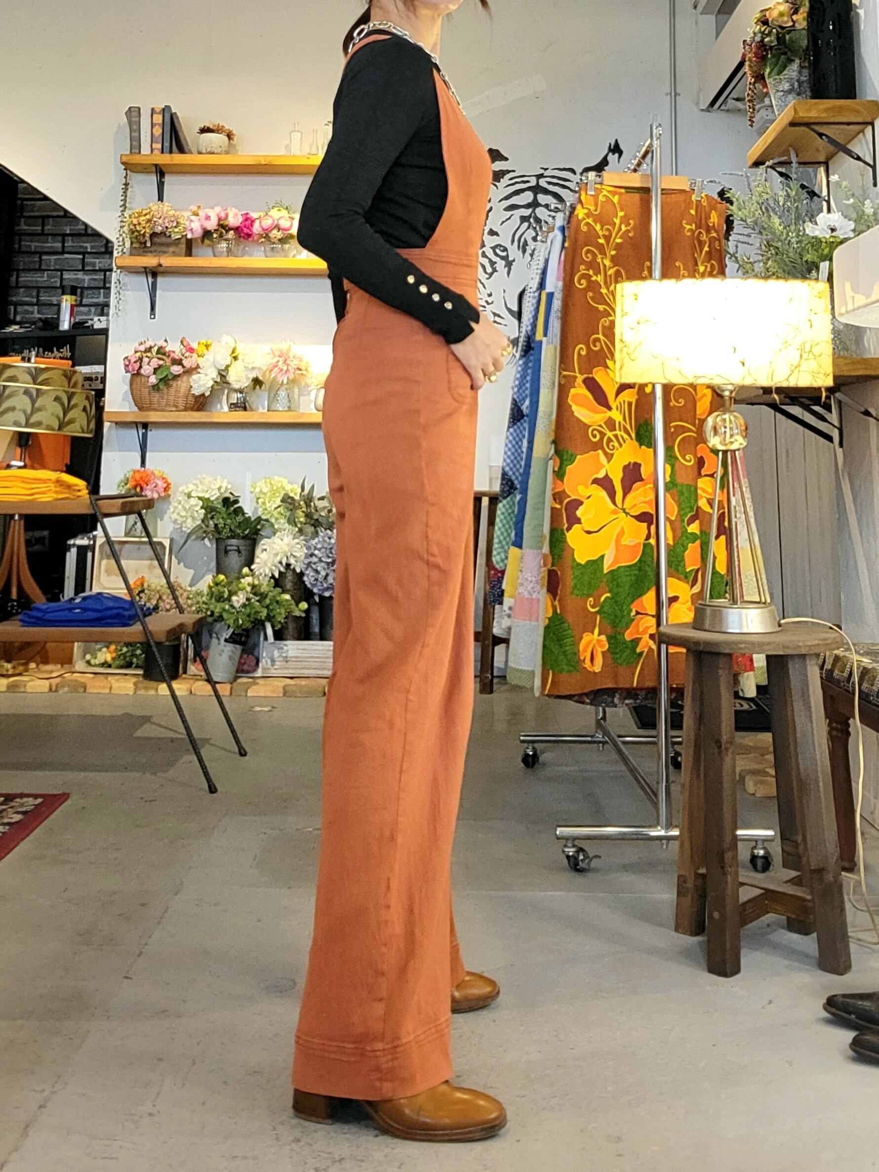 レンガ色が素敵なヴィンテージサロペット。細身ですがストレッチの効いた柔らかい素材で着心地は楽です。ハイウエストでスタイルアップが叶います。バッククロスで後ろ姿も可愛い1着。