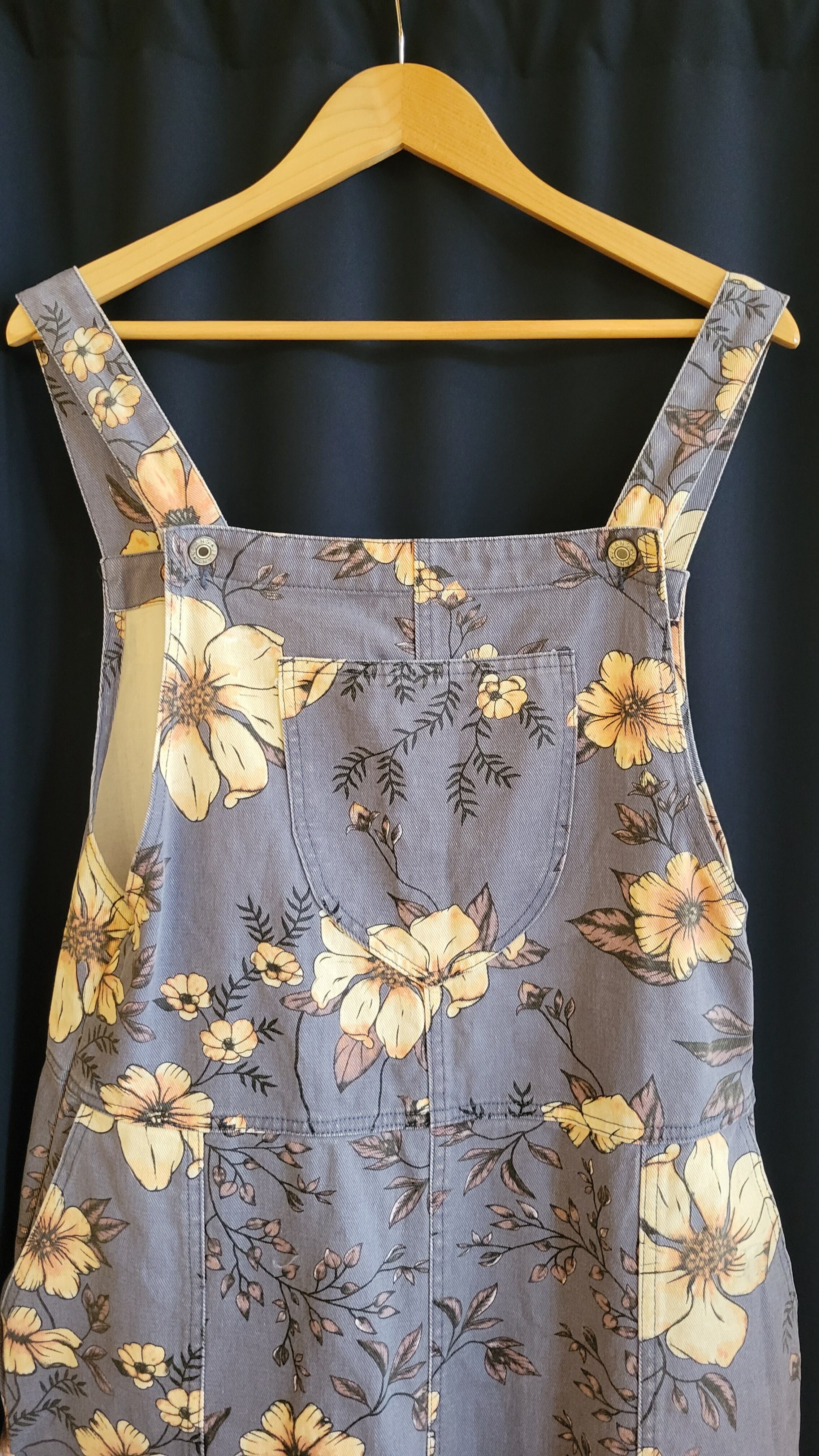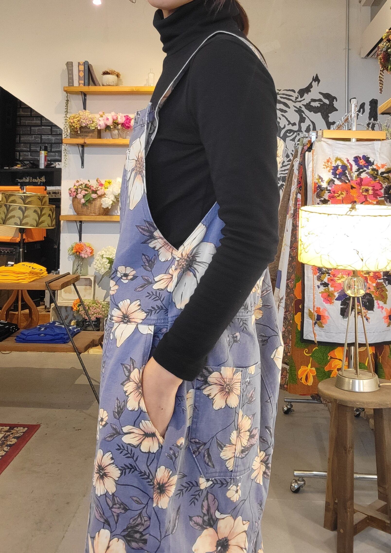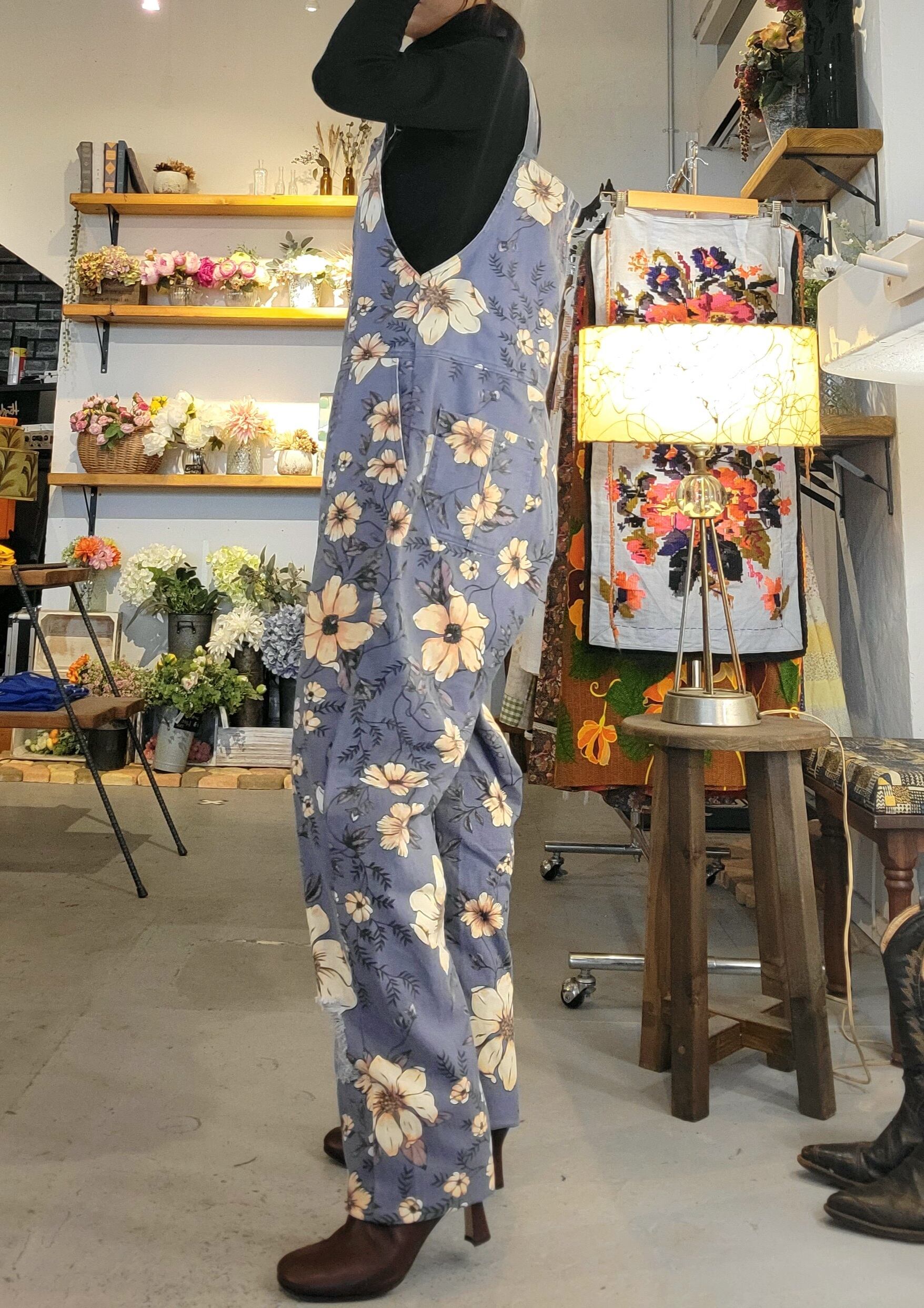 ヴィンテージの花柄オーバーオール。素材はコットンです。ゆったりしたサイズ感で中に厚手のニット等も合わせていただけます。裾がテーパードシルエットなのでオーバーサイズながらも見た目はすっきりした印象です。