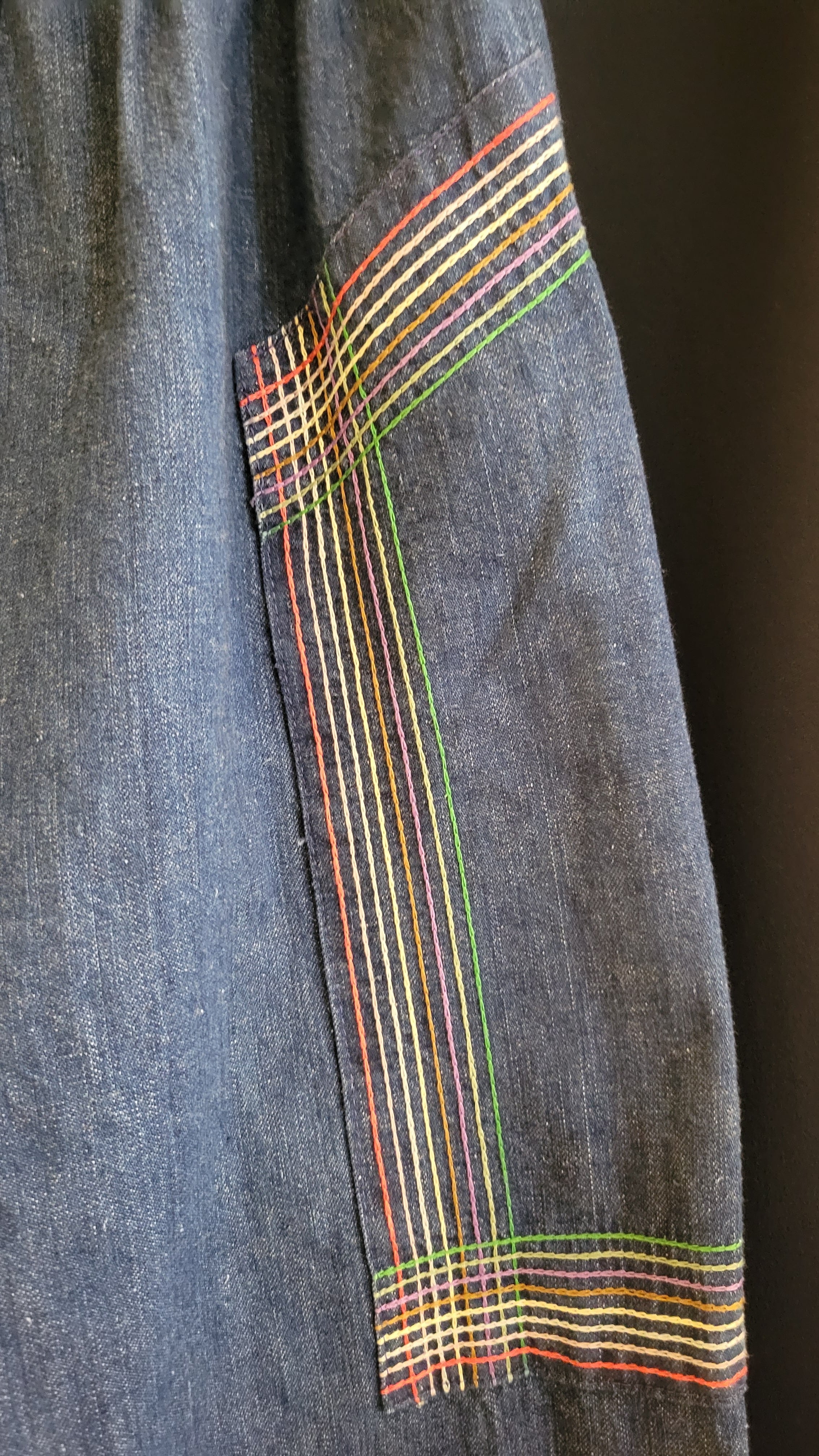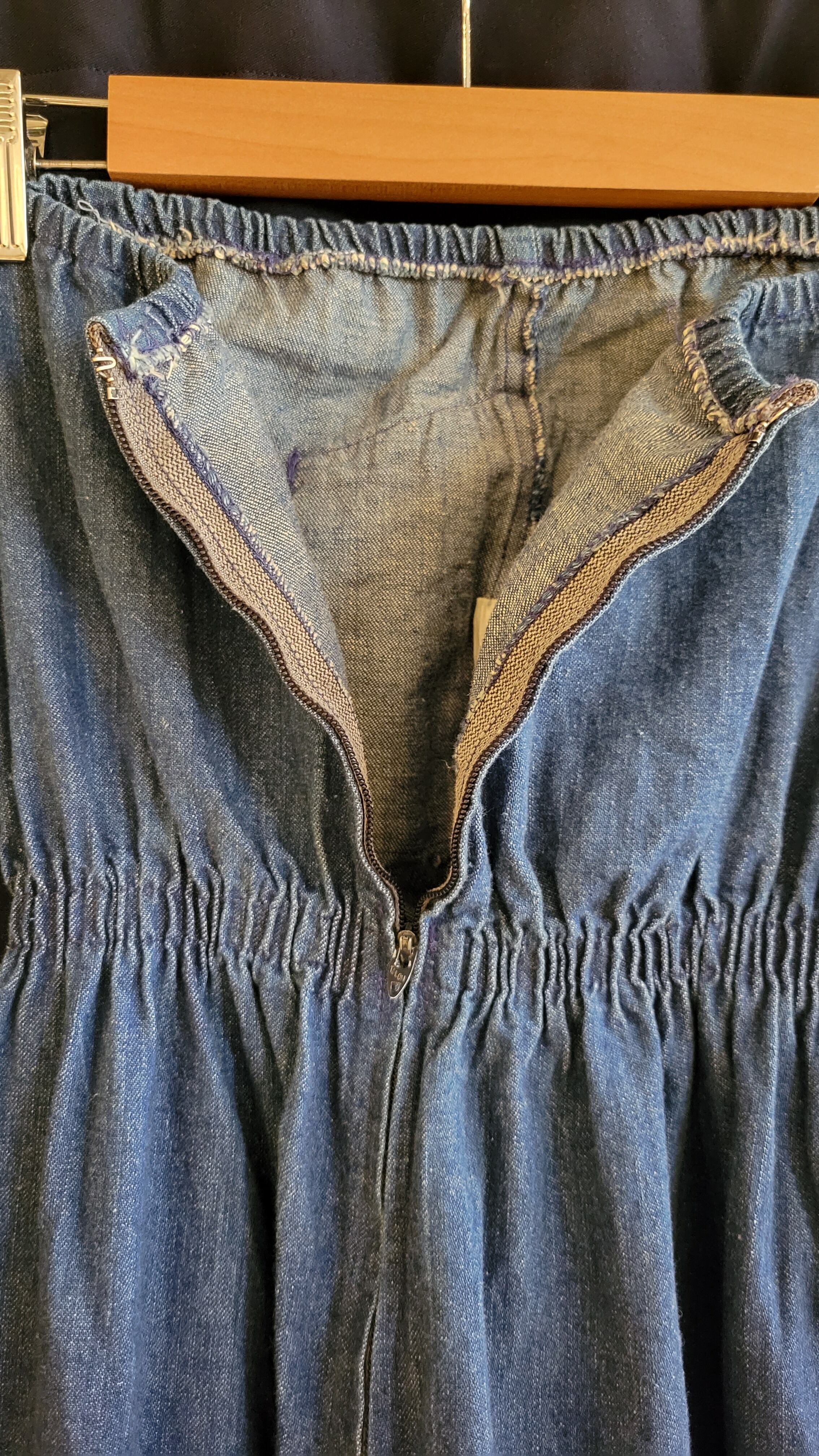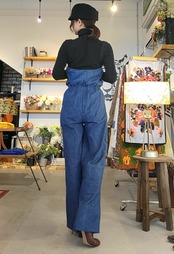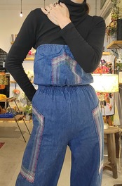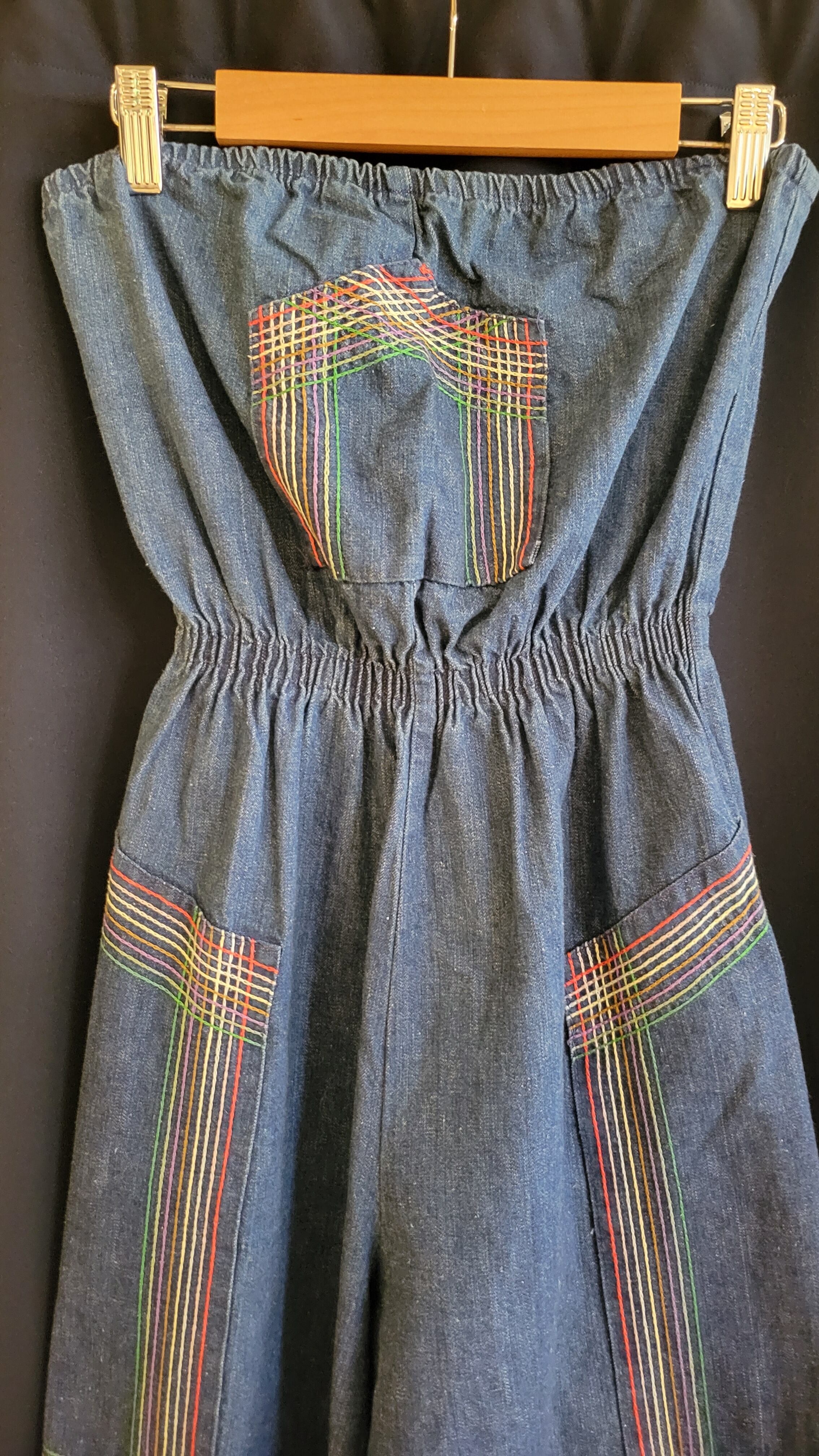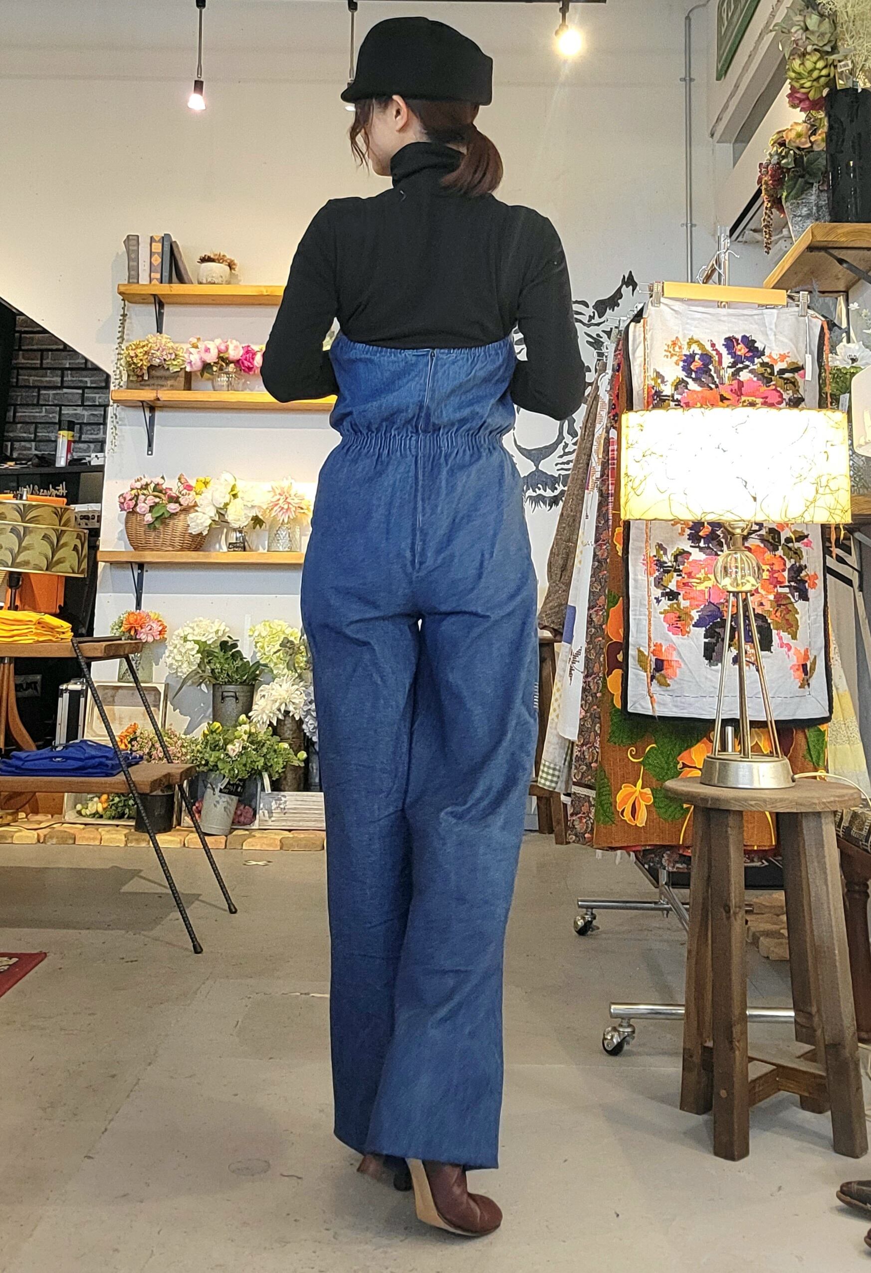 Made in USA ベアトップデザインのヴィンテージデニムサロペット。バックファスナーが付いています。カラフルな刺繍にワイド&フレアなシルエットが70sムードたっぷり。ノスタルジックで可愛い一着です。