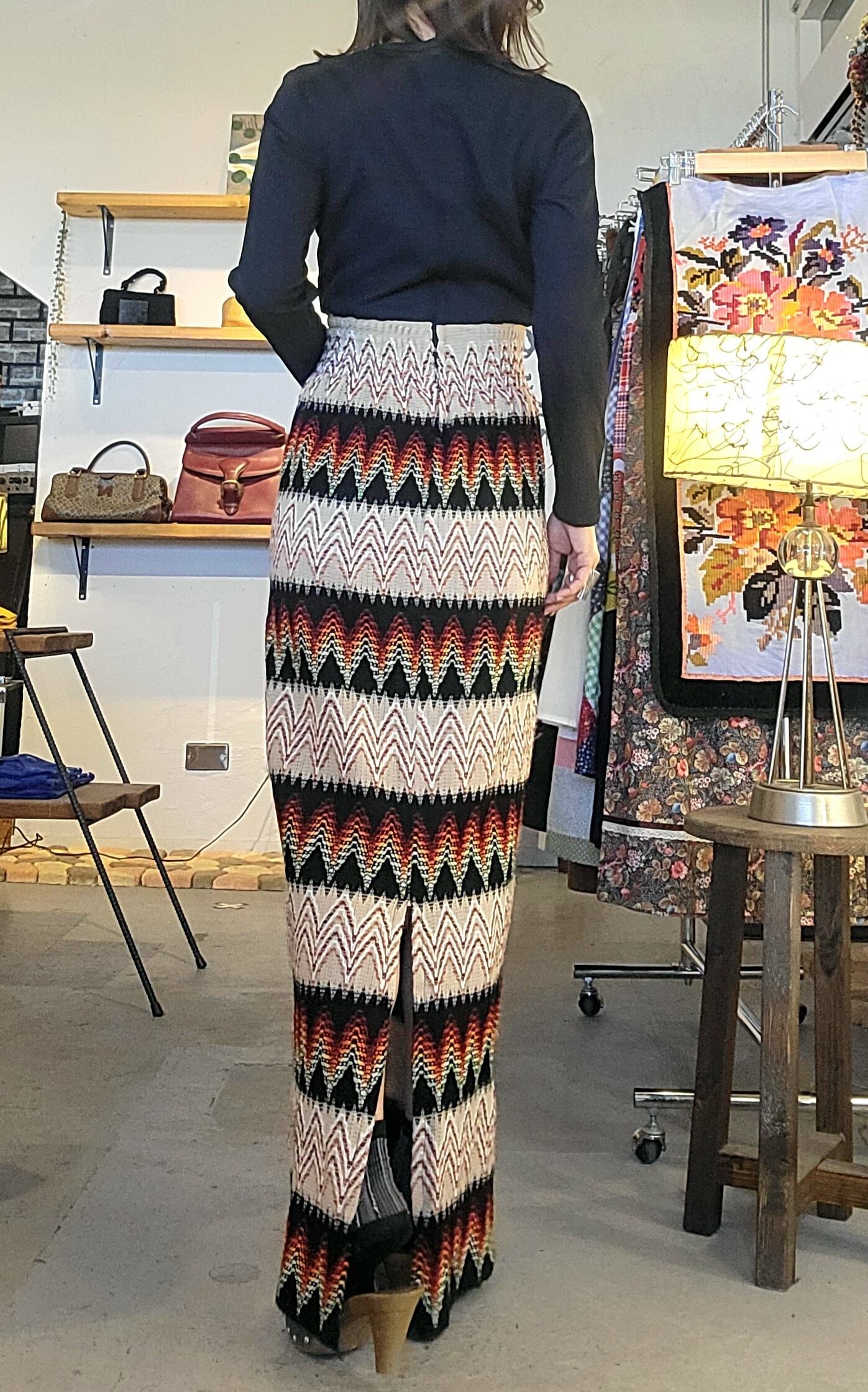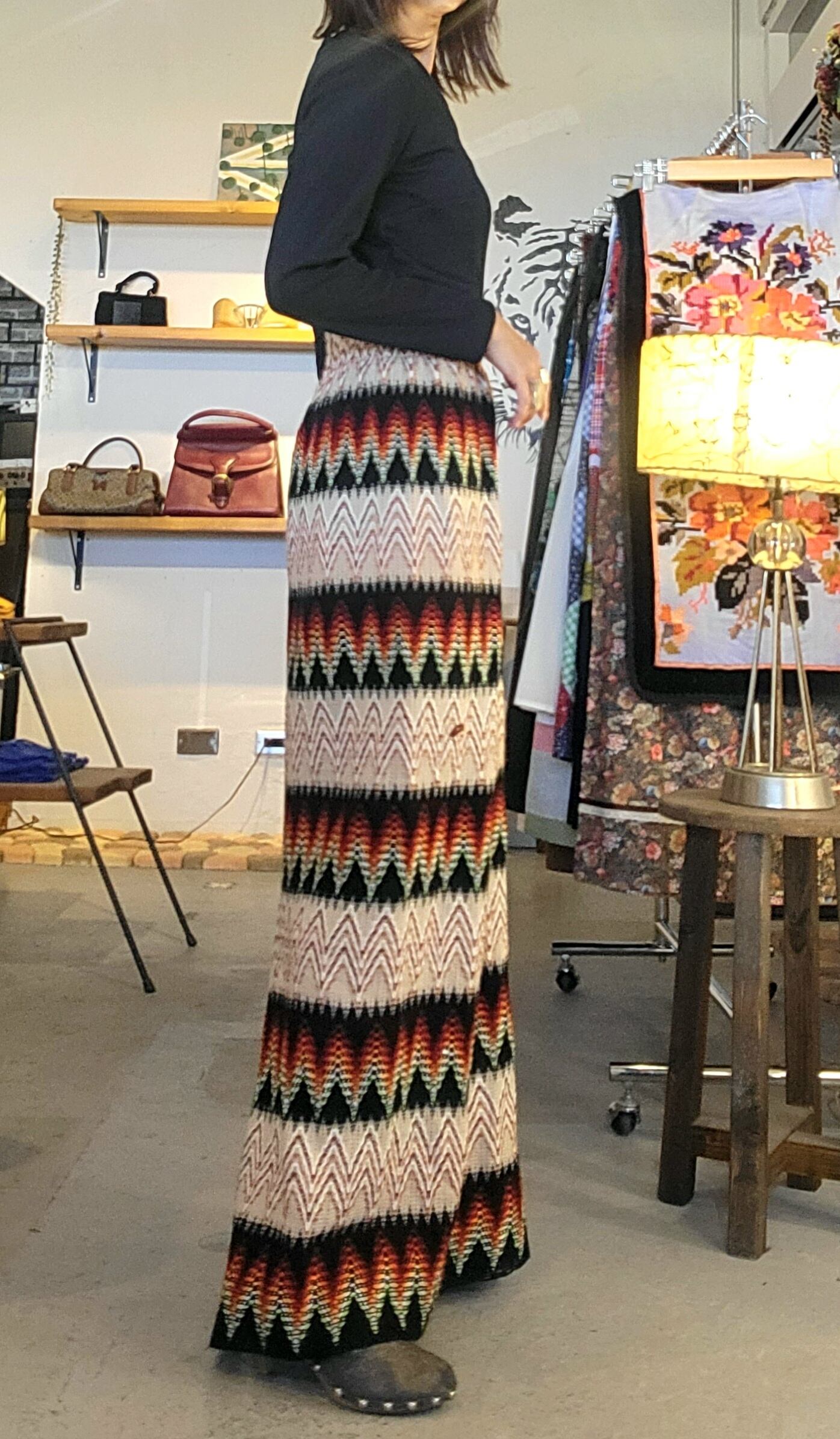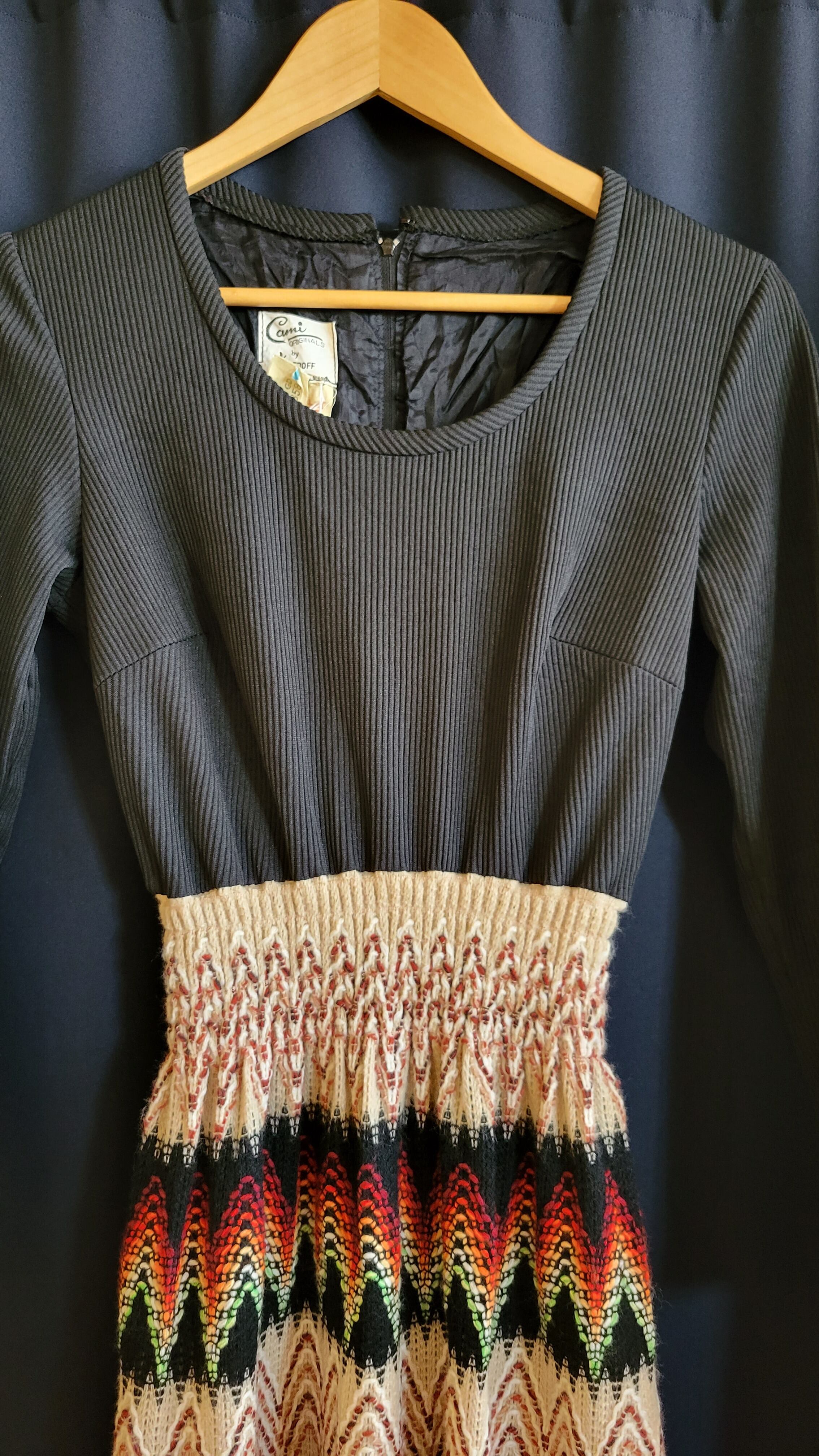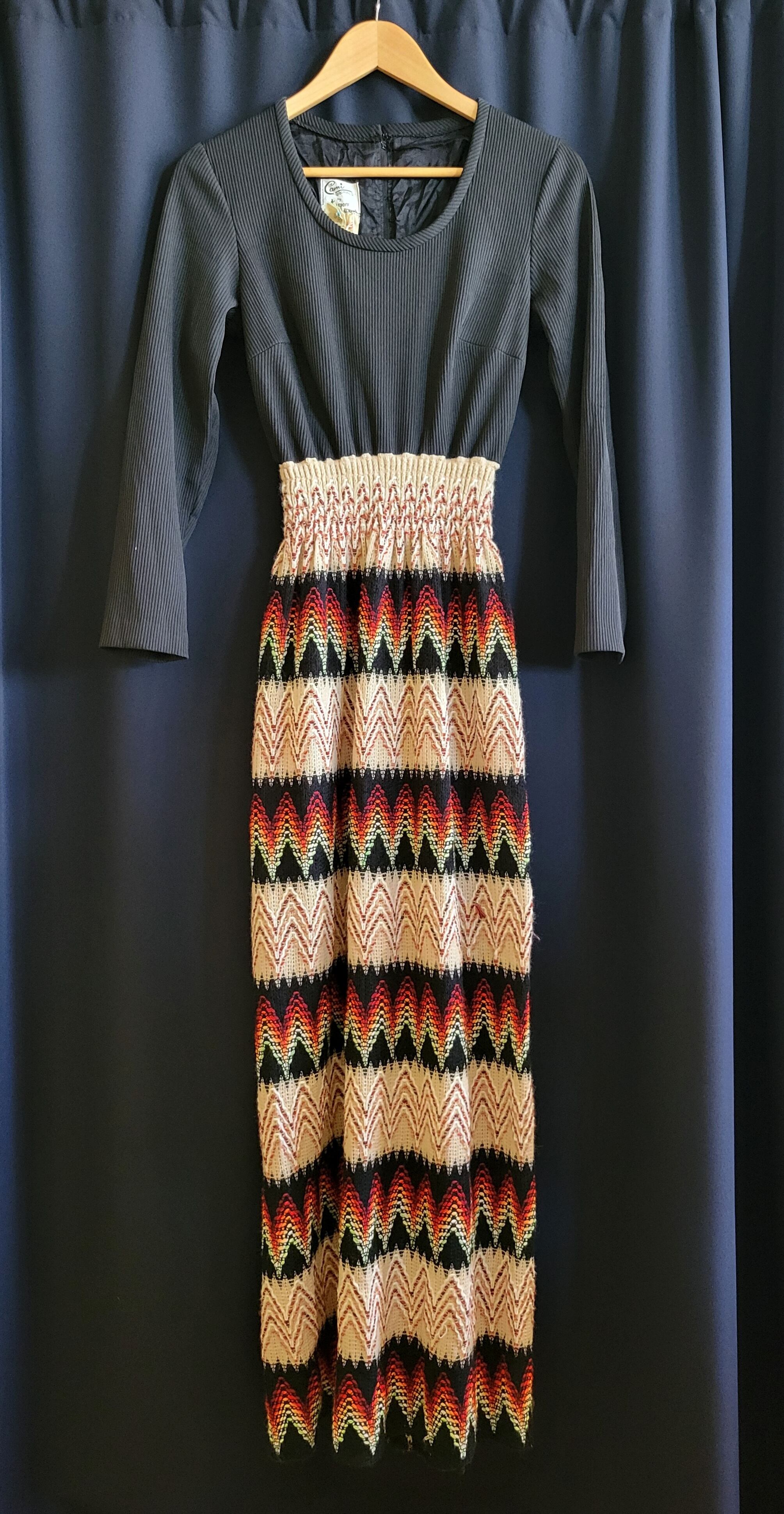 Made in Canada のヴィンテージマキシワンピース。素材はトップス部分がポリエステル100% スカート部分がアクリル90%/ ポリエステル10% です。若干の伸縮性があります。ウエストはシャーリングのゴム仕様。スカート後ろセンターに裾から45cmのスリット入り。裏地は付いていません。ほどよい開きのUネックでお顔周りすっきり。バックファスナー付きで着脱も簡単です。