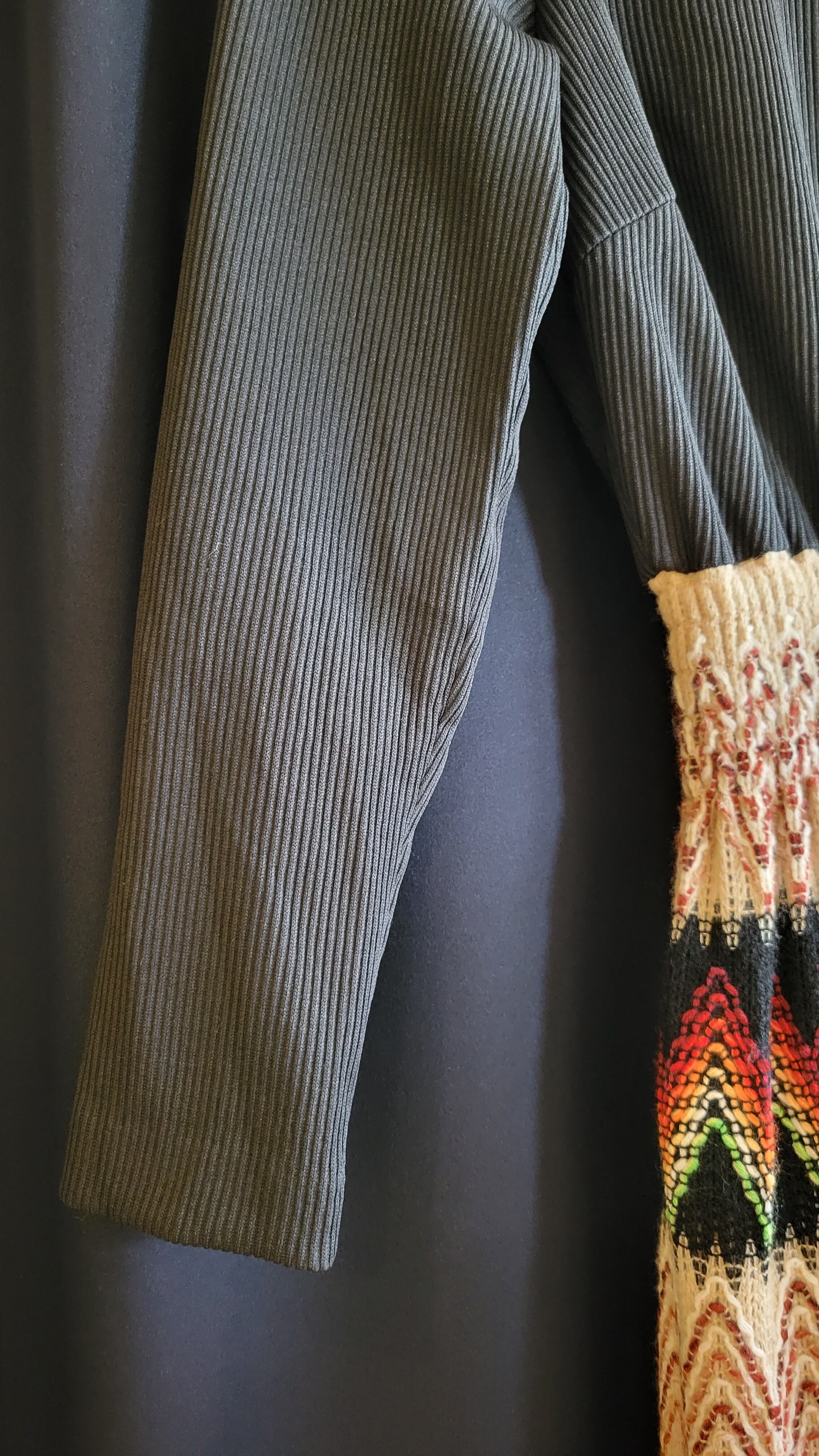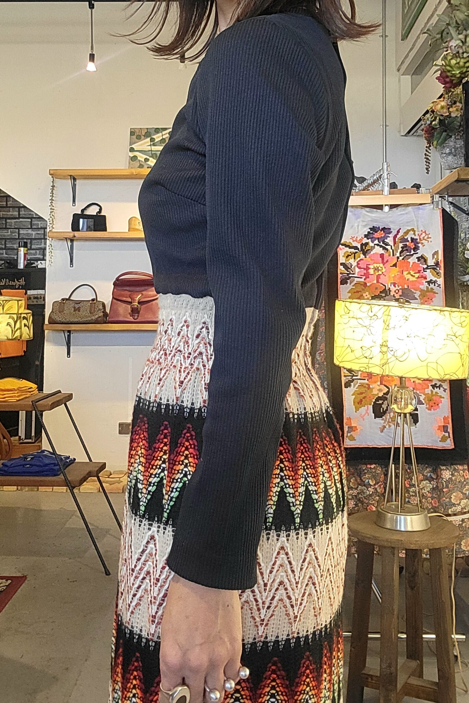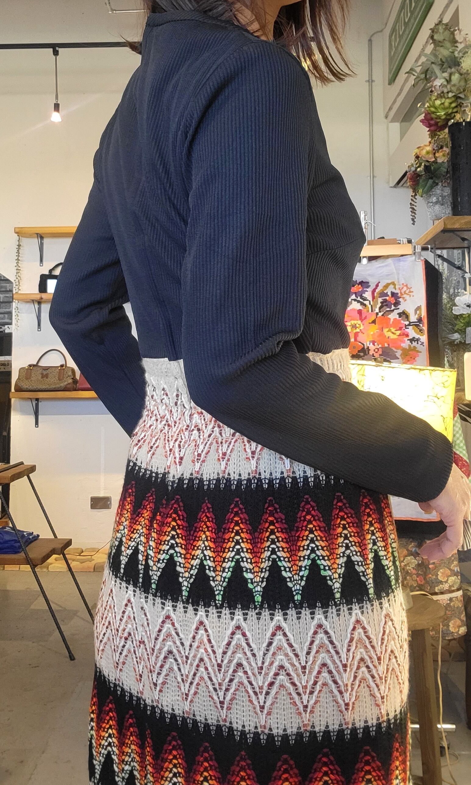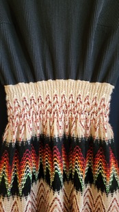 Made in Canada のヴィンテージマキシワンピース。素材はトップス部分がポリエステル100% スカート部分がアクリル90%/ ポリエステル10% です。若干の伸縮性があります。ウエストはシャーリングのゴム仕様。スカート後ろセンターに裾から45cmのスリット入り。裏地は付いていません。ほどよい開きのUネックでお顔周りすっきり。バックファスナー付きで着脱も簡単です。