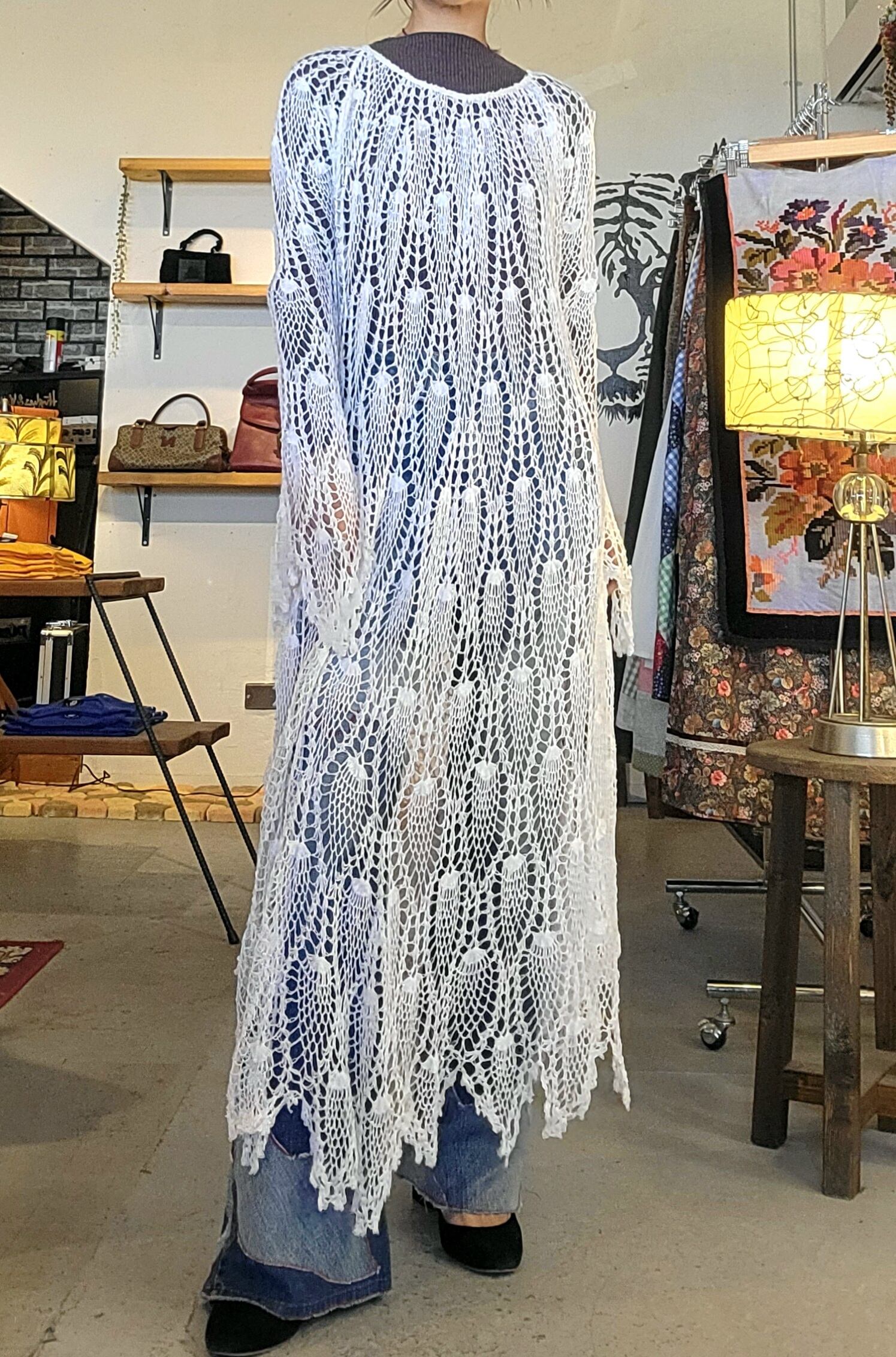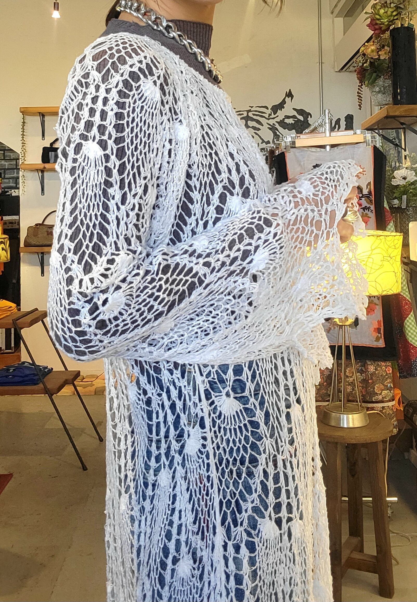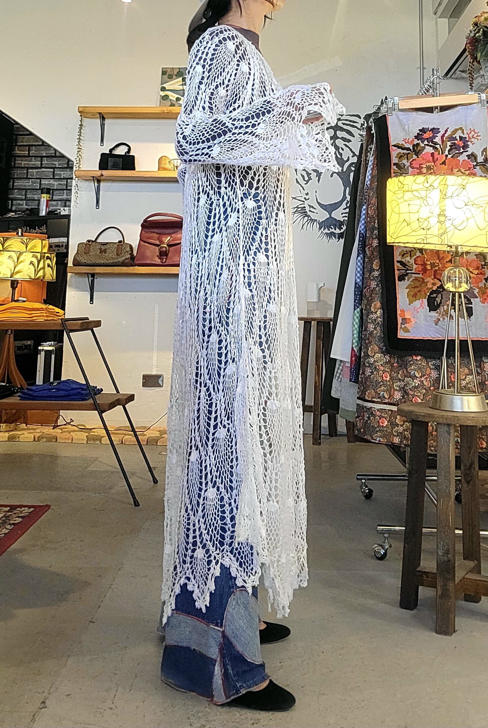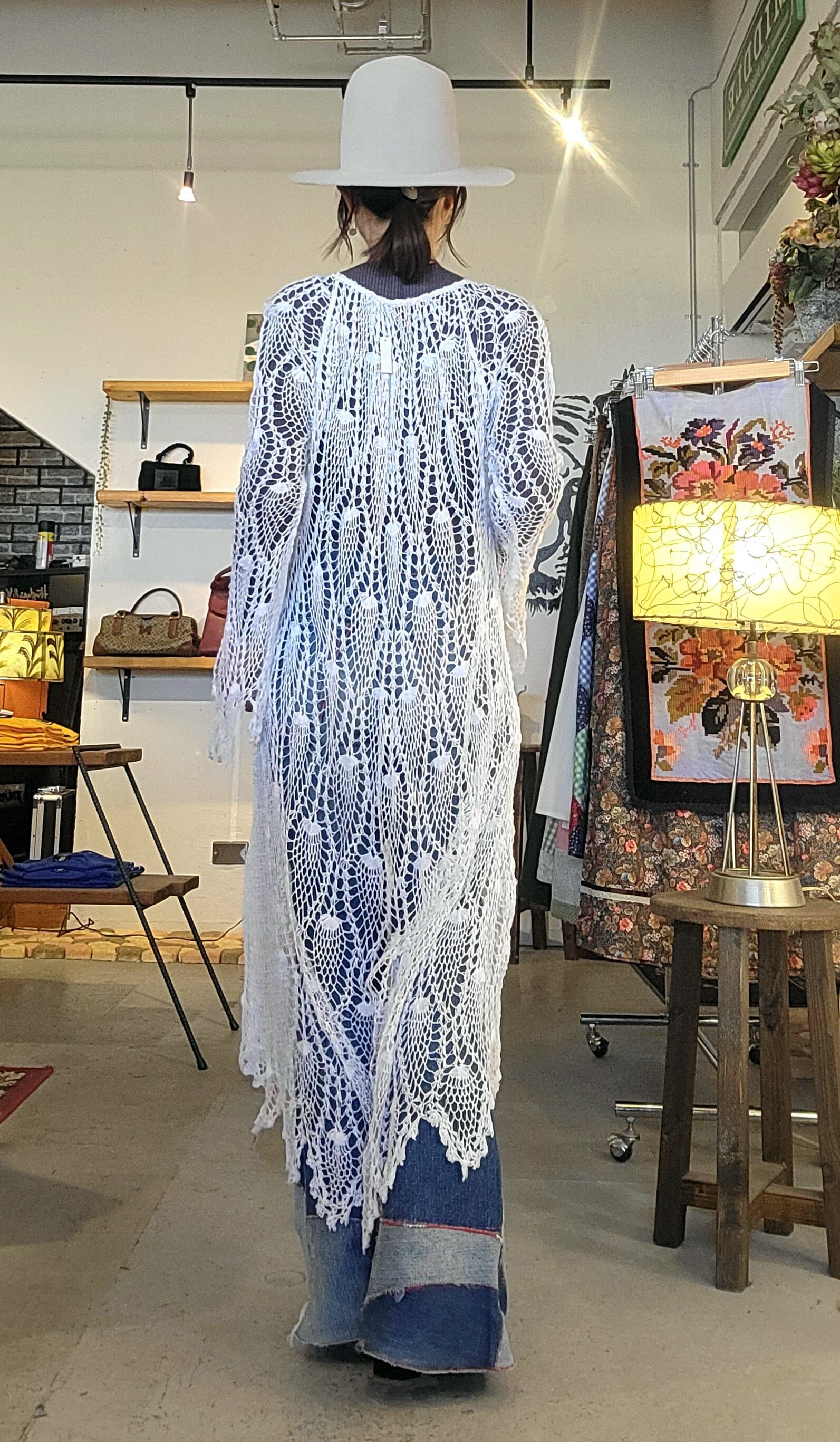 ヴィンテージのクロシェをたっぷり使用したリメイクワンピース。素材表記はありませんが柔らかいコットンガーゼのような優しい肌触りです。伸縮性がありサイズフリーです。インナーに合わせるアイテムによって色んな表情を楽しめます。長めの袖も雰囲気があってオススメです。