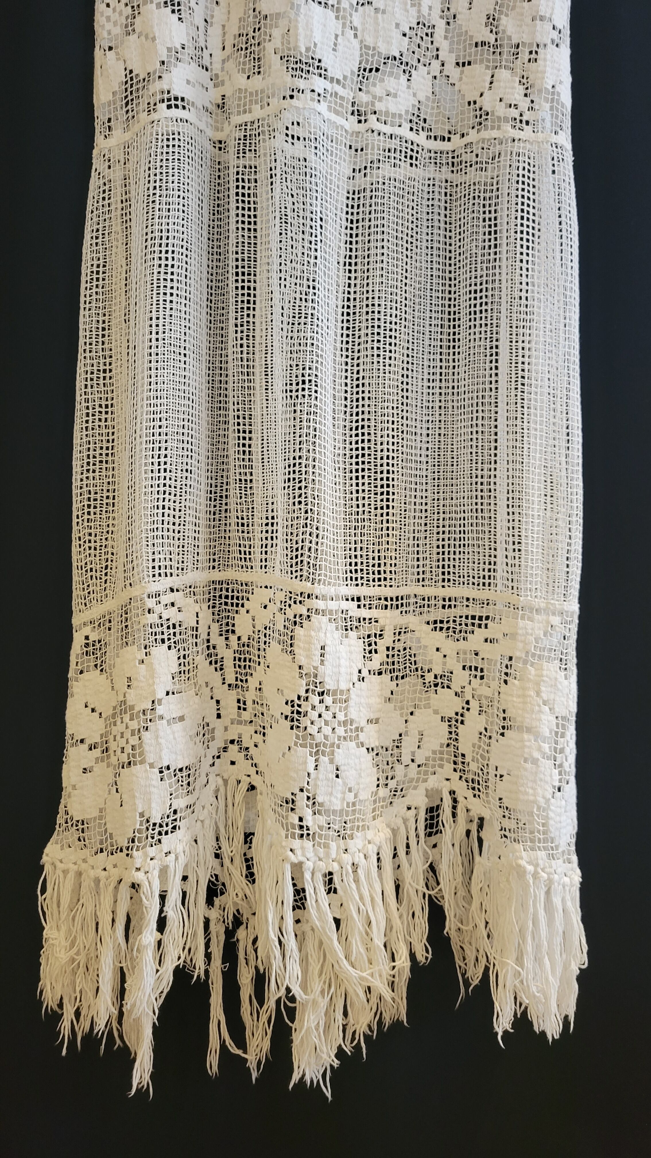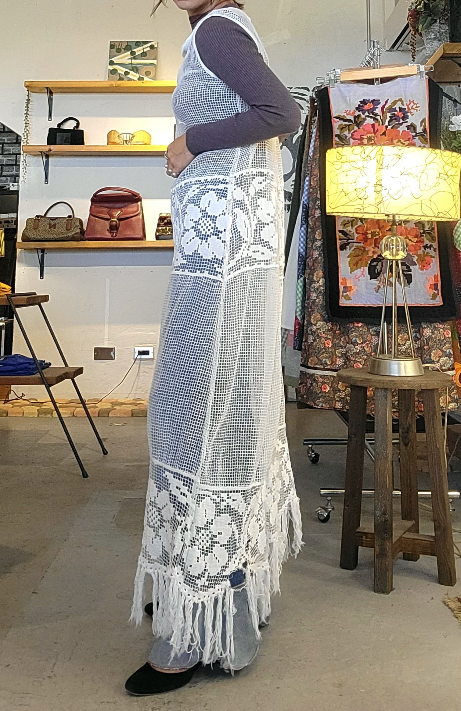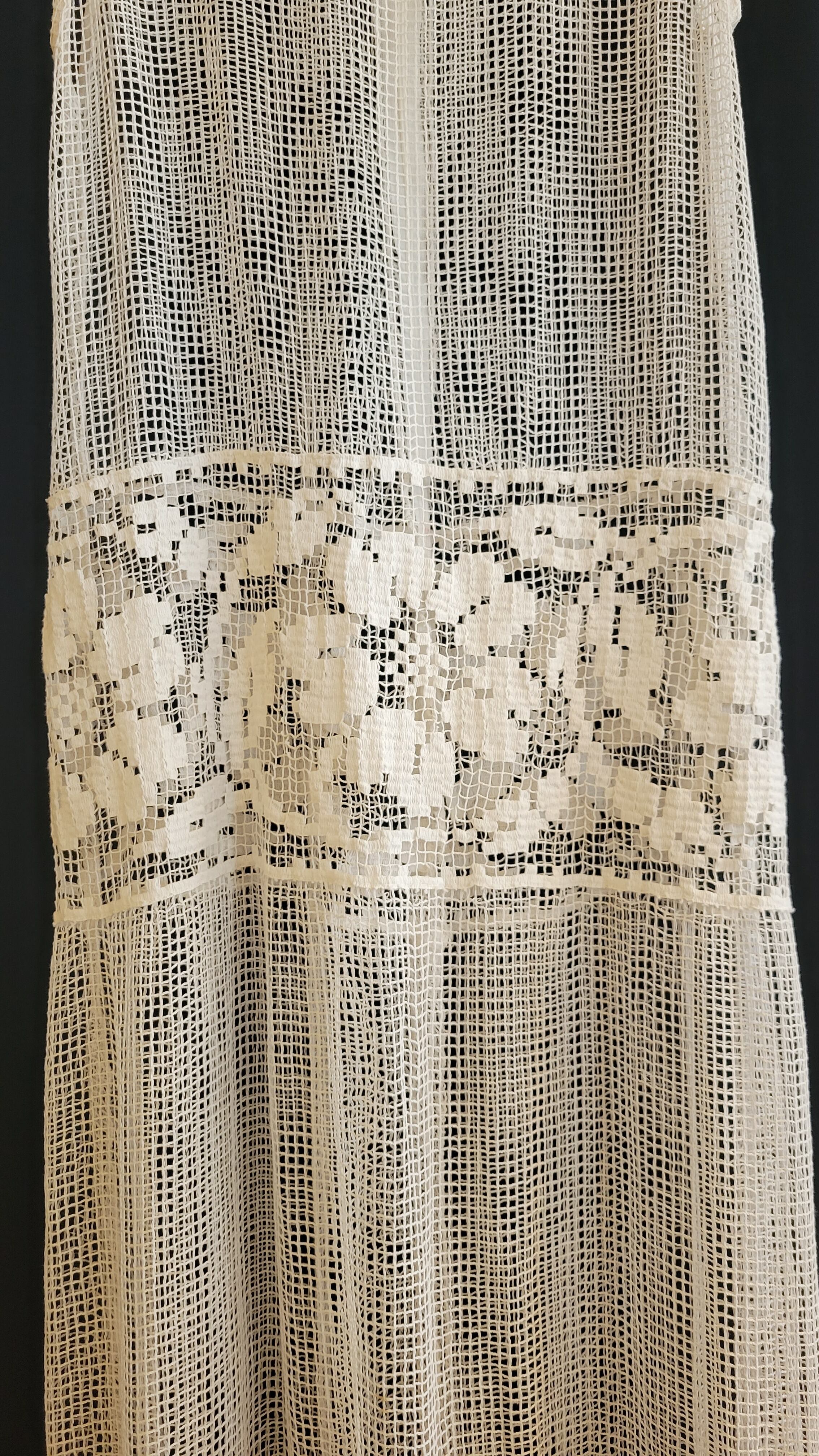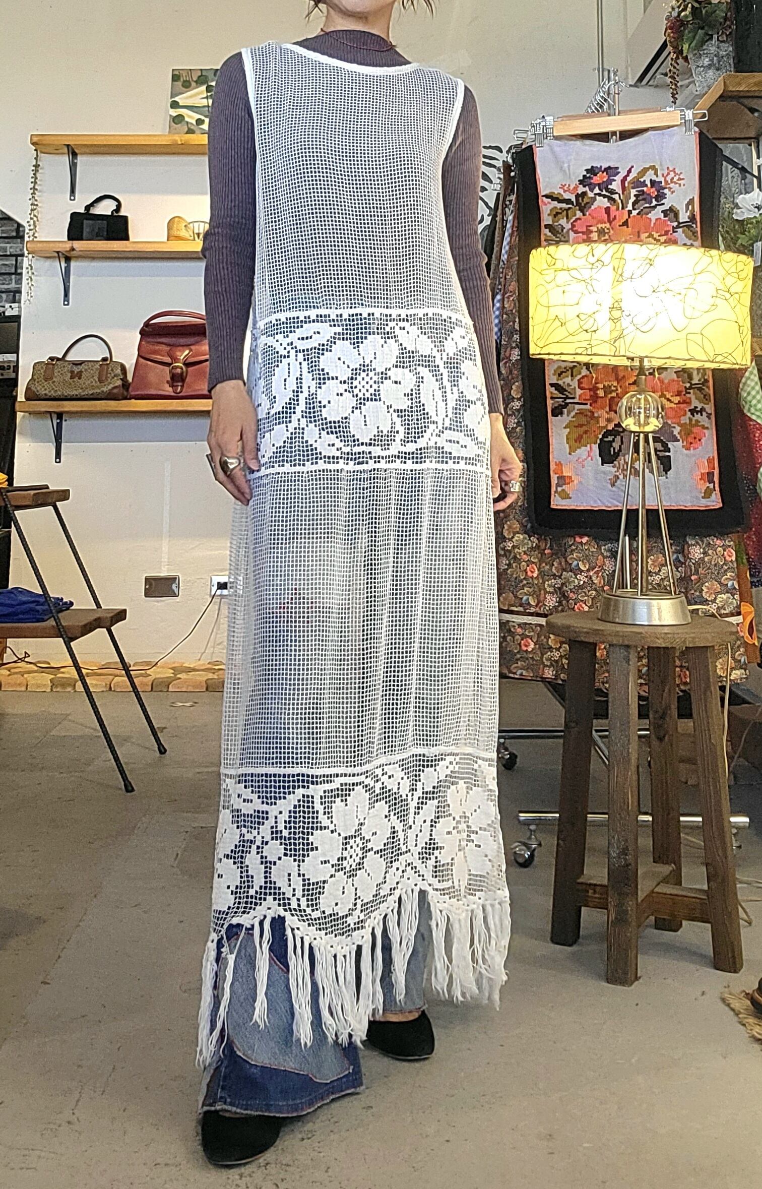 繊細なヴィンテージフィレレースを贅沢に使用したリメイクワンピース。素材表記はありませんがコットンのようです。バックファスナー付き。暗めカラーのインナーに合わせるとコントラストにより柄の美しさが際立ちます。レイヤードで通年で着用いただけます。