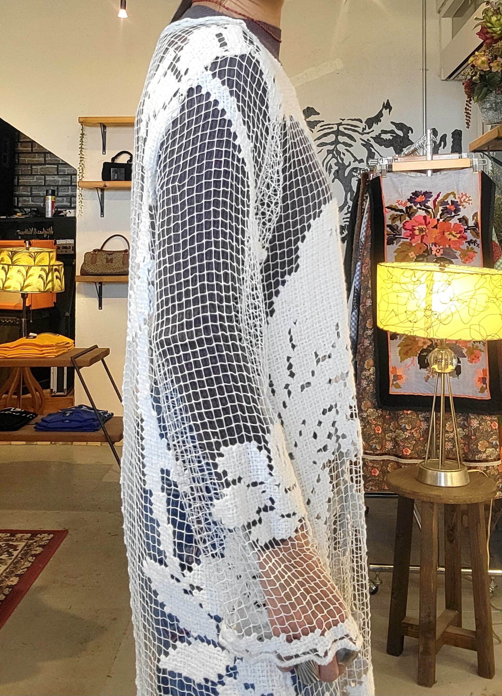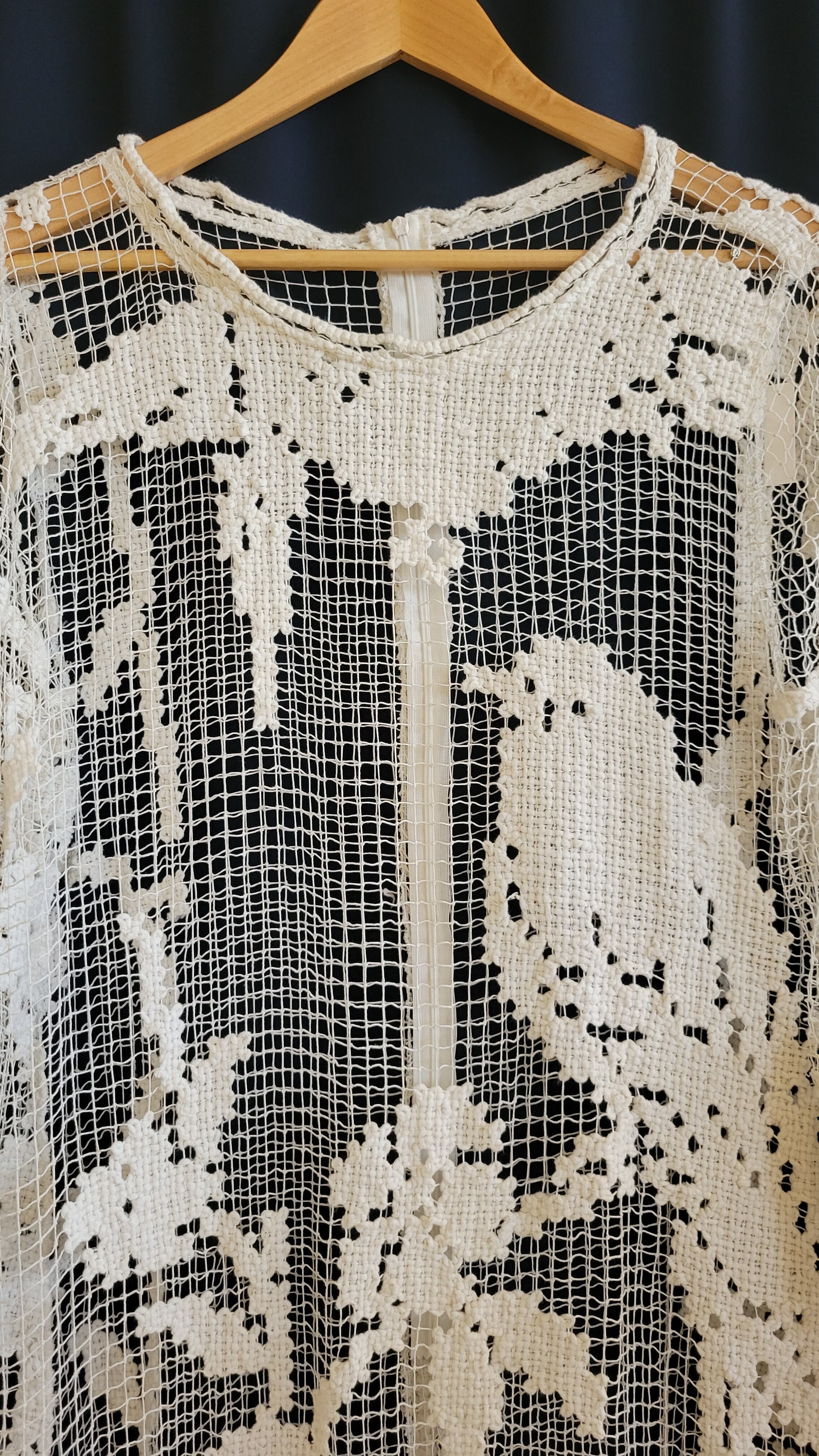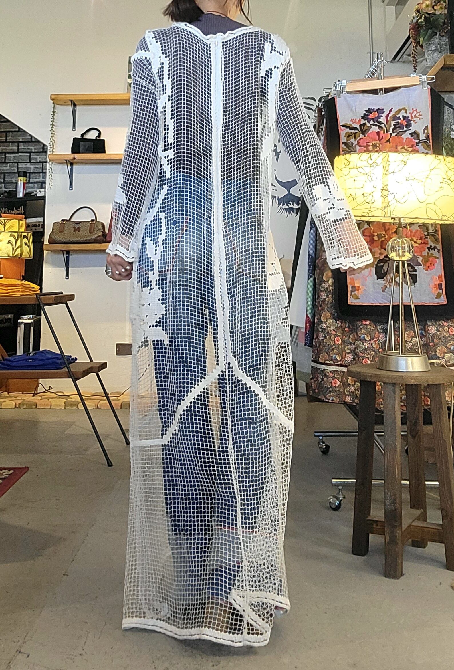 繊細なヴィンテージフィレレースを贅沢に使用したリメイクワンピース。素材表記はありませんがコットンのようです。バックファスナー付き。インナーに合わせるカラーとのコントラストにより柄の美しさが際立ちます。レイヤードで通年で着用いただけます。*右後ろヒップ辺りに1ヶ所レースの切れてしまっている部分があります。画像でご確認ください。