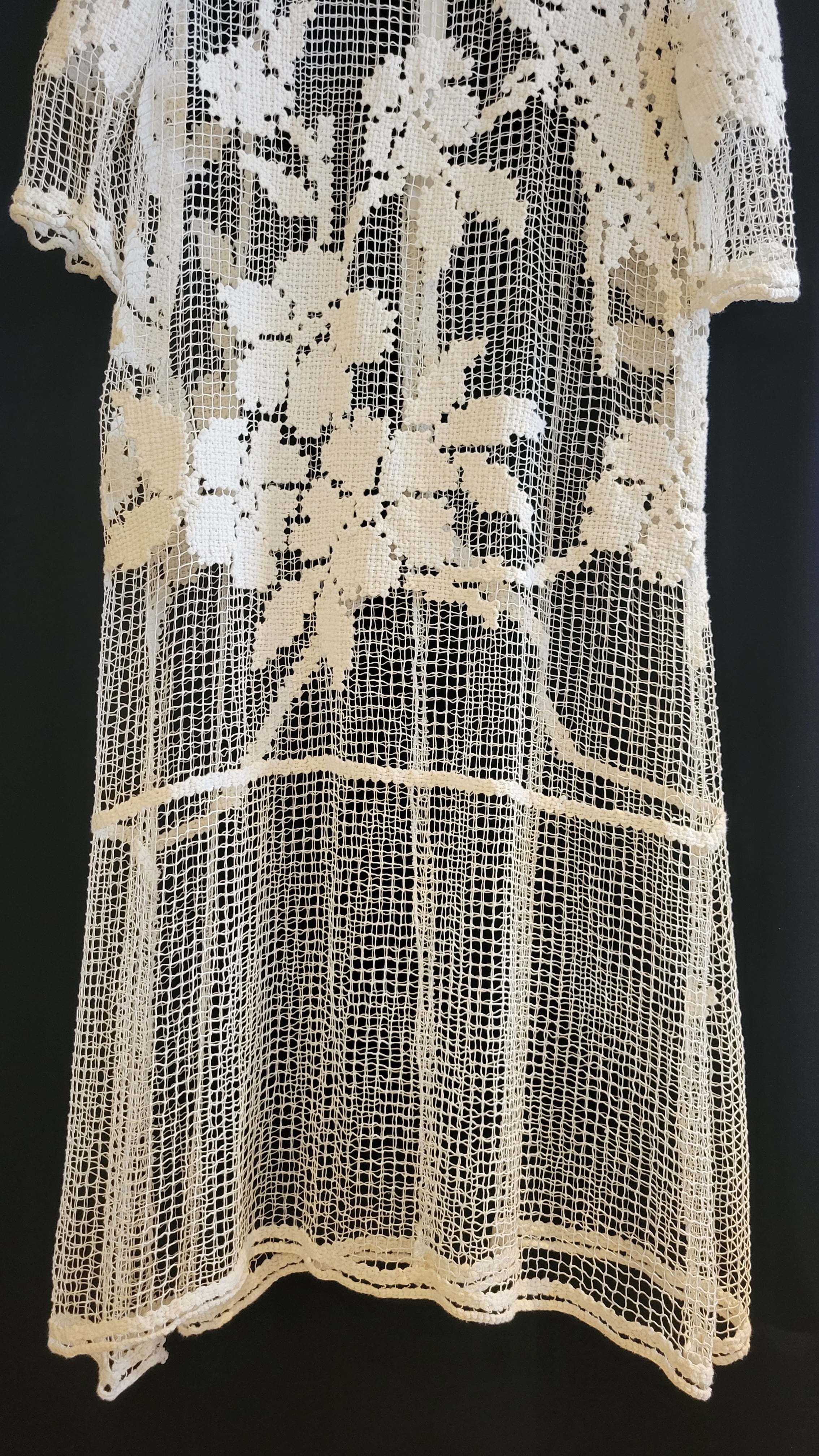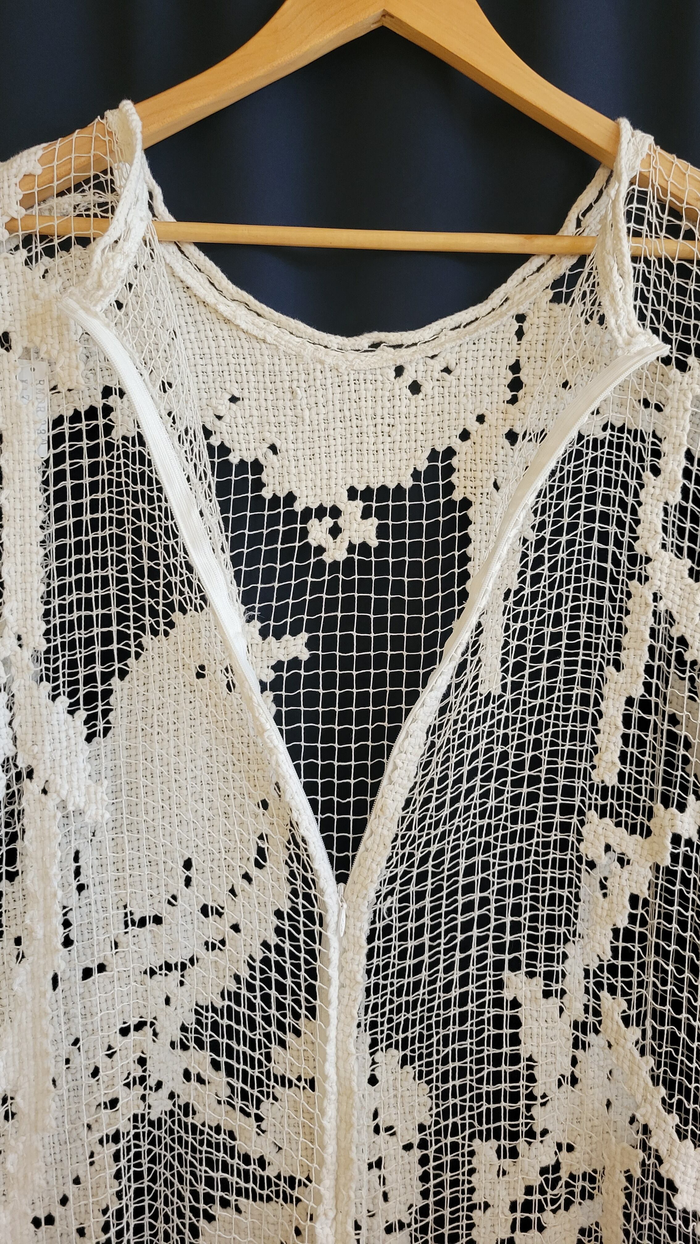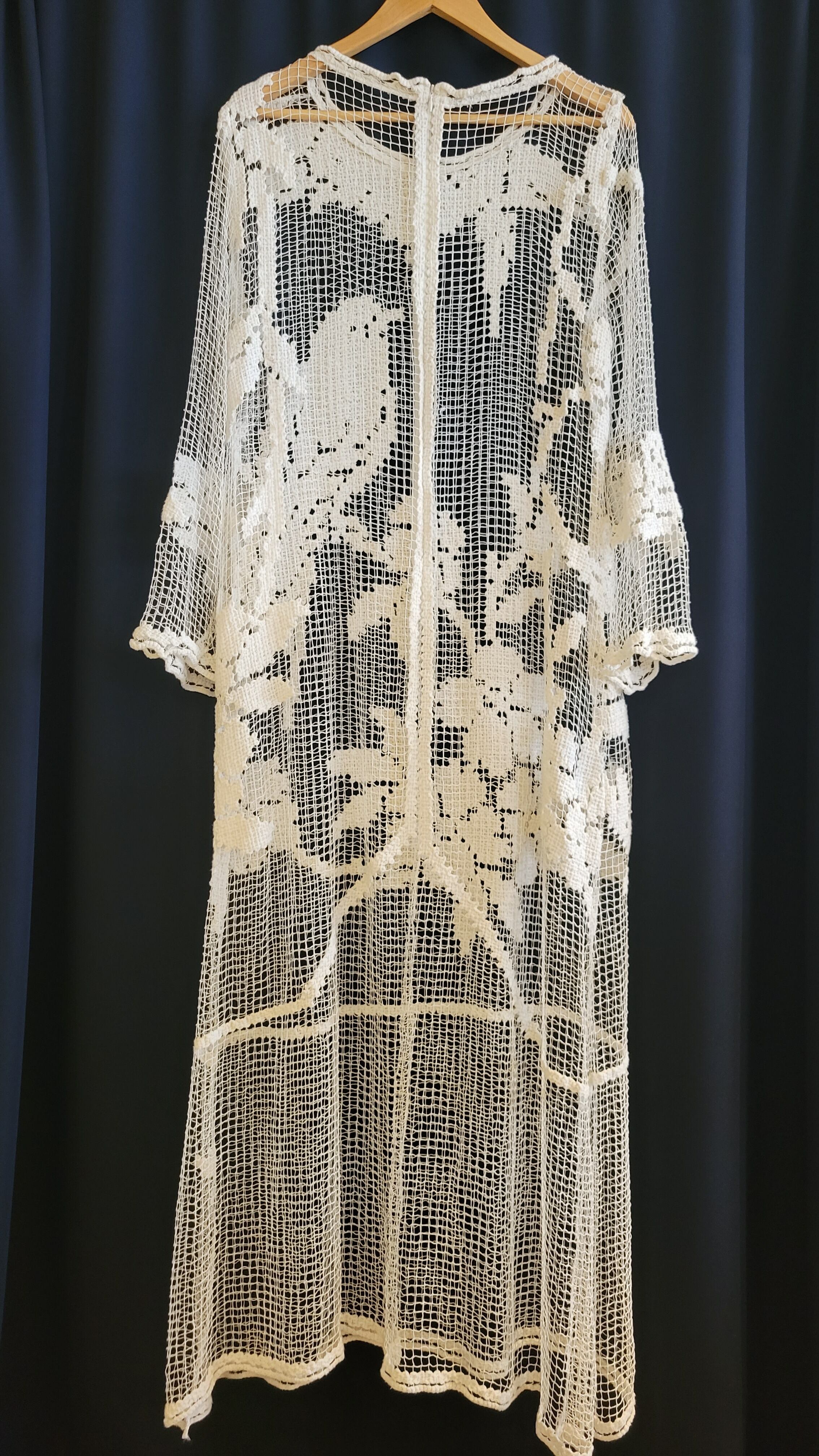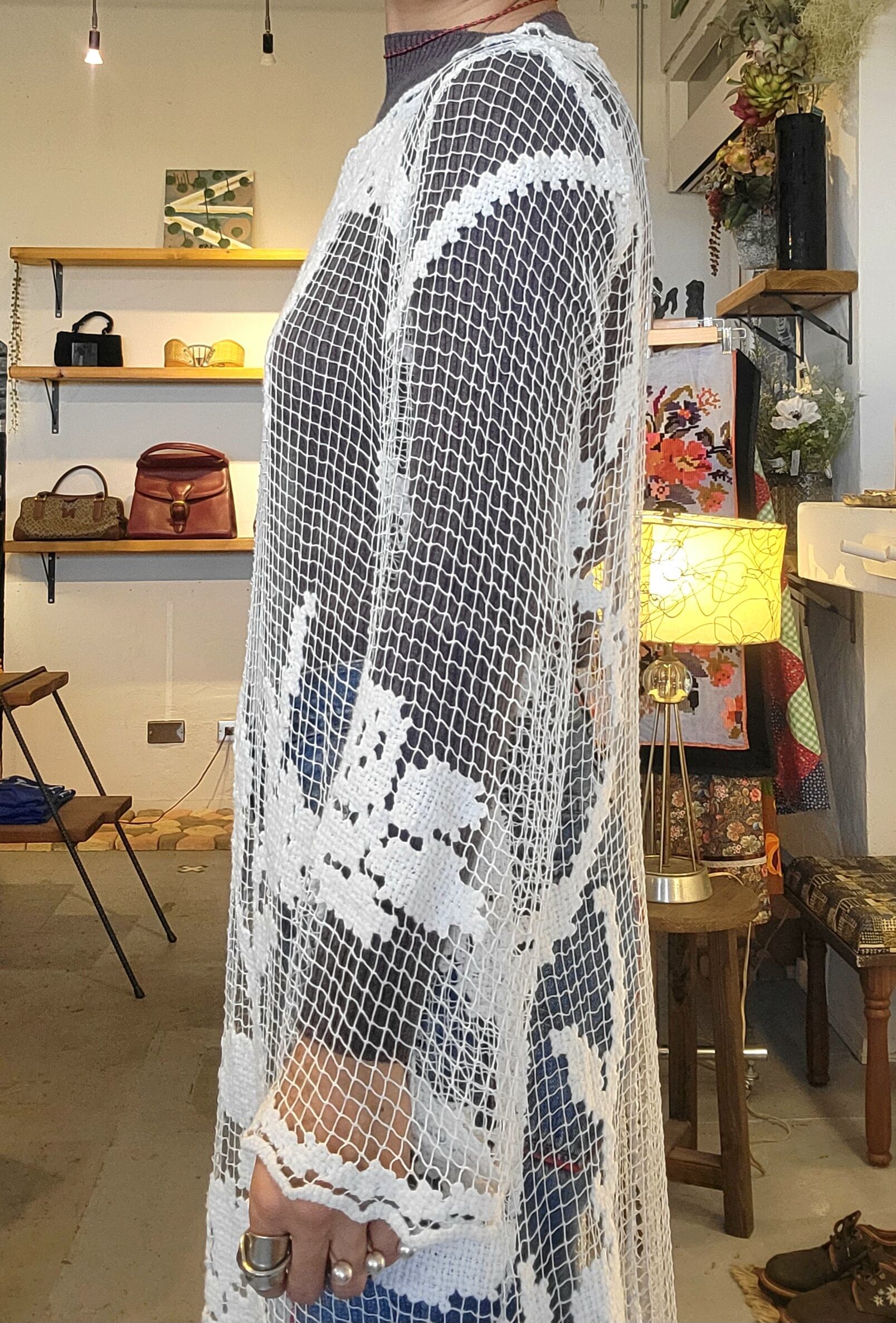 繊細なヴィンテージフィレレースを贅沢に使用したリメイクワンピース。素材表記はありませんがコットンのようです。バックファスナー付き。インナーに合わせるカラーとのコントラストにより柄の美しさが際立ちます。レイヤードで通年で着用いただけます。*右後ろヒップ辺りに1ヶ所レースの切れてしまっている部分があります。画像でご確認ください。