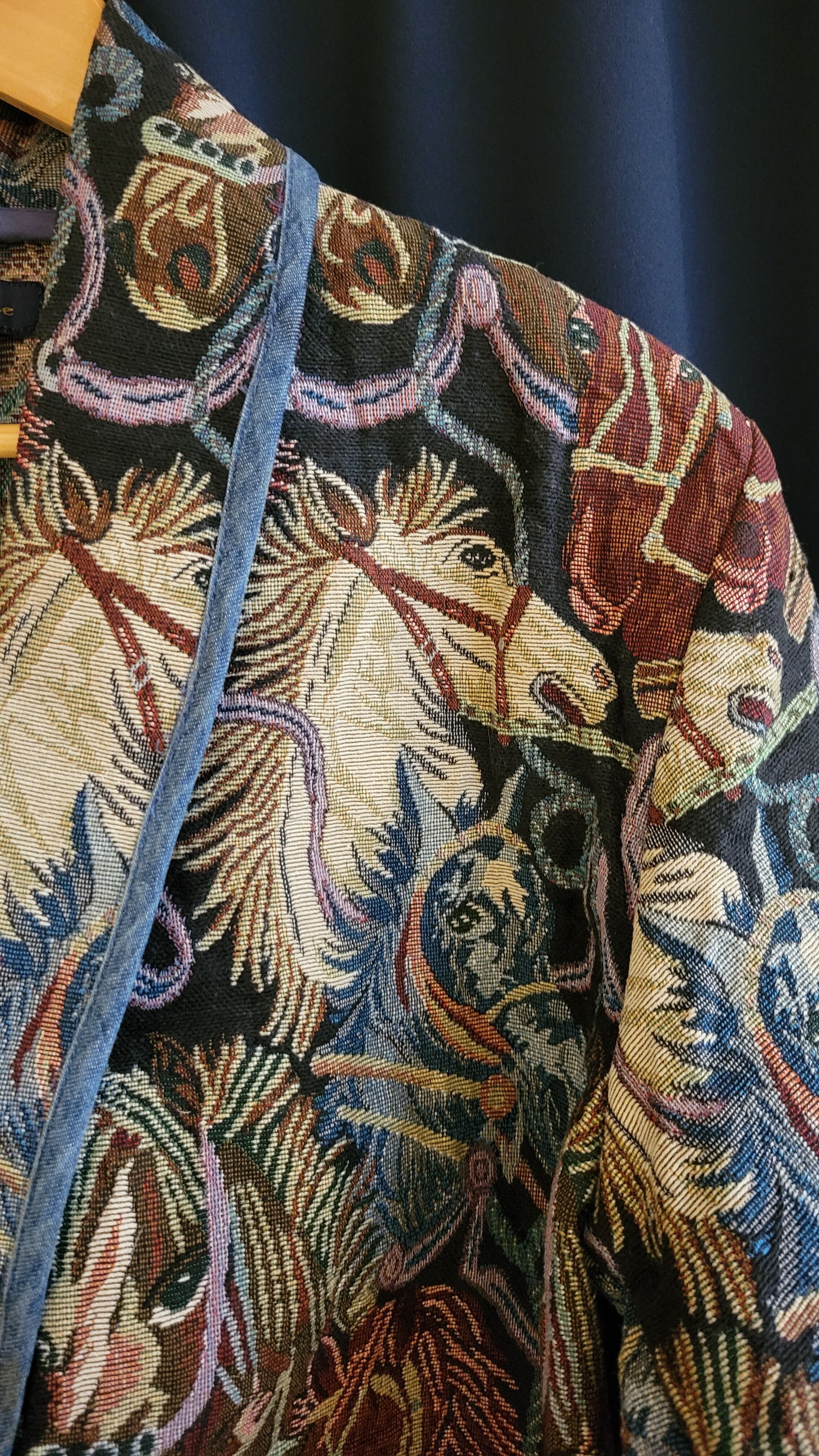 馬柄のヴィンテージジャケット。素材はコットンの織地で張り感があります。デニムパイピングがほどよいカジュアル感。パンツにもスカートにも合わせやすい丈感です。