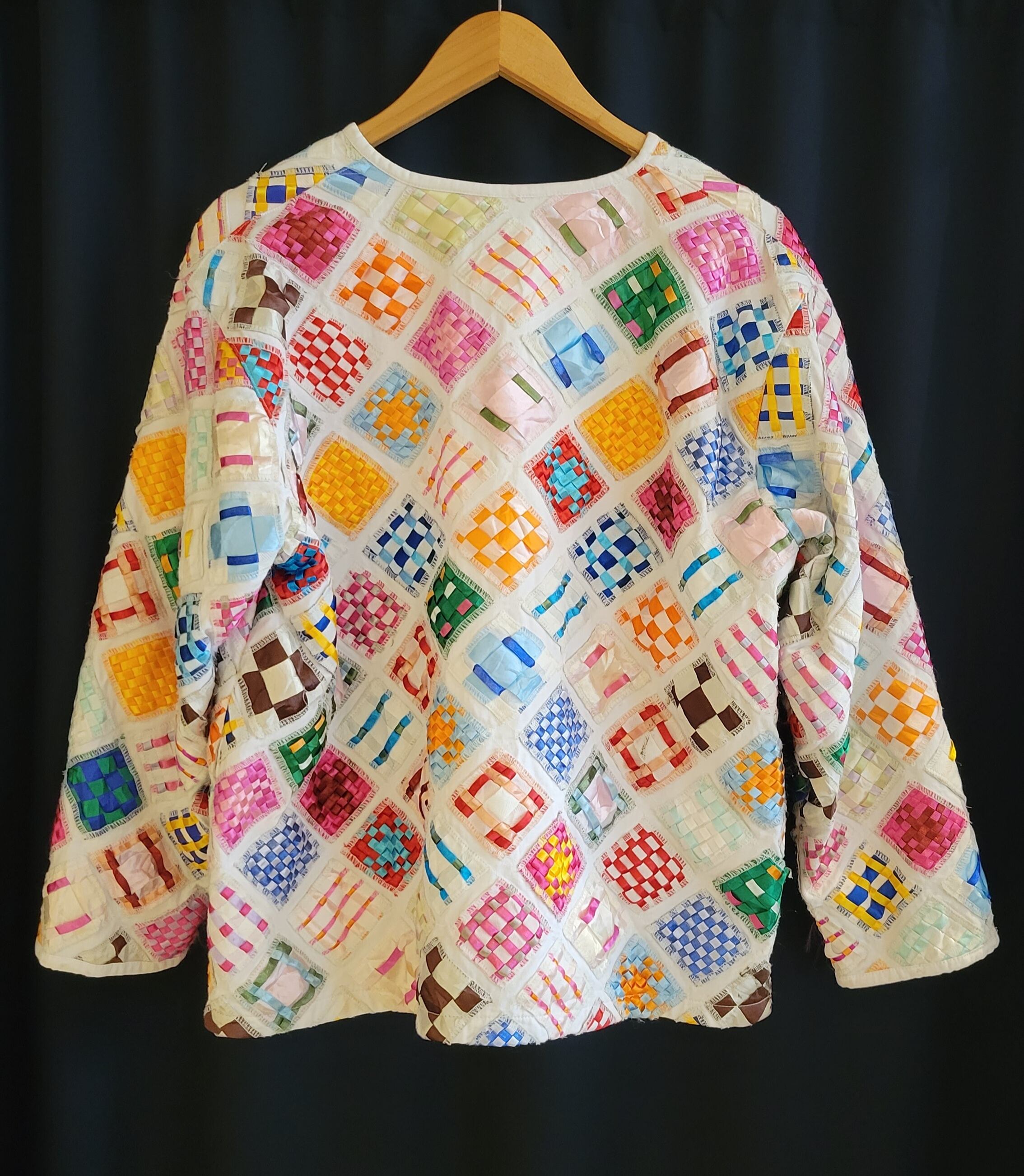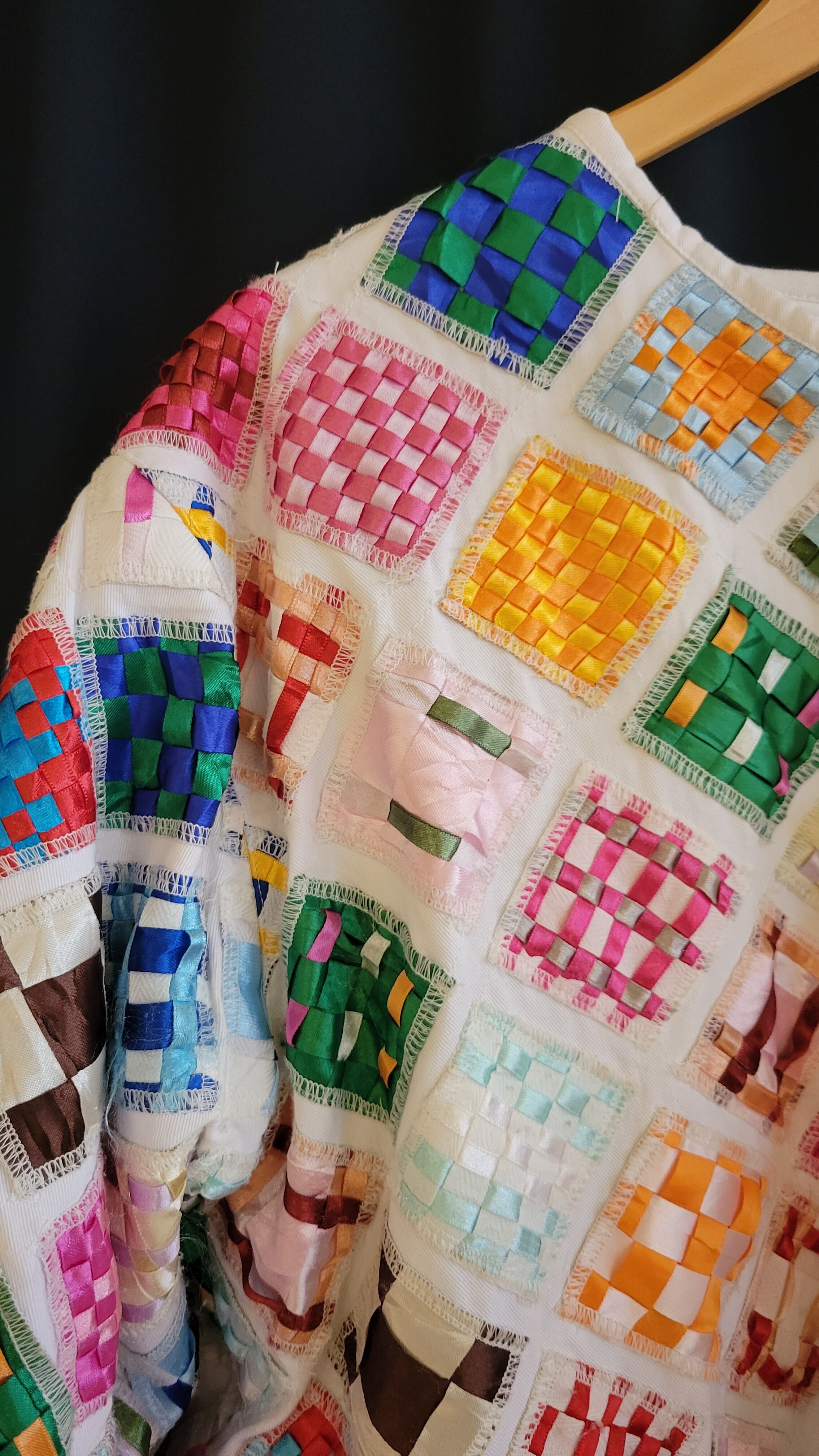サテンリボンを編んだ布片をコットンジャケットに縫い付けた、めずらしいヴィンテージジャケットです。