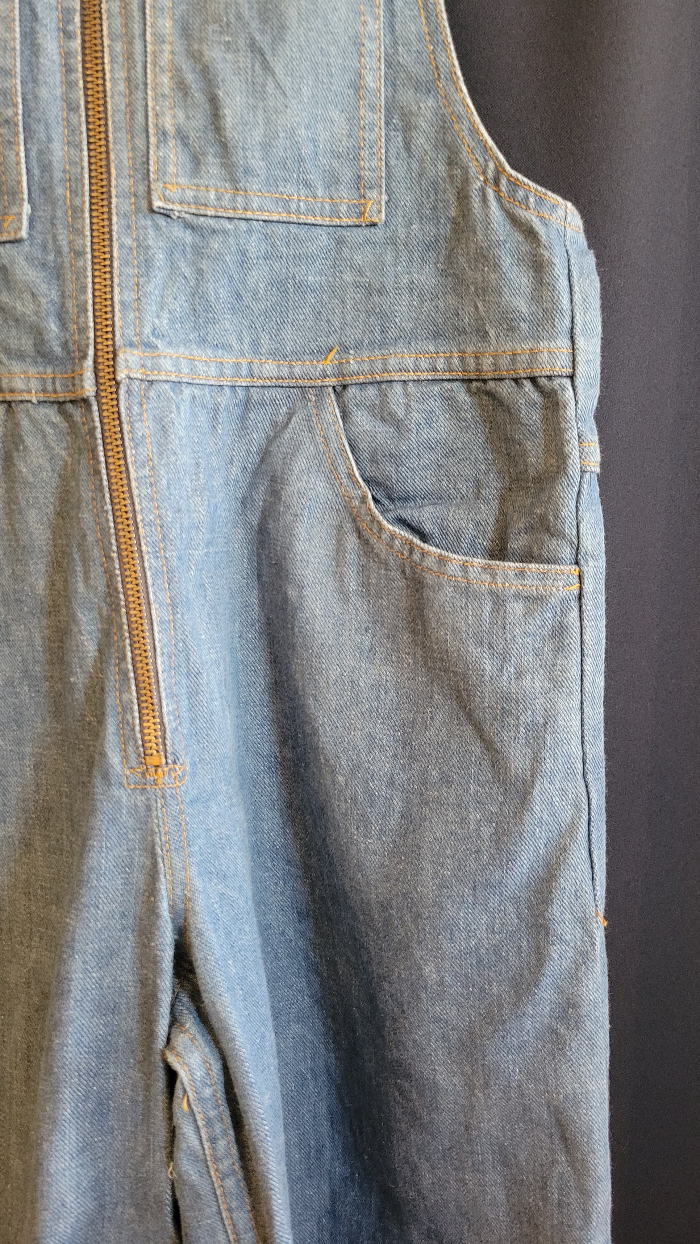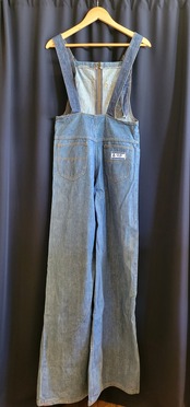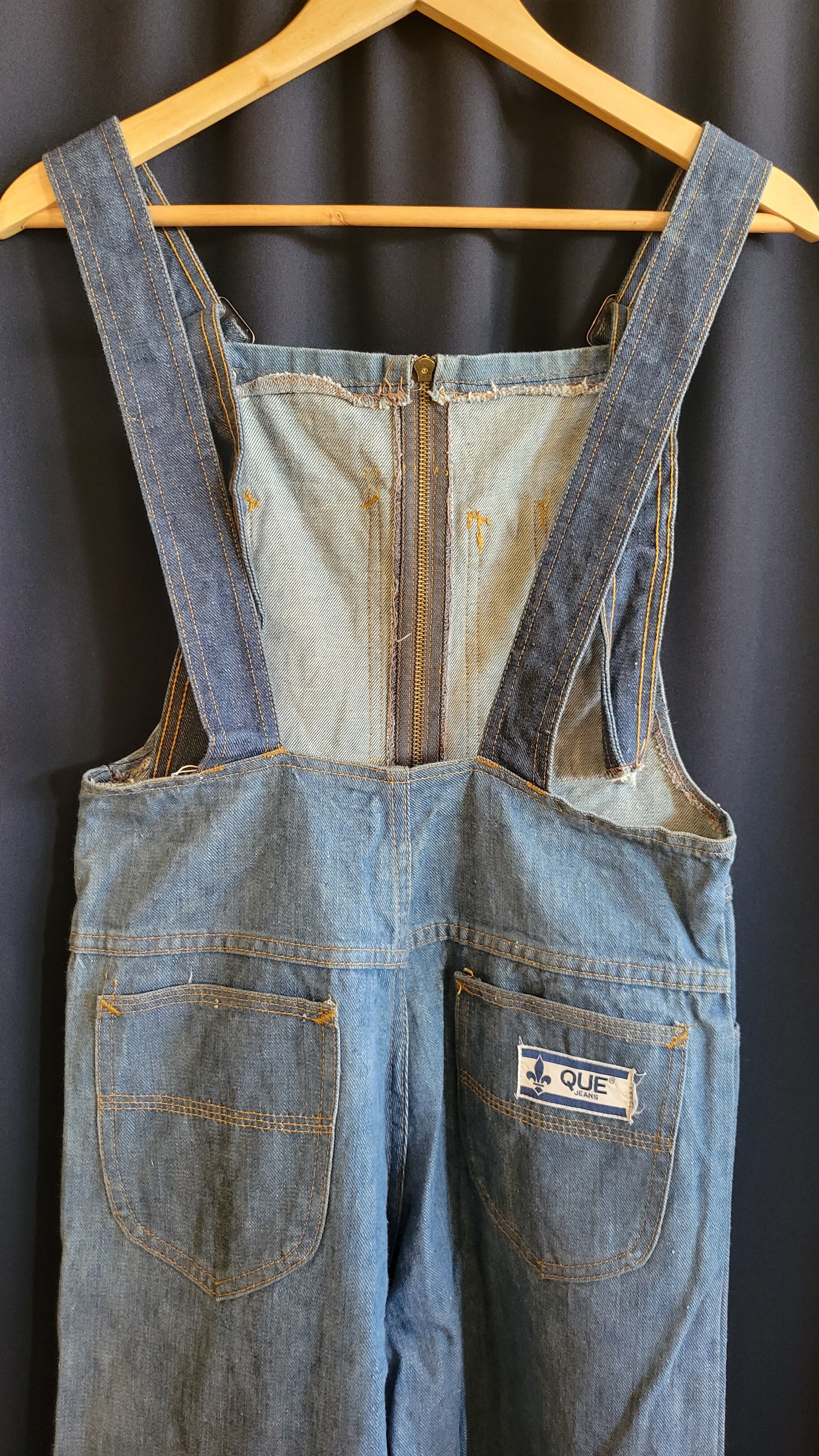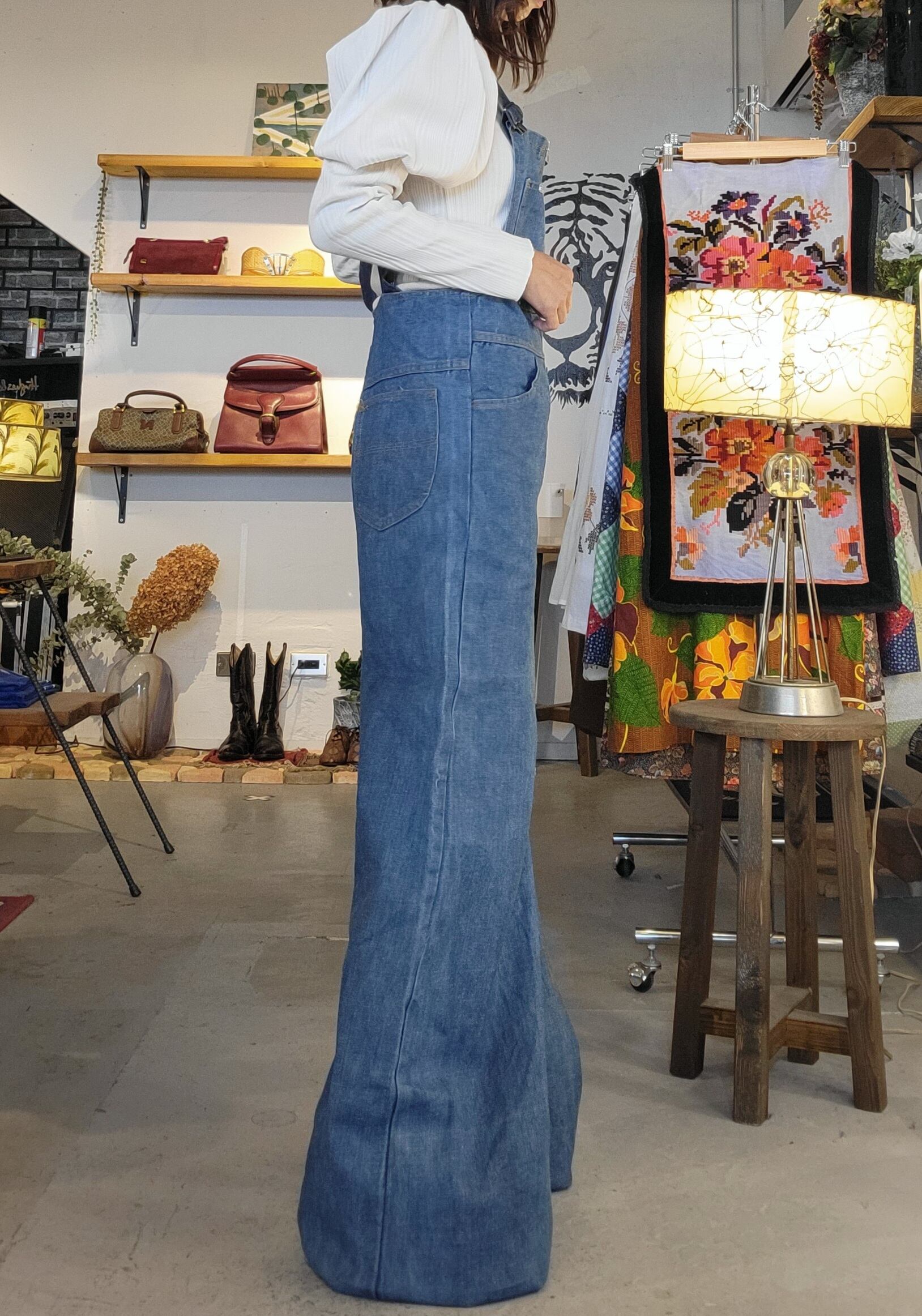 ヴィンテージのデニムサロペット。フロントジップで着脱が楽です。丈はかなり長めですがご自分に合う長さに丈詰めしてもきれいなワイドシルエットは損なわれないデザインです。バックはすっきりオープンタイプ。カジュアルなTシャツにはもちろん、フェミニンなレースやシアー素材のブラウス等にもよく合います。