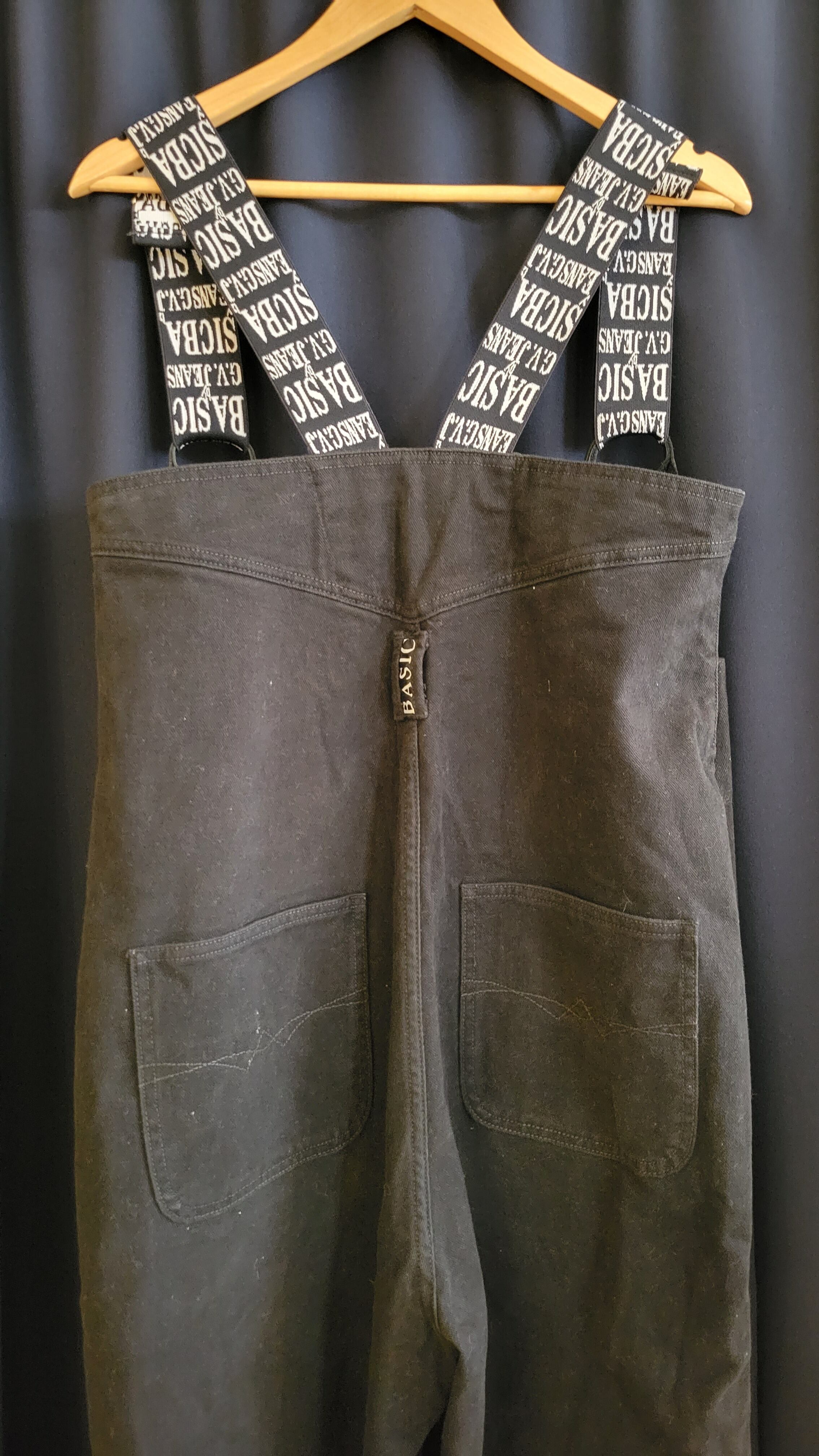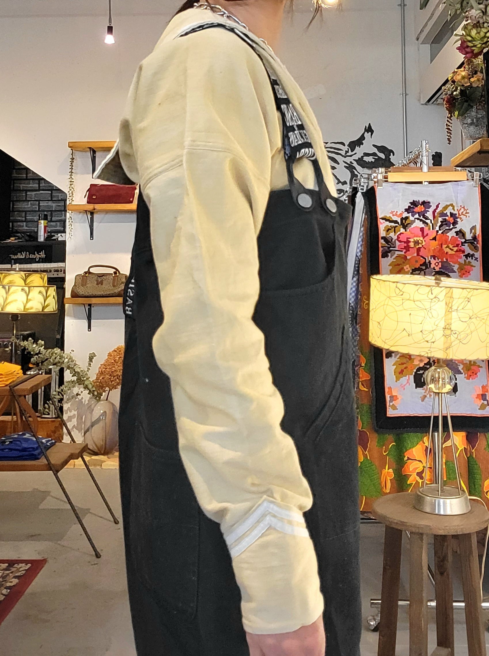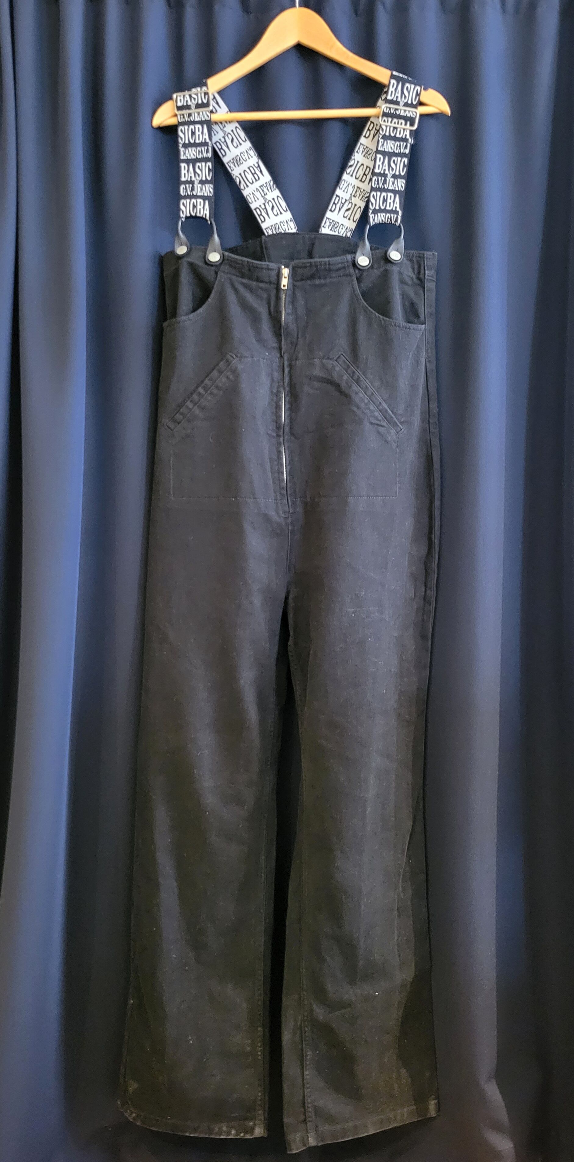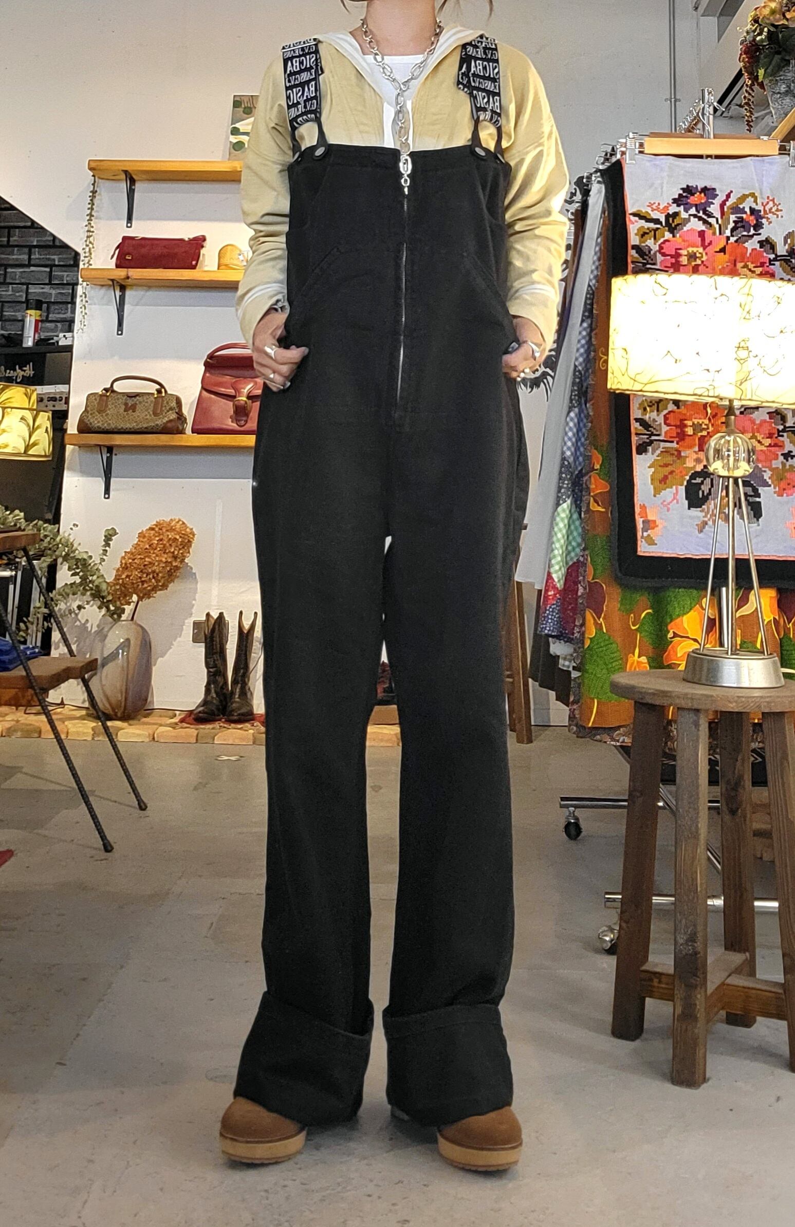 ブラックデニムのUSEDサロペット。フロントジップです。全体的にゆったりしたサイジングで男性にもおすすめです。着画では肩のストラップで吊るような感じで着ています。ストラップは長さの調整ができるため幅広いサイズに対応可。ワイド&ストレートなシルエット。レングス長めですが裾上げしてもシルエットは損なわれないデザインですのでご自分に合う長さにカット、またはロールアップもおすすめです。
