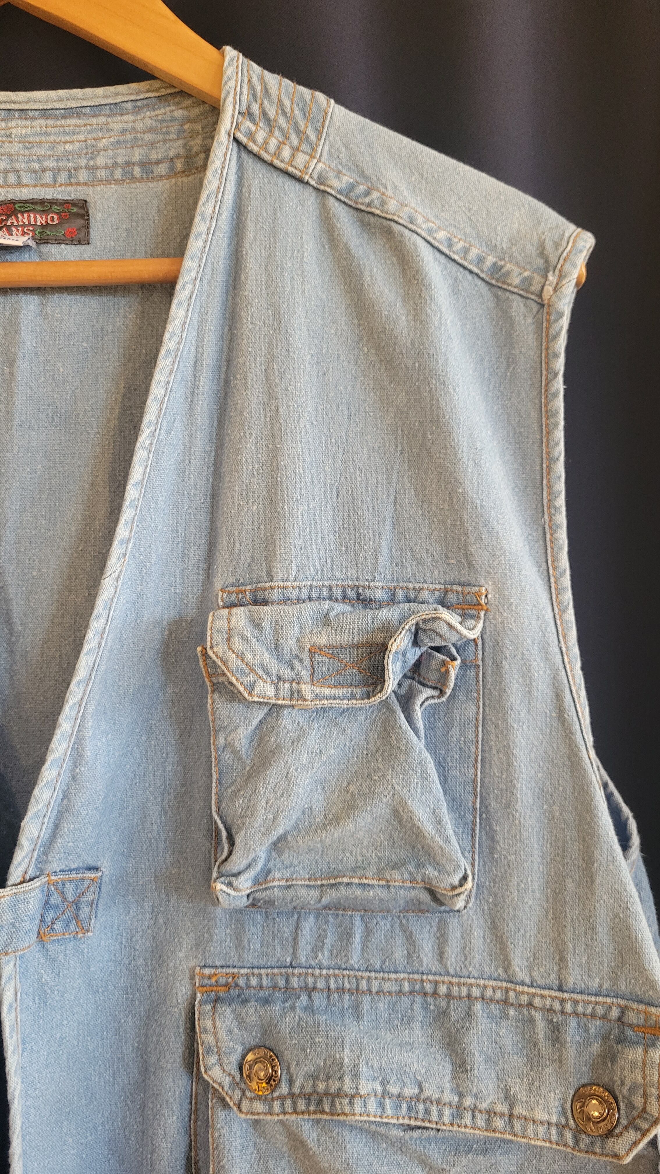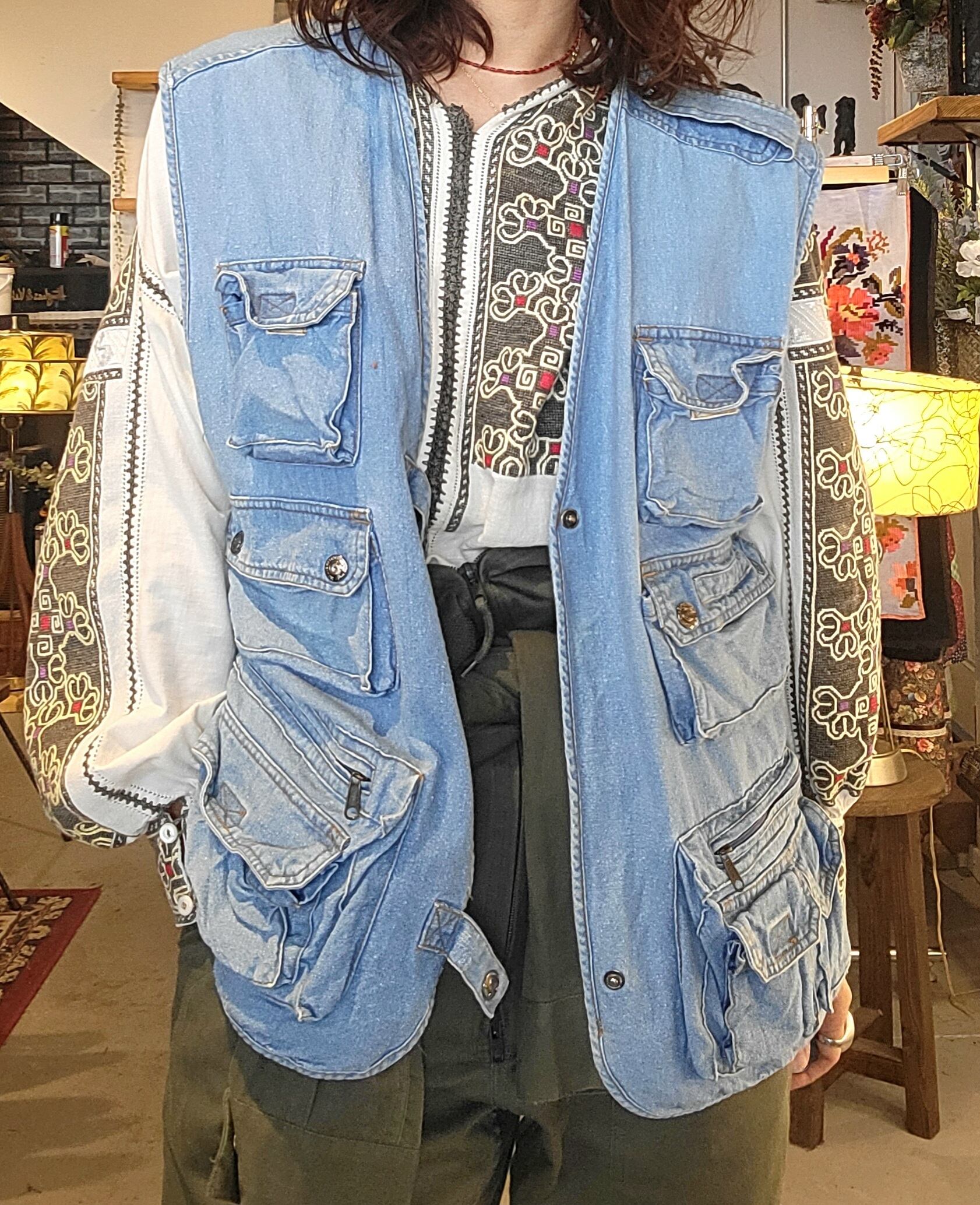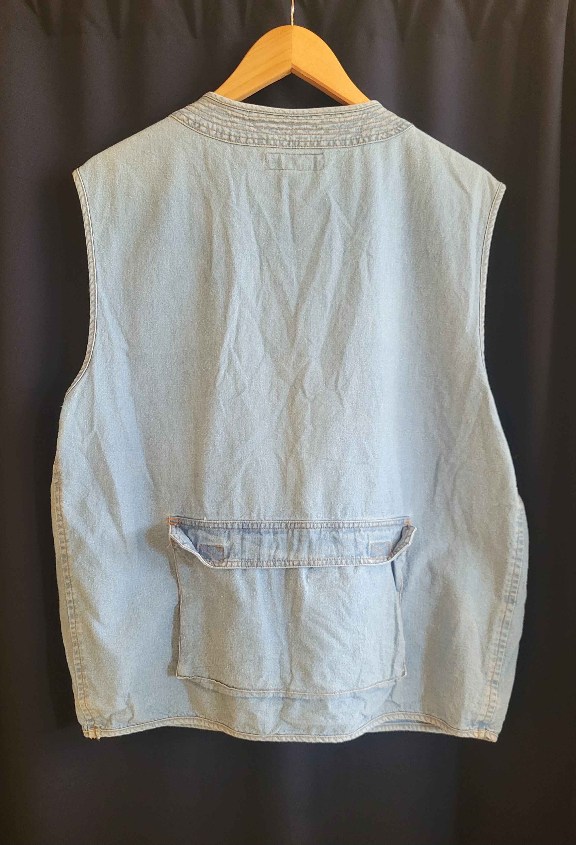 Used のデニムワークベスト。薄手で軽量なデニムです。フロントはジッパーは付いておらずスナップボタンが2個付いています。バックポケットを含む大小たくさんのポケット付きで身の回りのものはだいたい収納できそうです。手ぶらでお出かけできそうな1着。