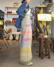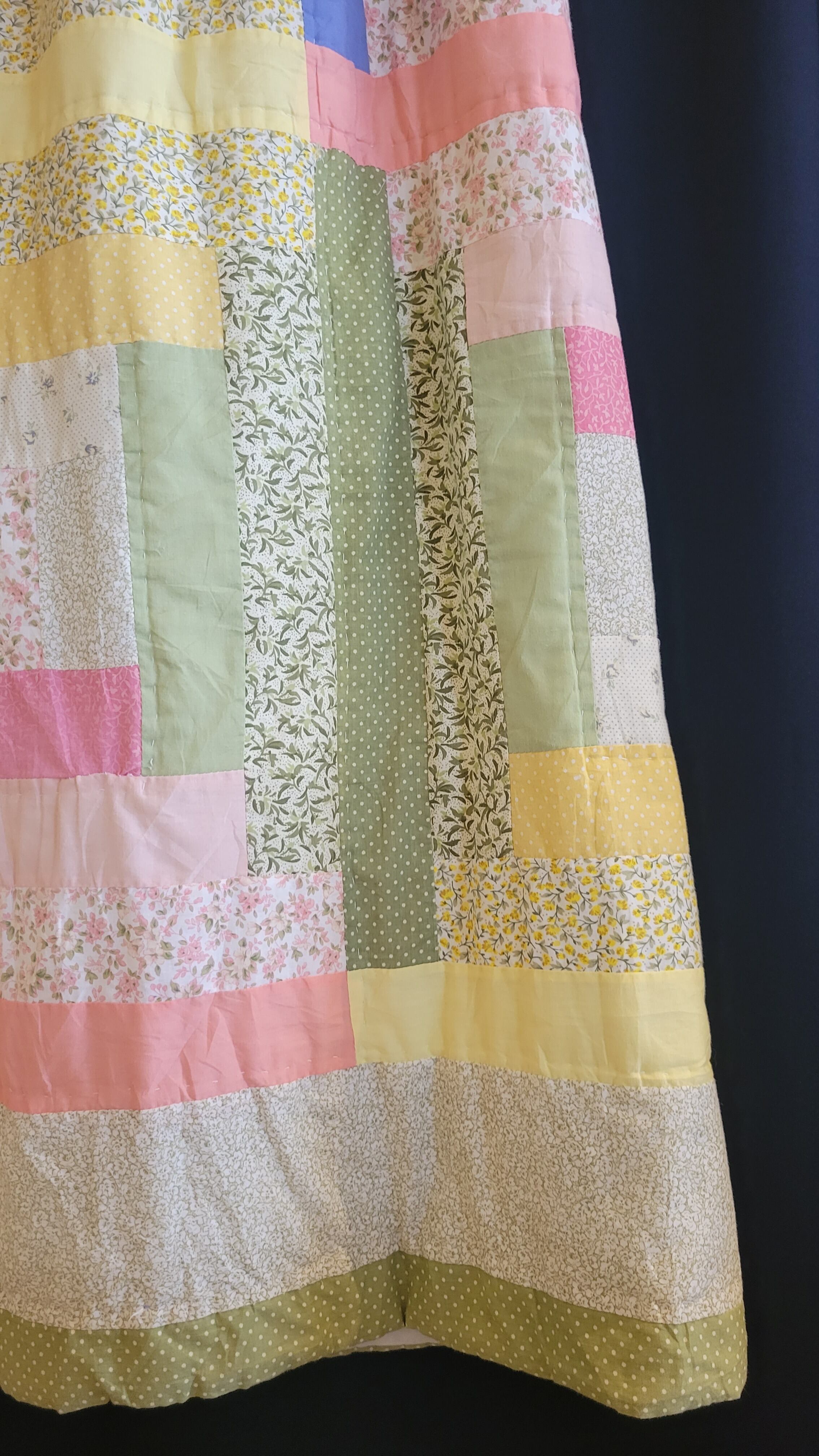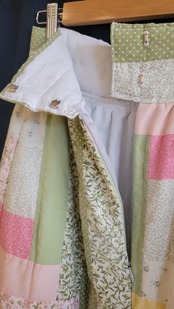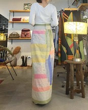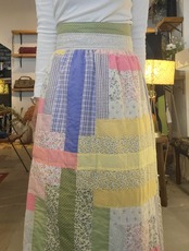 パッチワークキルトを使用したリメイクスカート。素材は中綿入りのコットンです。ウエスト位置はややハイウエストで太めのウエストヨークがポイントです。バックにホックとジッパー付き。軽くて暖かい優しい印象の1枚です。
