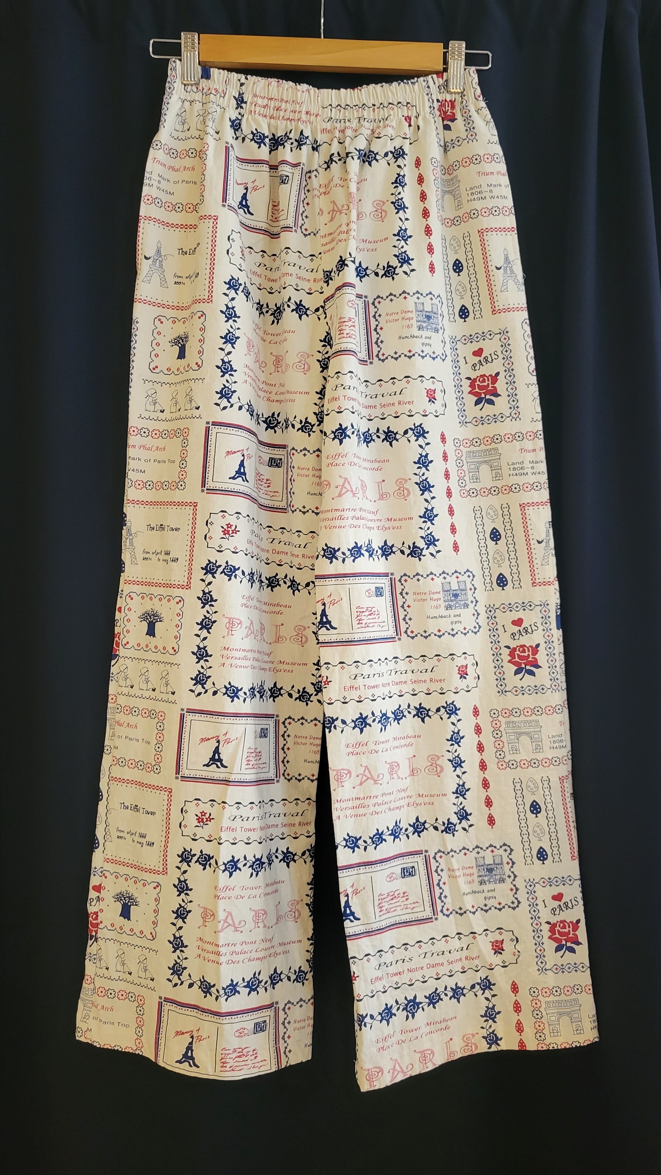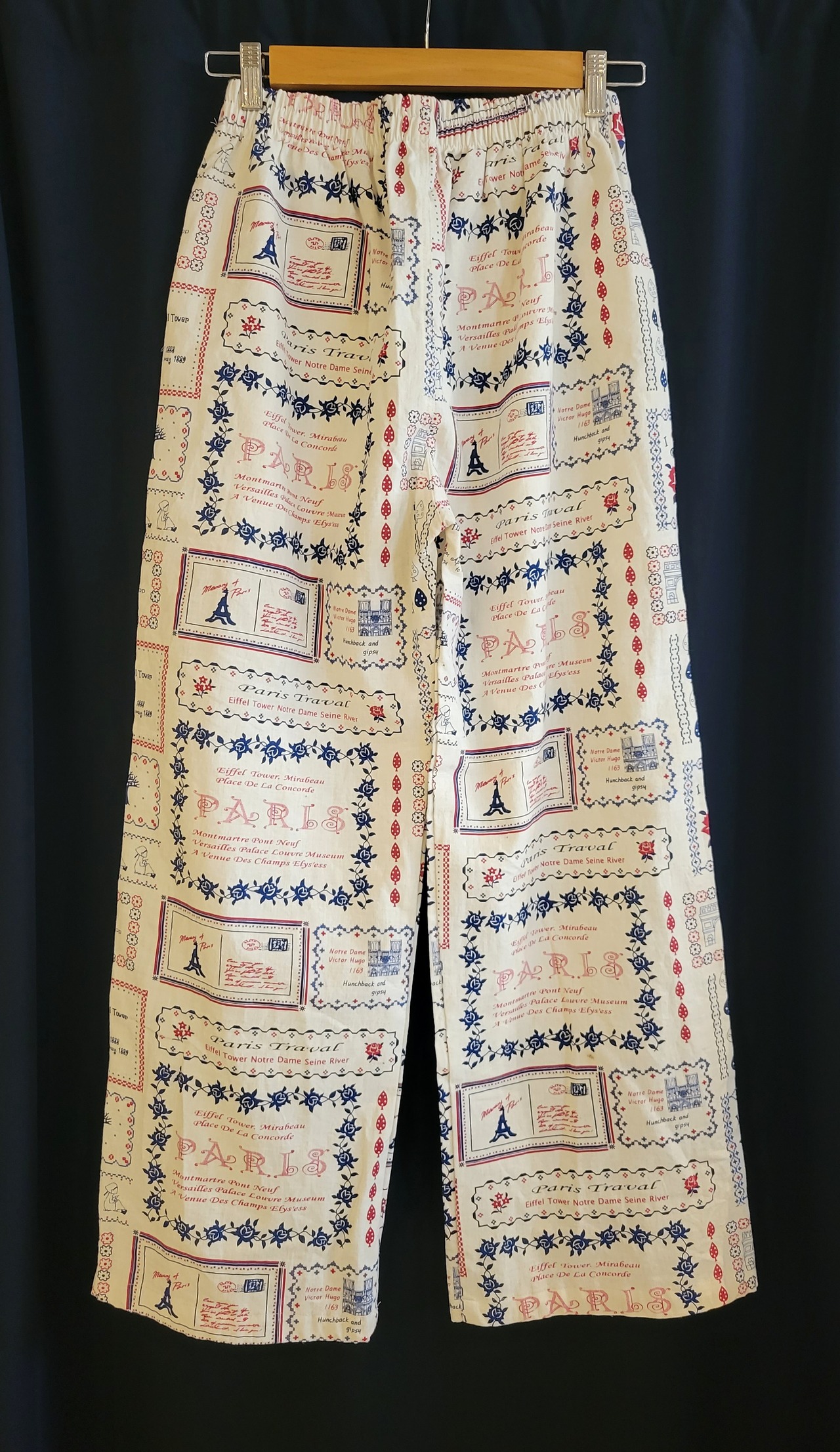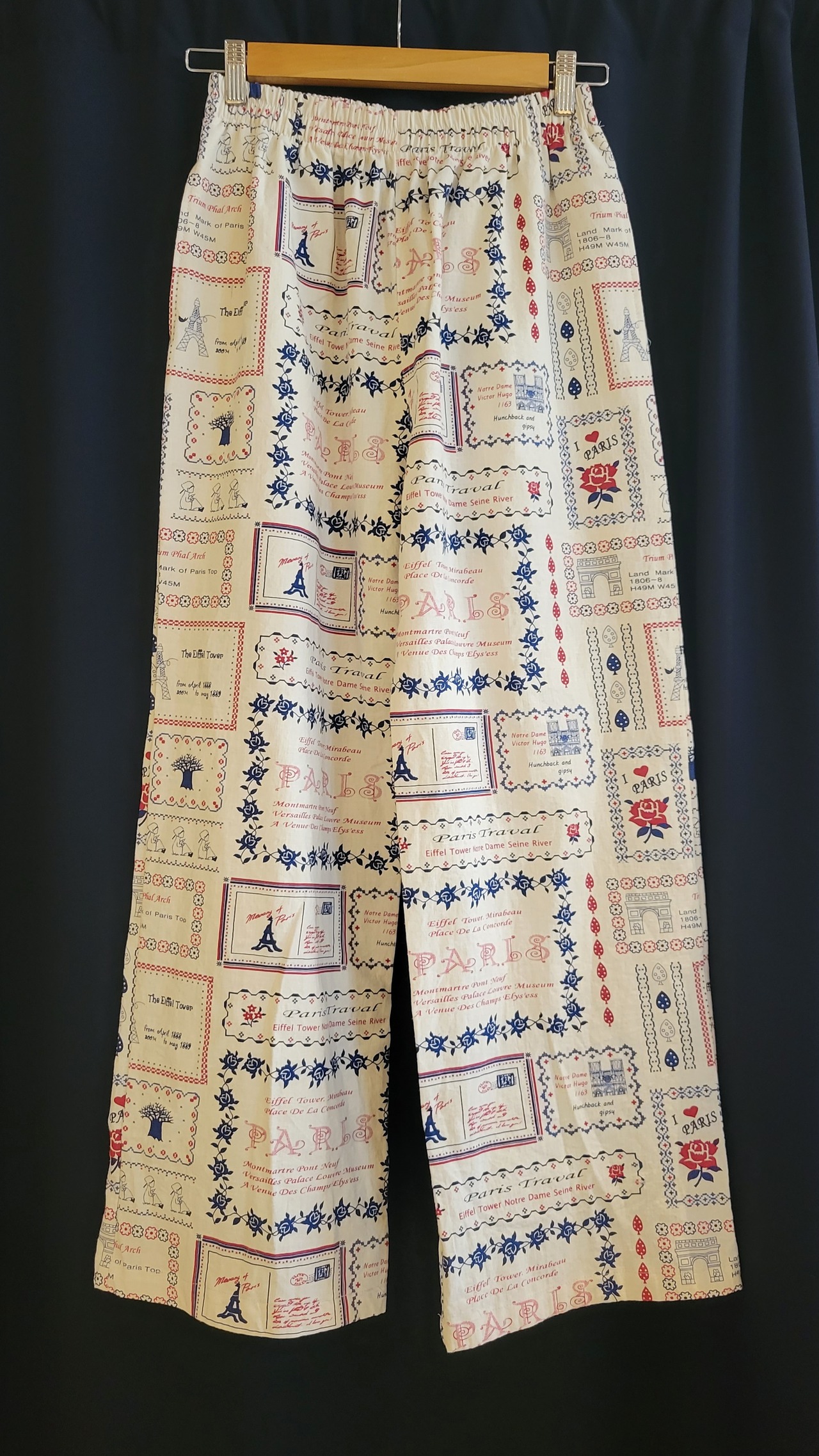 ヴィンテージのテーブルクロスを試用したリメイクパンツ。ウエストゴム、左右にシームポケット付き。素材はやや張り感のあるコットンです。柄は刺繍ではなくプリントです。さらりと気持ちの良い素材感で履き心地良く日常使いにぴったりです。