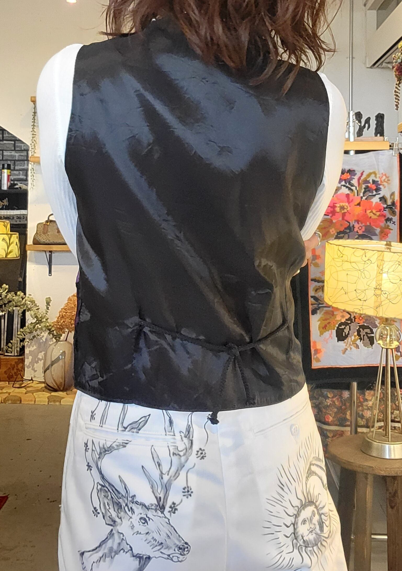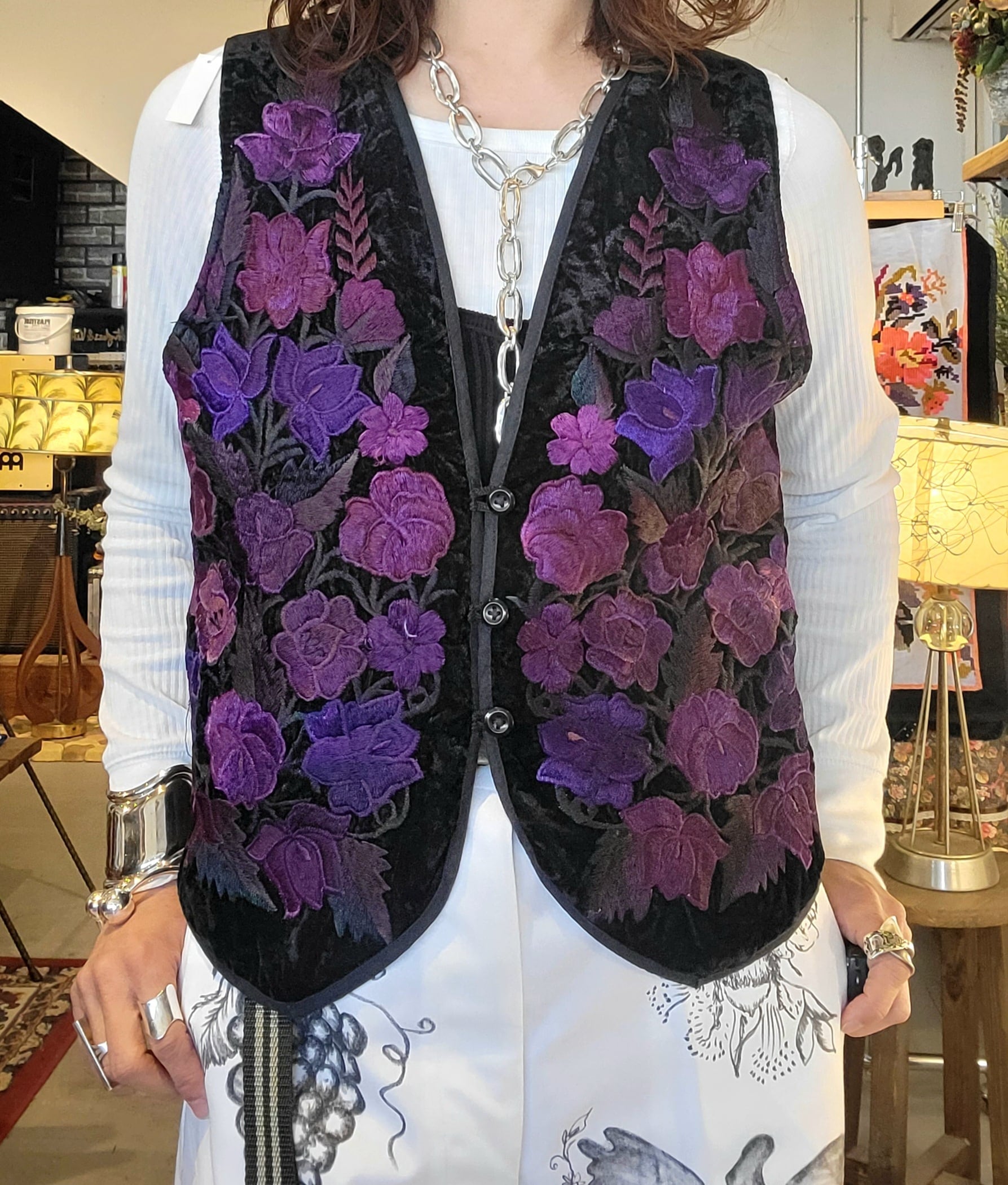グアテマラ製のヴィンテージ刺繍ベスト。素材は前身ごろがコットン100%のベロア、後ろ身頃はポリエステルのようです。カラフルなイメージのグアテマラ刺繍ですがこちらは落ち着きのあるパープルのグラデーションでシックな印象。ベロアの素材感も相まって上品な印象です。ブラウスやワンピースにプラスしてお楽しみください。