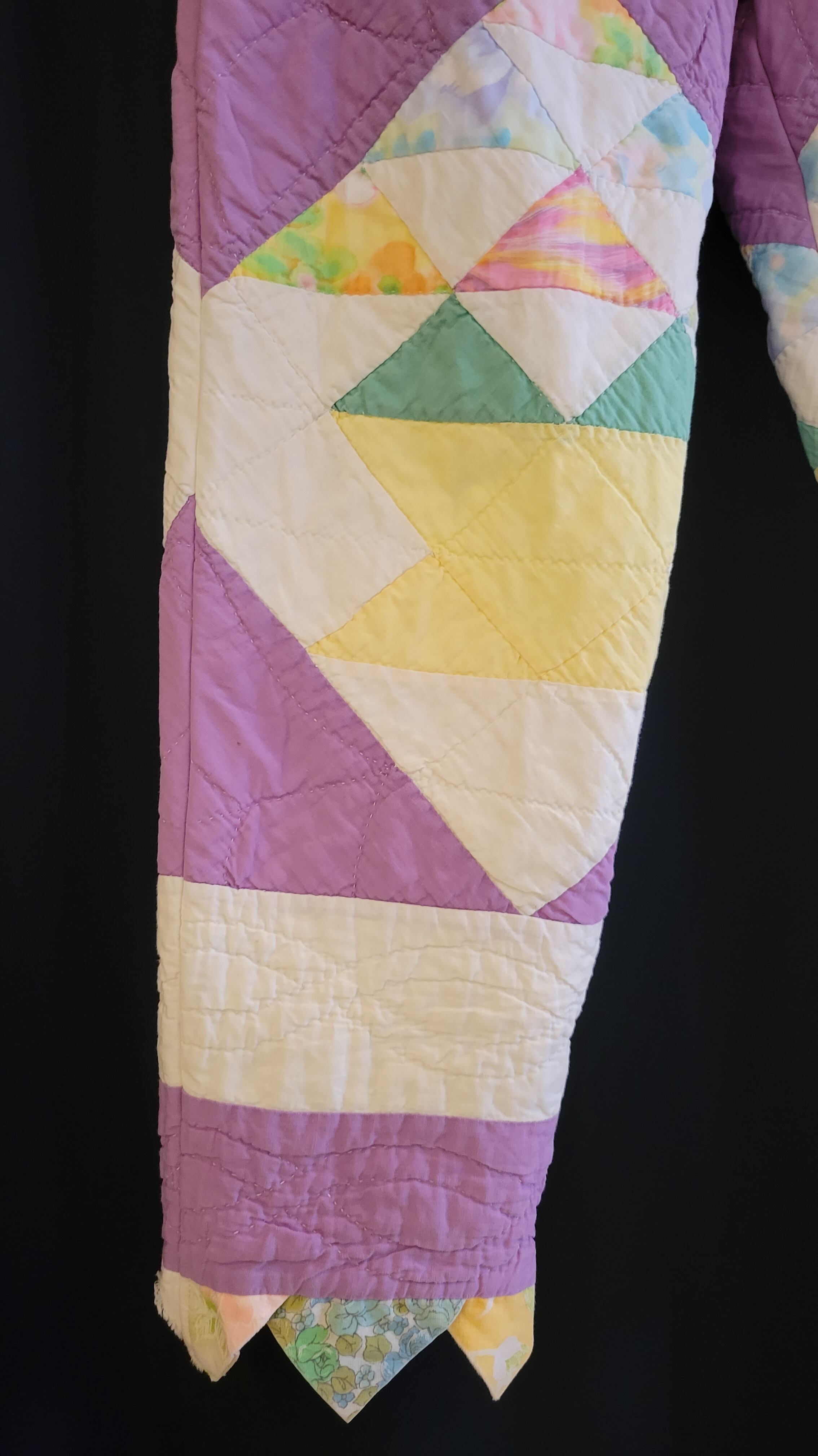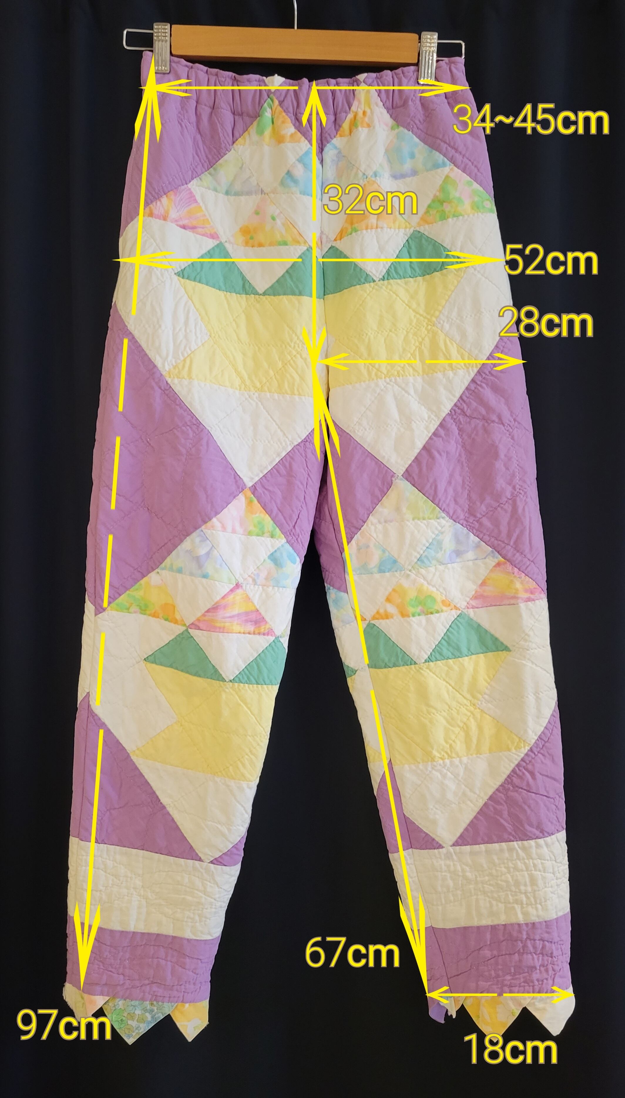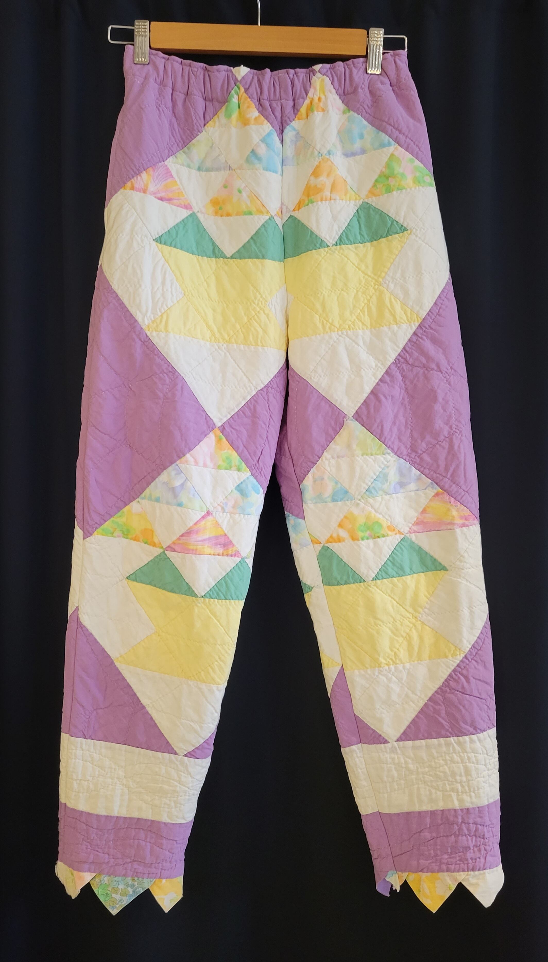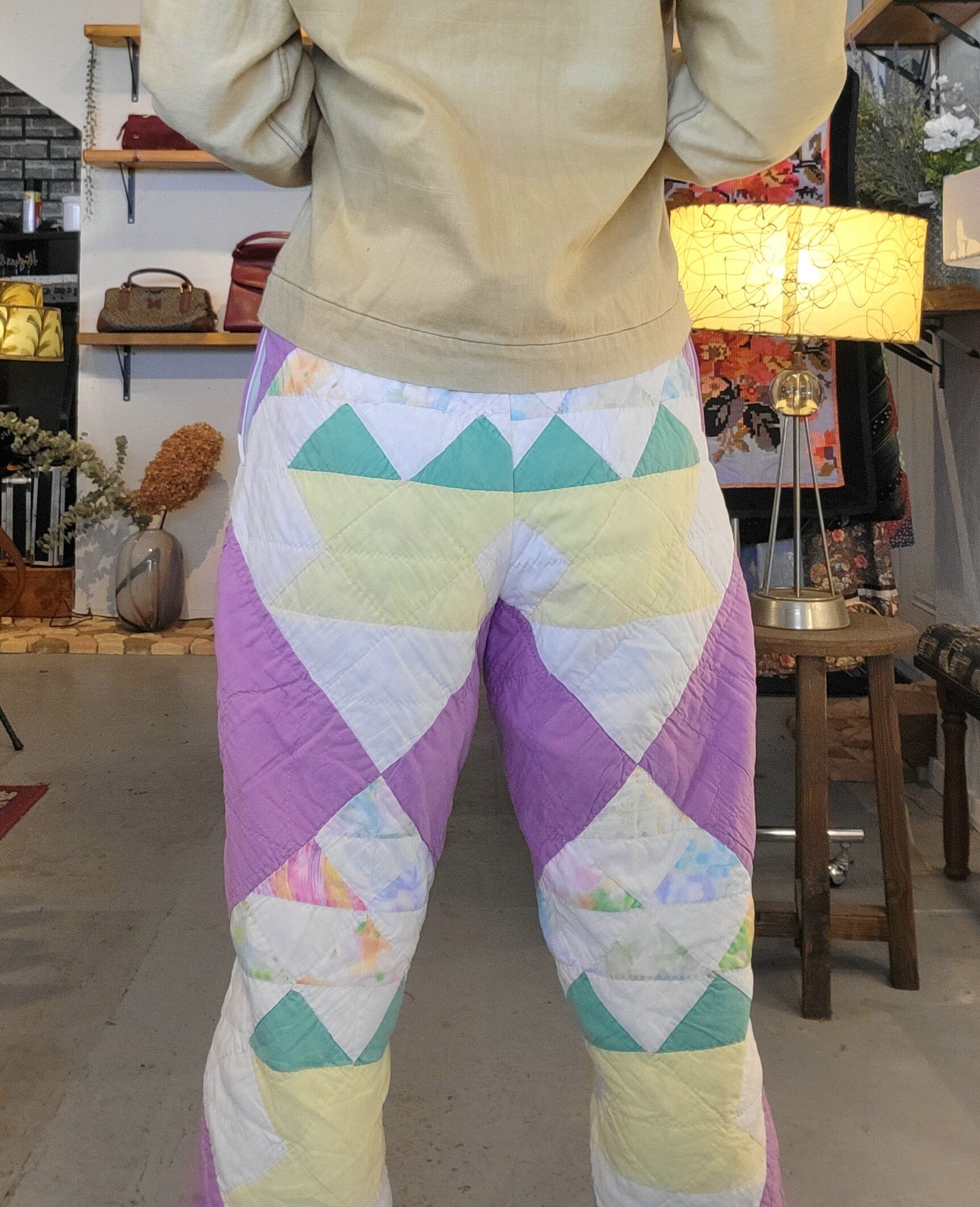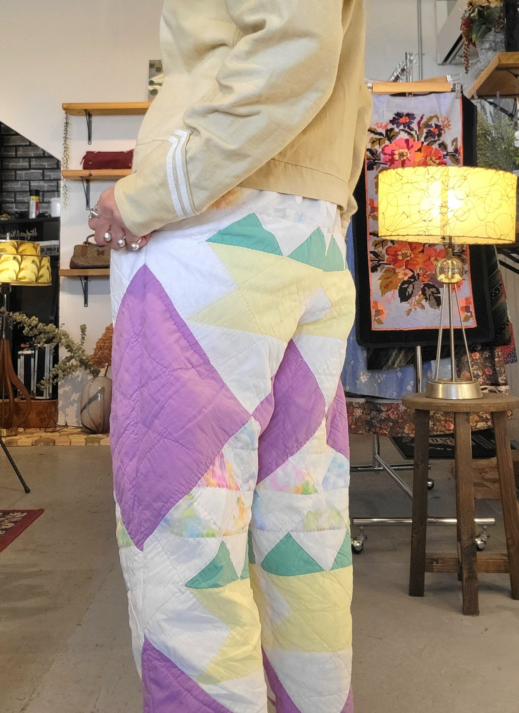 ヴィンテージのハンドパッチワークキルトを使用したオリジナルのリメイクパンツ。素材はコットンです。ウエストはゴム仕様、左右ポケット付きです。パンツの裾には元々付いていた三角フラッグデザインを残しています。ヴィンテージならではのシボ感もたまりません。