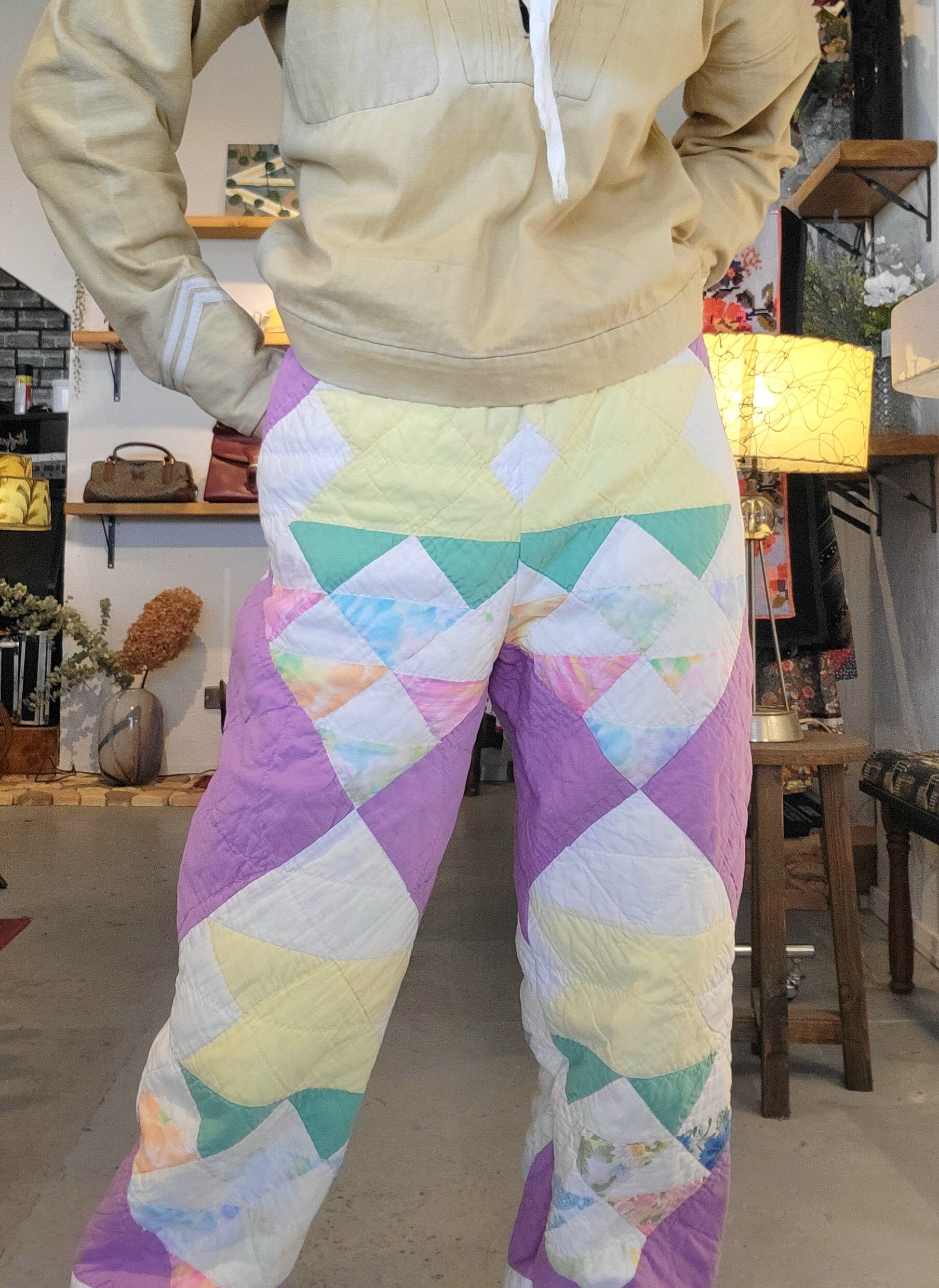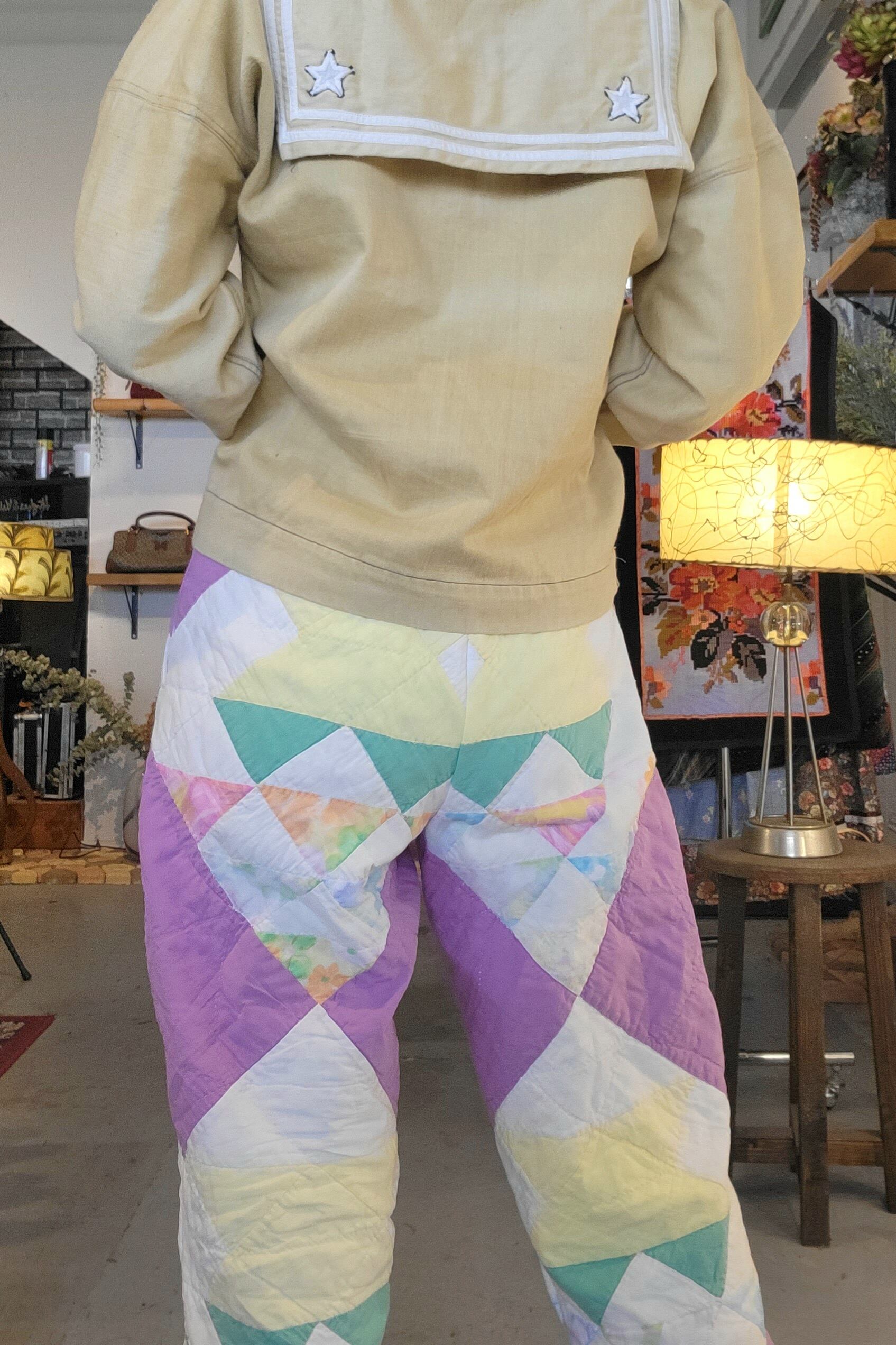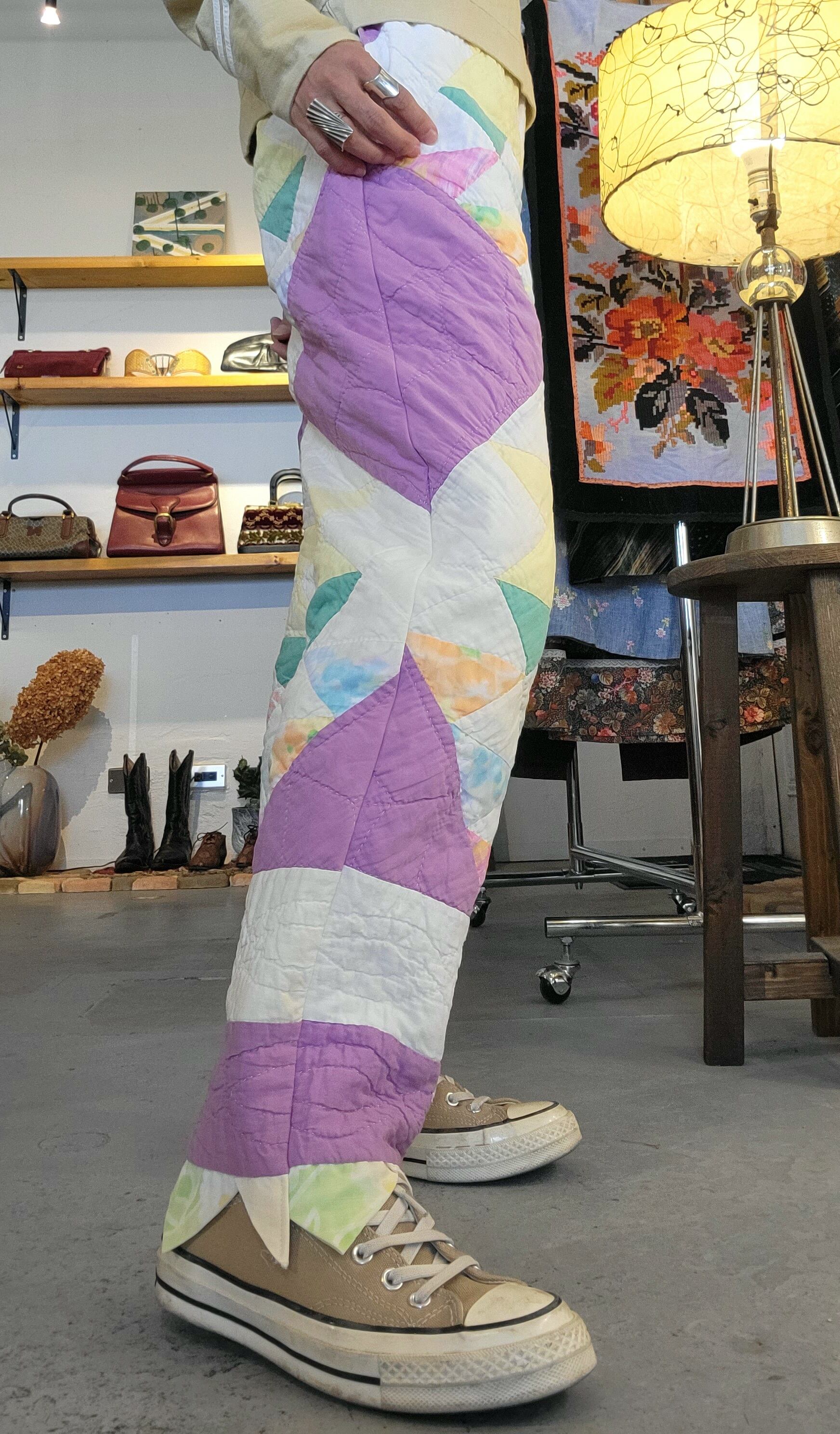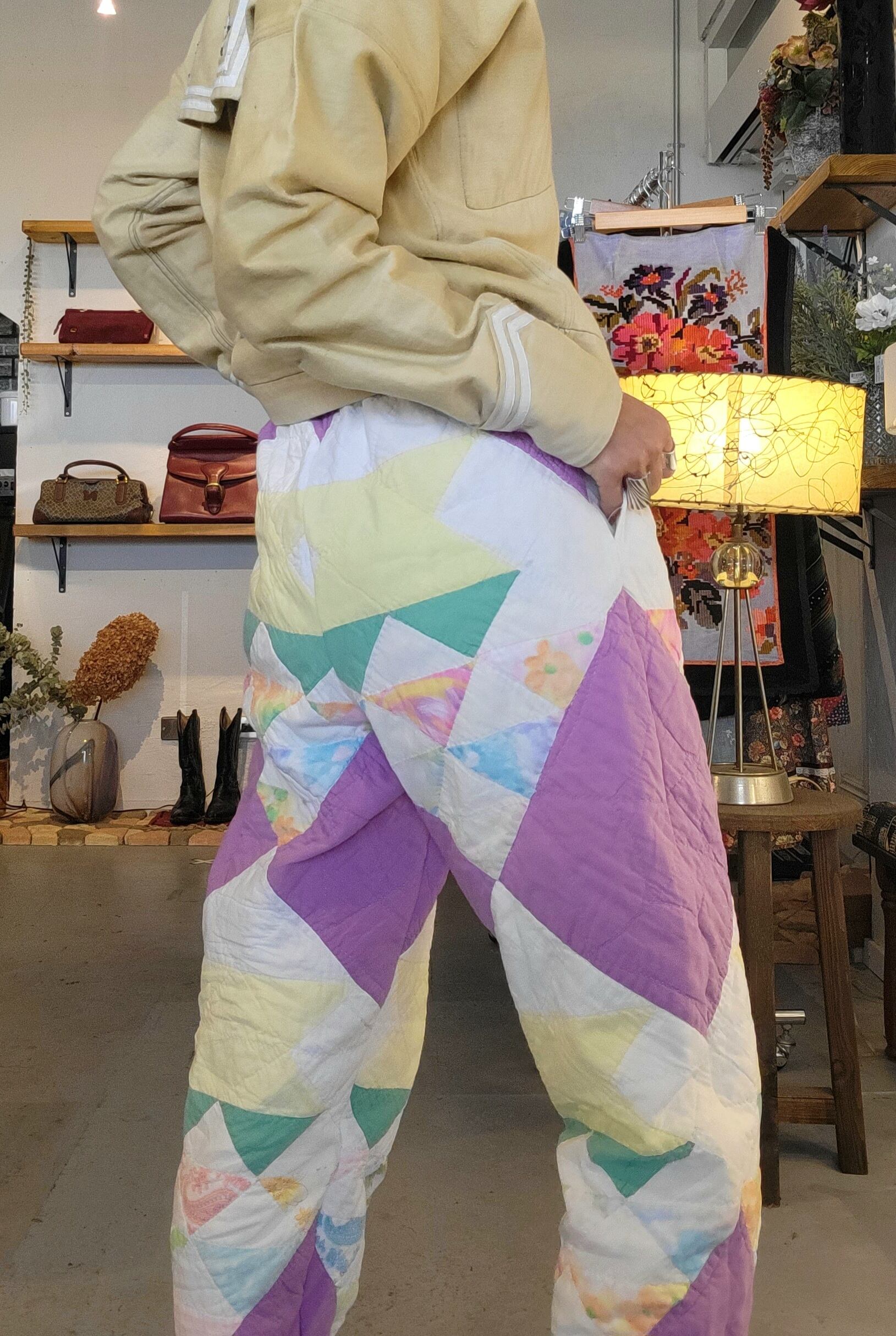 ヴィンテージのハンドパッチワークキルトを使用したオリジナルのリメイクパンツ。素材はコットンです。ウエストはゴム仕様、左右シームポケット付きです。パンツの裾には元々付いていた三角フラッグデザインを残しています。ヴィンテージならではのシボ感もたまりません。