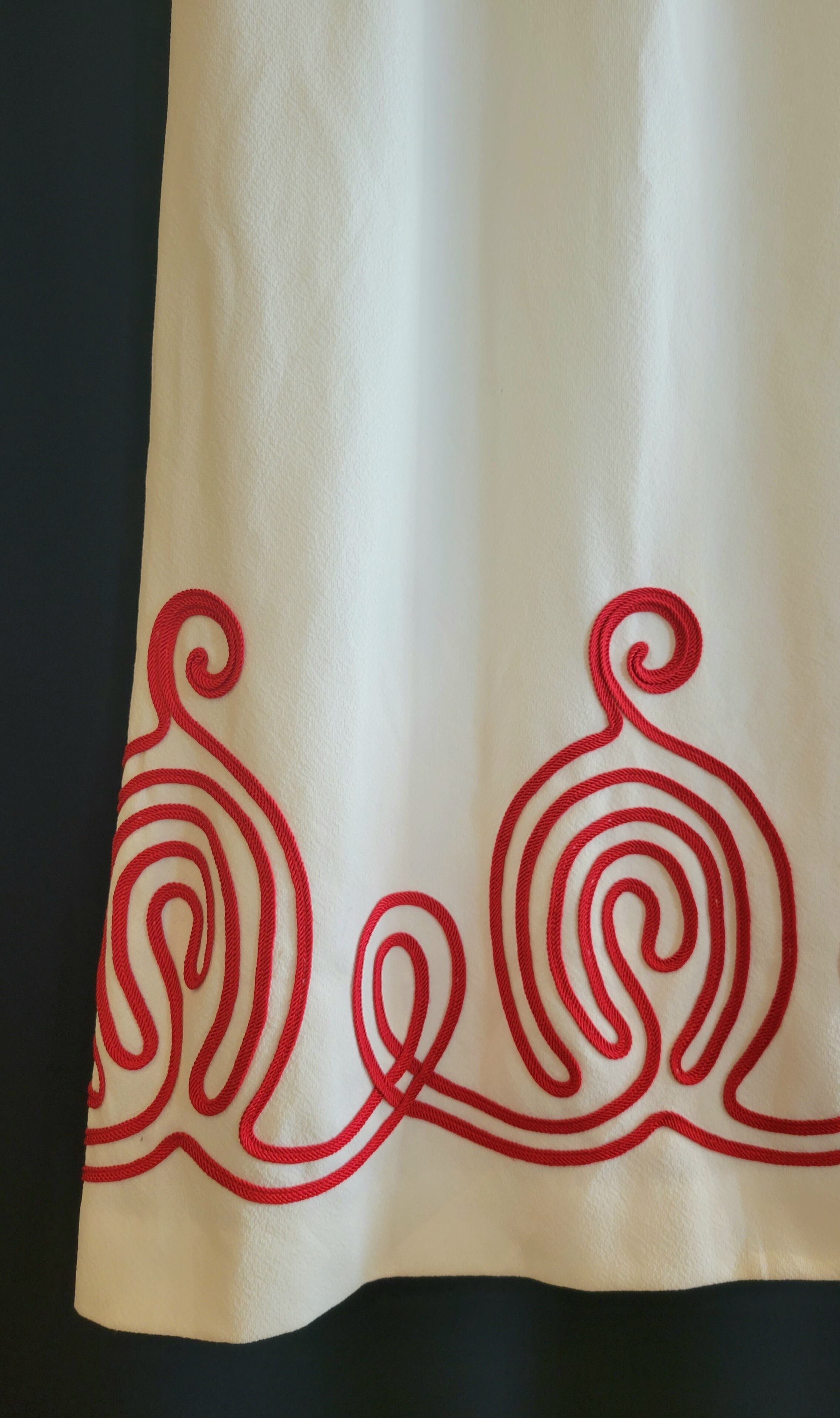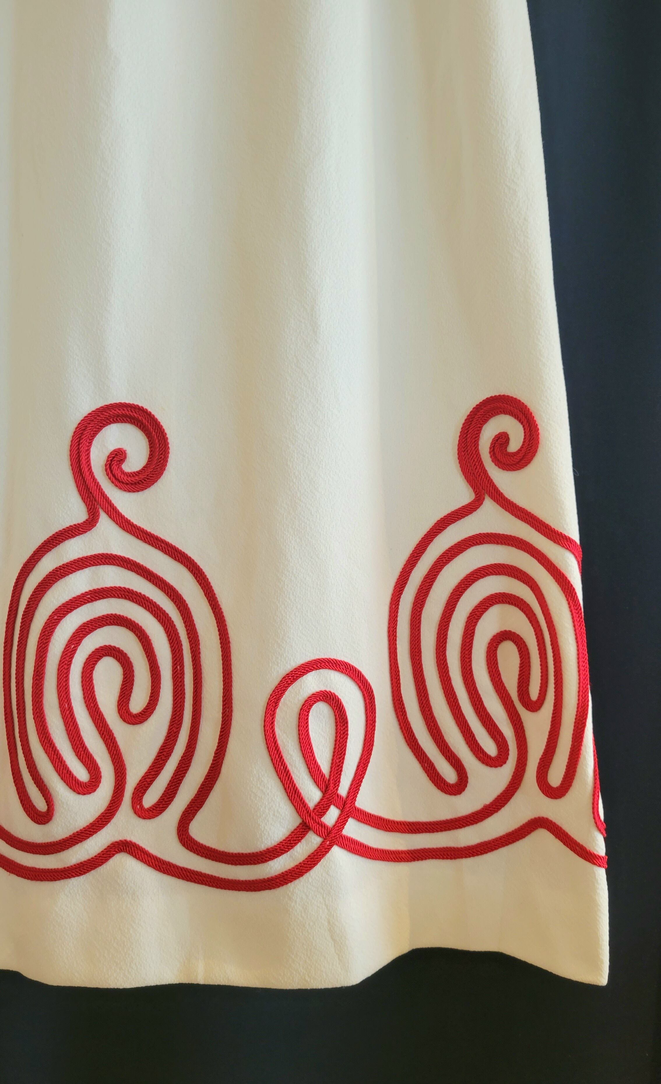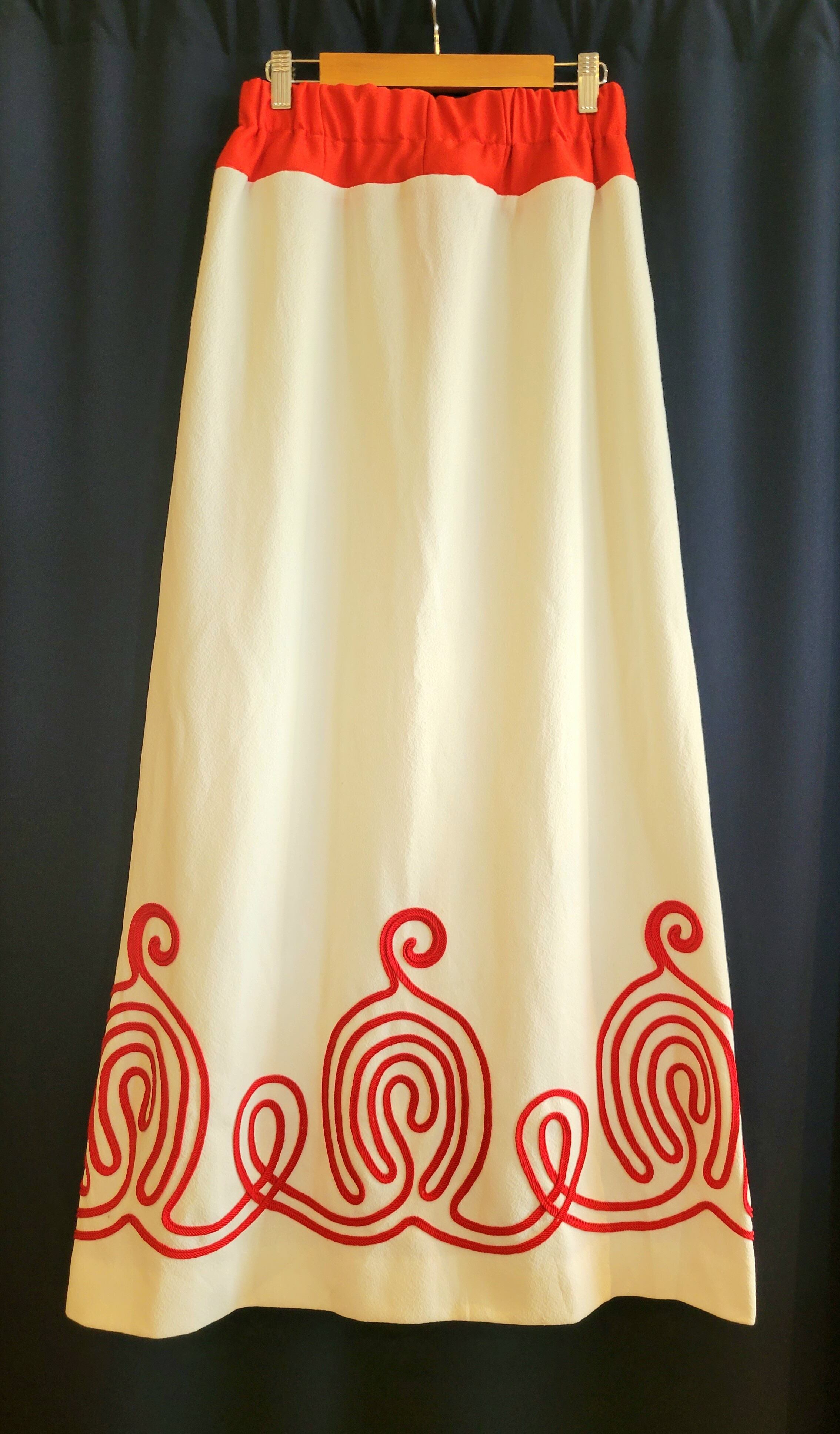 ヴィンテージのマキシスカート。素材表記はありませんがやや厚みのあるざらっとした肌触りの素材感です。若干の伸縮性があります。透け感はありません。裾に大胆に入ったコード刺繍モチーフがインパクトのある個性的な1着。シンプルなTシャツをインしてウエストの赤を活かしたスタイリングもおすすめです。