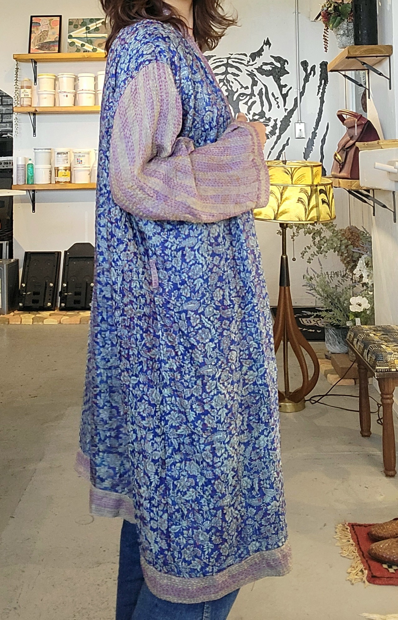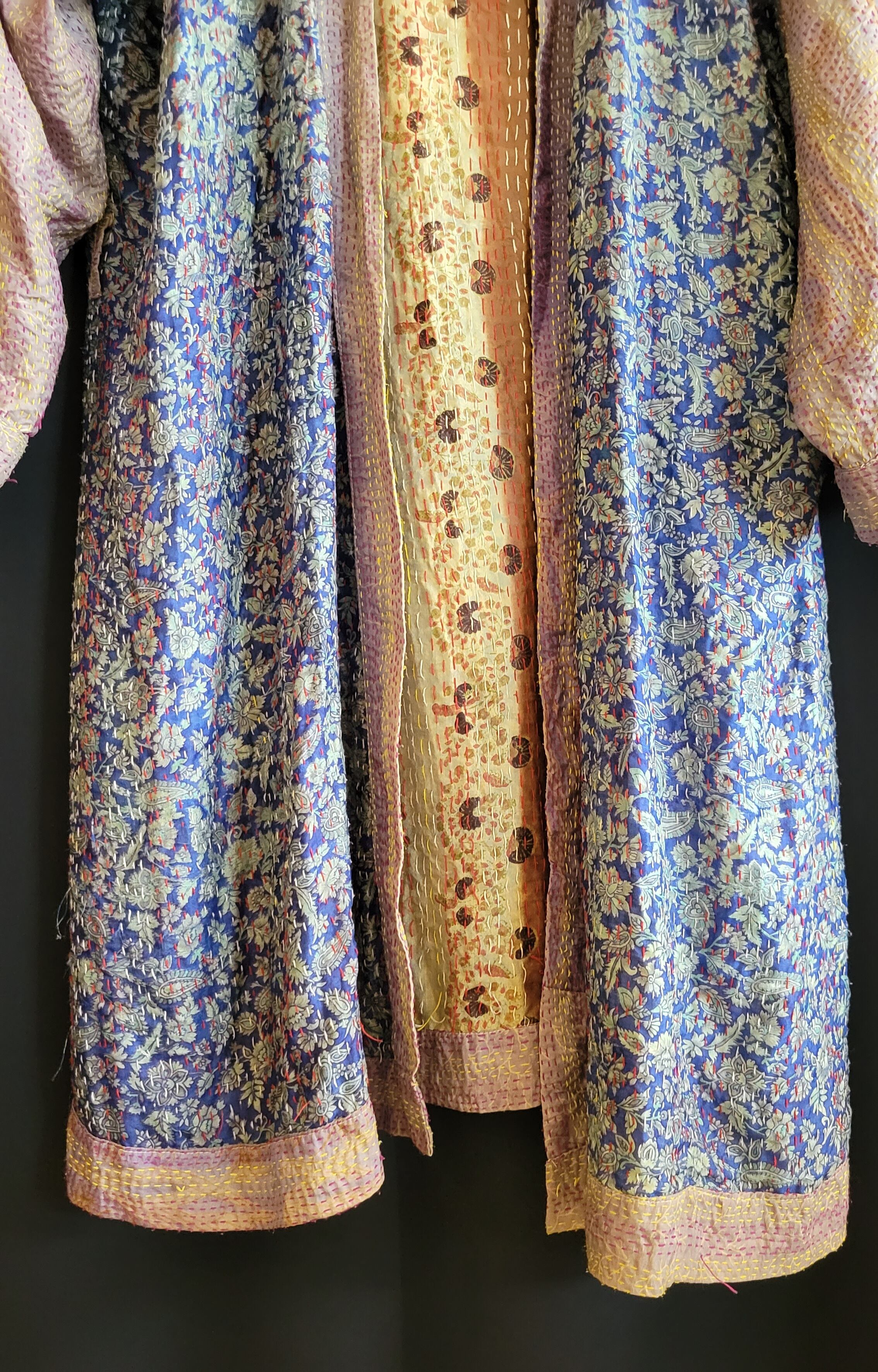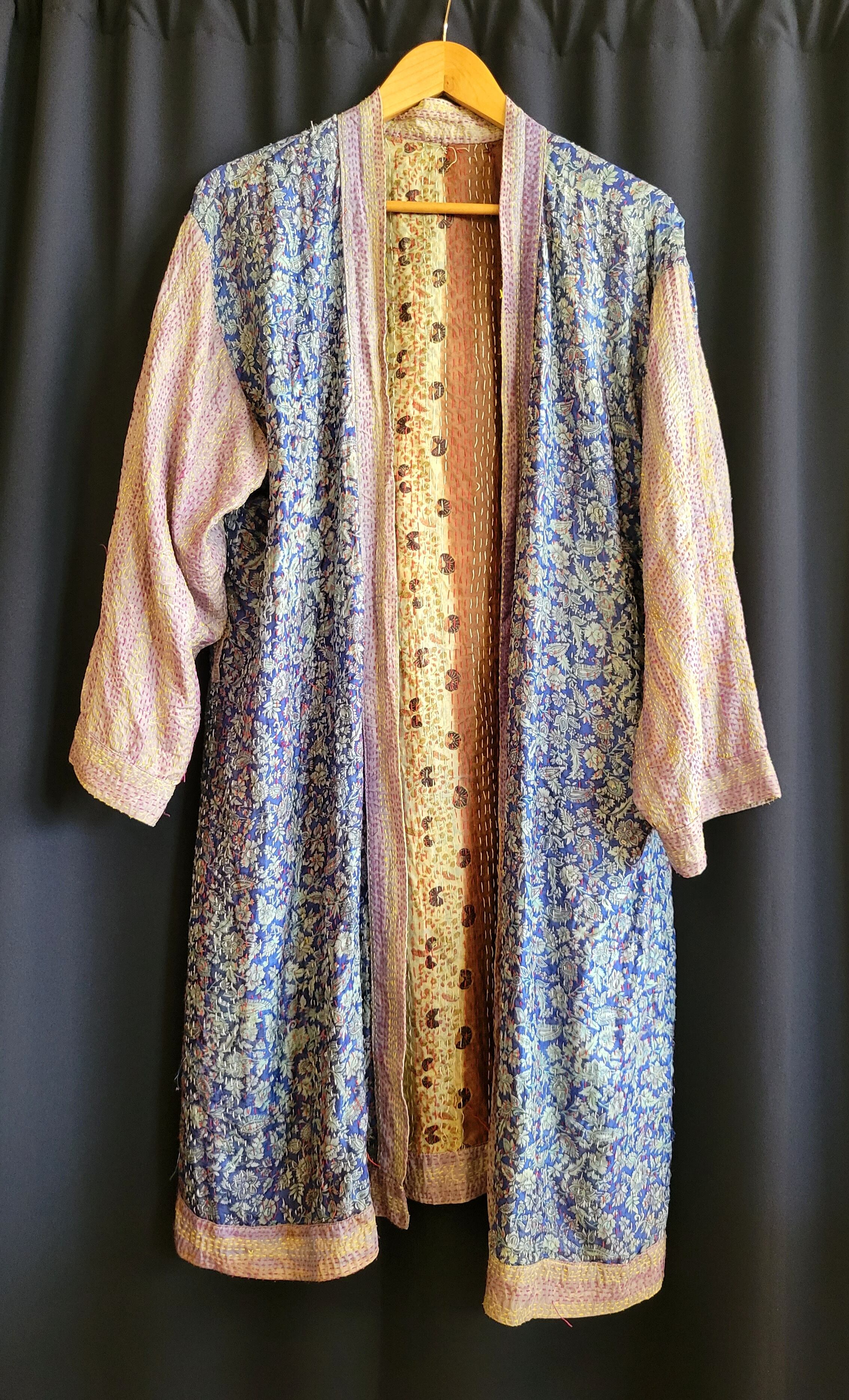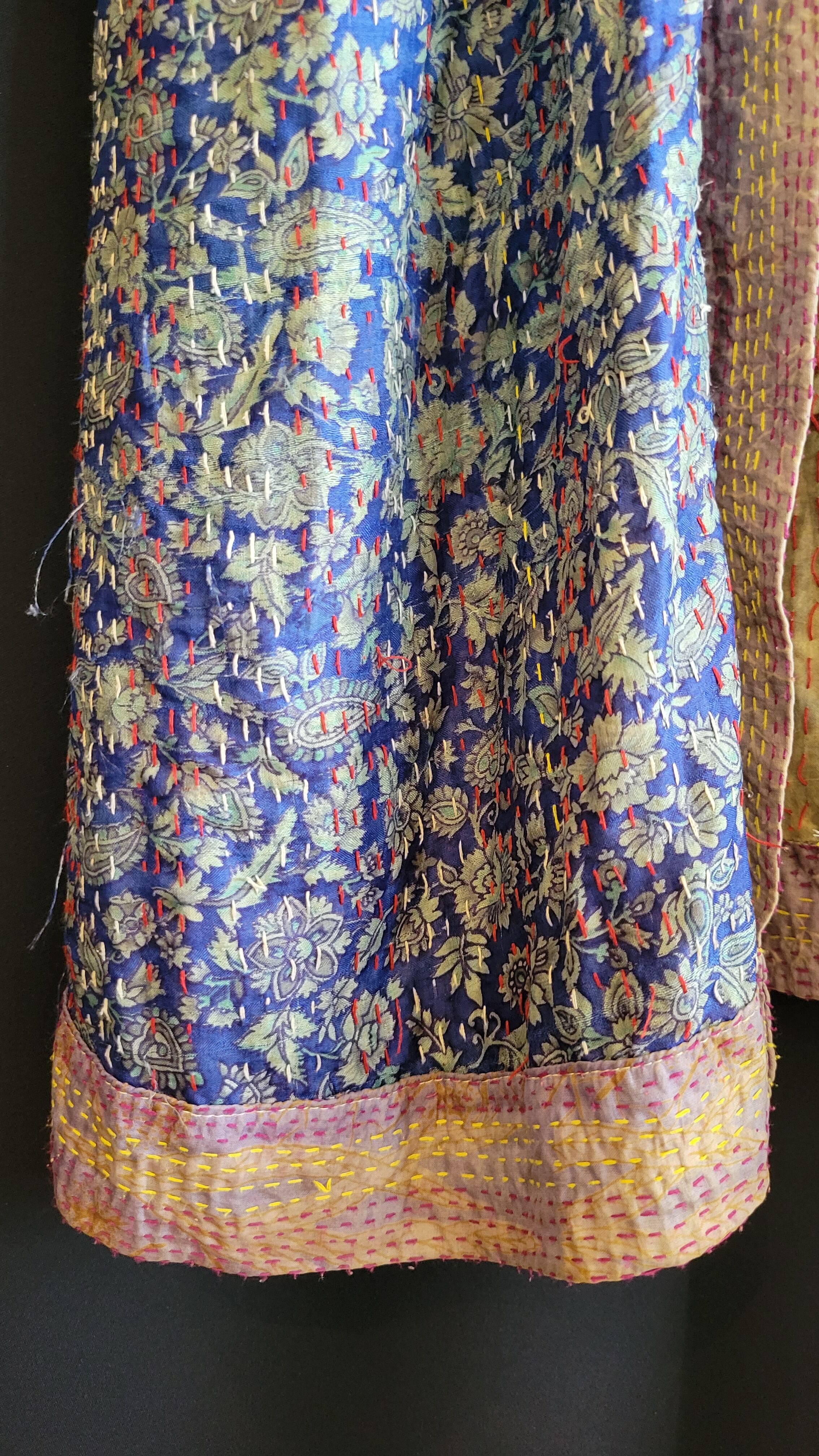 Made in India のヴィンテージシルクガウン。全体にハンドステッチが施されています。とても軽量でシルクの滑らかな肌触りをお楽しみいただけます。オープンタイプでさっと羽織って雰囲気の出る1枚。古いお品のため、ステッチの弛み、ほつれが多数ございます。画像でご確認ください。こちらはヴィンテージに慣れていらっしゃる方、ご理解のある方へおすすめいたします。