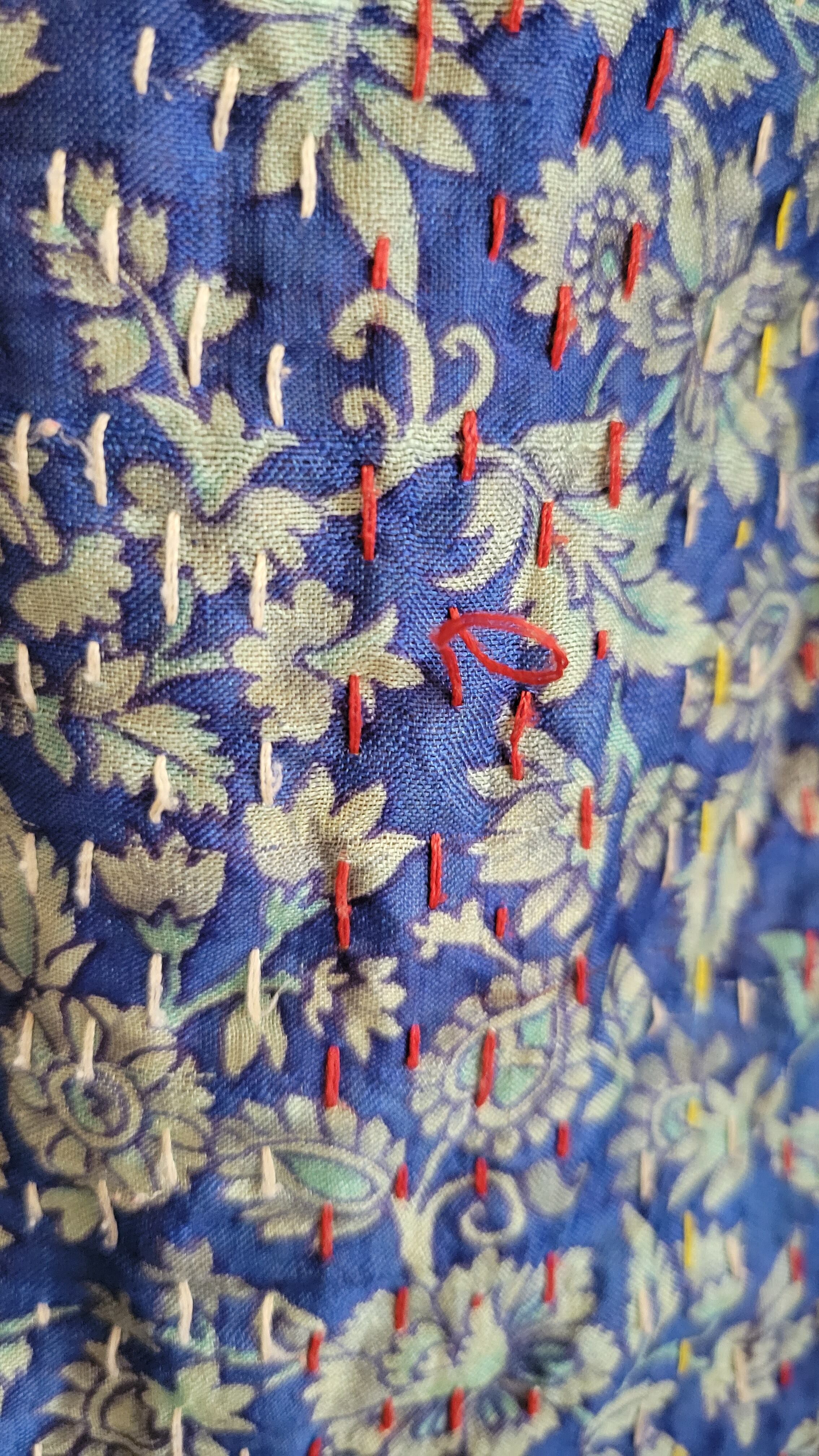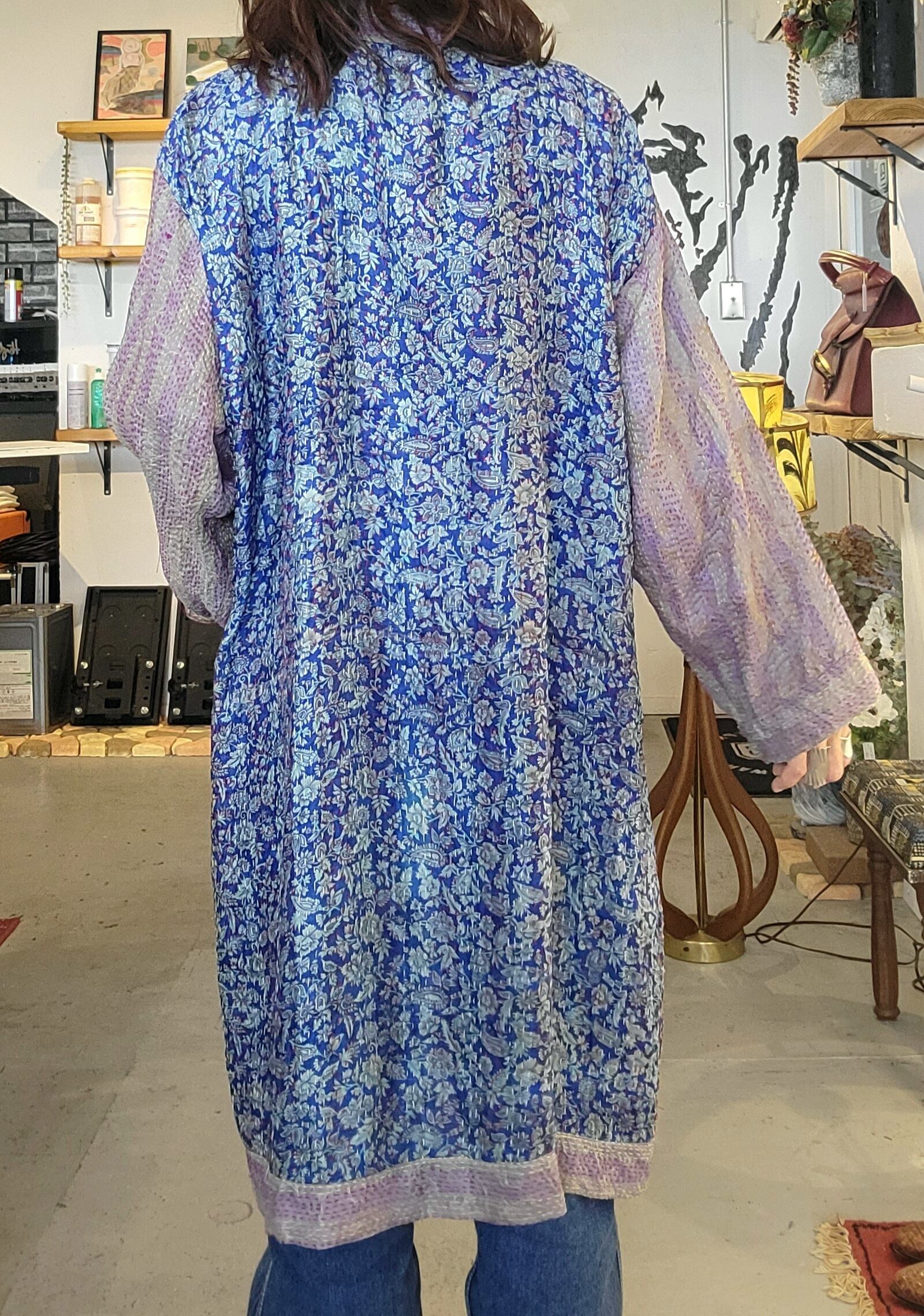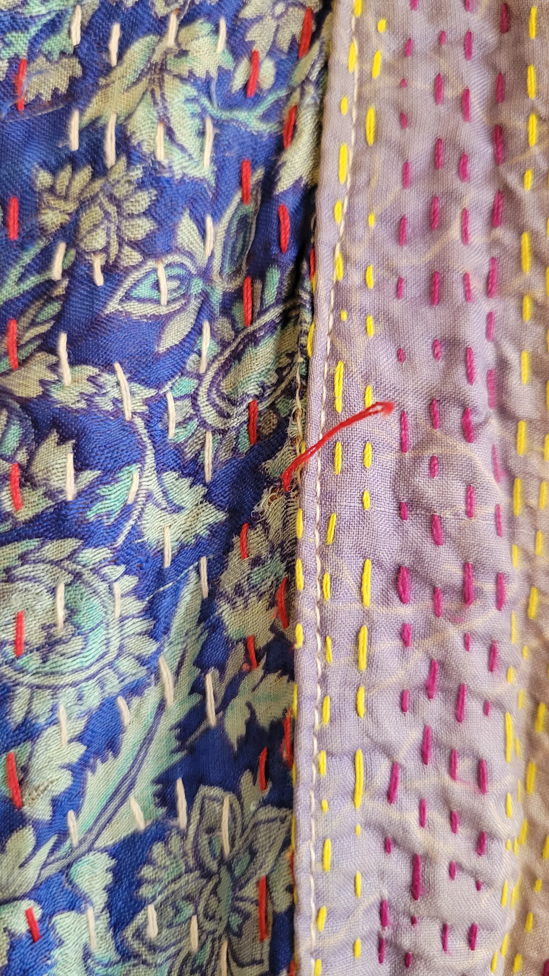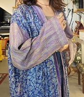 Made in India のヴィンテージシルクガウン。全体にハンドステッチが施されています。とても軽量でシルクの滑らかな肌触りをお楽しみいただけます。オープンタイプでさっと羽織って雰囲気の出る1枚。古いお品のため、ステッチの弛み、ほつれが多数ございます。画像でご確認ください。こちらはヴィンテージに慣れていらっしゃる方、ご理解のある方へおすすめいたします。