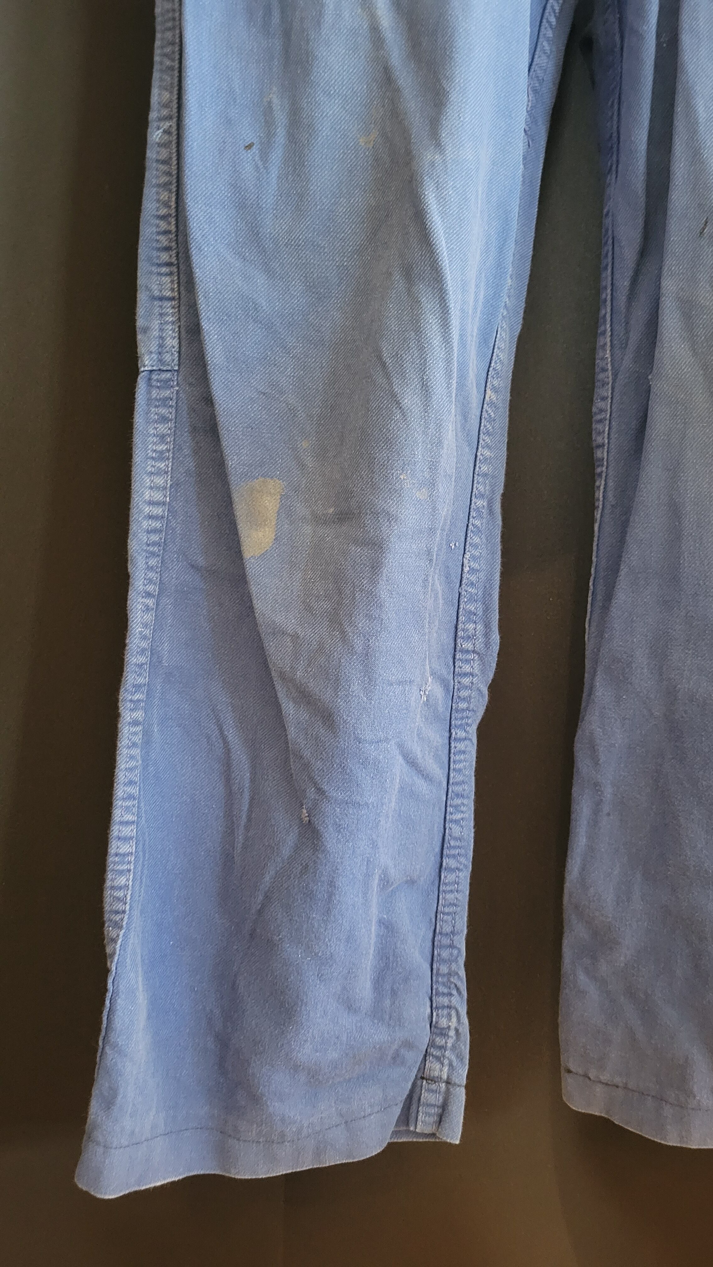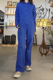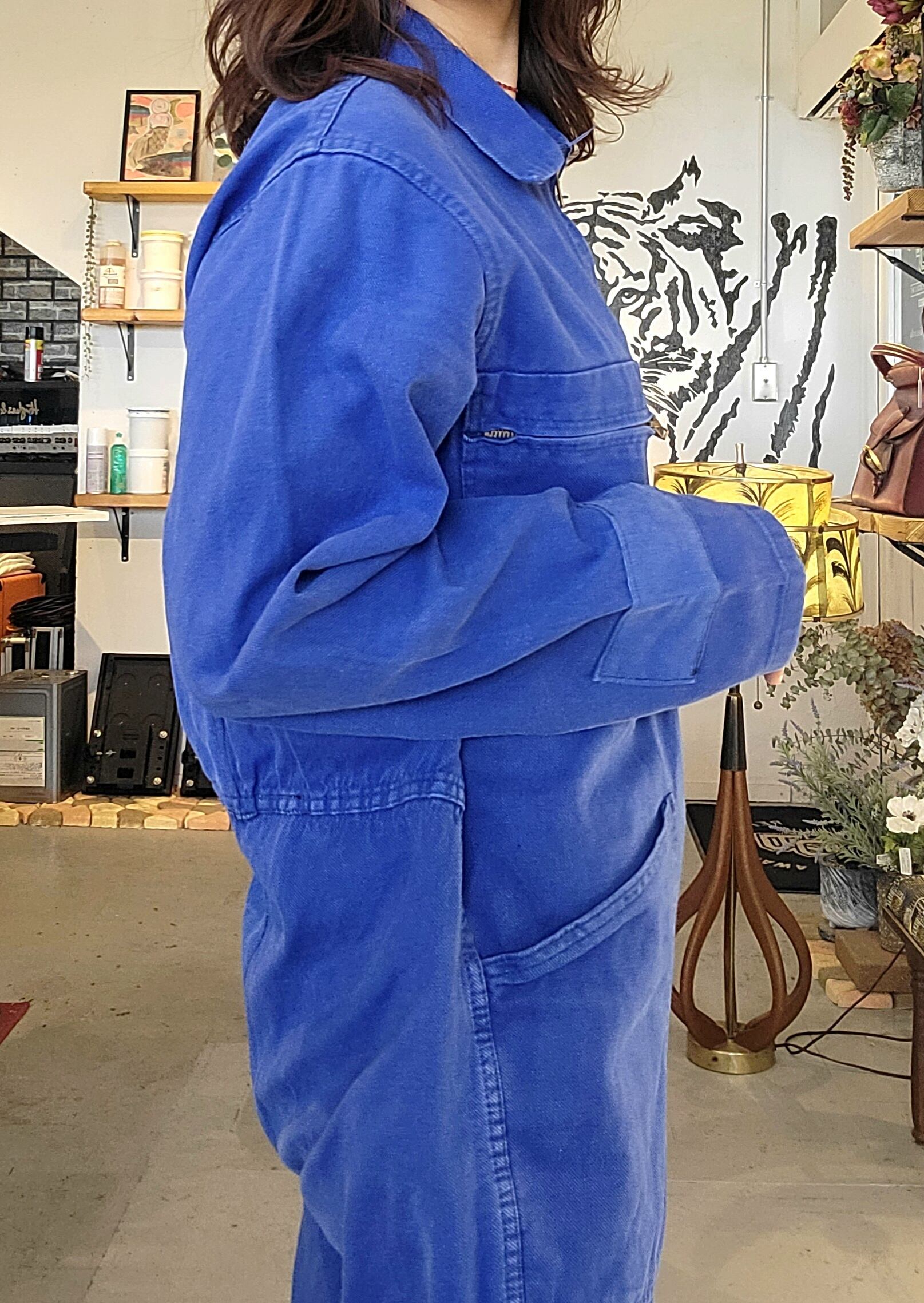 ユーロワークオールインワン。素材はコットンです。フロントジップで着脱が楽です。女性がジャストサイズで着られてこなれ感の出るサイズです。もともとあったリペアやリメイク跡も味があって魅力的。