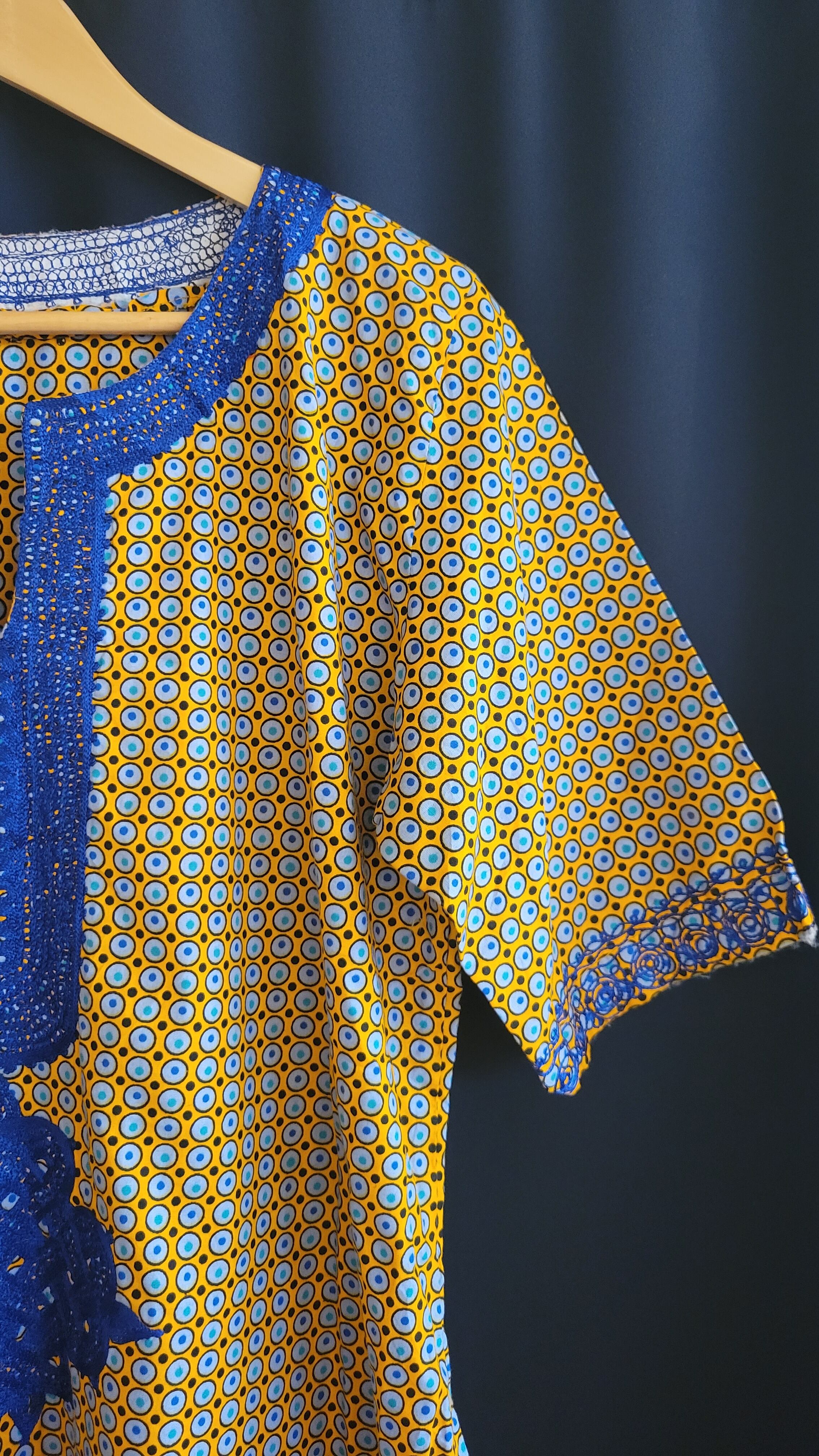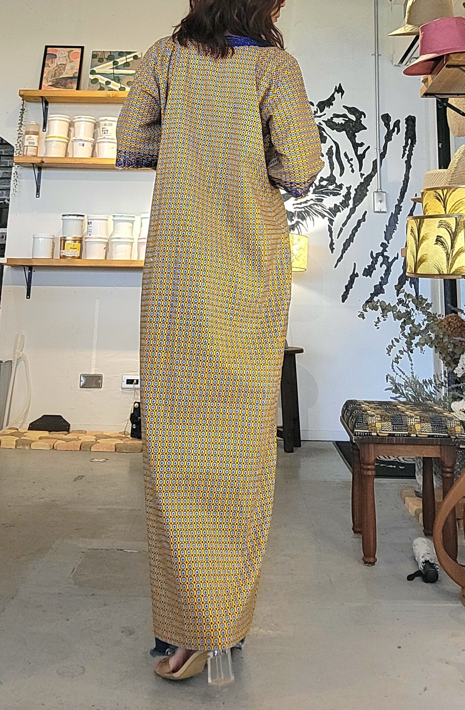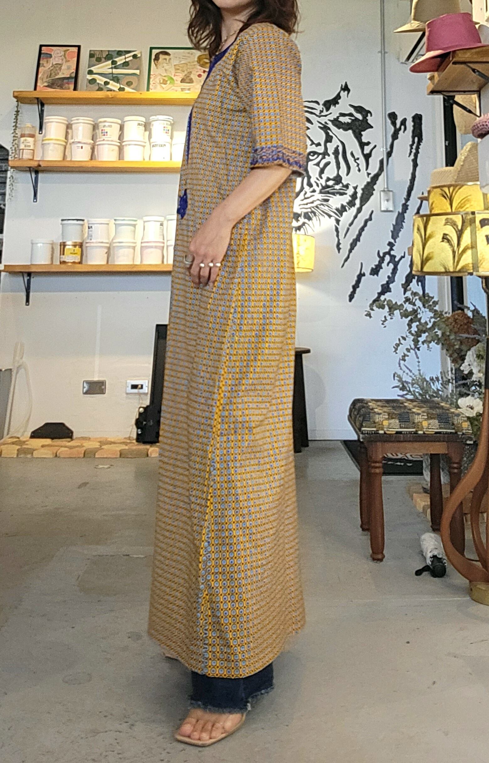 ヴィンテージの刺繍入りカフタンドレス。素材表記はありませんがコットンのようです。締め付け感が無く風の通る涼しいデザインです。透け感も無く1枚で仕上がるワンピースです。