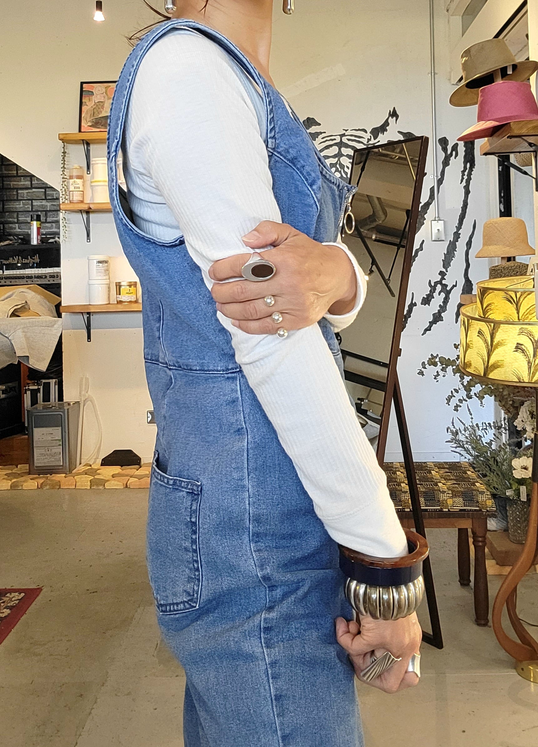 Used デニムサロペット。フロントジップで着脱が楽です。ストレッチの効いたデニムで着心地良く、綺麗なフレアシルエットでスタイルアップが叶います。