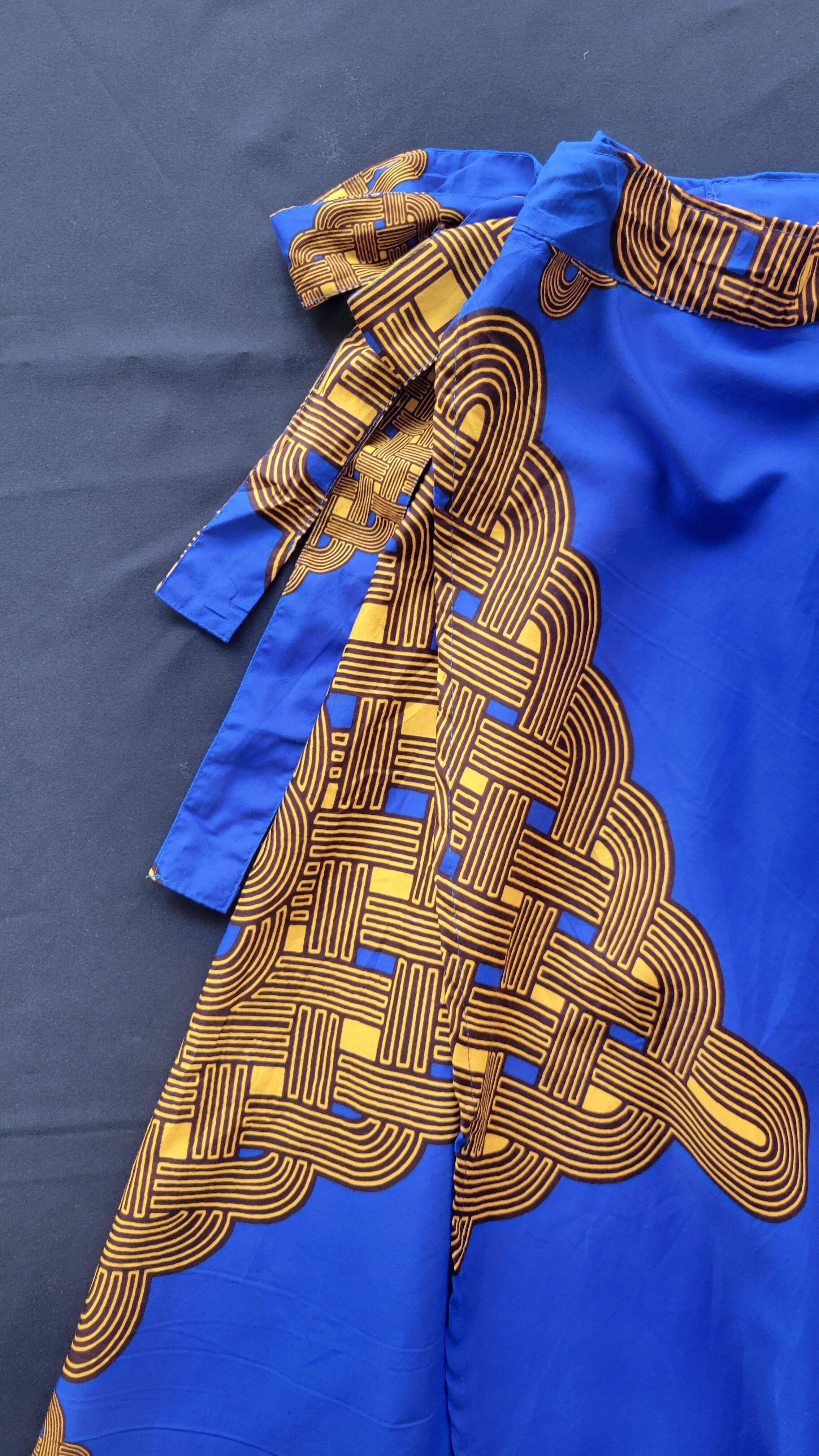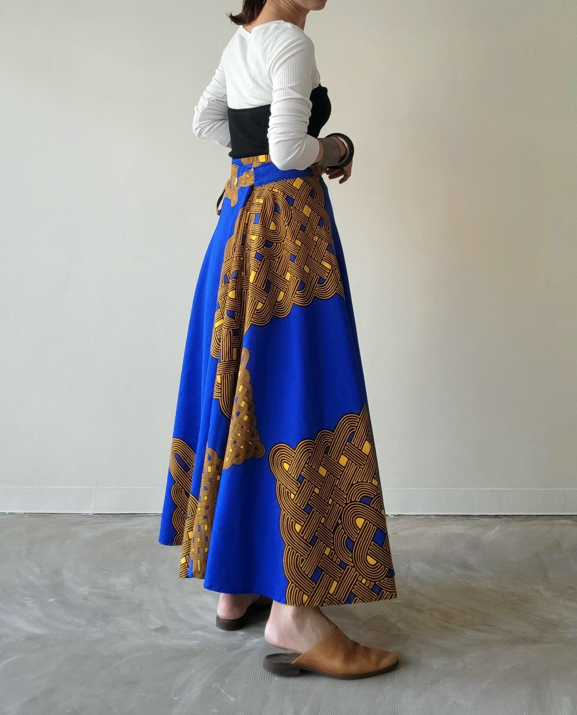 ヴィンテージのアフリカンバティック巻きスカート。ウエストベルトに紐の通し穴があるので巻いた時にウエストの収まりが良く安定感があります。生地を贅沢に使ったバイアスカットに張りのあるコットンが美しいフレアシルエットを着用時もキープ。巻きスカートの合わせの部分もたっぷりとられているのでウエストサイズの幅が広いのも嬉しいポイントです。左右ポケット付きですが巻いた状態ではどちらかひとつのポケットのみが表に出て使用可能となります。