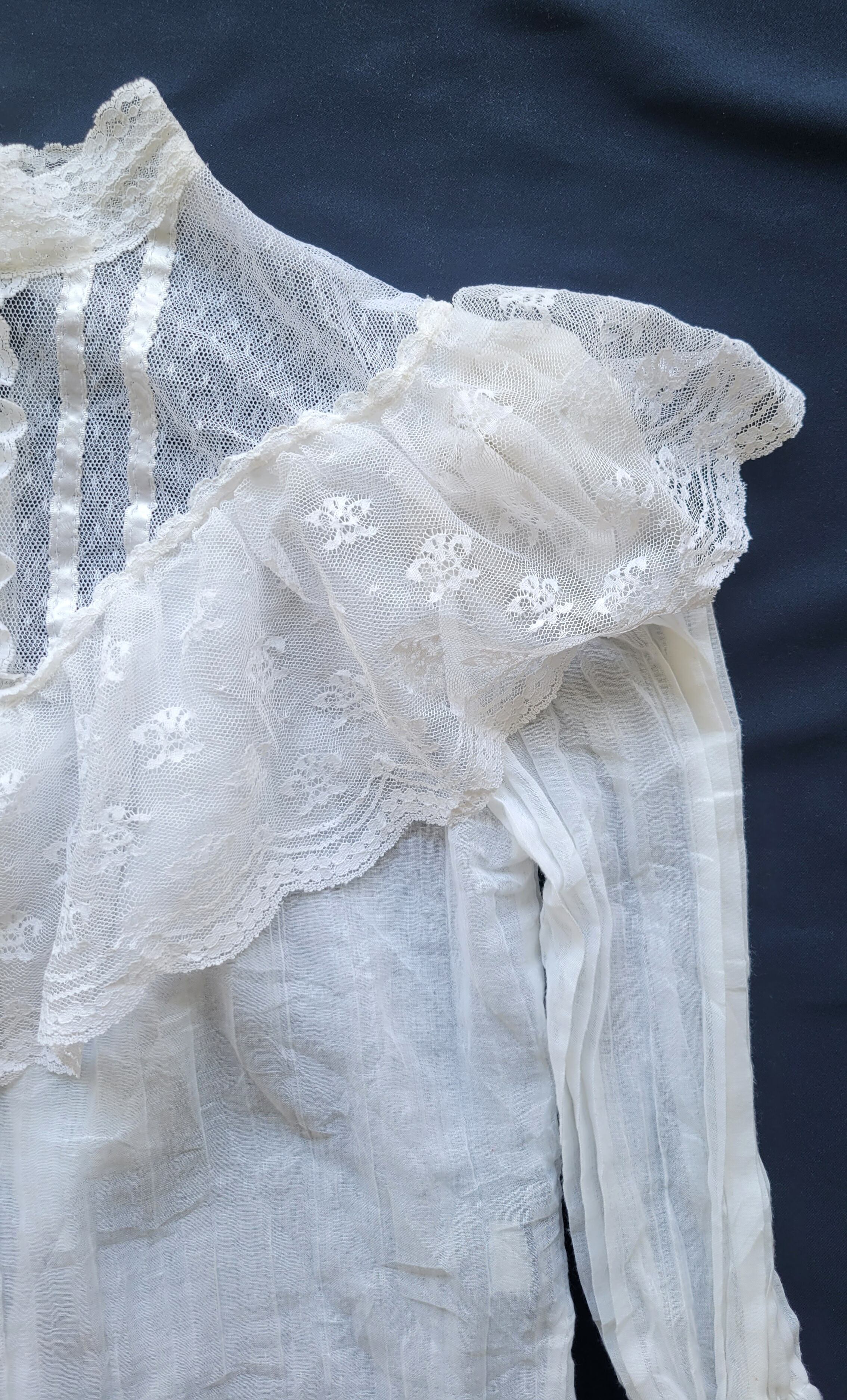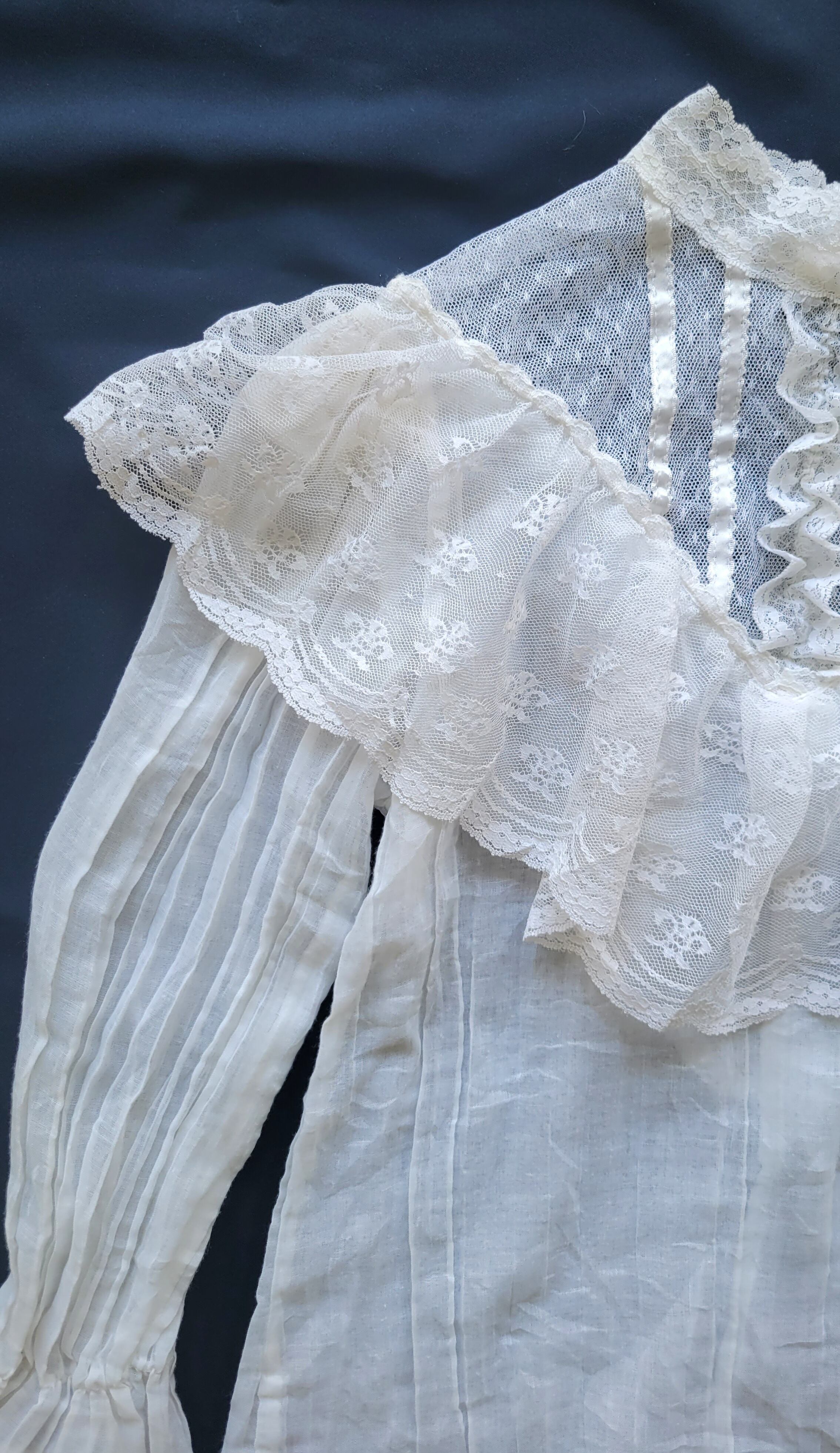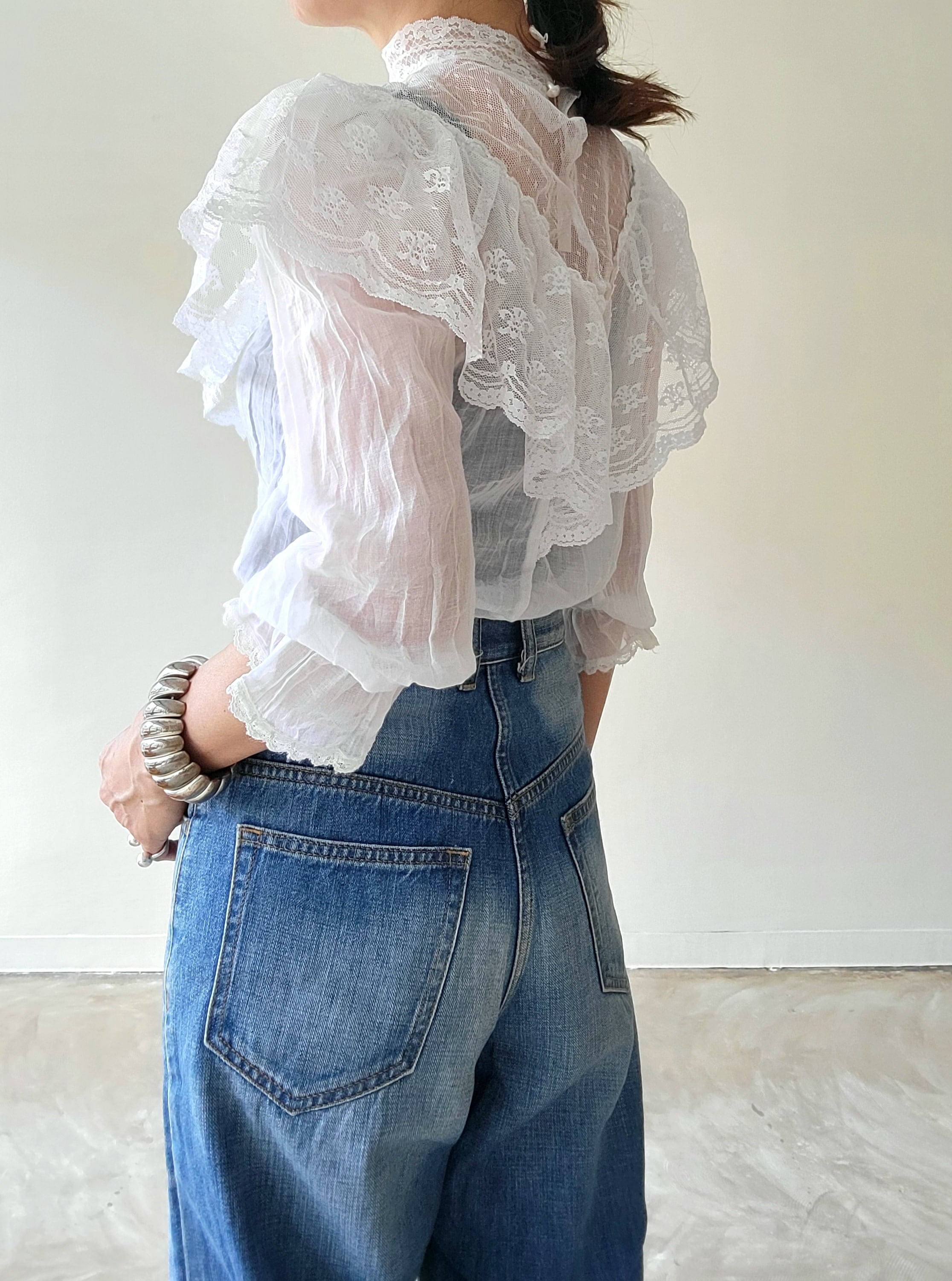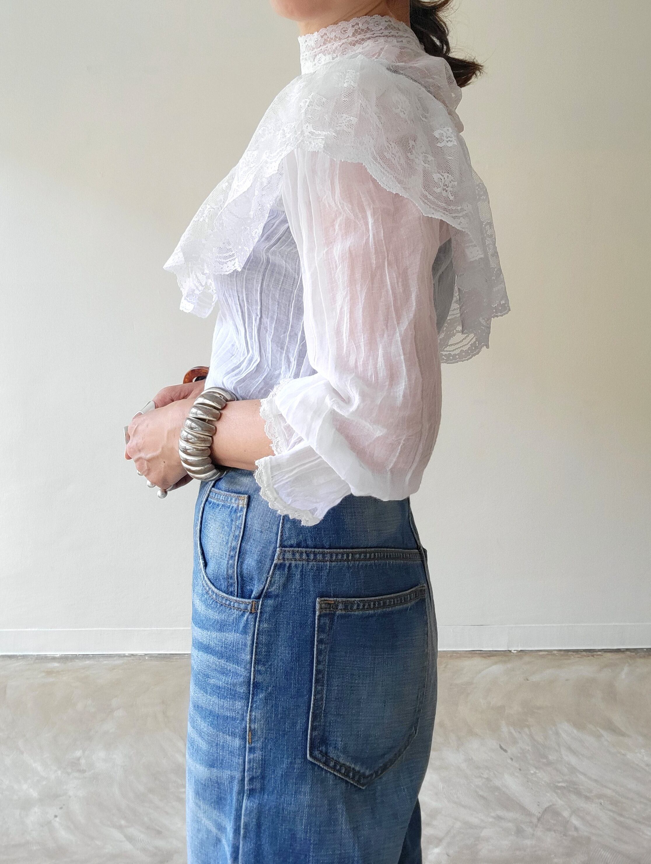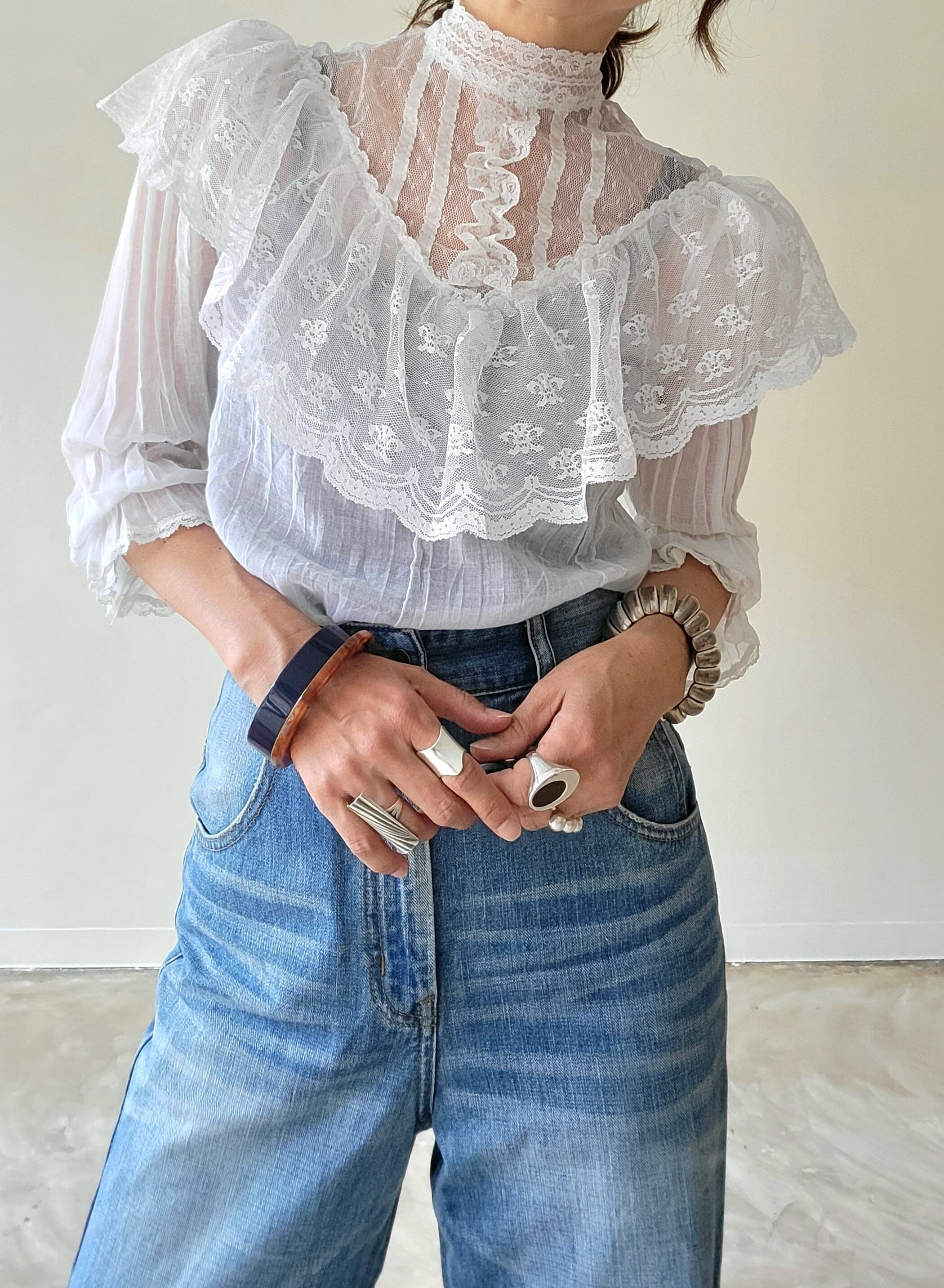 ヴィンテージのチュールレースブラウス。素材表記はありませんが身ごろと袖は薄手のコットン、レース部分はポリエステルのような素材感です。全体的に透け感があります。首後ろにパールボタンが2つ付いています。ハイネックからデコルテにかけてぴたっと張り付くような繊細なレースがなんとも素敵です。コンパクトなサイジングでとても良くバランスのとれた1枚です。