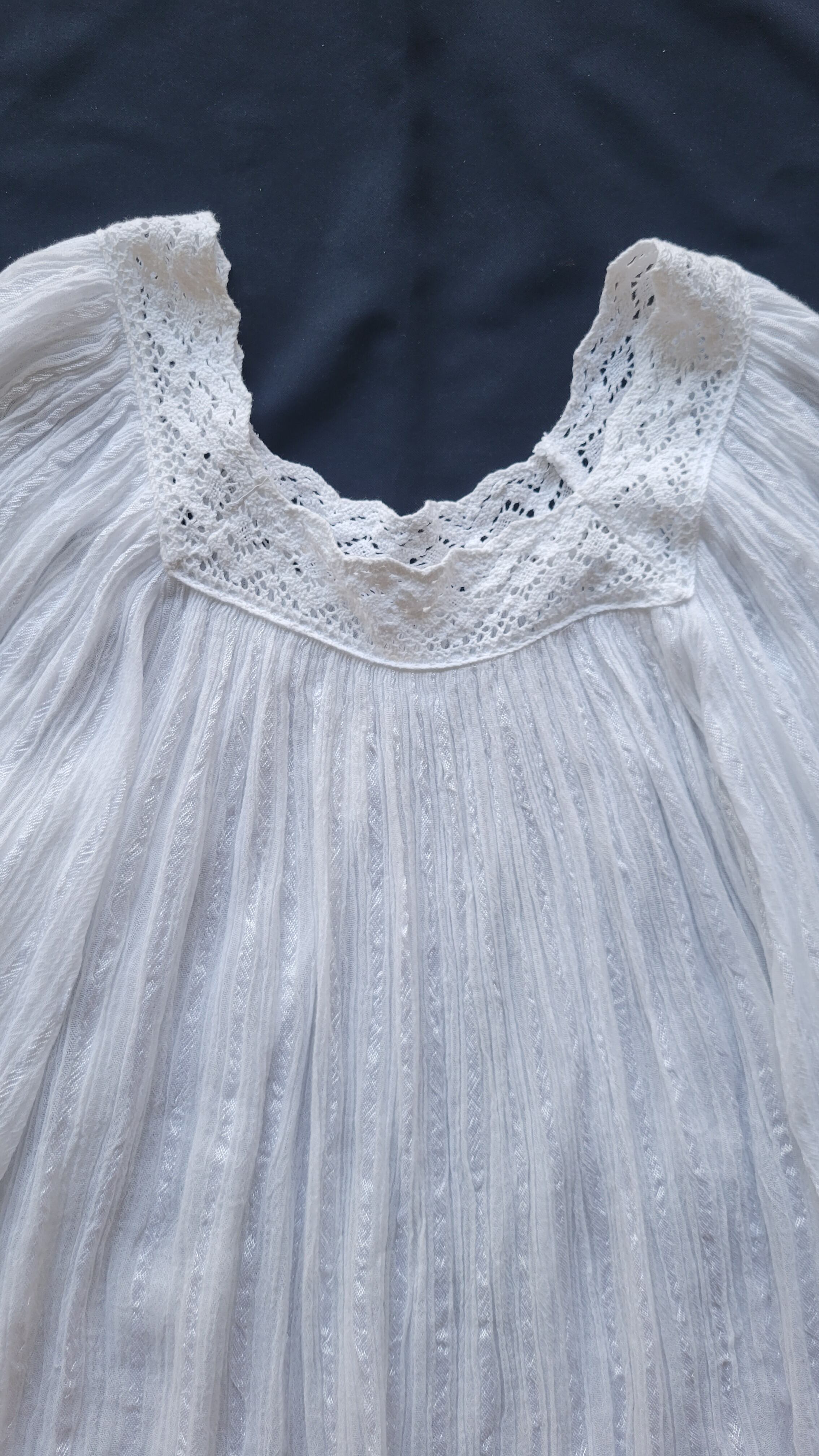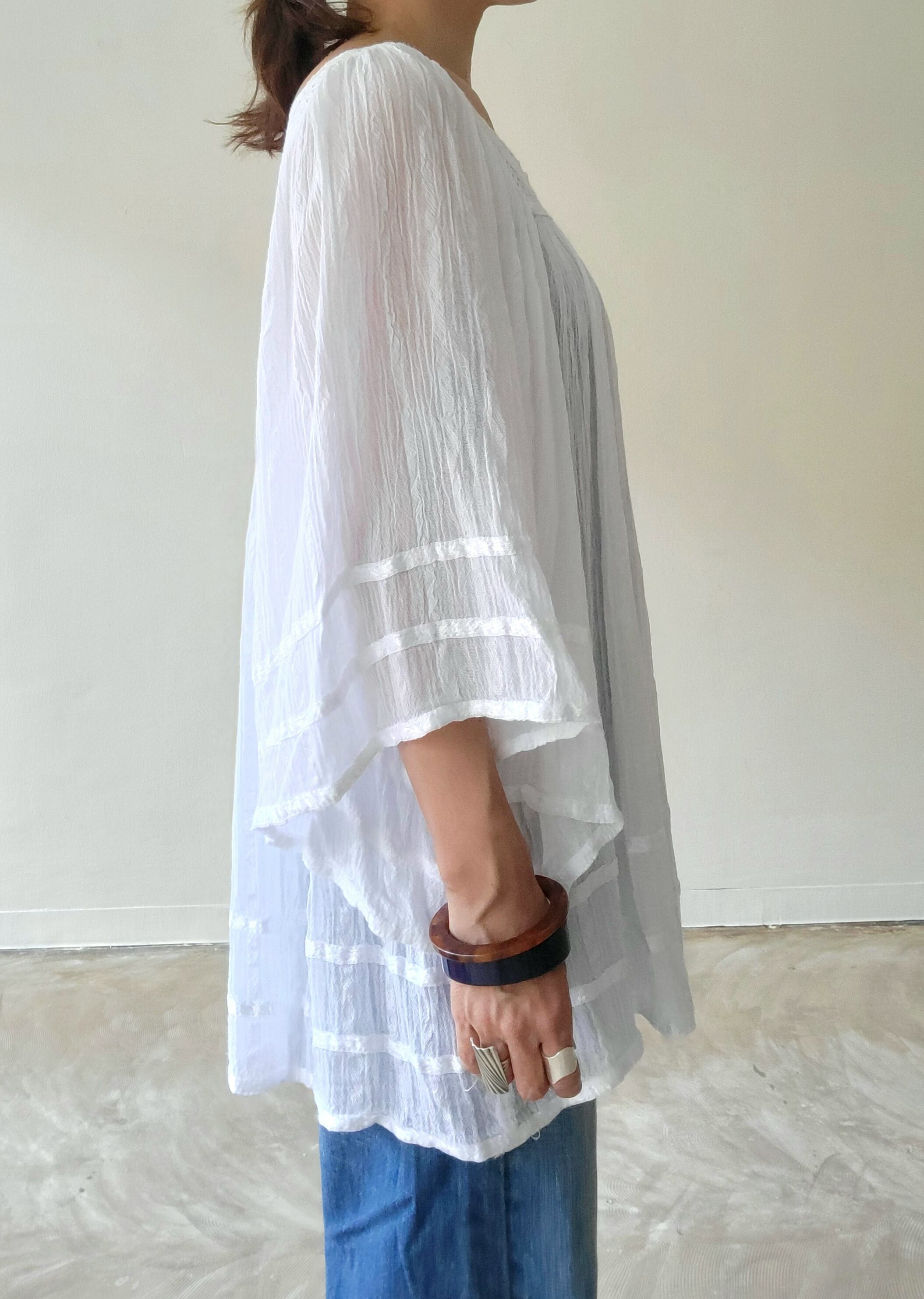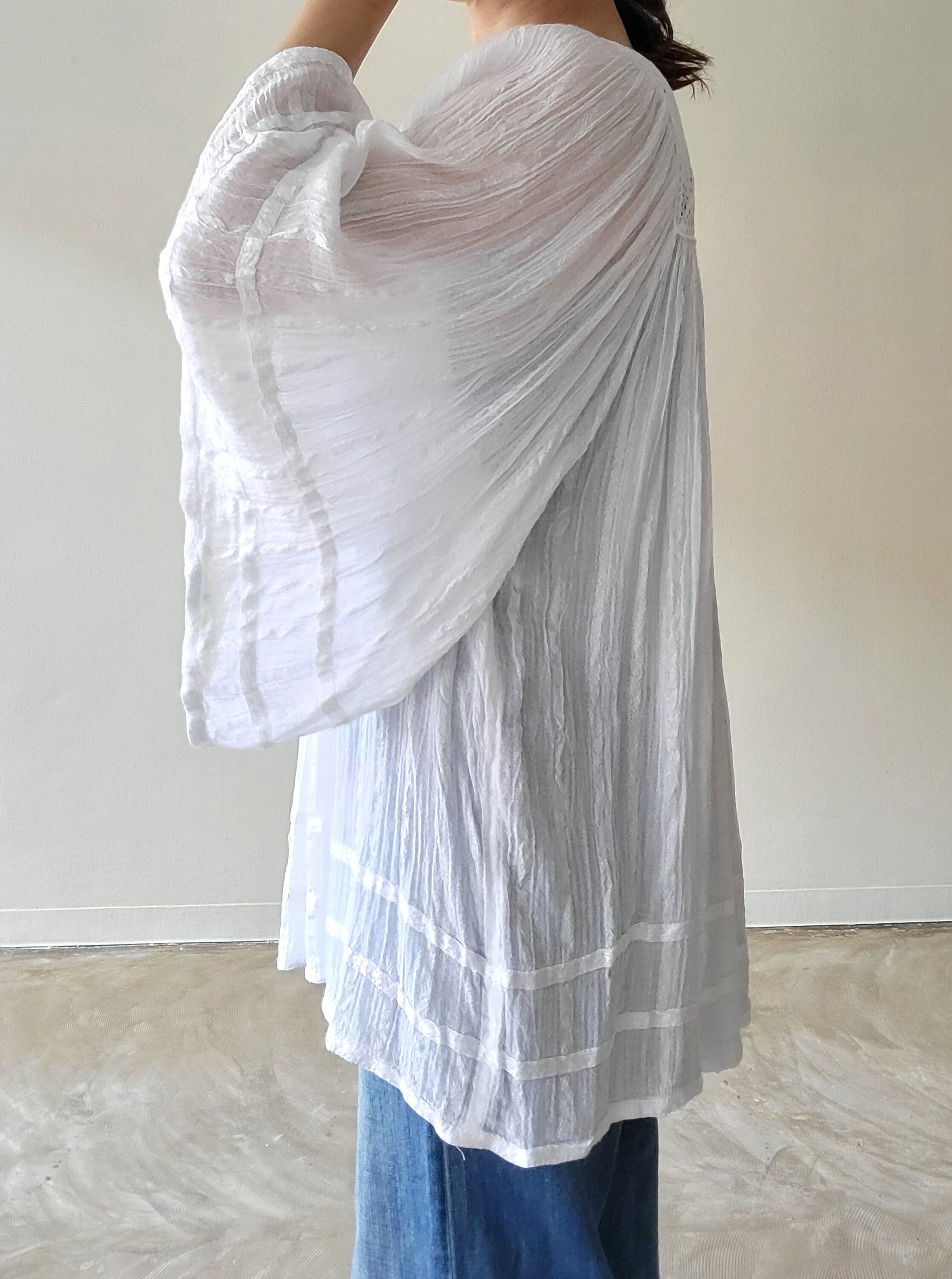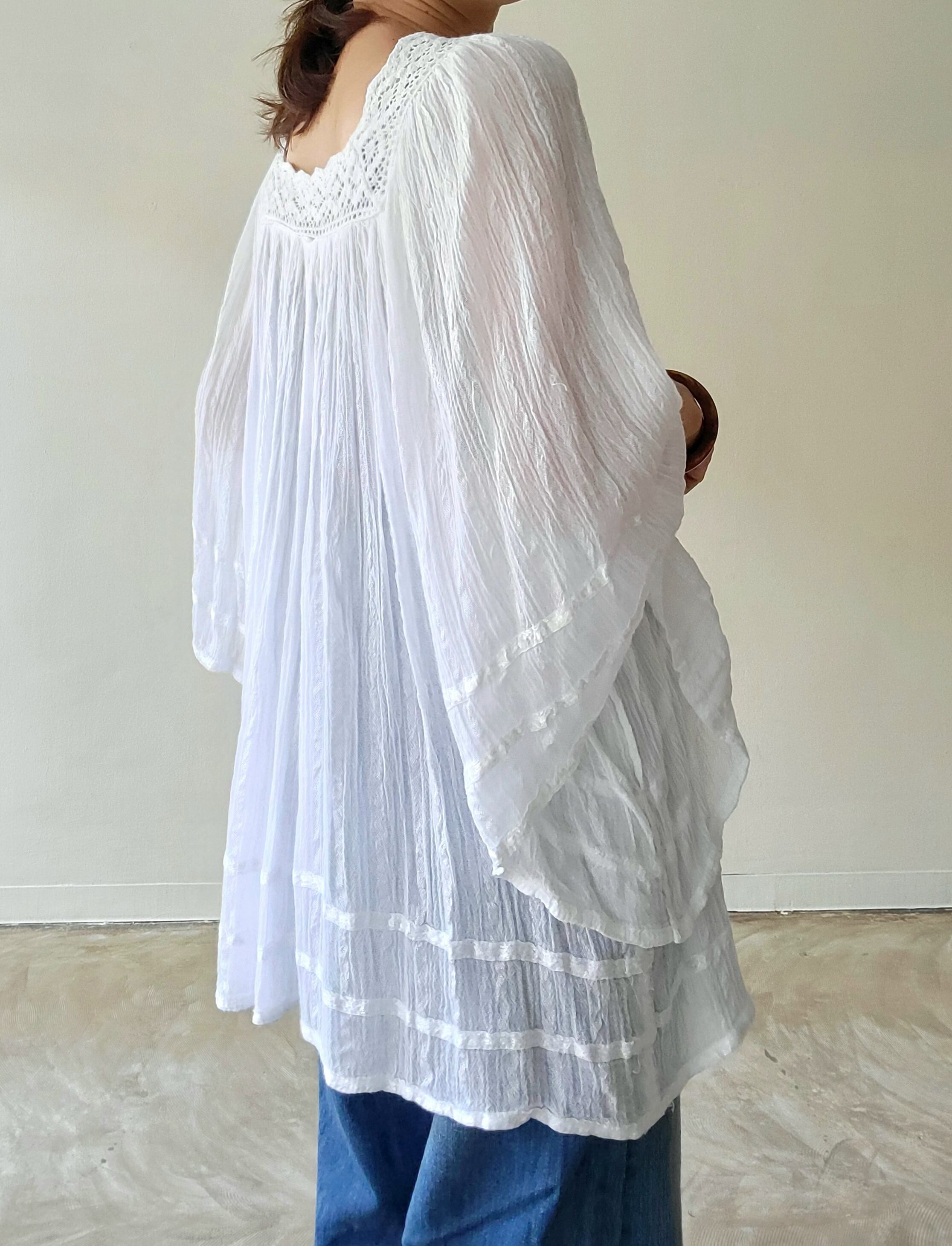 ヴィンテージのコットンガーゼチュニック。肌触りの柔らかな気持ちの良いガーゼ生地をたっぷり使用しています。締め付け感無く風の通る涼しいデザイン。前後どちらでも着用できます。長めのチュニック丈で夏はカットオフデニムに合わせるのもおすすめです。
