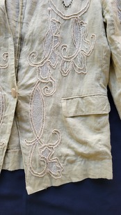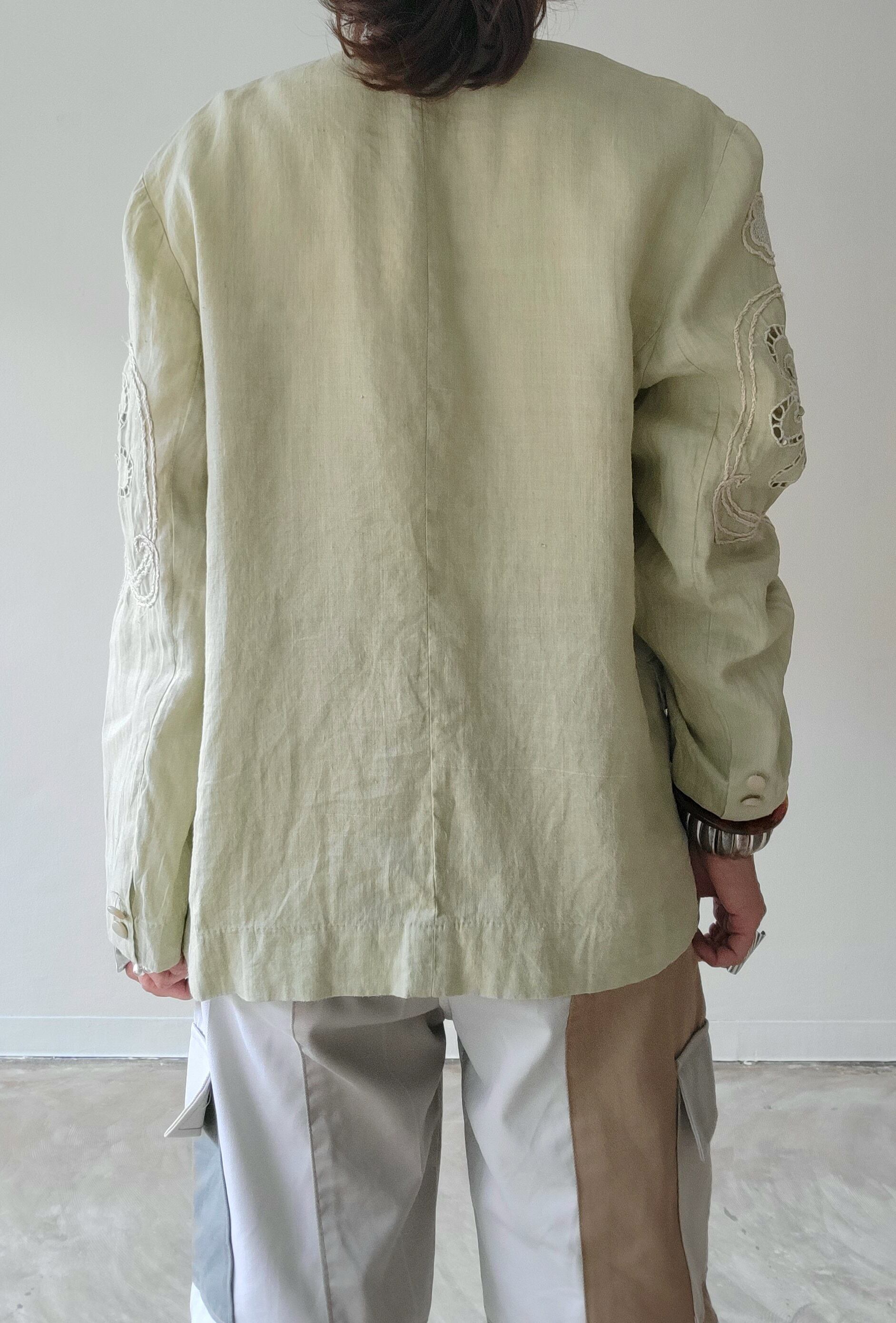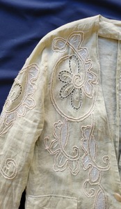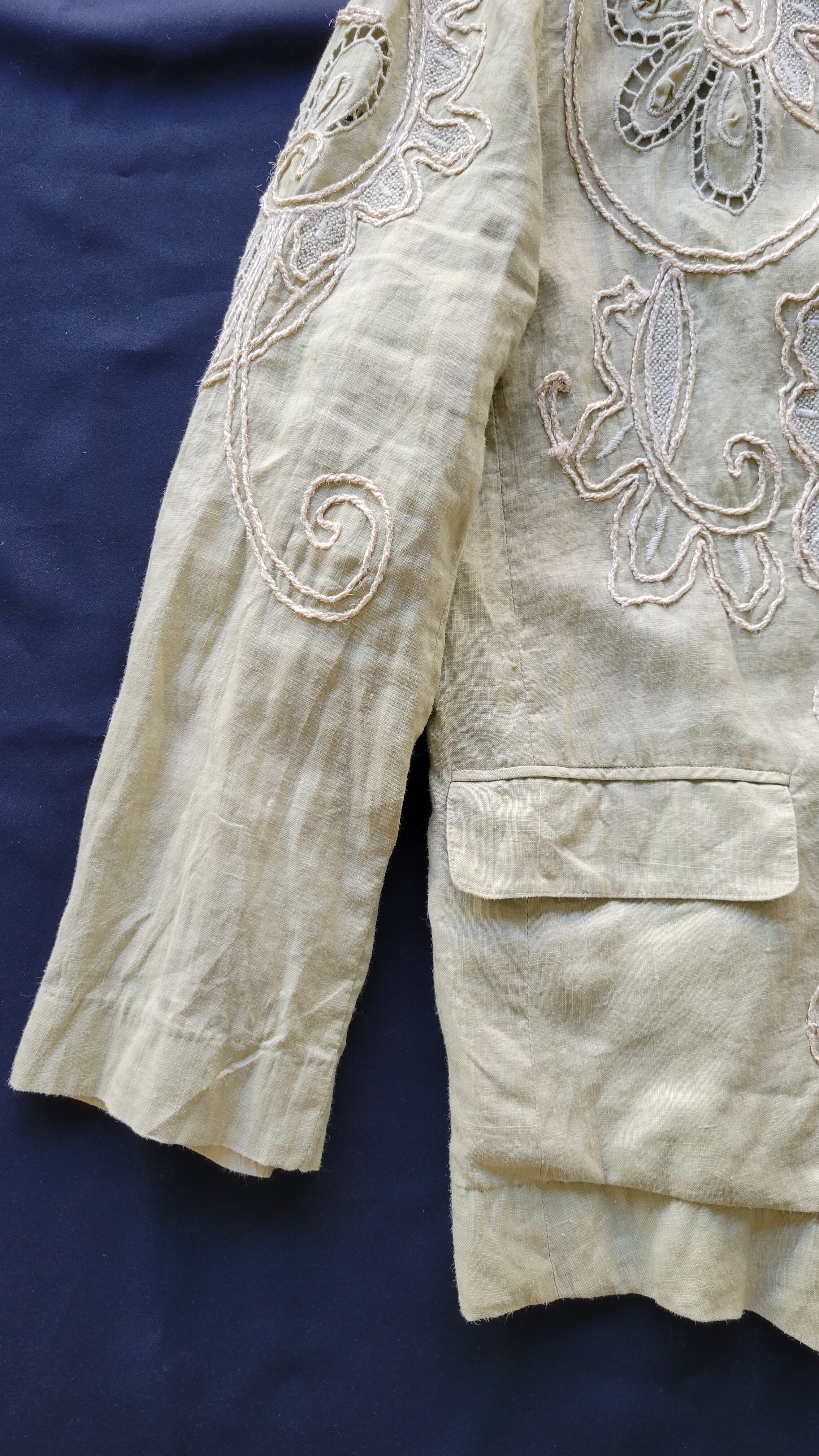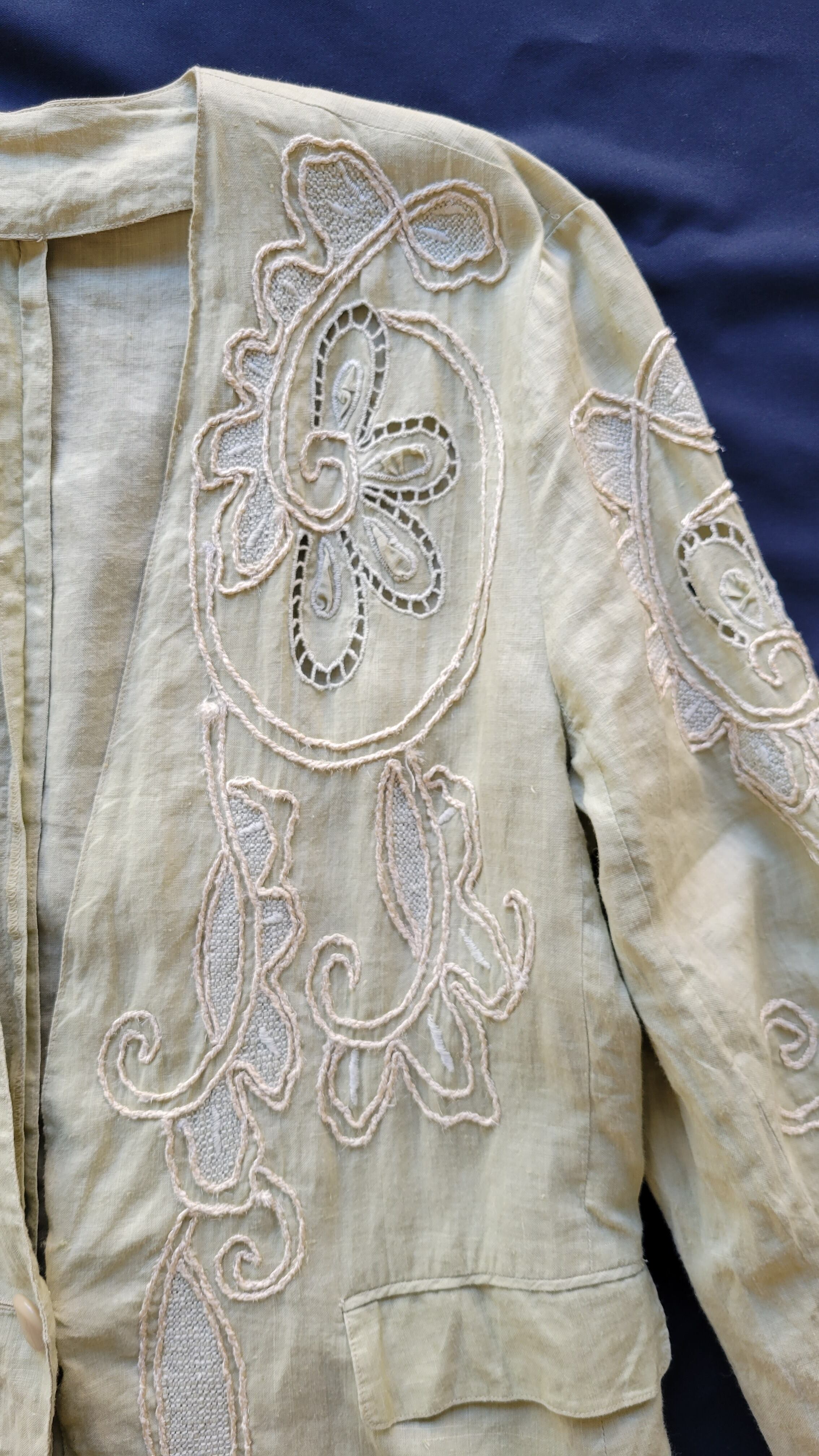 ヴィンテージのリネンジャケット。軽くて通気が良く夏にも着られる薄手のリネン素材。肌馴染みの良いナチュラルカラーに同系色の刺繍が華やかさを添えます。日常使いにぴったりなカジュアルジャケットです。