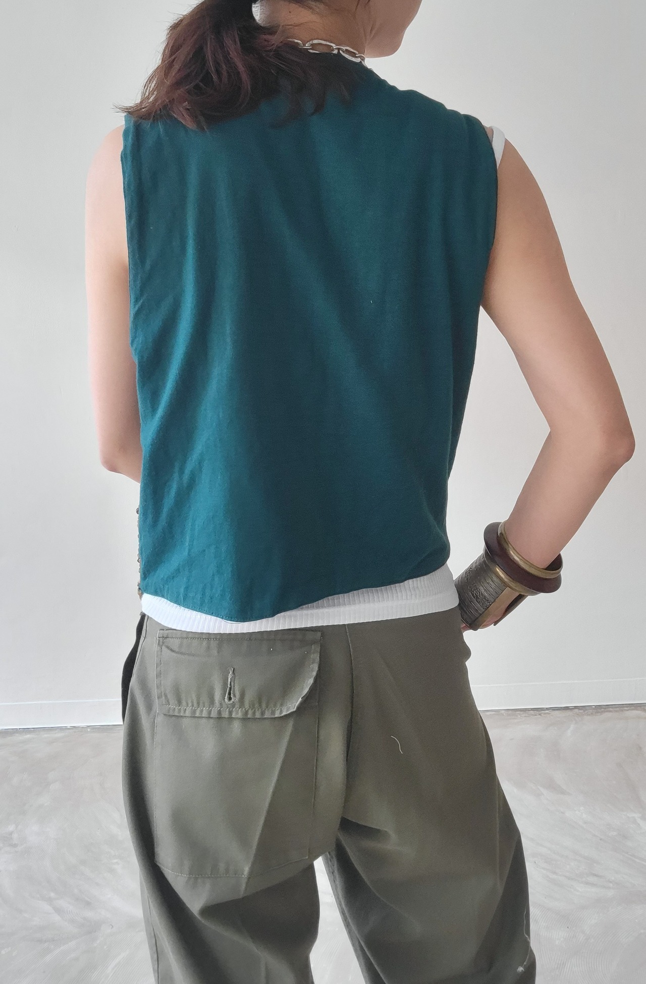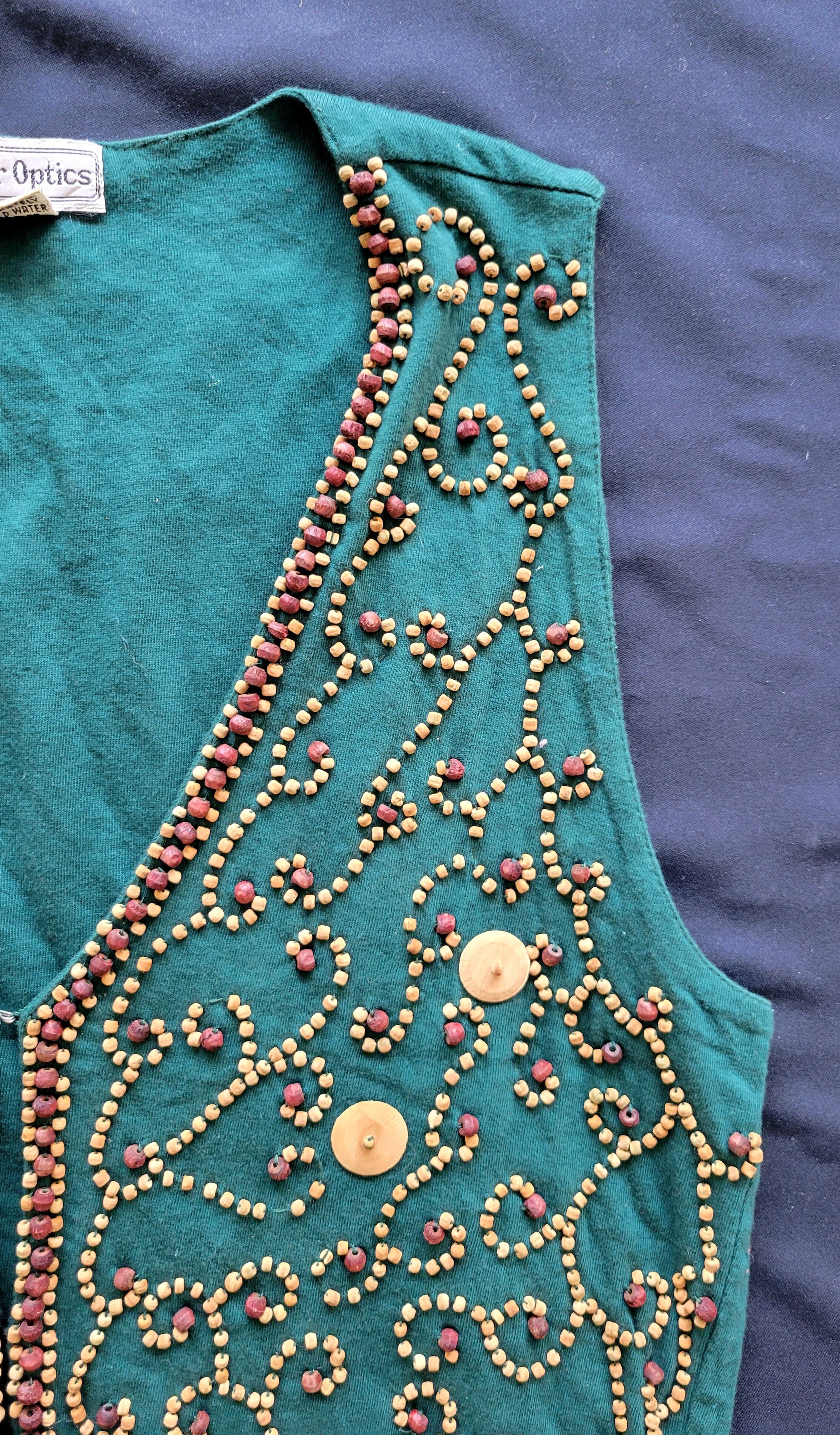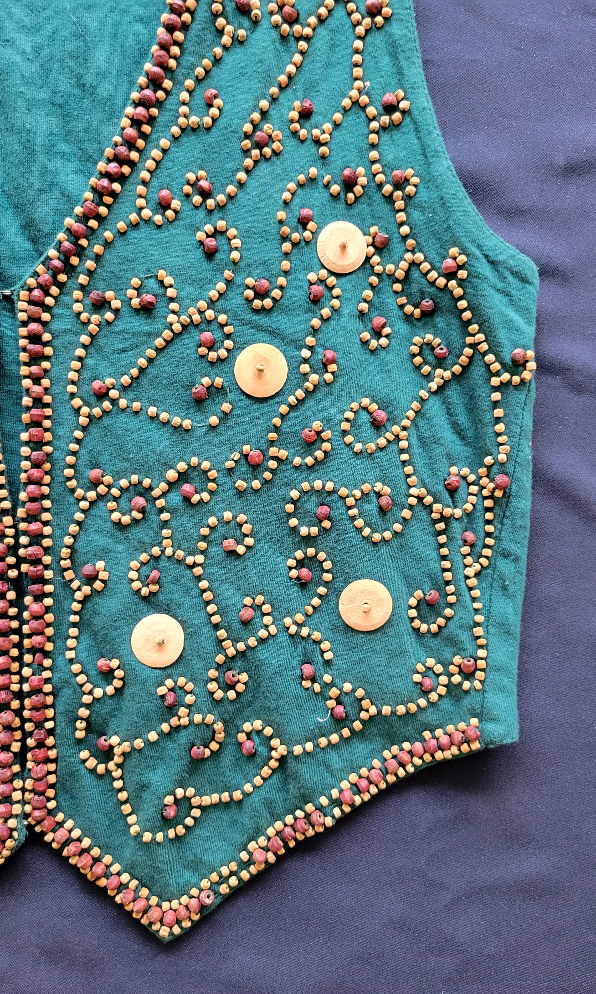 Made in India のヴィンテージベスト。素材はコットンジャージーでTシャツのような柔らかい素材です。ウッドビーズがびっしり縫い付けられており唯一無二の存在感です。パンツやスカート、ワンピースなど色んなアイテムにプラスしてお楽しみいただけます。