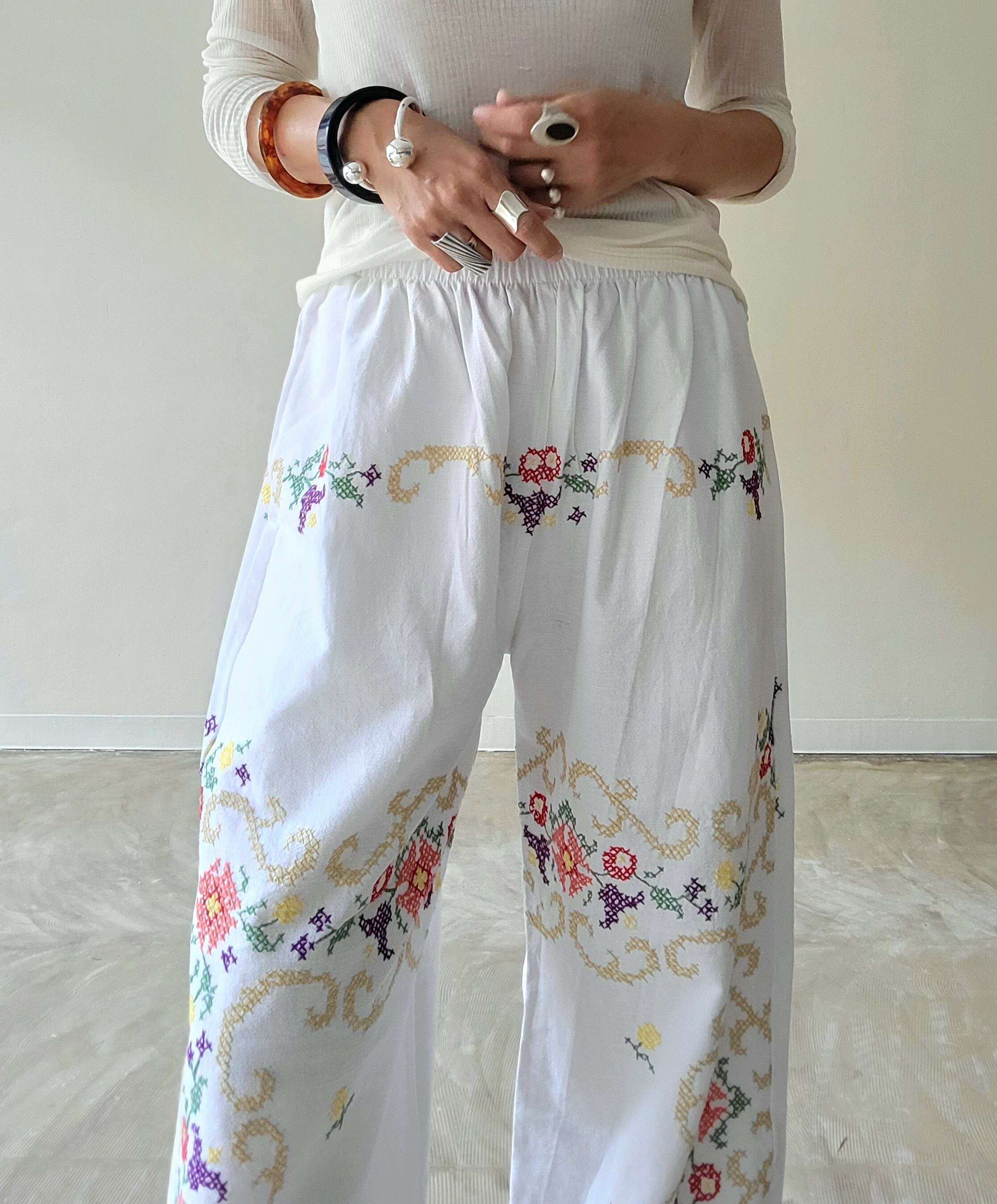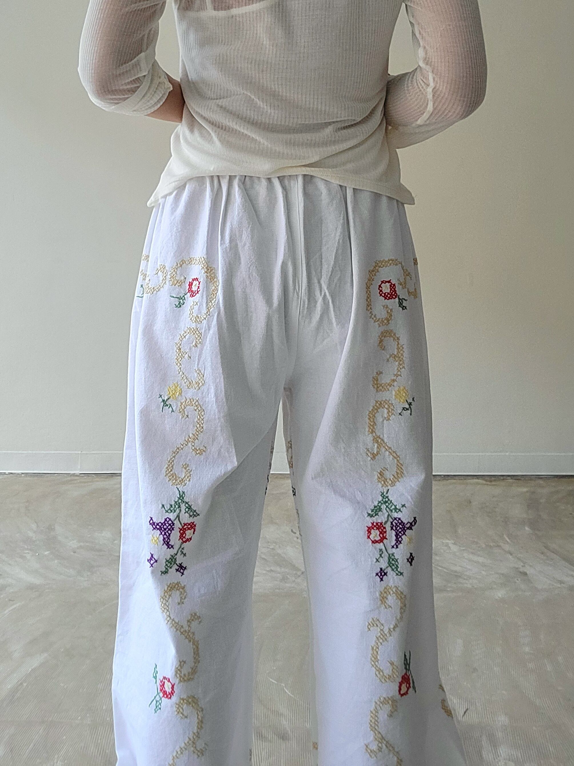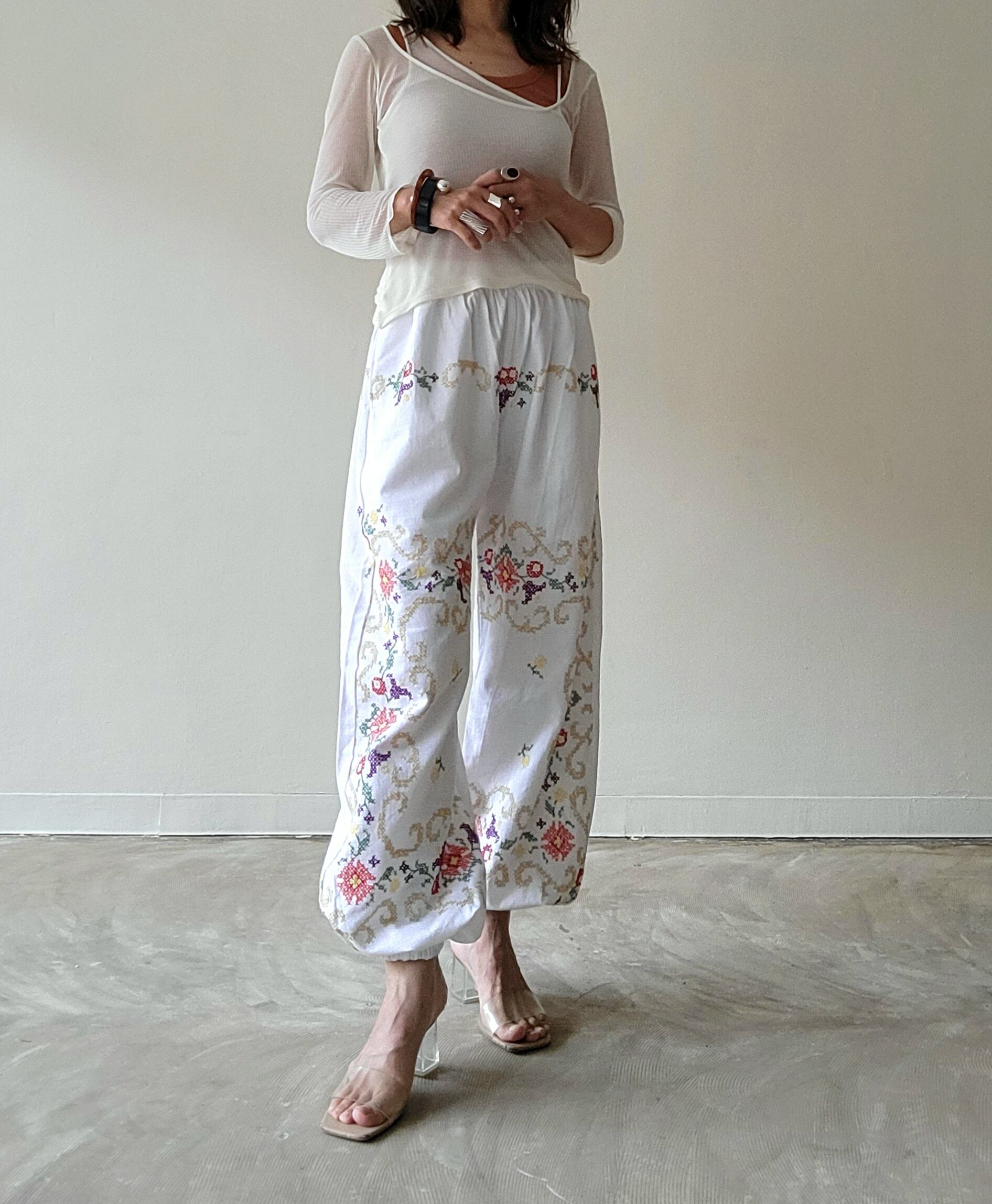 ヴィンテージの刺繍入りテーブルクロスを使用したリメイクパンツ。刺繍は手刺繍、素材は張りのあるしっかりめのコットンです。ウエストと裾はゴム仕様、左右シームポケット付きです。足首に生地がたまるシルエットが可愛らしいパラシュートパンツです。