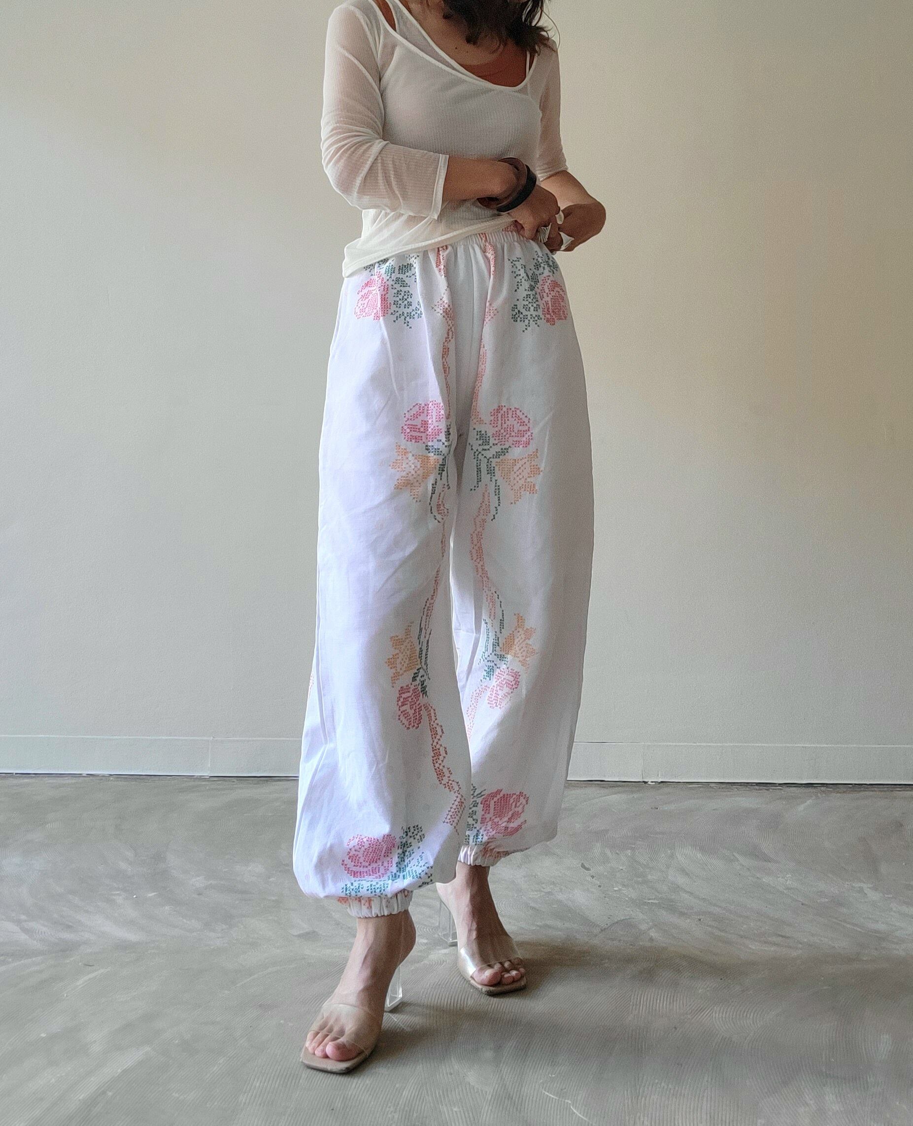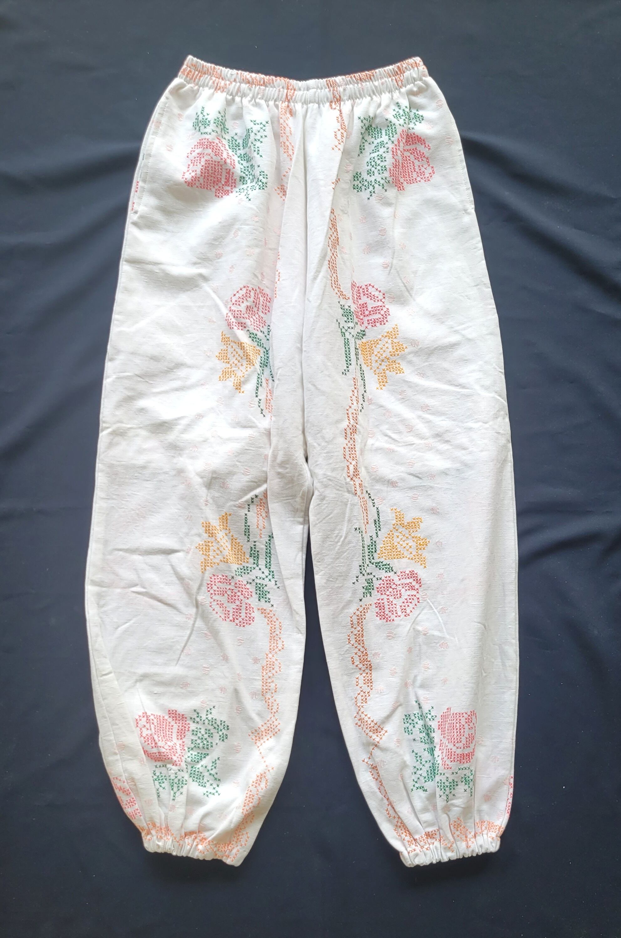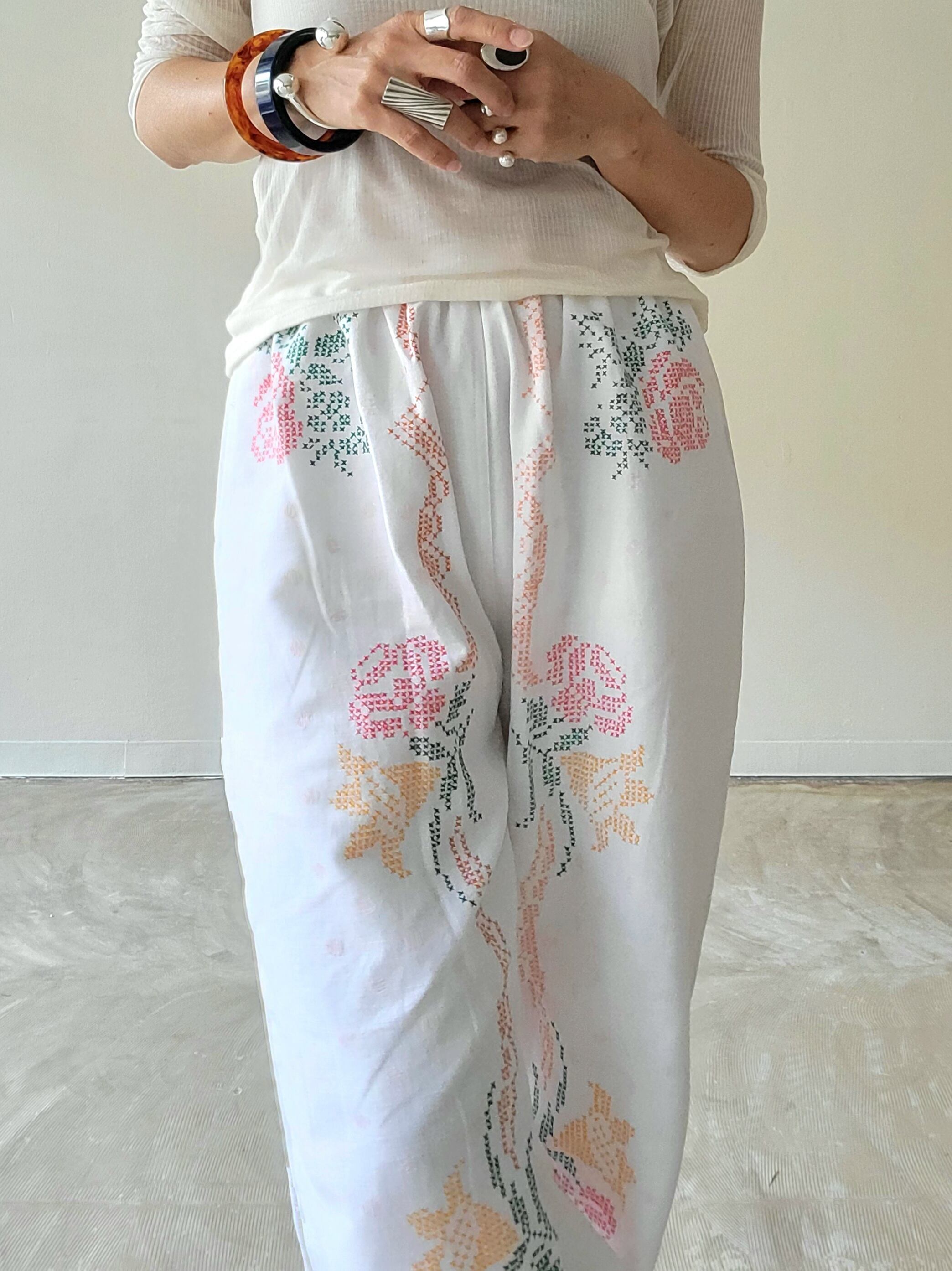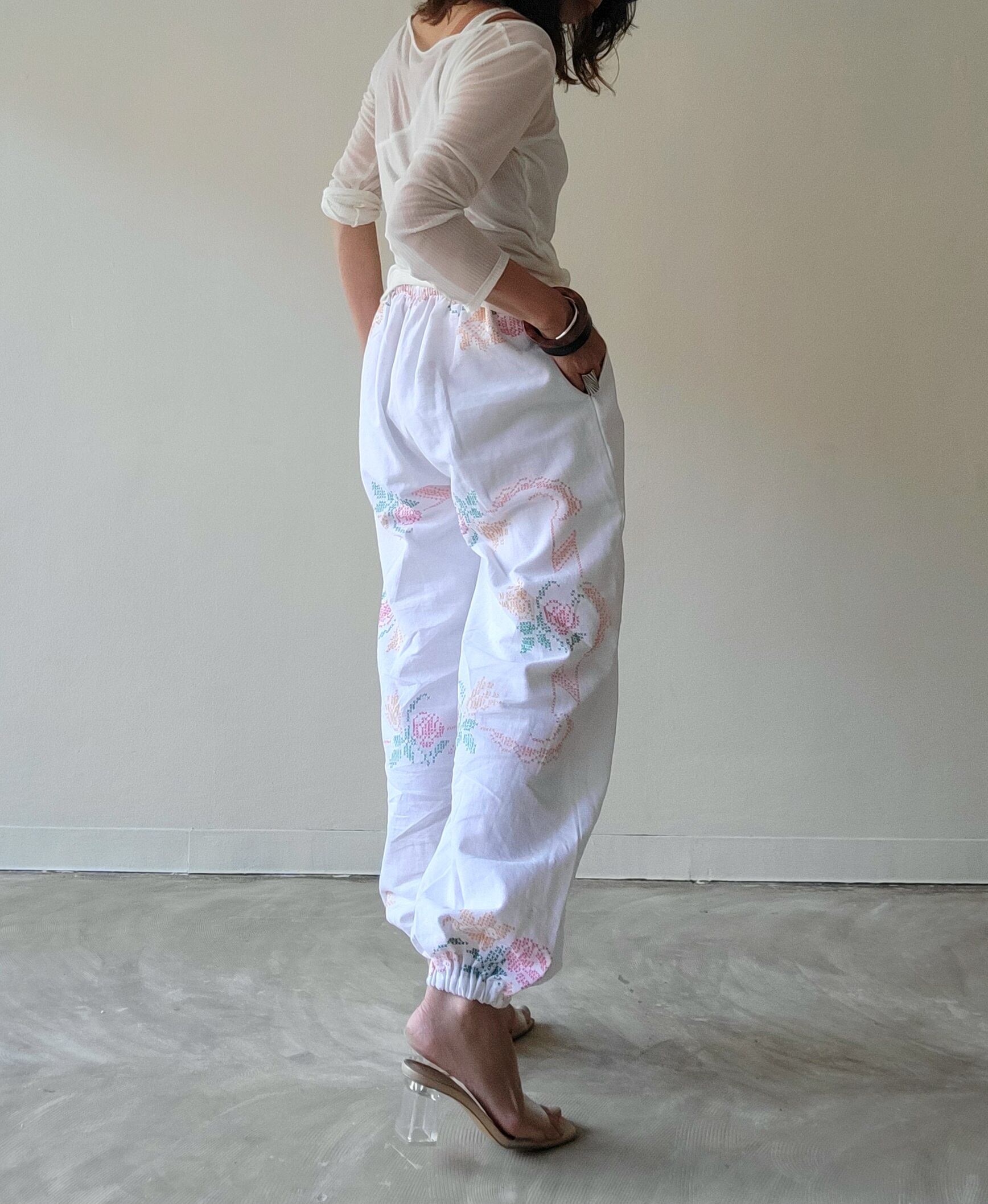 ヴィンテージの刺繍入りテーブルクロスを使用したリメイクパンツ。刺繍は手刺繍、素材は張りのあるしっかりめのコットンです。膝上あたりまで裏地のペチコート付きです。ウエストと裾はゴム仕様、左右シームポケット付き。足首に生地がたまるシルエットが可愛らしいパラシュートパンツです。