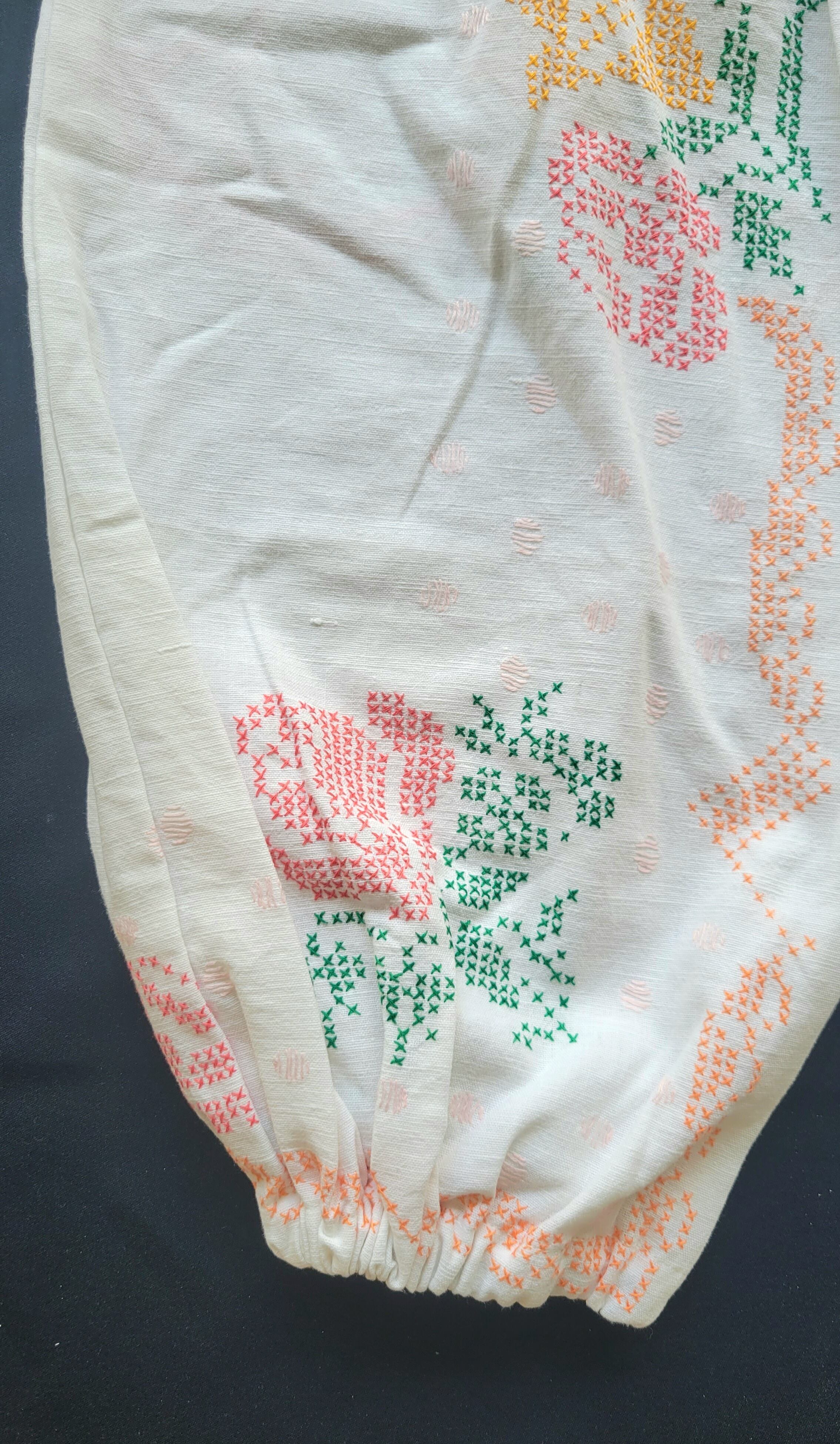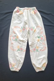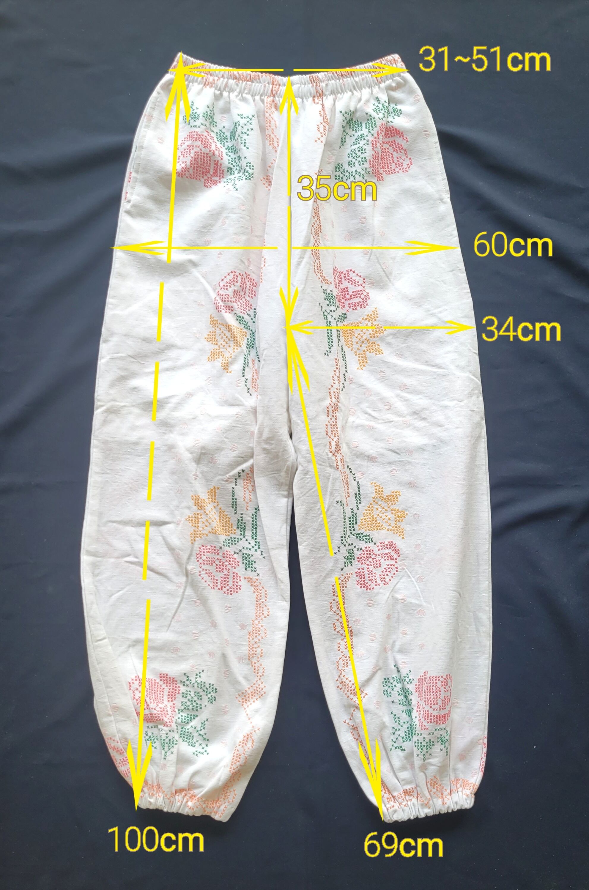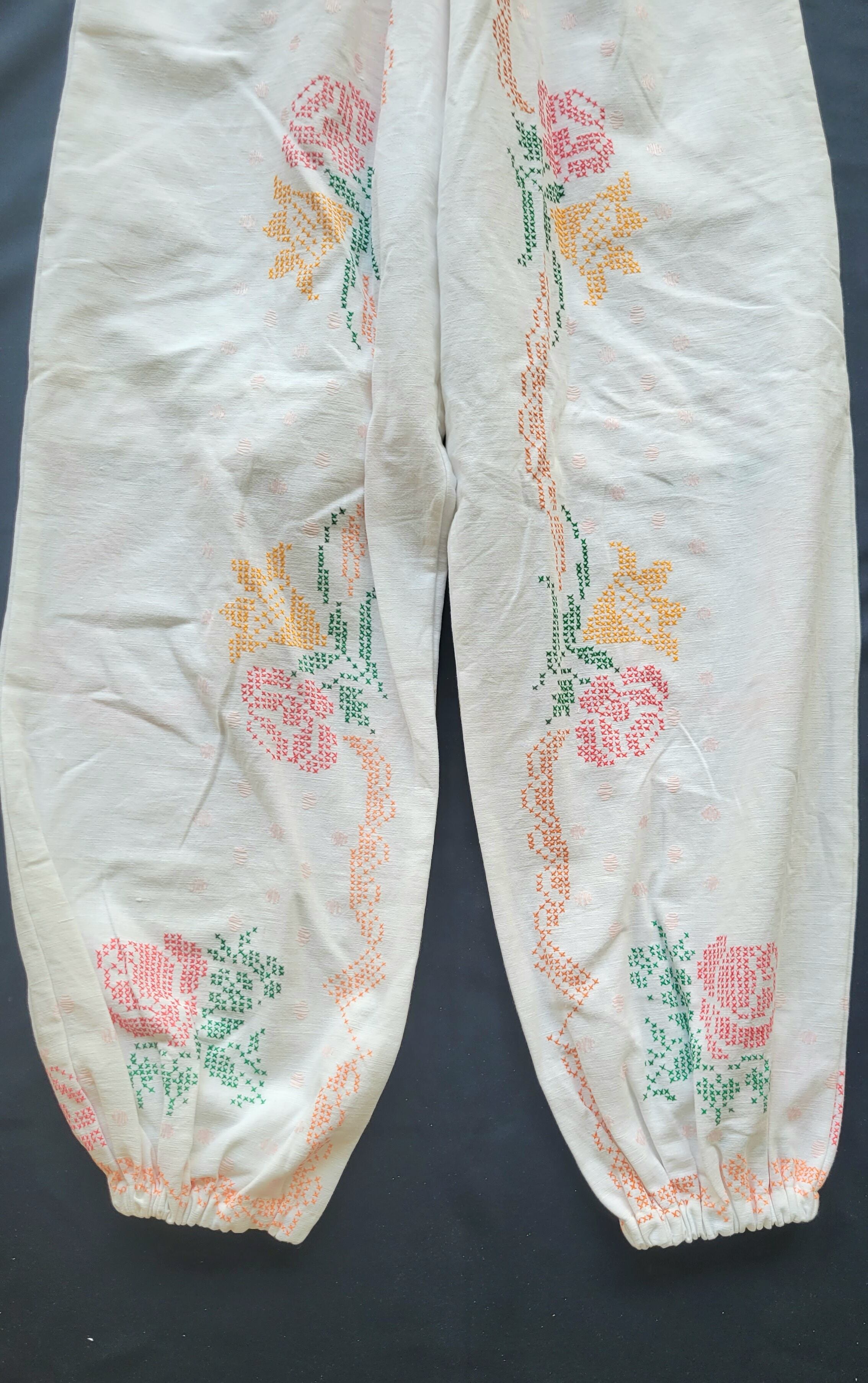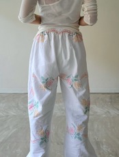 ヴィンテージの刺繍入りテーブルクロスを使用したリメイクパンツ。刺繍は手刺繍、素材は張りのあるしっかりめのコットンです。膝上あたりまで裏地のペチコート付きです。ウエストと裾はゴム仕様、左右シームポケット付き。足首に生地がたまるシルエットが可愛らしいパラシュートパンツです。
