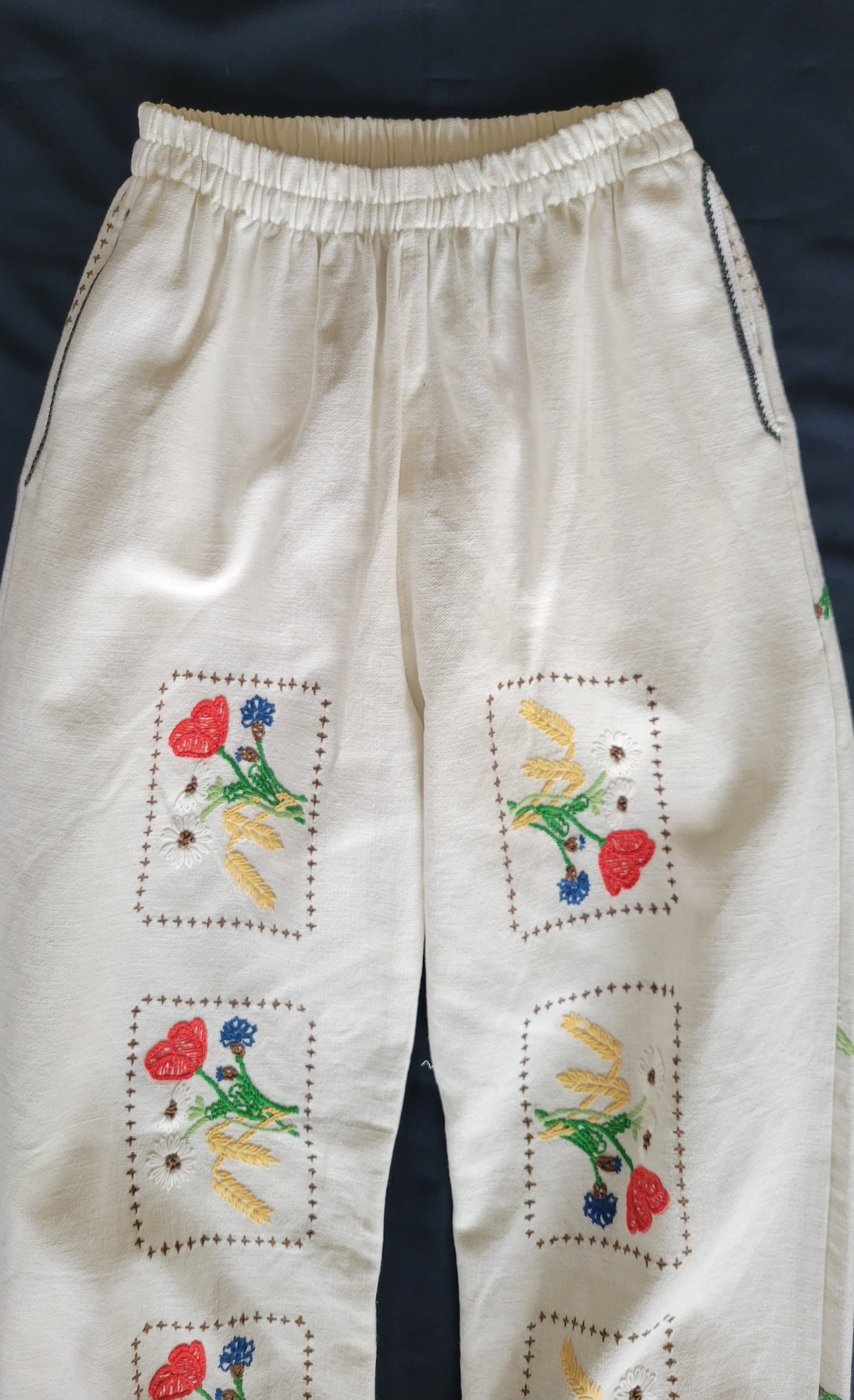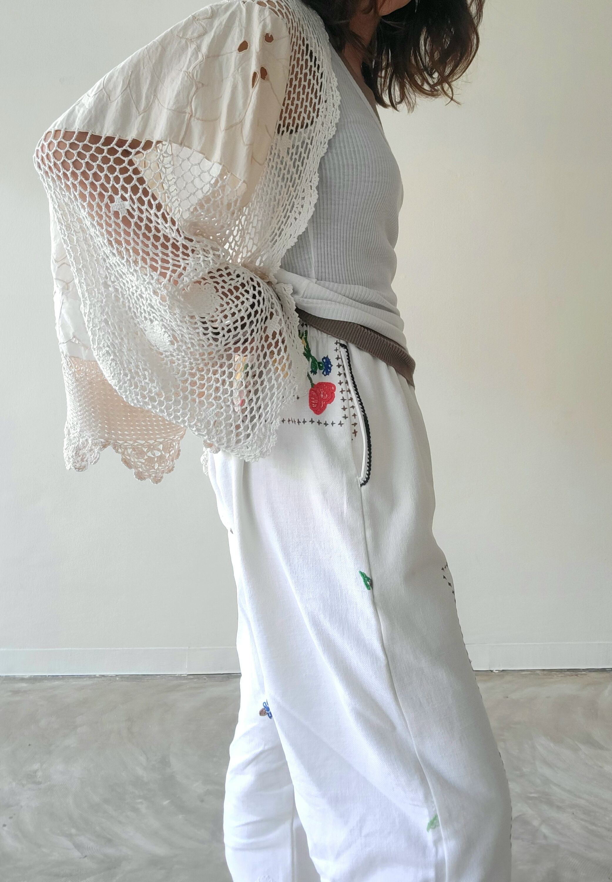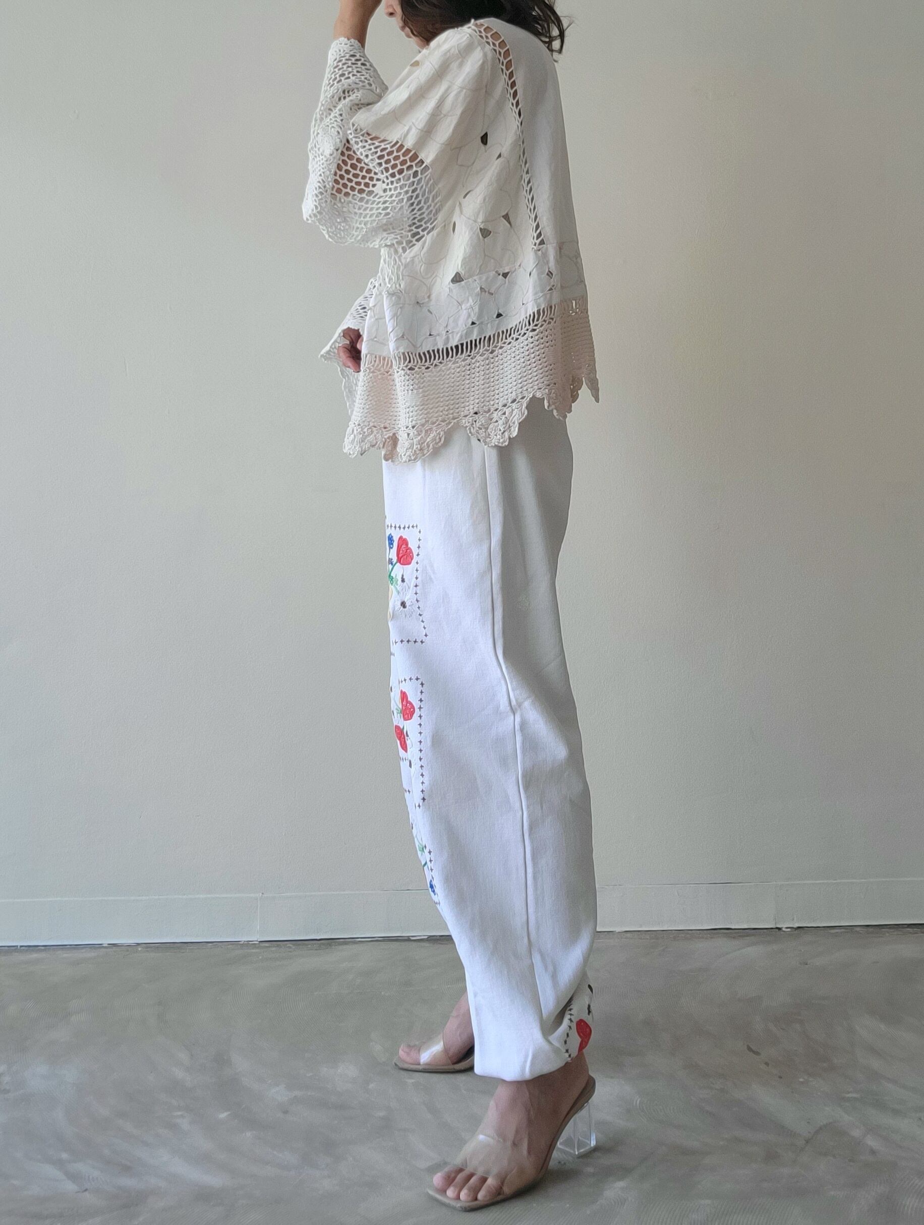 ヴィンテージの刺繍入りテーブルクロスを使用したリメイクパンツ。刺繍は手刺繍、素材は張りのあるしっかりめのコットンです。ウエストと裾はゴム仕様、左右シームポケット付き。足首に生地がたまるシルエットが可愛らしいパラシュートパンツです。