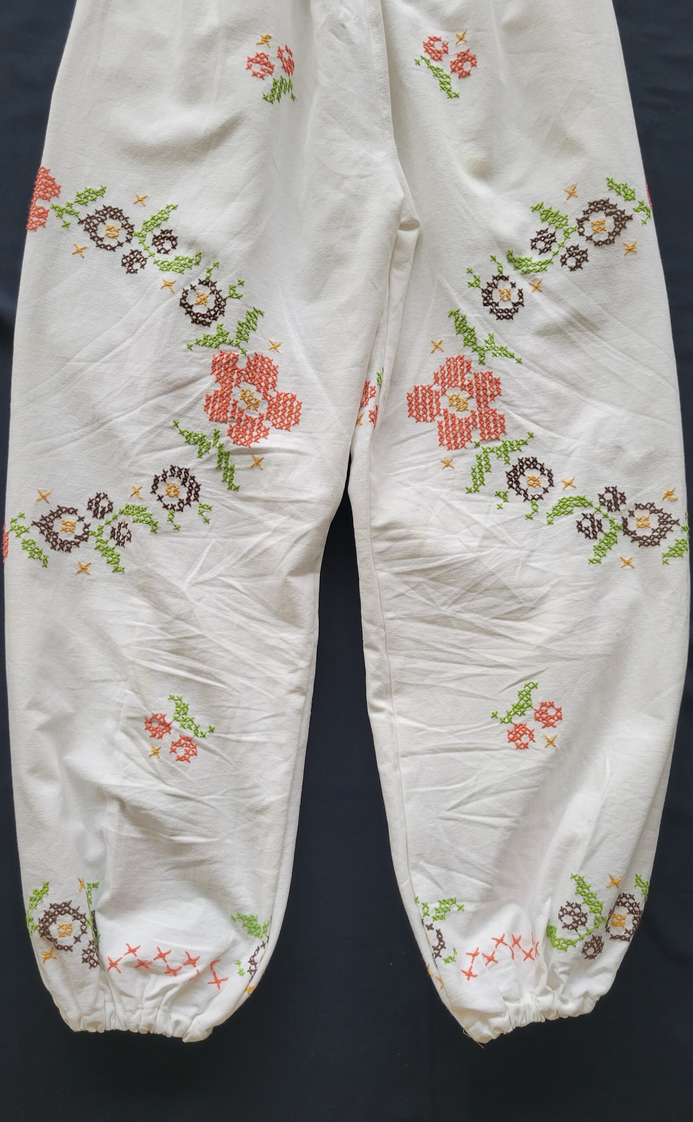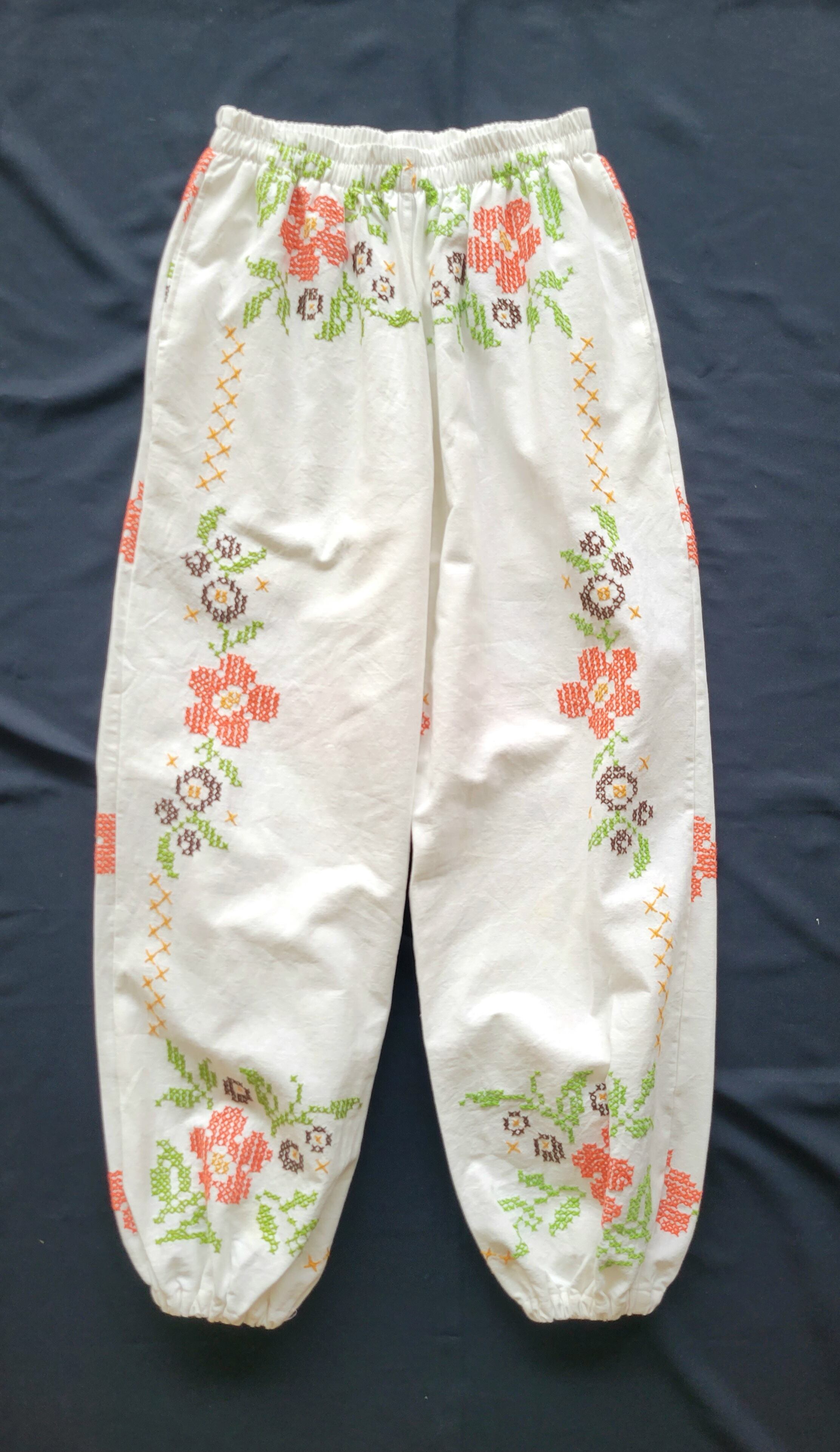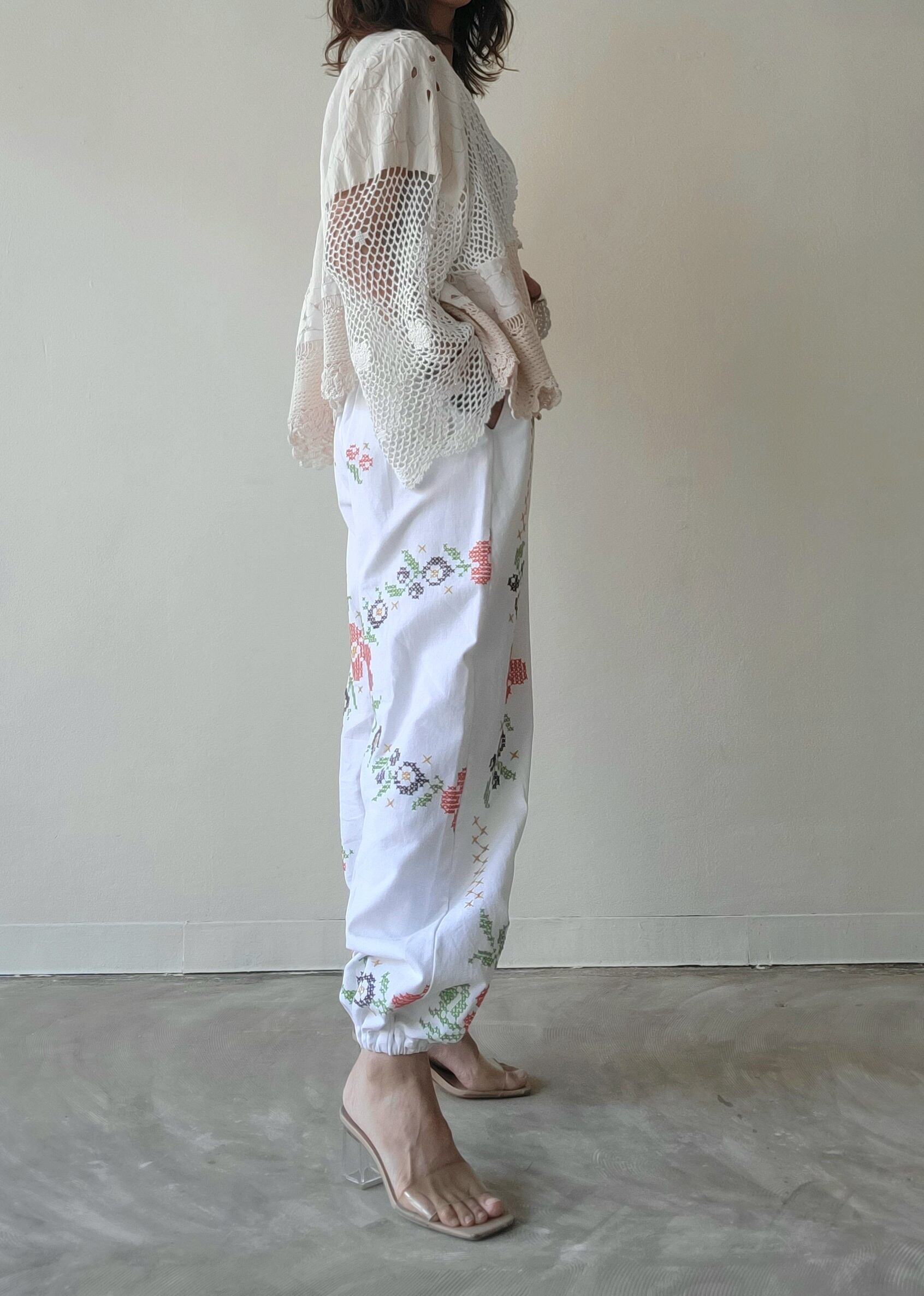 ヴィンテージの刺繍入りテーブルクロスを使用したリメイクパンツ。刺繍は手刺繍、素材は張りのあるしっかりめのコットンです。ウエストと裾はゴム仕様、左右シームポケット付き。足首に生地がたまるシルエットが可愛らしいパラシュートパンツです。