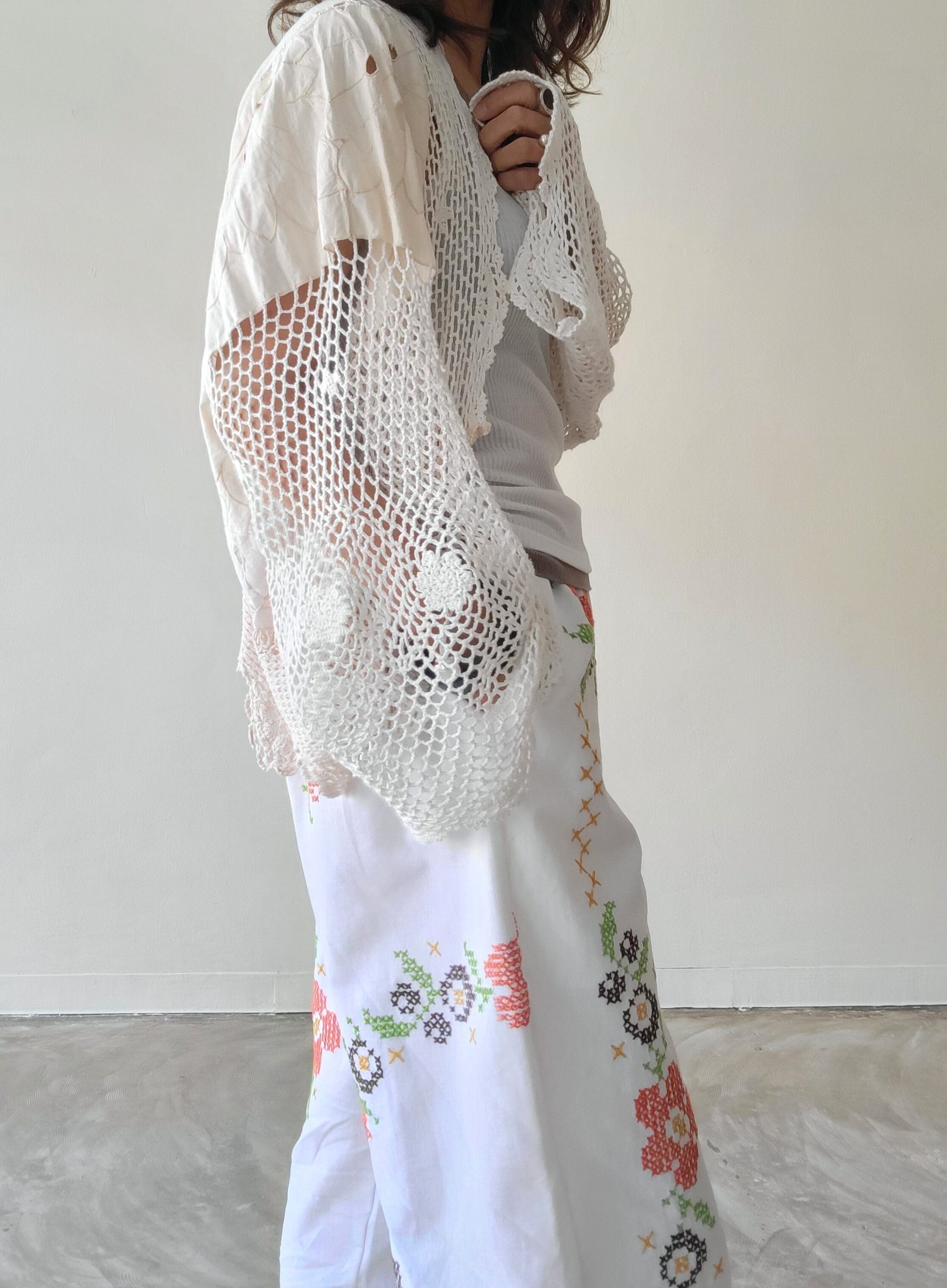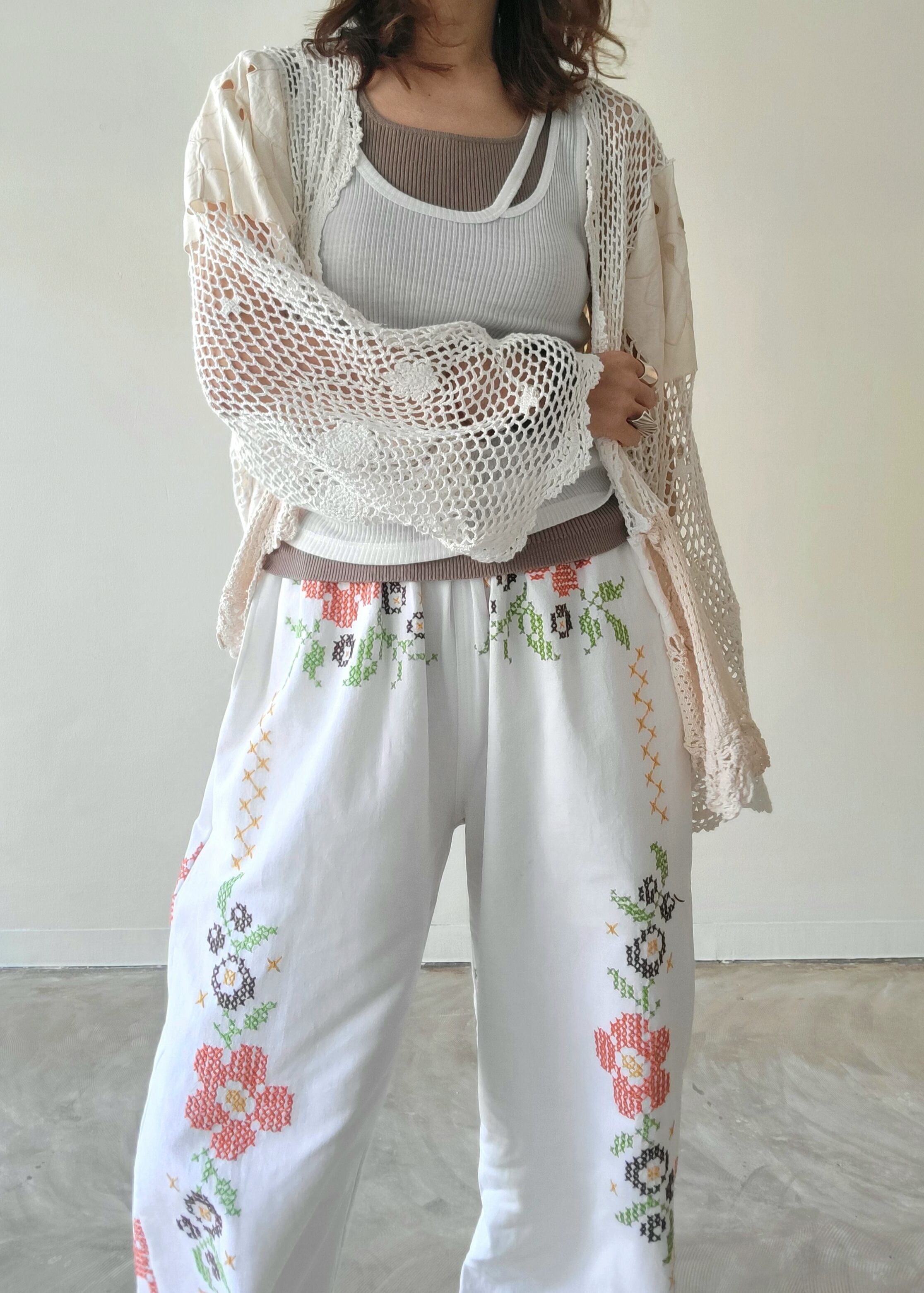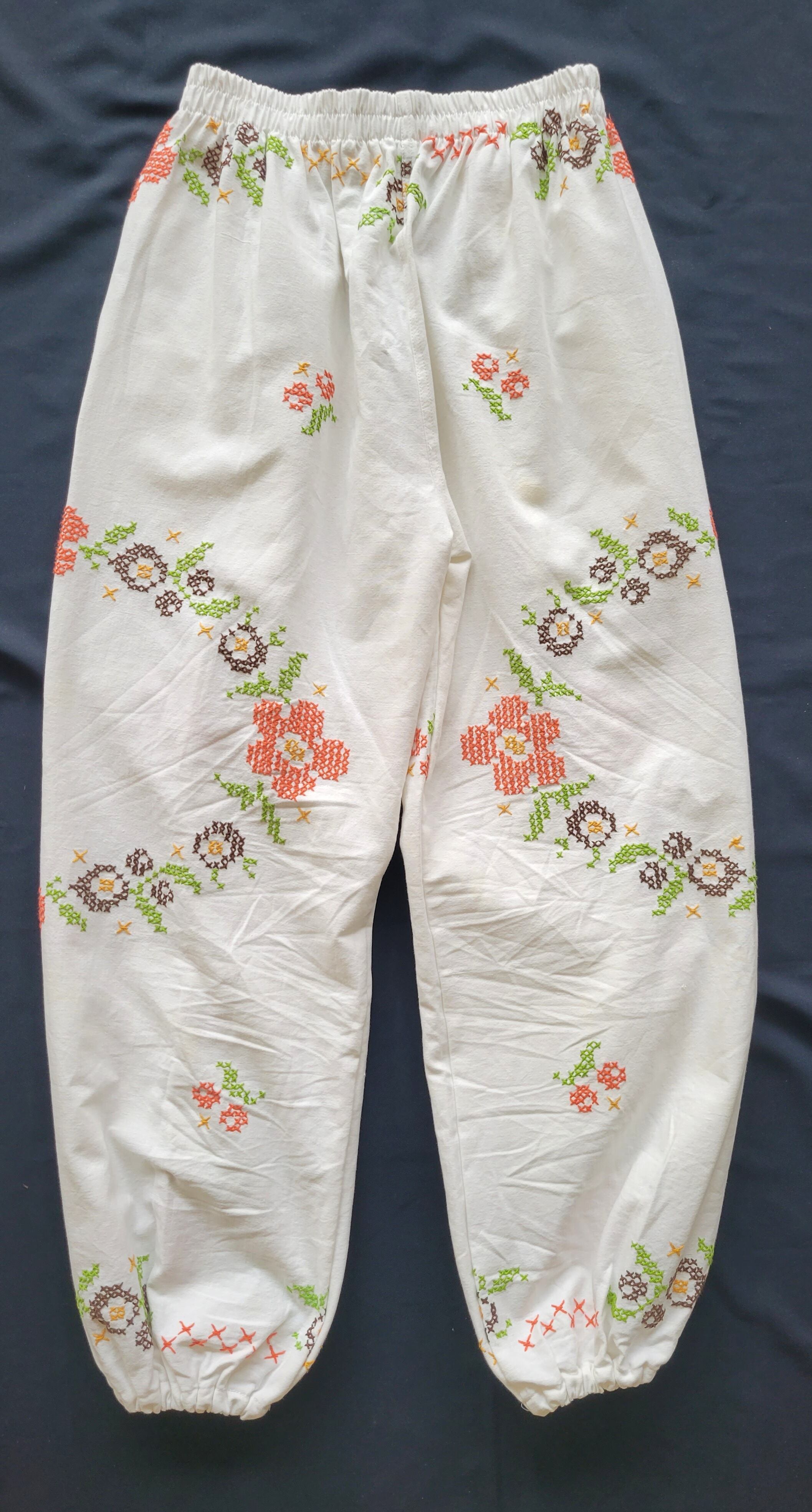ヴィンテージの刺繍入りテーブルクロスを使用したリメイクパンツ。刺繍は手刺繍、素材は張りのあるしっかりめのコットンです。ウエストと裾はゴム仕様、左右シームポケット付き。足首に生地がたまるシルエットが可愛らしいパラシュートパンツです。
