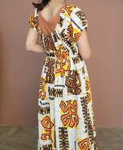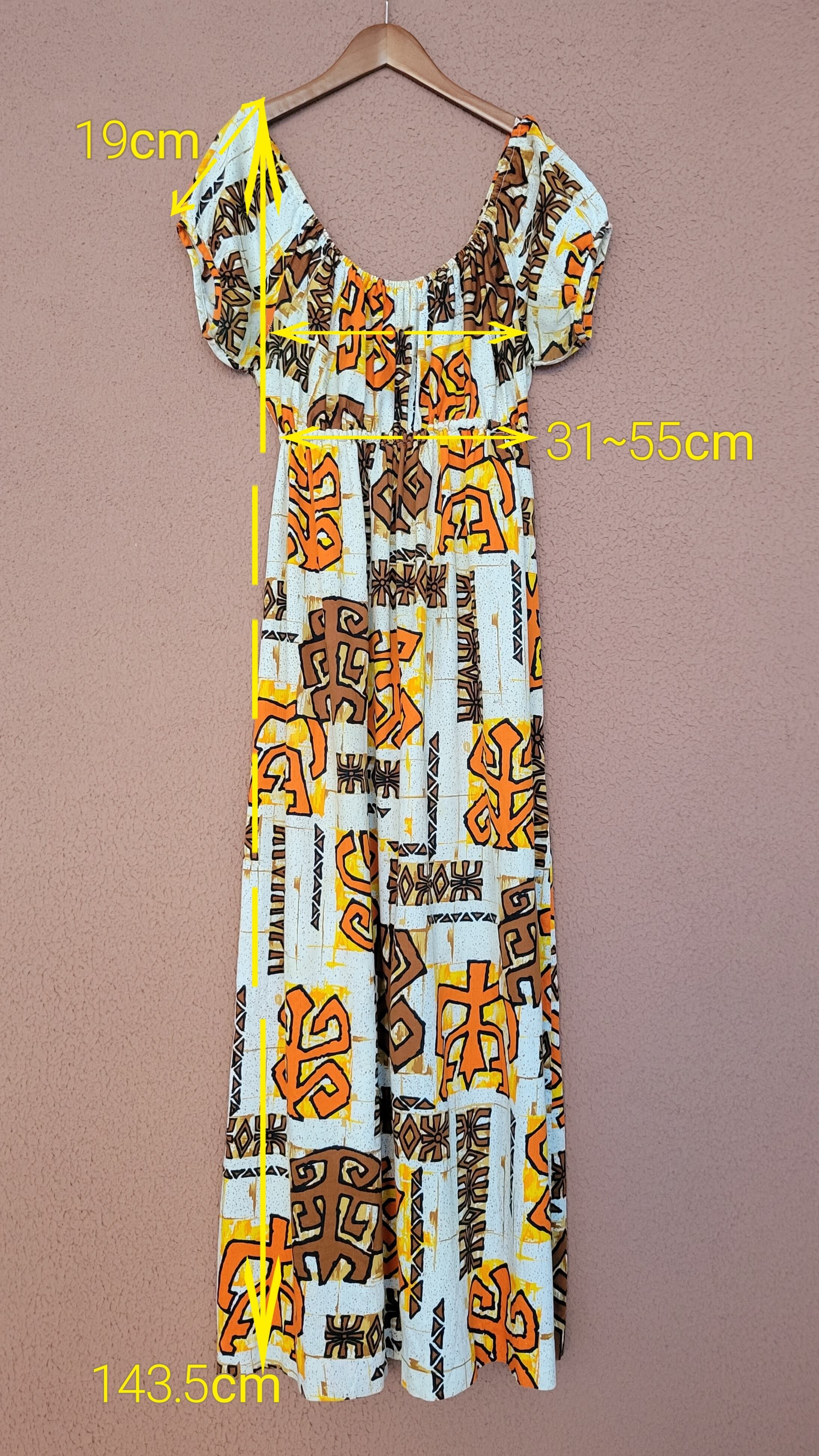 ヴィンテージのハワイアンマキシワンピース。素材表記はありませんがコットンです。首~背中にかけてのゴムが伸びており開きが広めです。バスト下にゴム入りのエンパイアシルエット。広がりすぎずすとんと落ちるシルエットでスタイルアップが叶います。大きく特徴的な柄で個性の光る1枚。