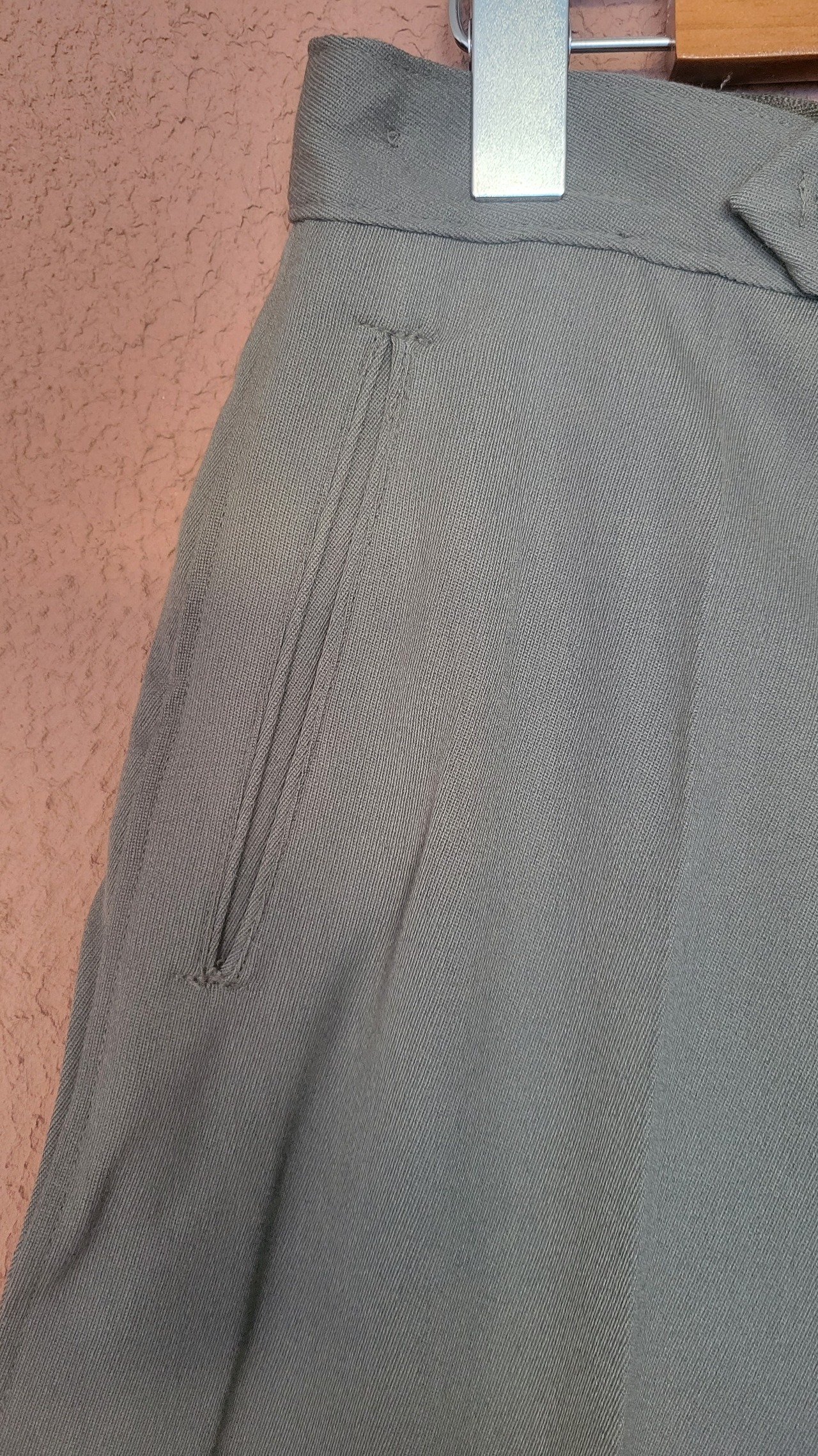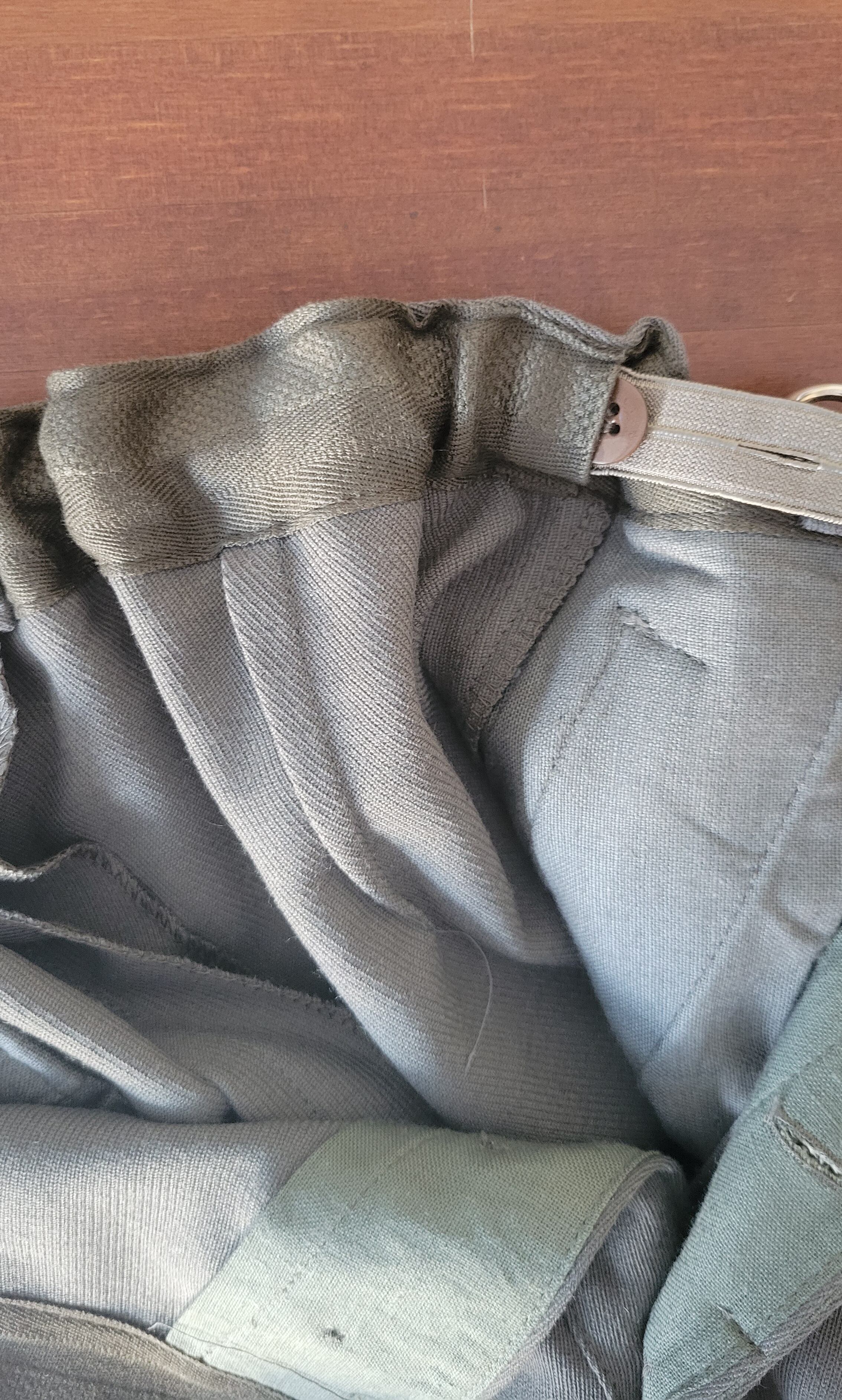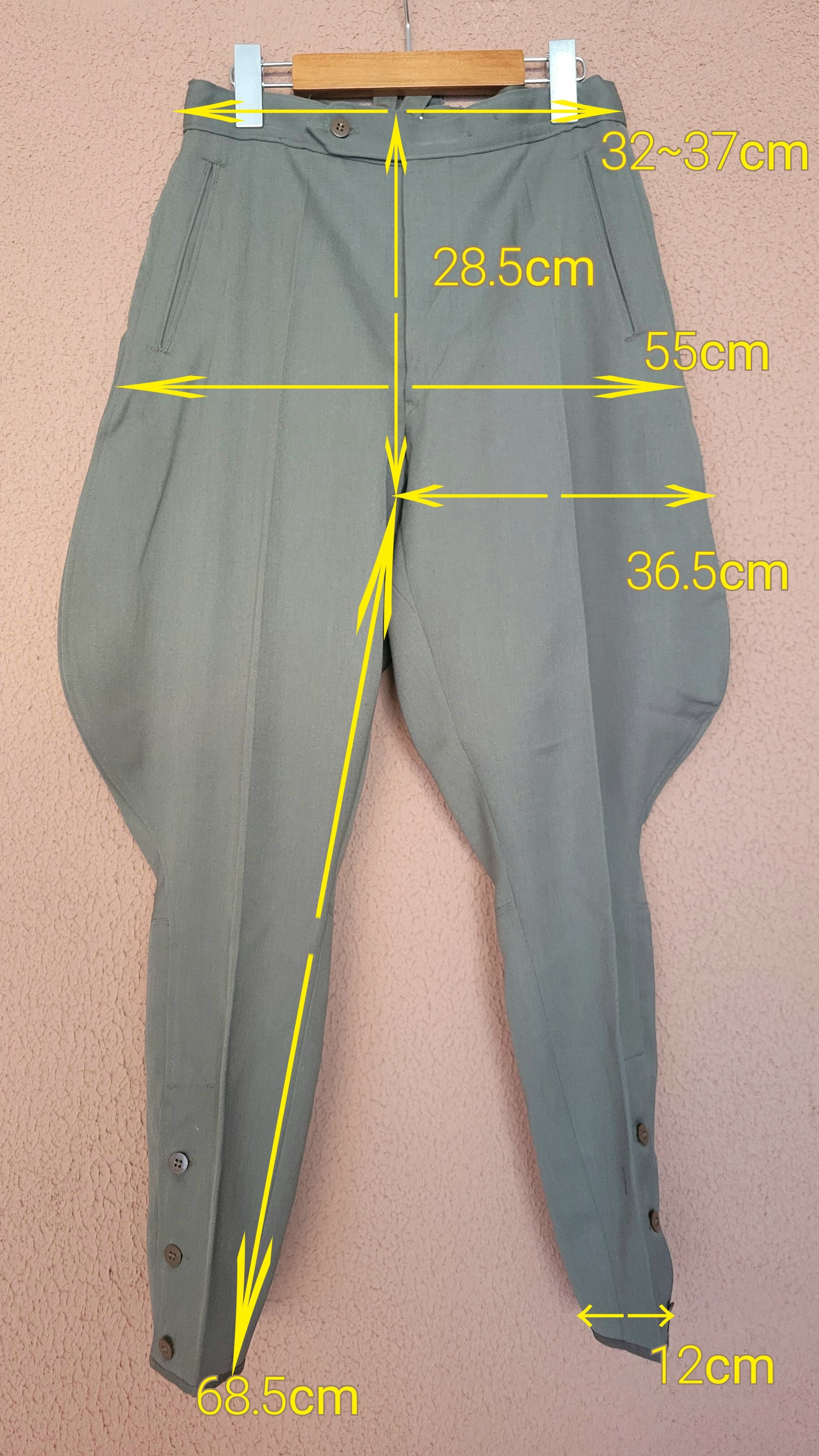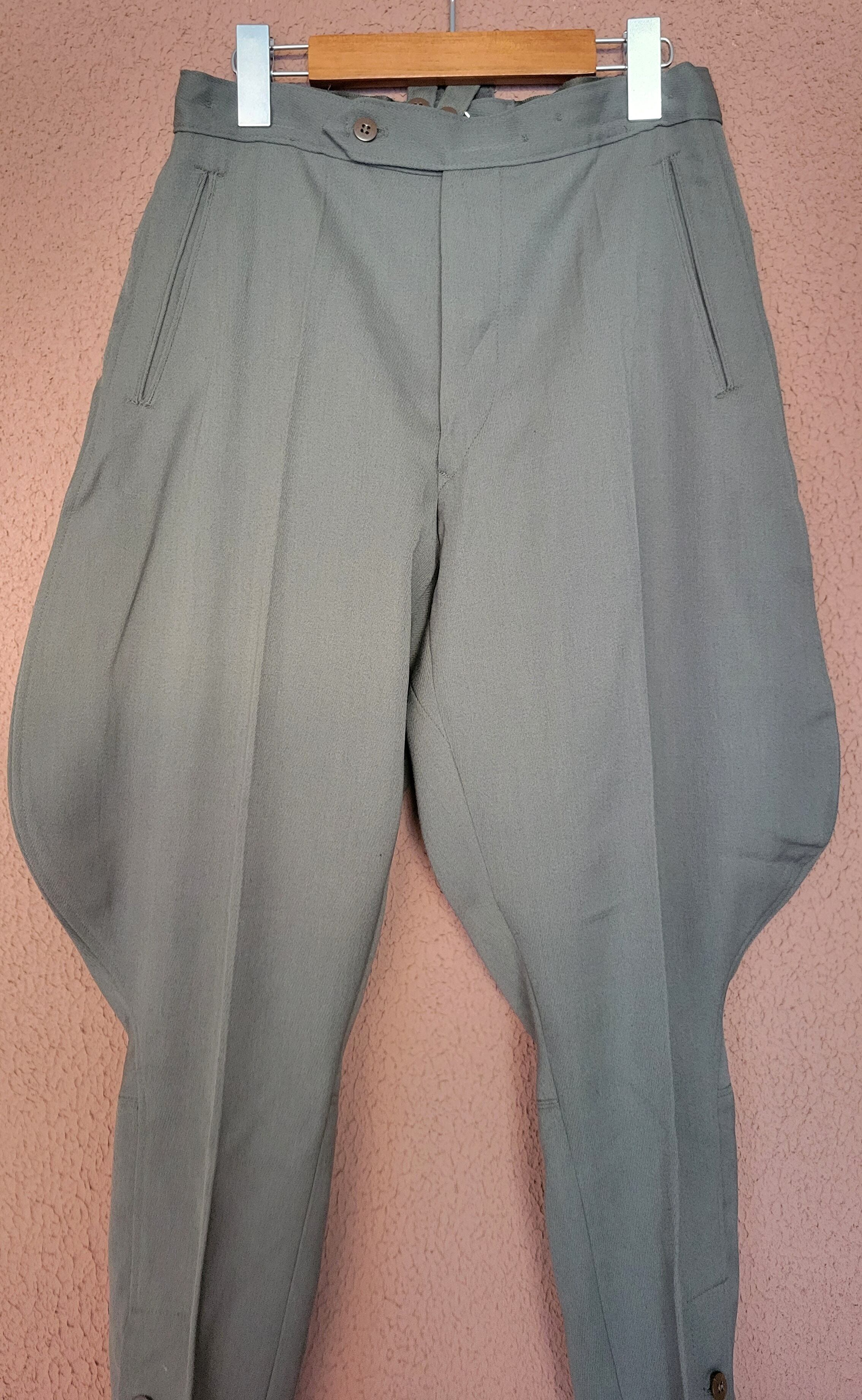 ヴィンテージのミリタリーライディングパンツ。素材表記はありませんがしっかりした強度のある素材で通年で着用できます。希少なレディースサイズ。さらにウエスト内側にサイズ調整用のゴムが付いています。左右ポケット+バックポケットの計3つのポケット付き。ウエストから膝まではたっぷりのボリューム、膝下から足首までは細くなるジョッパーズデザイン。ロングブーツとの相性も抜群です。バックに縫い付けられた紙タグは付いたままでのお届けとなります。