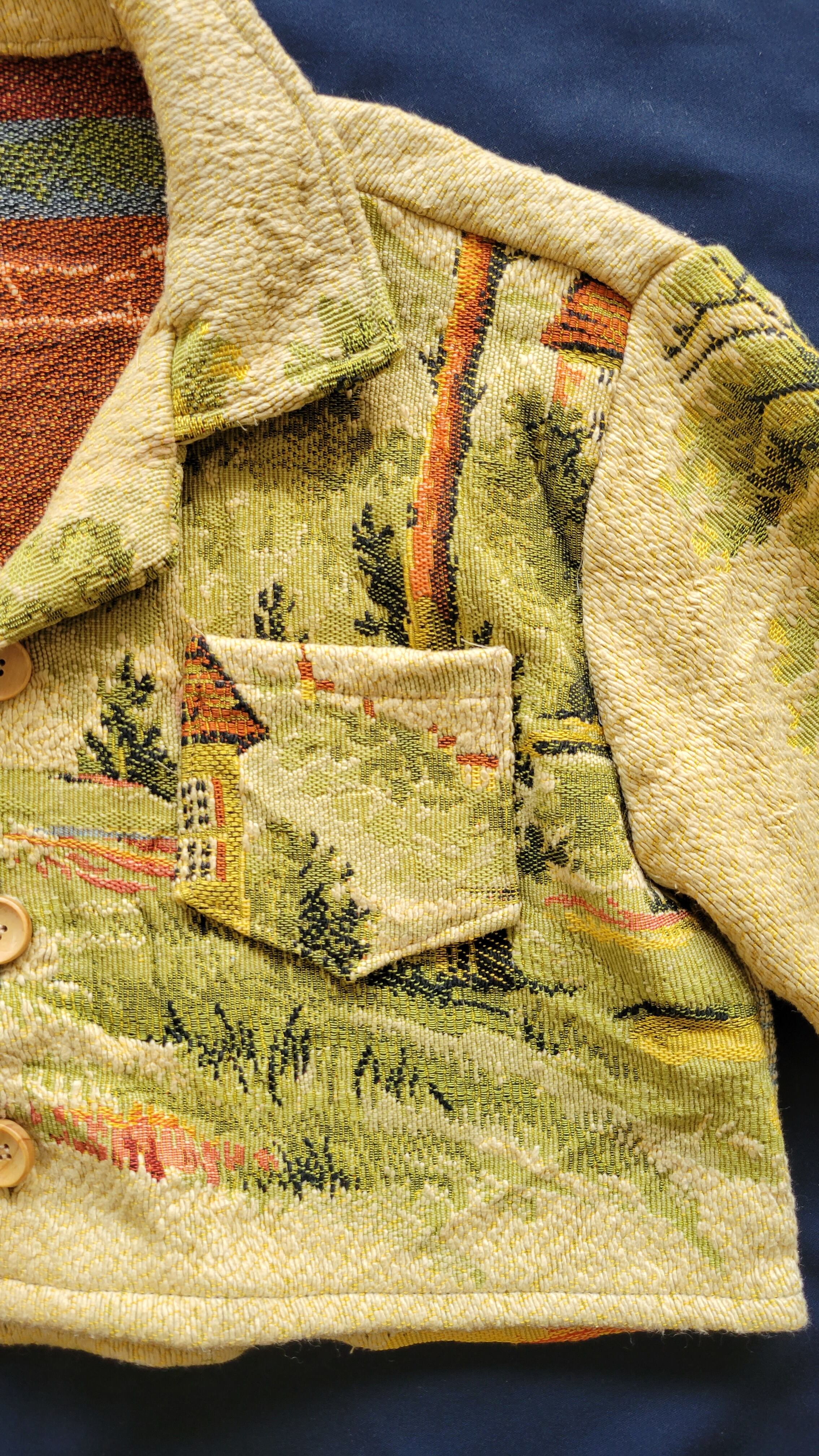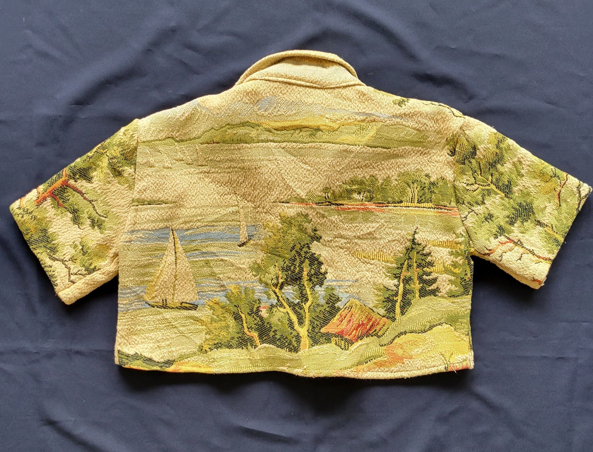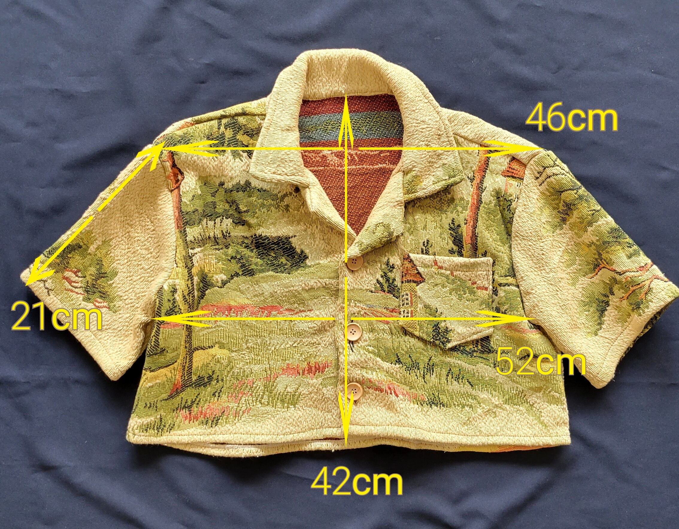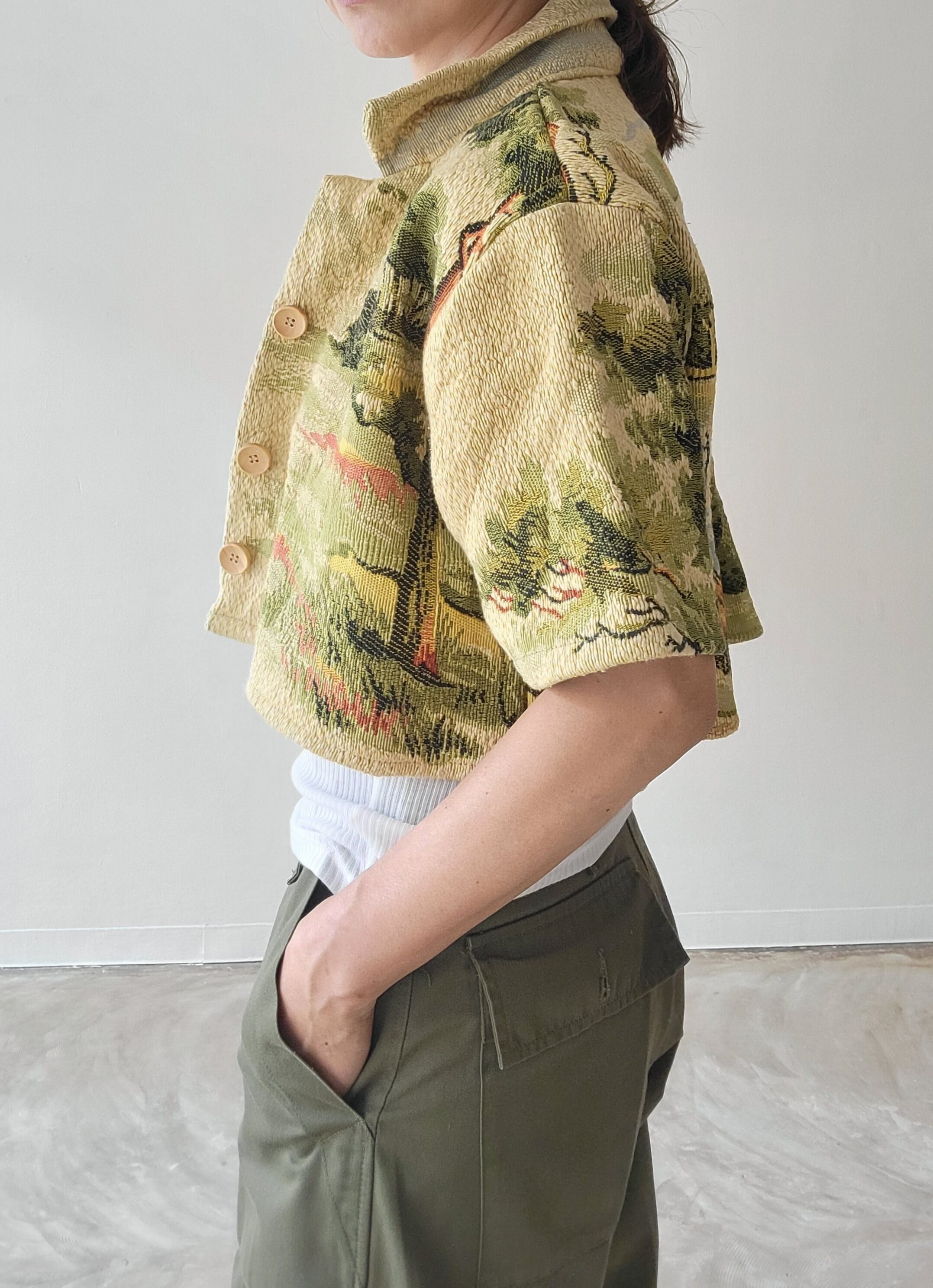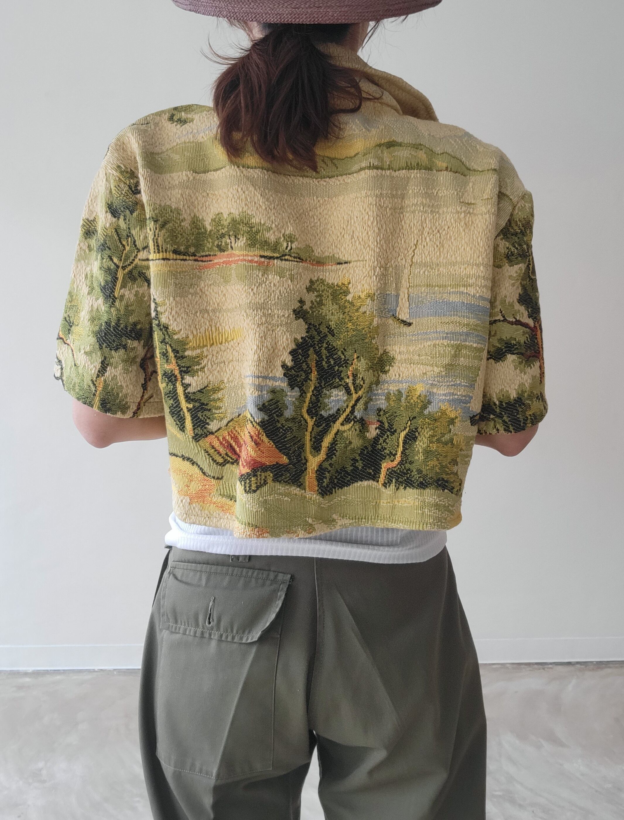 ヴィンテージのタペストリークロスを使用したリメイクトップス。素材表記はありませんがコットンの織りのようです。タペストリー素材ならではのしっかりした厚みがありますが、すでに柔らかく馴染んでおりほど良くくたっとしています。ショート丈でハイウエストボトムとの相性ぴったり。ボタンを開けてさっと羽織るのもおすすめです。