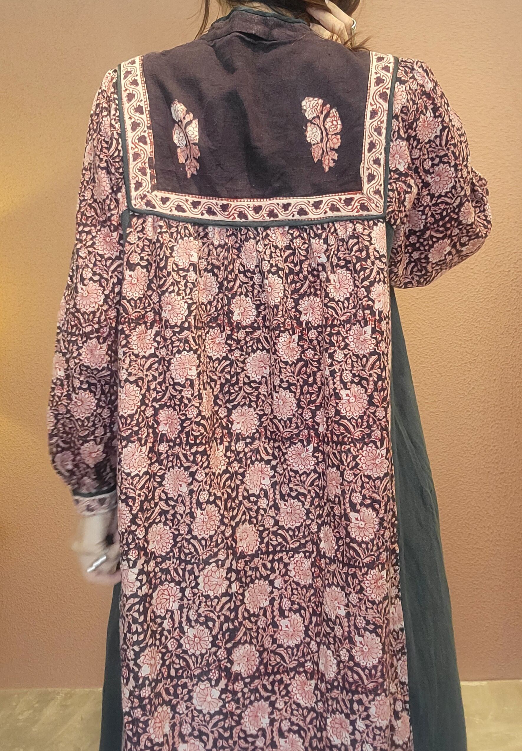 Made in India のヴィンテージインディアンコットンワンピース。素材のコットンはブロックプリントが施されたやや厚手のしっかりしたコットンです。胸元の紐には鈴付き。経年による風合いが渋い味わいのある1枚です。