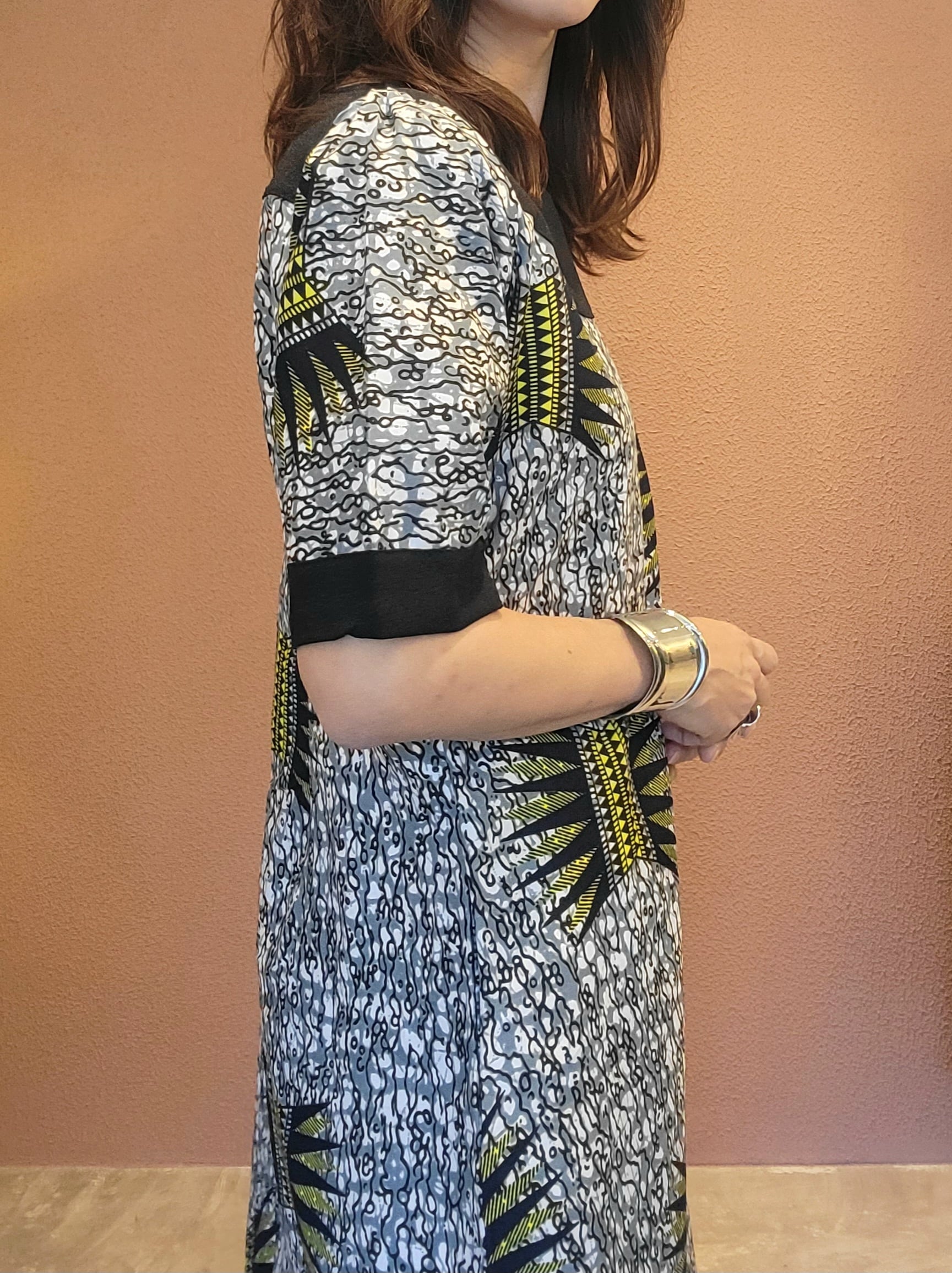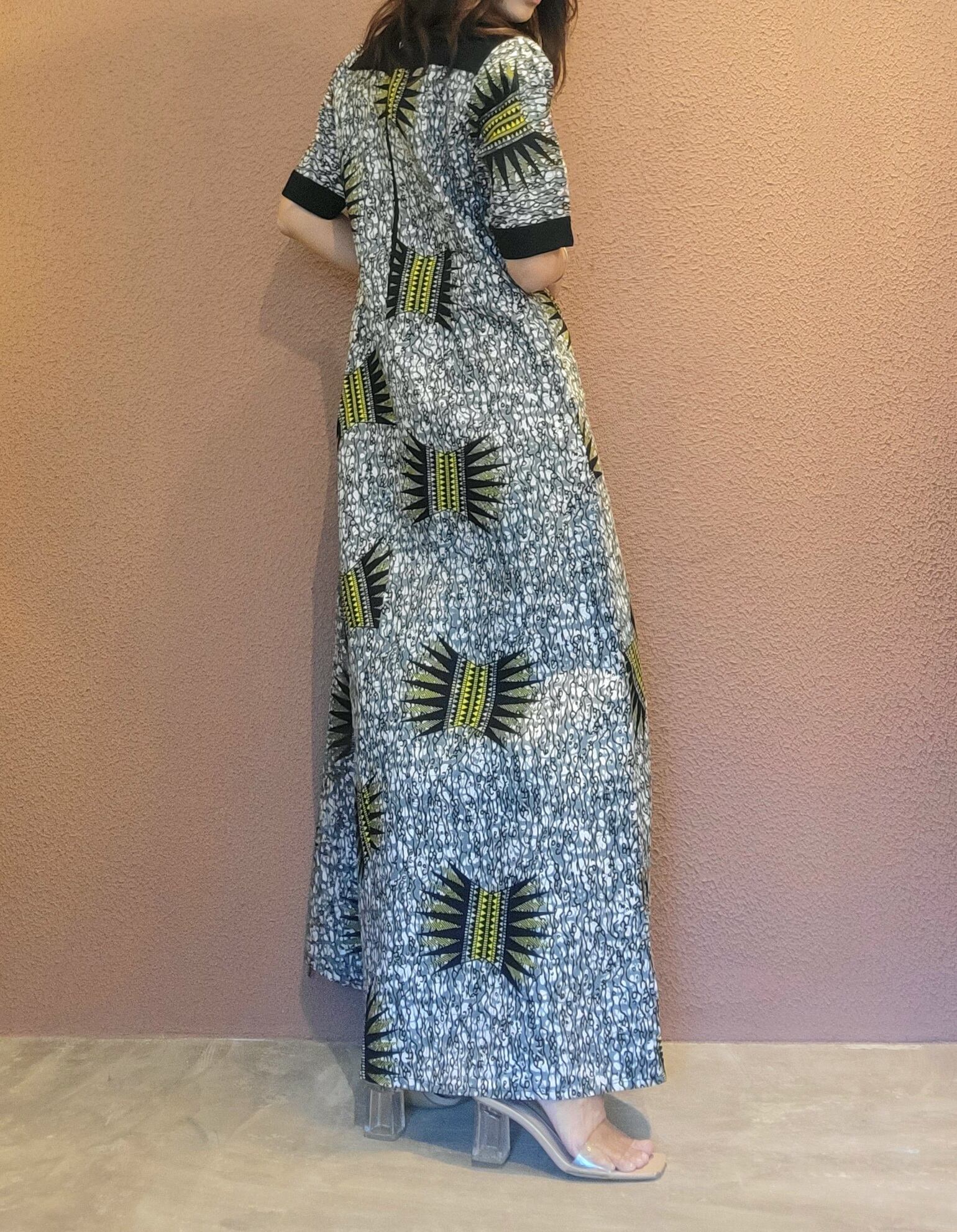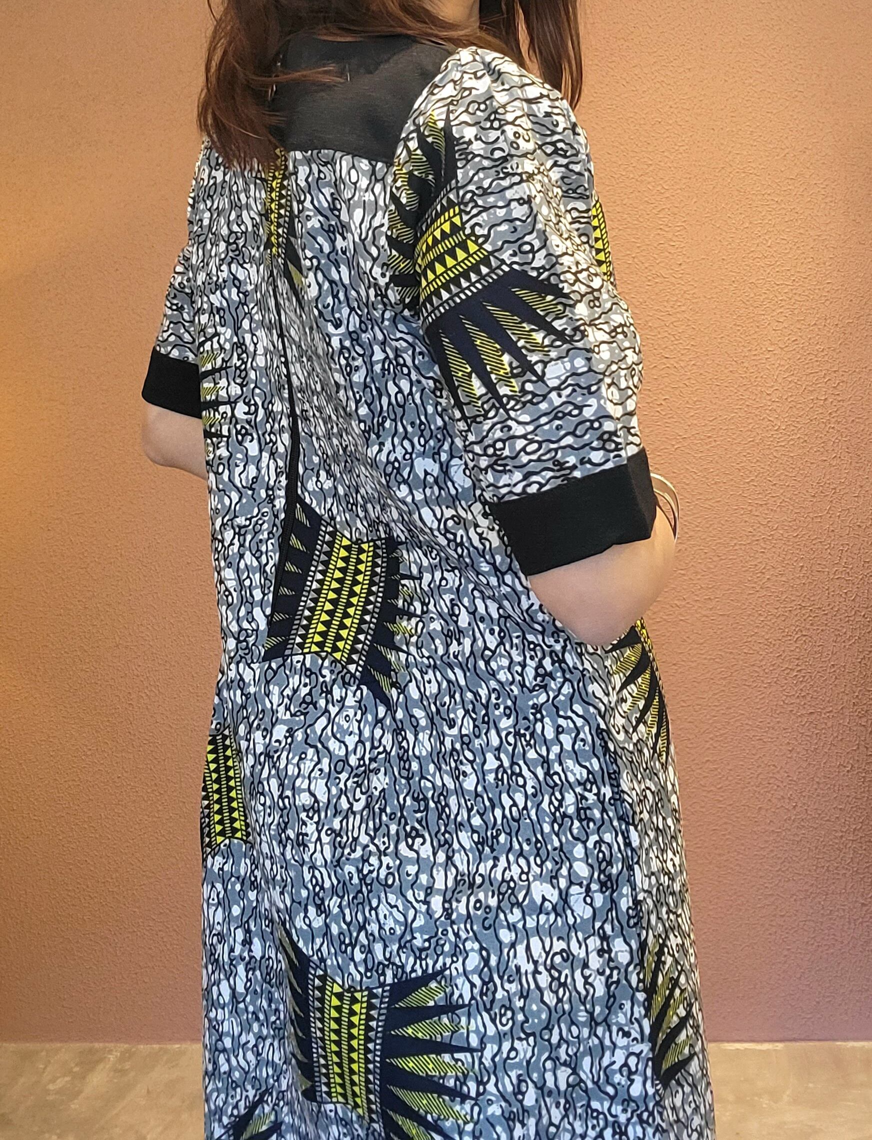 ヴィンテージのアフリカンバティックマキシワンピース。素材表記はありませんがコットンです。バックファスナー付きで着脱が簡単です。カラフルな色柄の多いアフリカンバティックですがこちらはブラックのポイント使いの効いた比較的落ち着きのある1着。1枚で着用できるコットンワンピースは暑い夏にぴったりです。